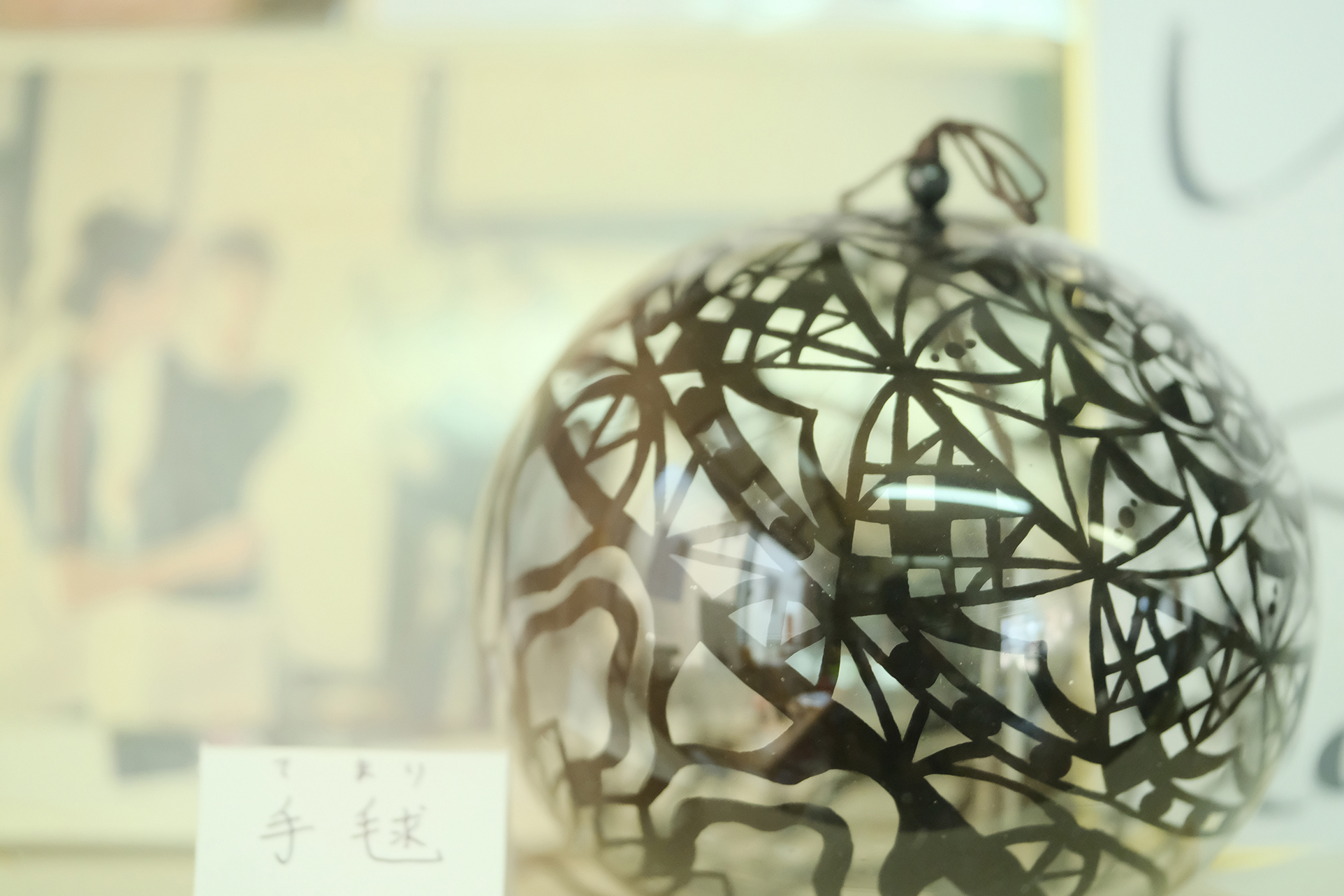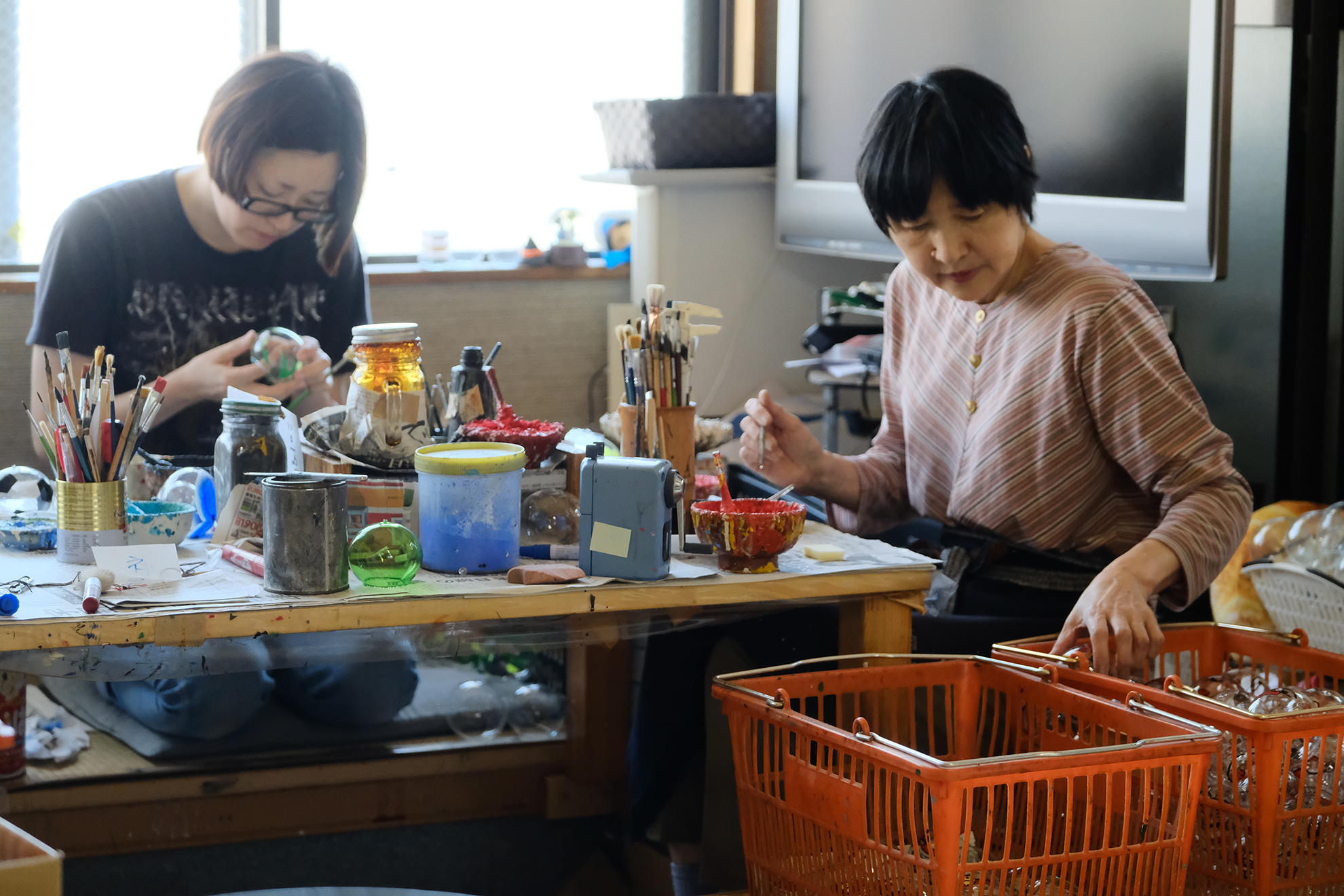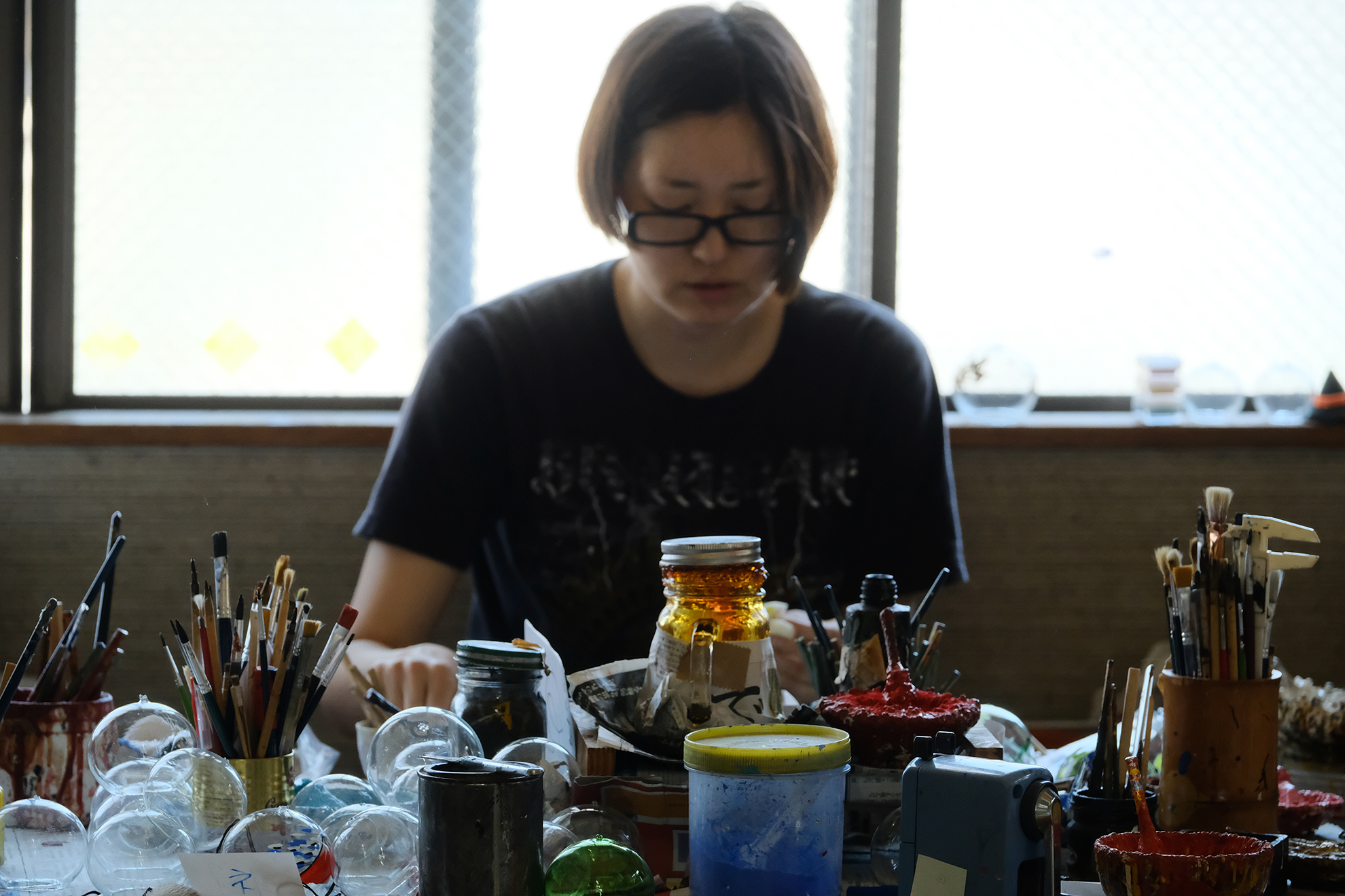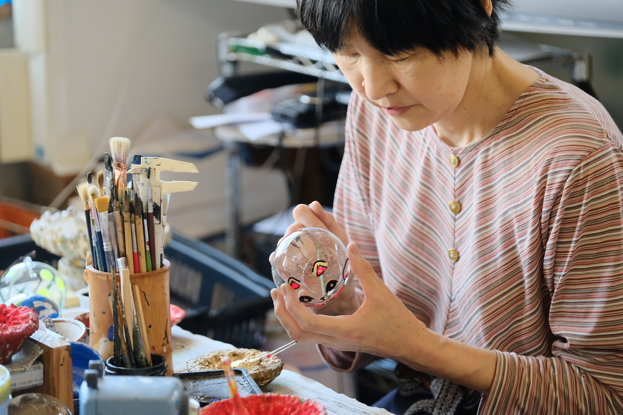 娘さんは、特注品らしくベースに青い色を塗られていました。過去には色付きガラスを吹いて、そこに同じ伝統工芸の江戸切子などを施していた事もあったそうですが、今は切子にした時に綺麗に白い部分が出るように、ガラス専門の加工所に色付けをご依頼されているそうです。