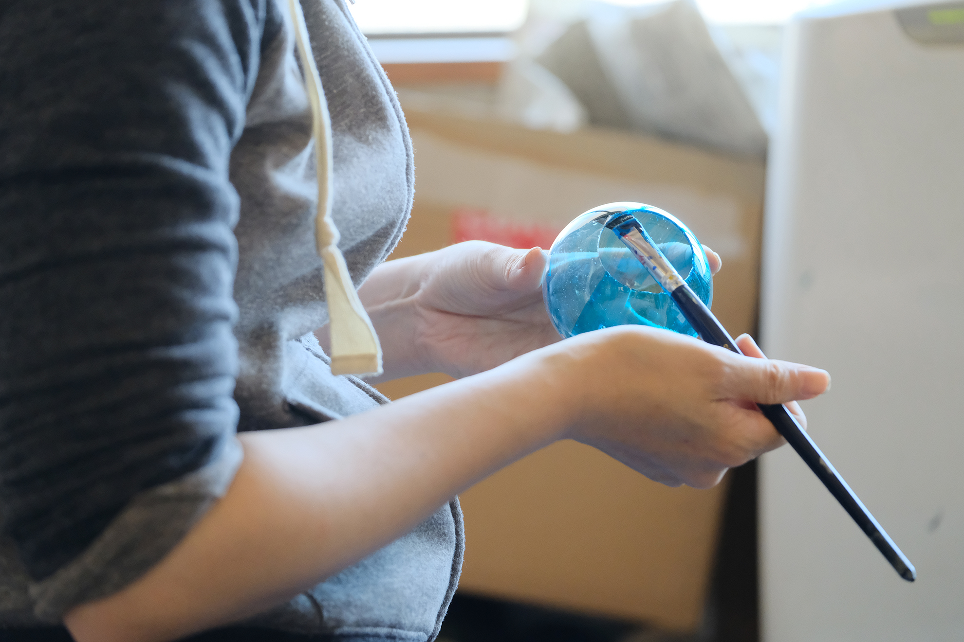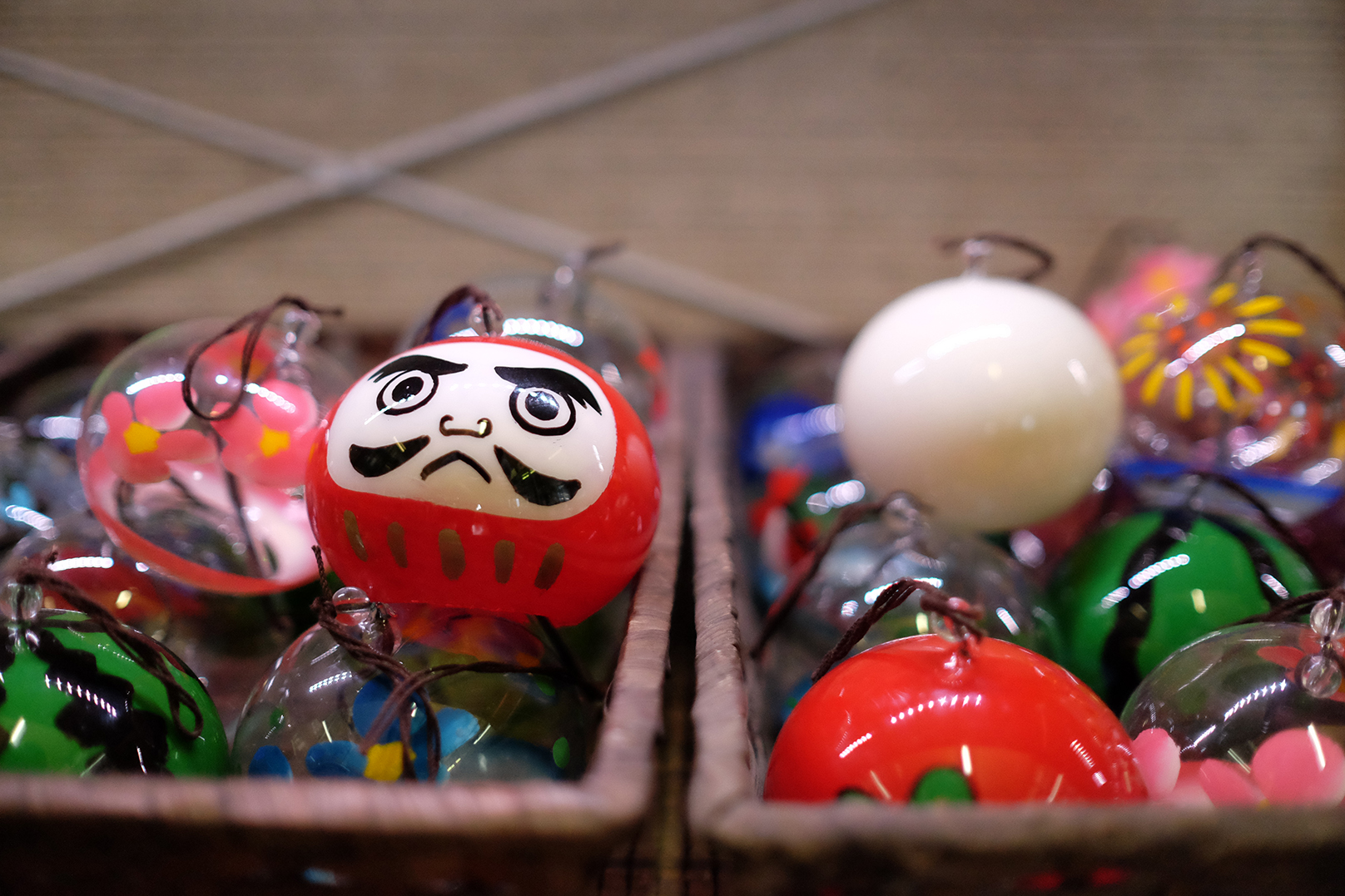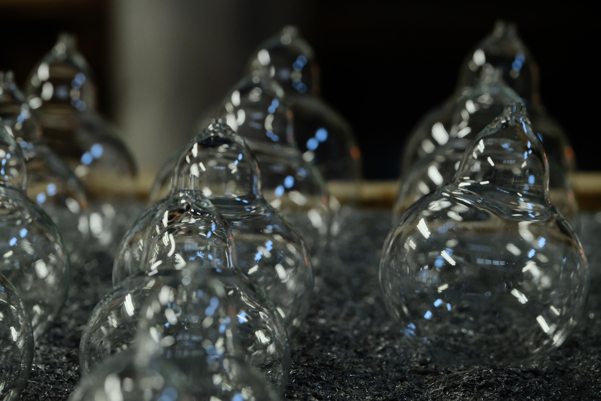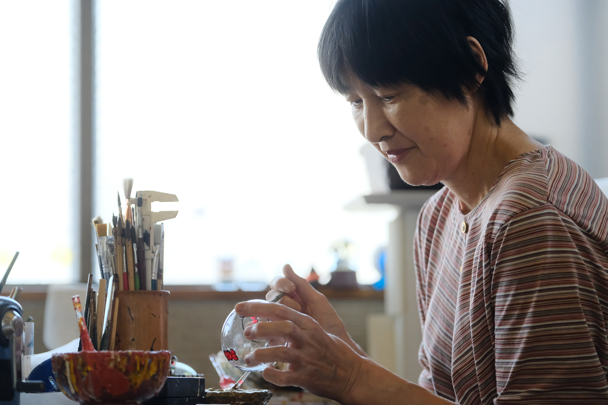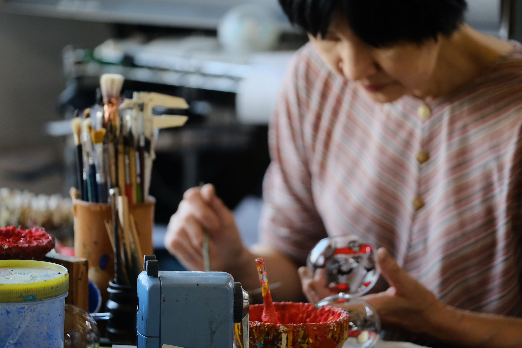 娘さんは、特注品らしくベースに青い色を塗られていました。過去には色付きガラスを吹いて、そこに同じ伝統工芸の江戸切子などを施していた事もあったそうですが、今は切子にした時に綺麗に白い部分が出るように、ガラス専門の加工所に色付けをご依頼されているそうです。