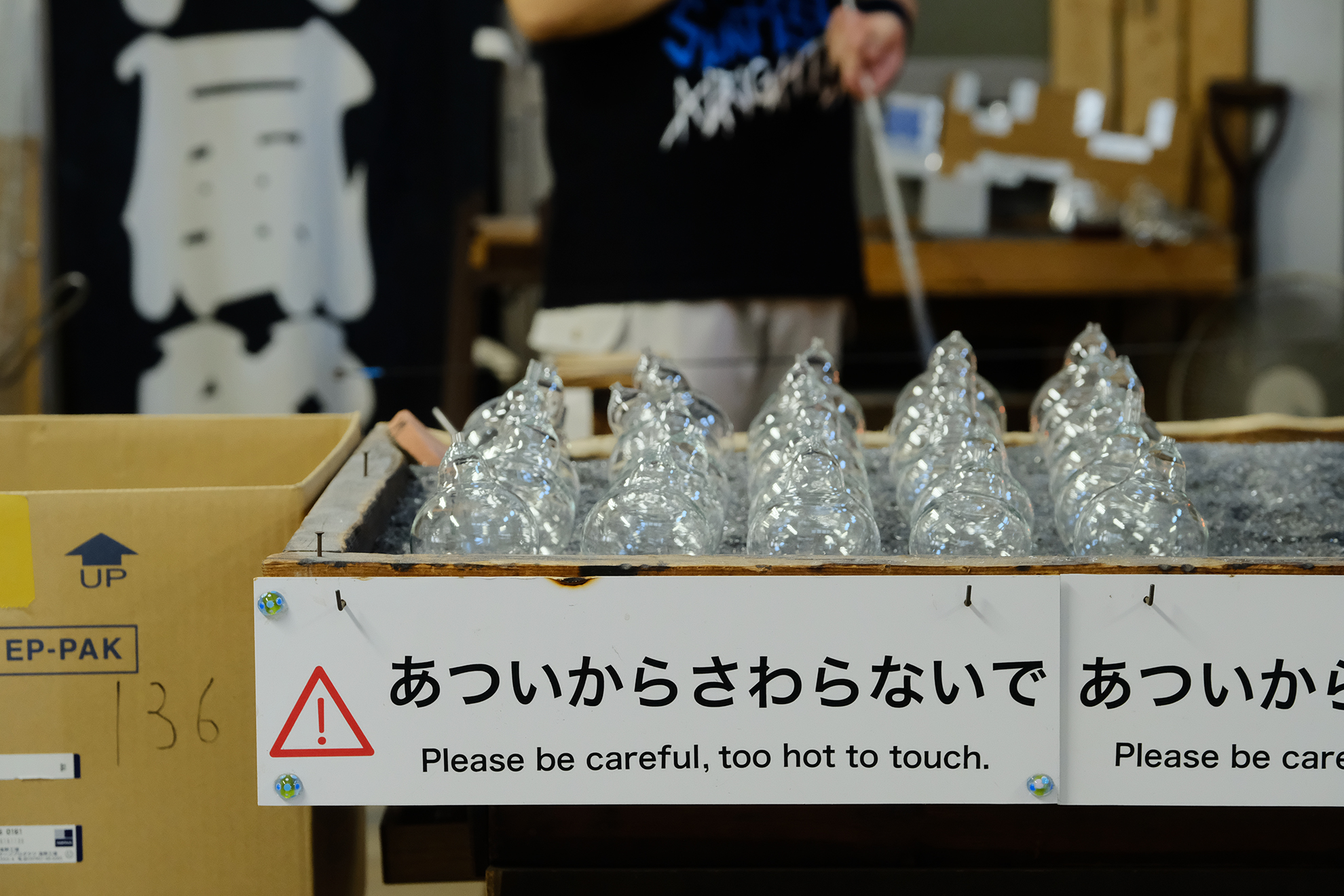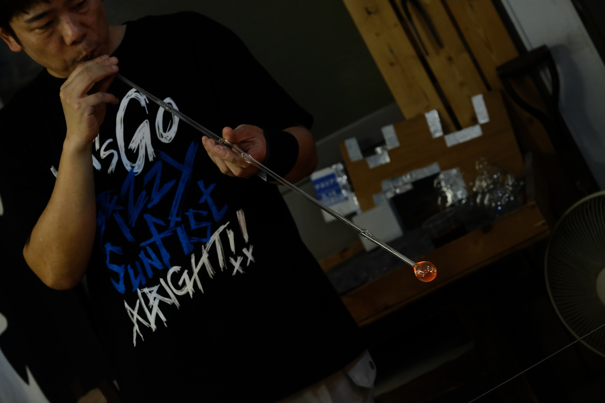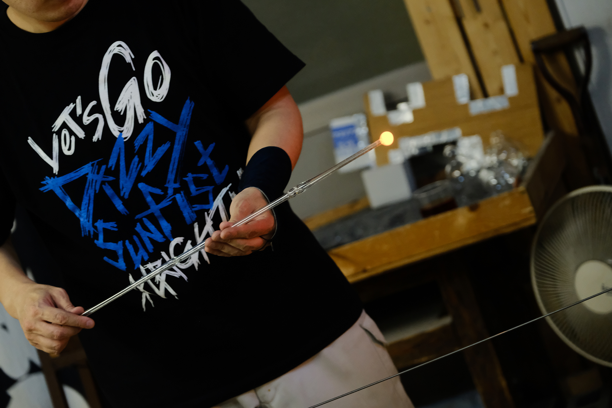 ガラス吹きの人数は男性3人でローテーションしており、この日は鹿児島での催事に行かれている方もいらっしゃるそうで、お1人で作業してらっしゃいました。