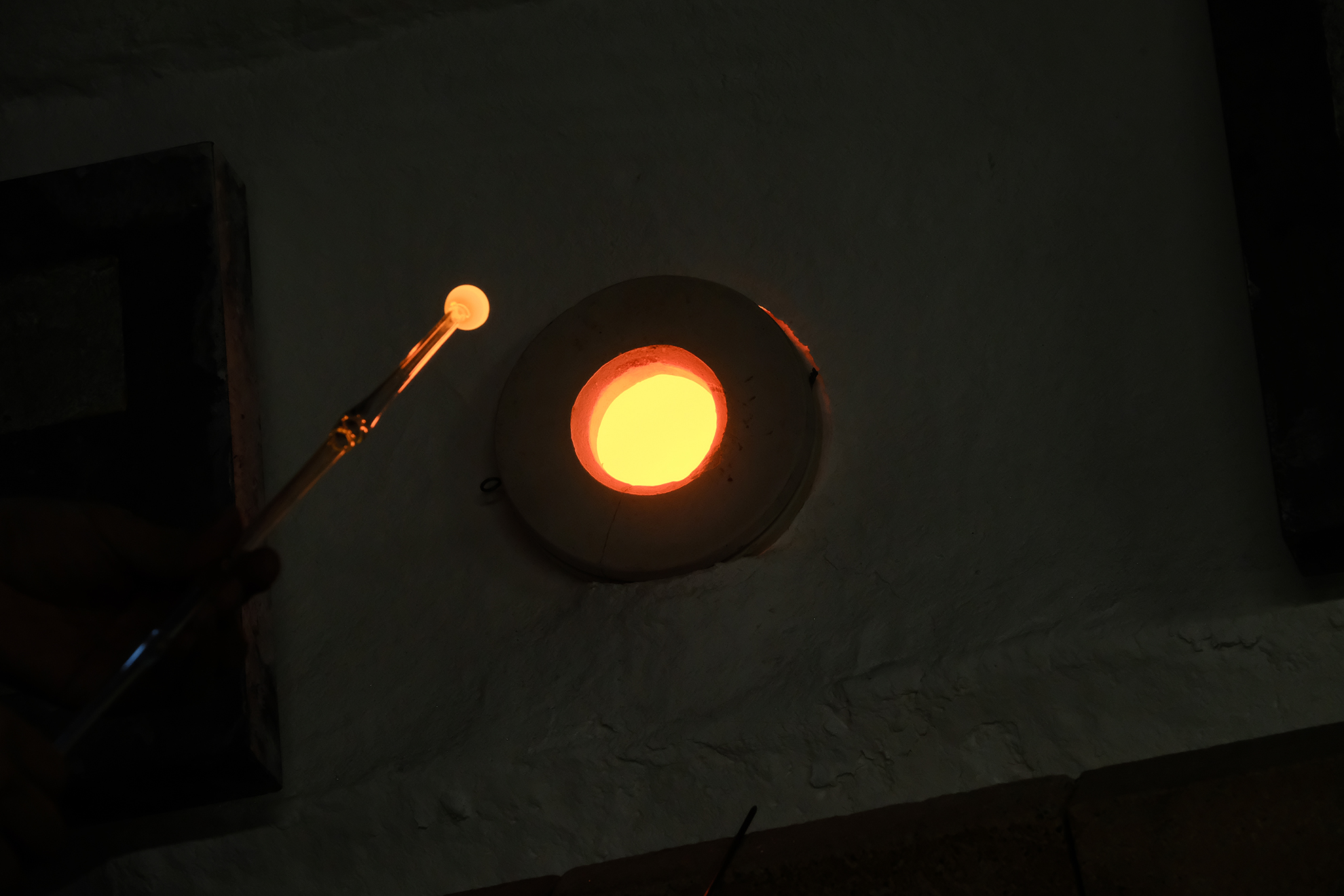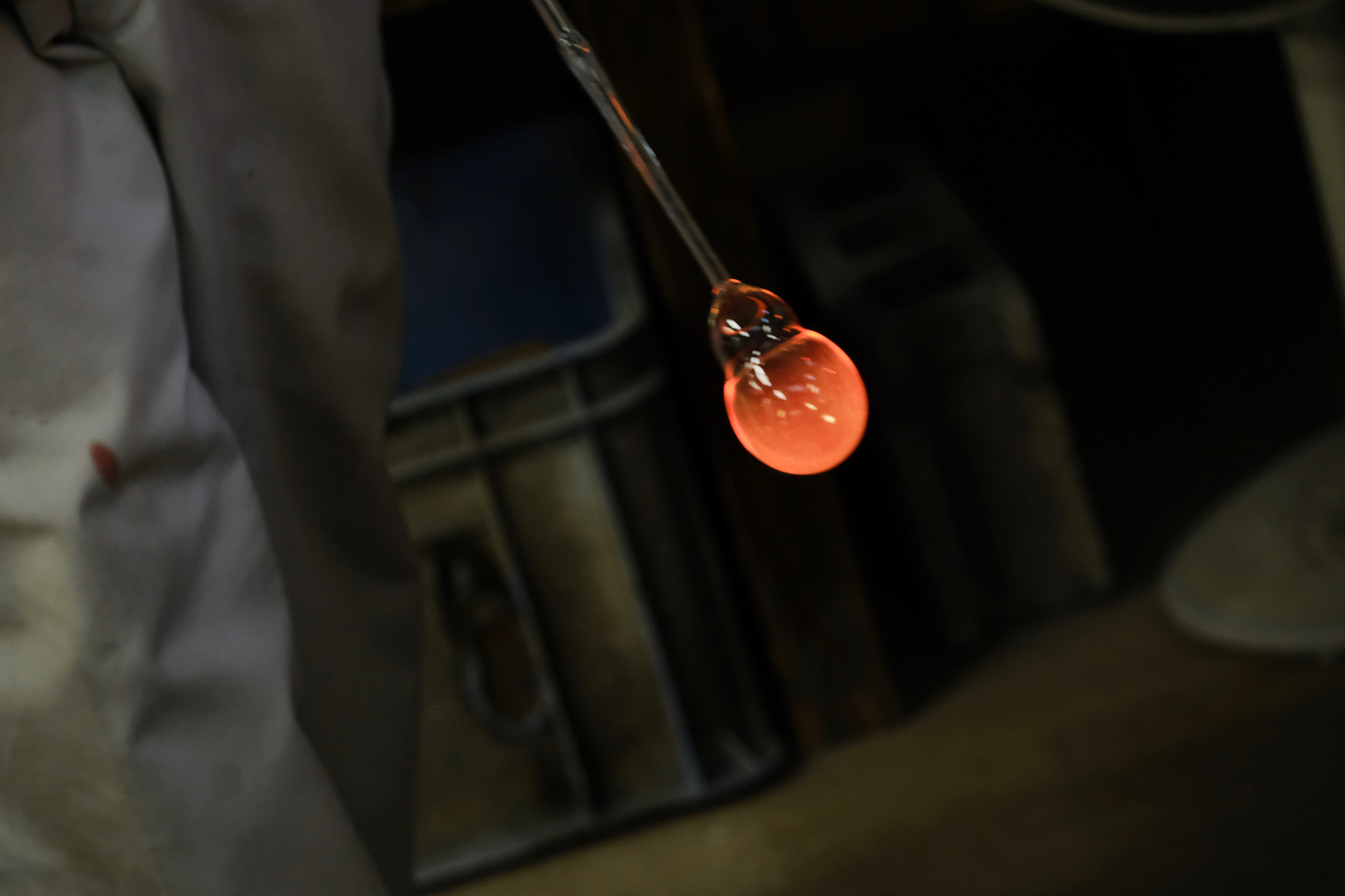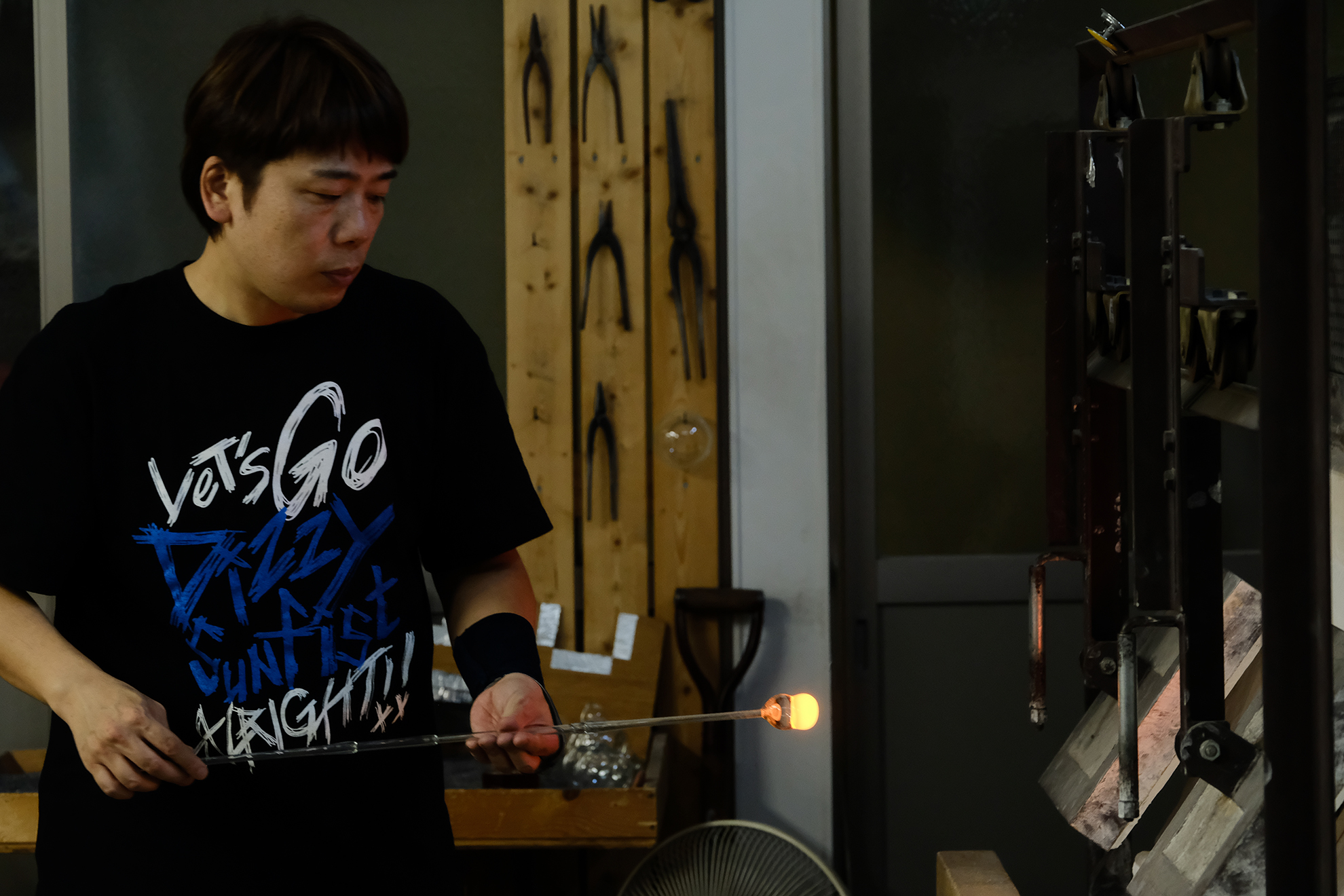 ガラス吹きの人数は男性3人でローテーションしており、この日は鹿児島での催事に行かれている方もいらっしゃるそうで、お1人で作業してらっしゃいました。