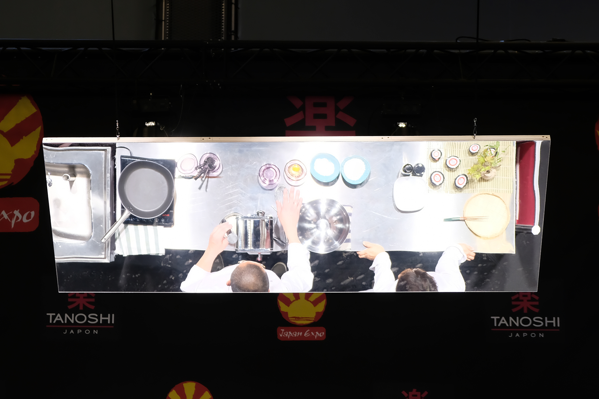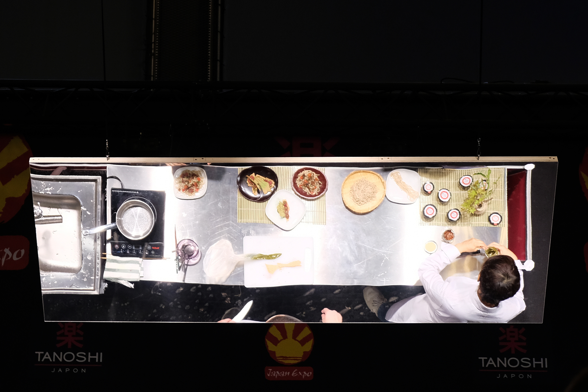 ステージでは、シェフの手元が見えるように鏡が上部に設置されていました。