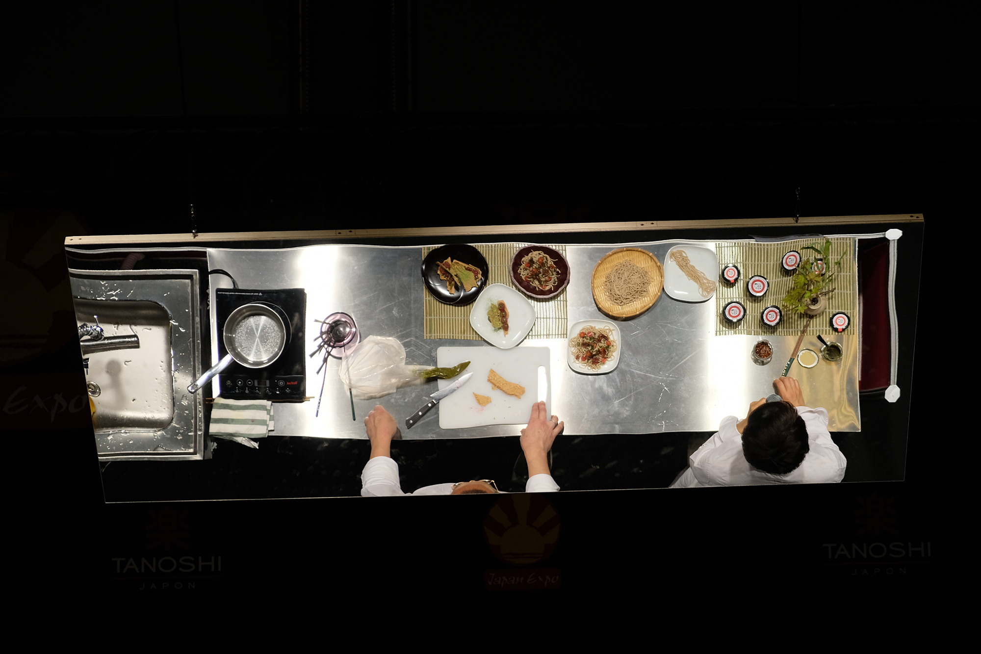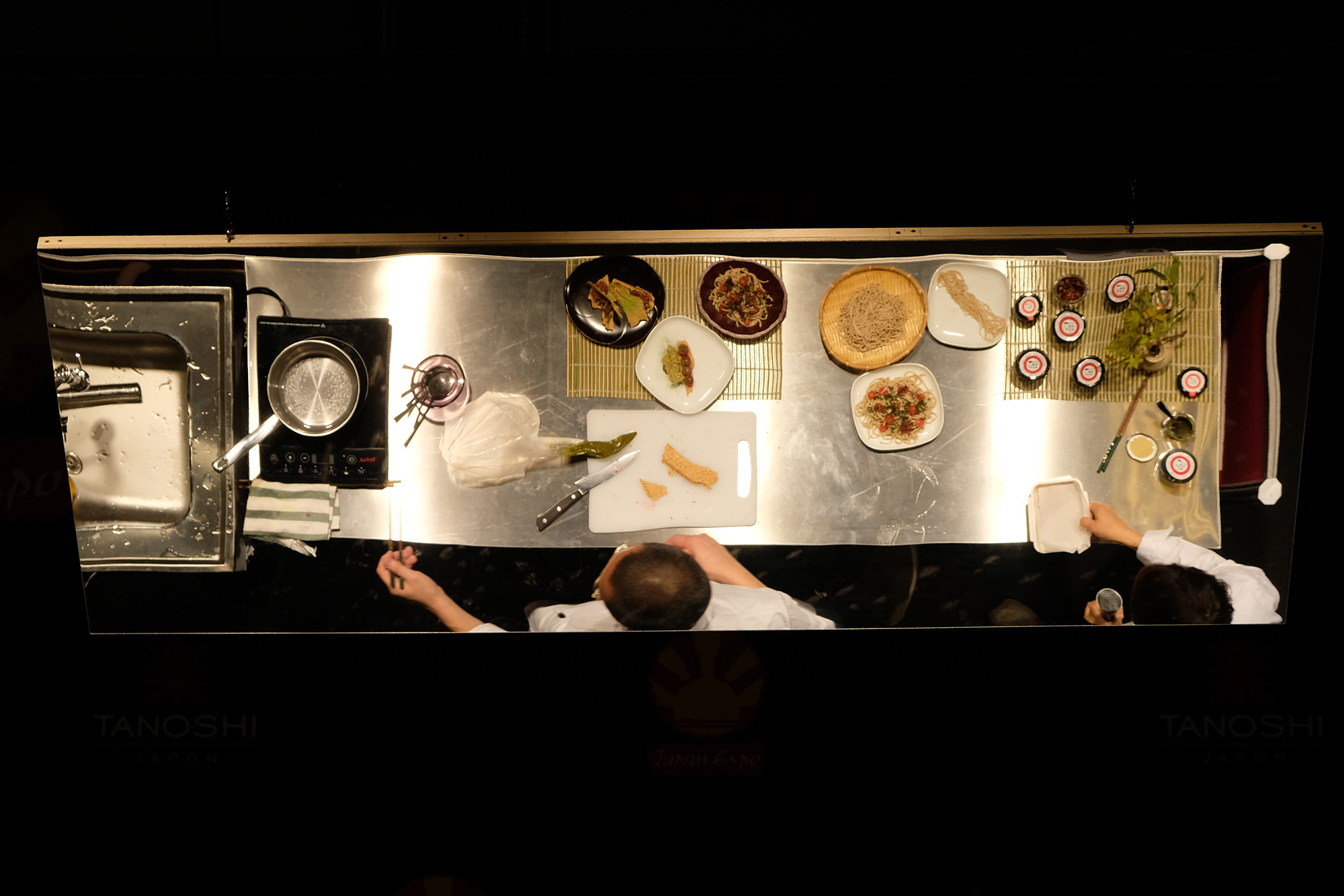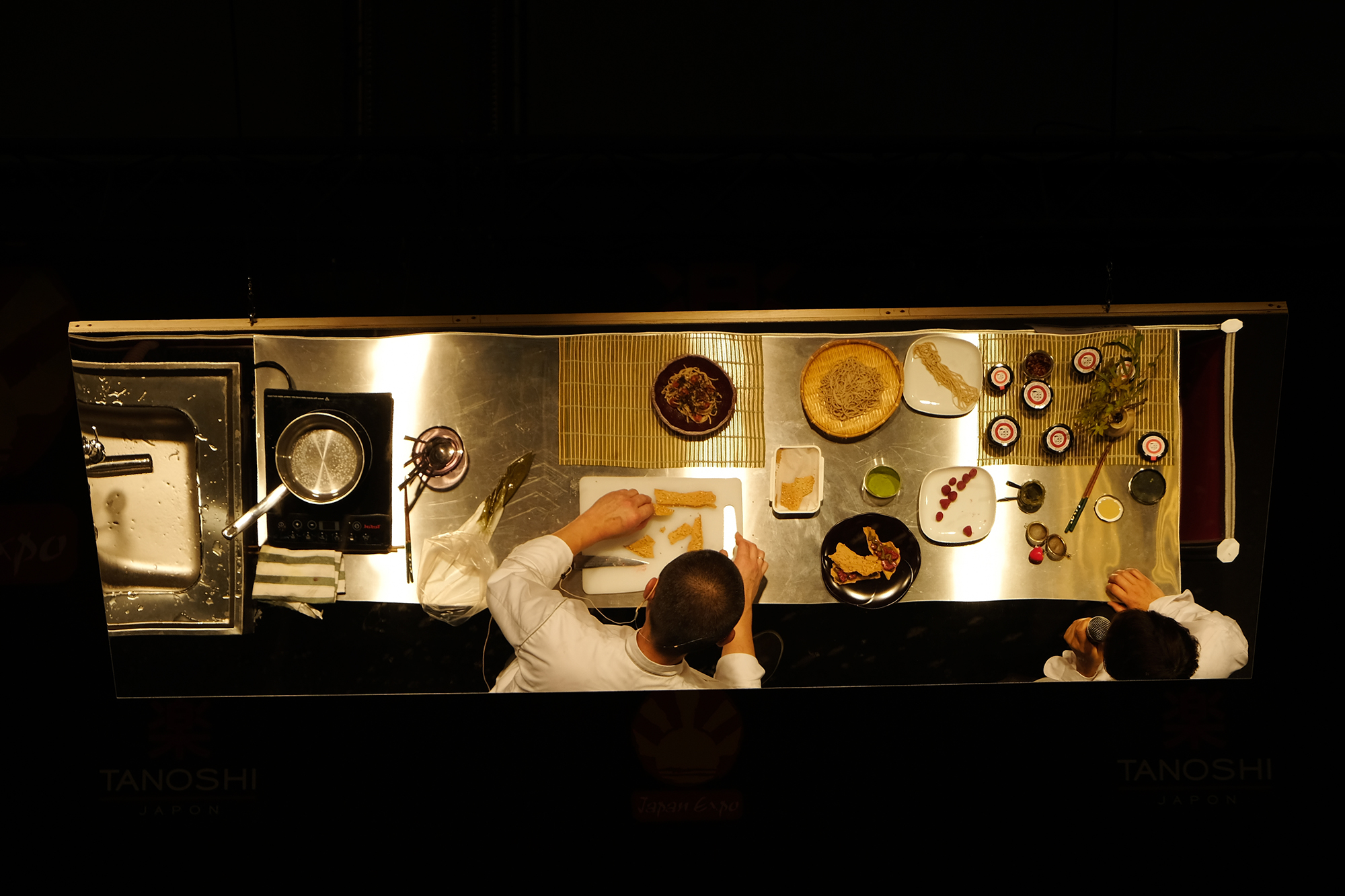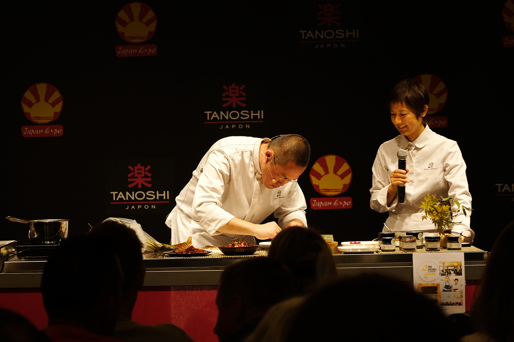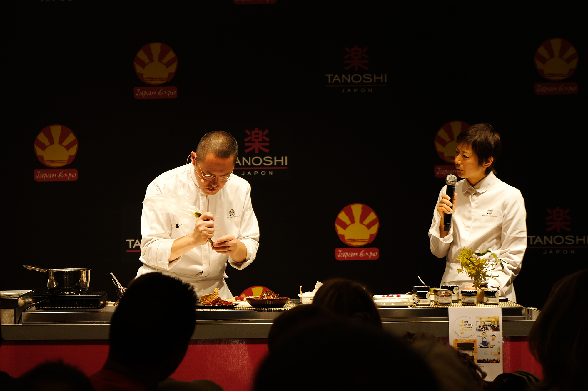 私が観覧したのは、BIOMOMO HASHIMOTO・橋本泰典 /恵美子さんによる実演。有機の食材を使った和食をフレンチ風にアレンジしたもので、今回は夏らしくお蕎麦がメインのメニュー3品の調理の秘訣を実演されていました。