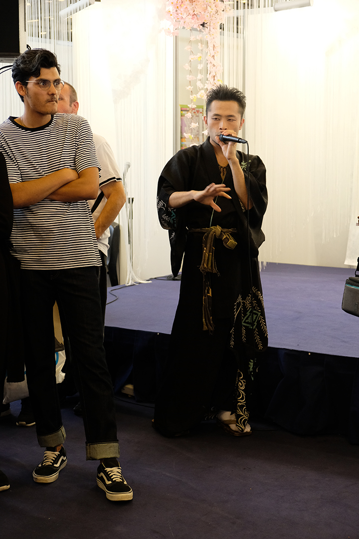 今年は何より白い衣装が眩しい天女をイメージされた”羽衣道中”をWABISABIブースにて披露されていらっしゃいました。毎年4日間とも公演されており、尚且つステージの装飾もされているとやりがいと大変さもお伺いしておりましたので、やっと現地で実際にこの目で、装飾と公演を拝見できた事が大変嬉しく、何より感激致しました!今年の美しい装飾は書家の美帆さんとの共作でらっしゃる様です。