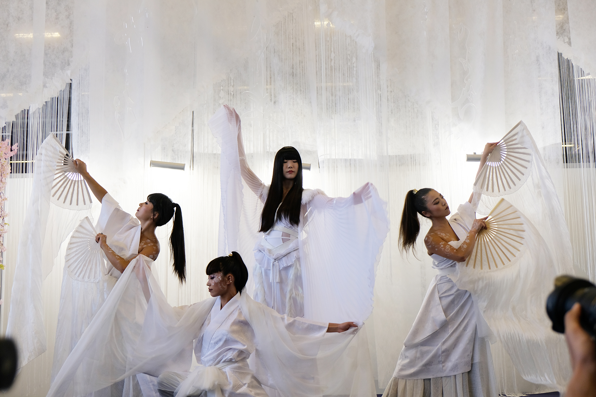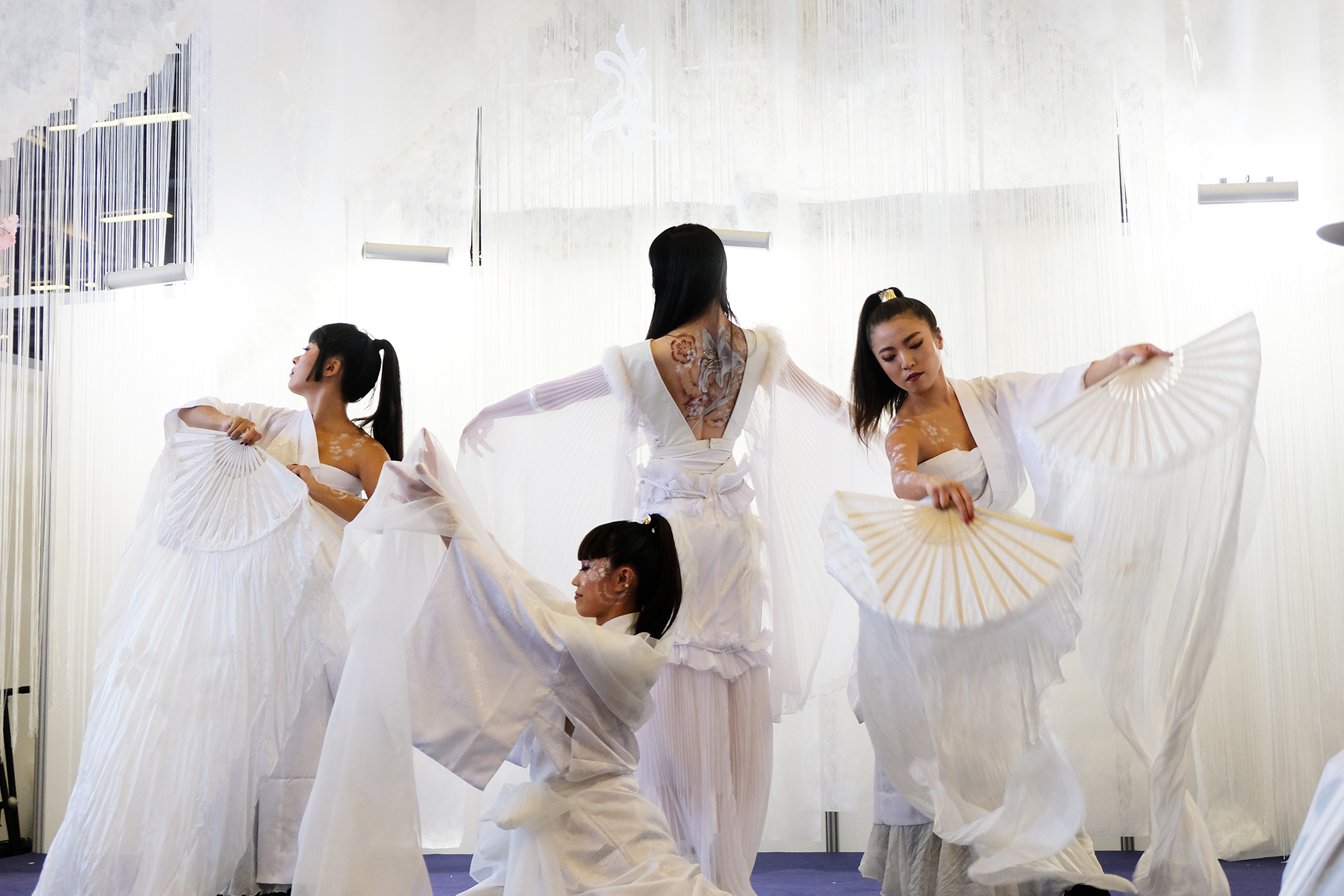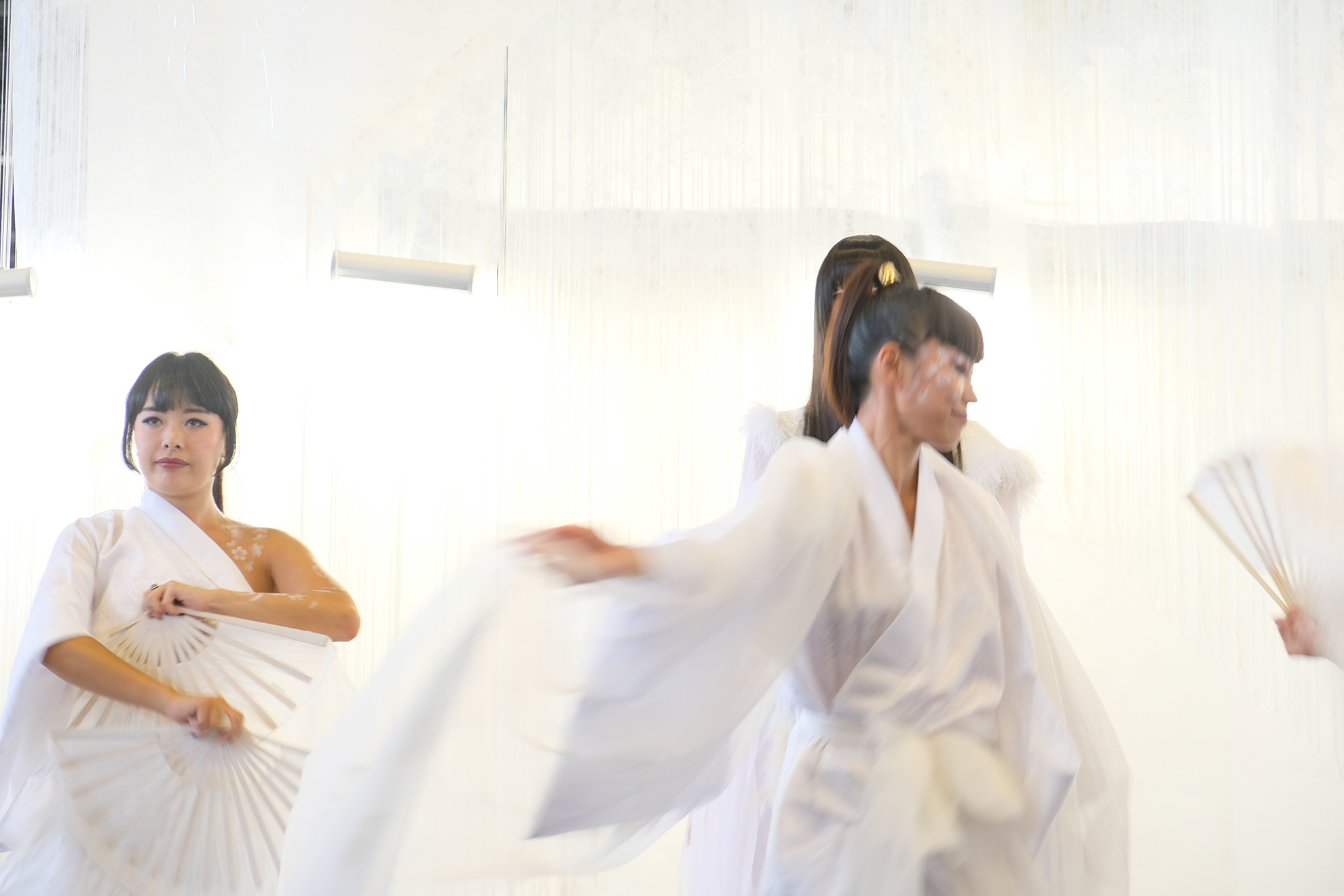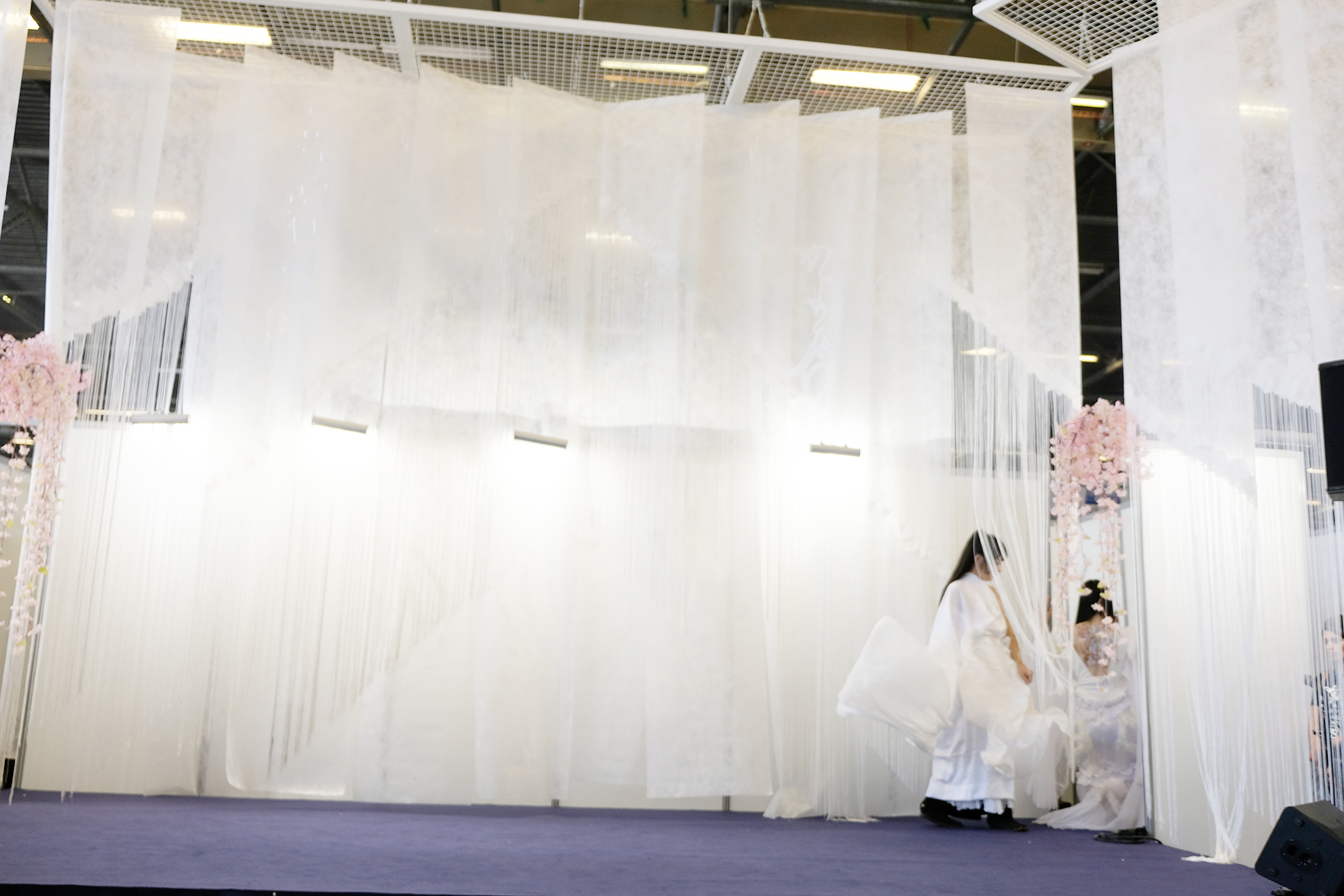 今年は何より白い衣装が眩しい天女をイメージされた”羽衣道中”をWABISABIブースにて披露されていらっしゃいました。毎年4日間とも公演されており、尚且つステージの装飾もされているとやりがいと大変さもお伺いしておりましたので、やっと現地で実際にこの目で、装飾と公演を拝見できた事が大変嬉しく、何より感激致しました!今年の美しい装飾は書家の美帆さんとの共作でらっしゃる様です。