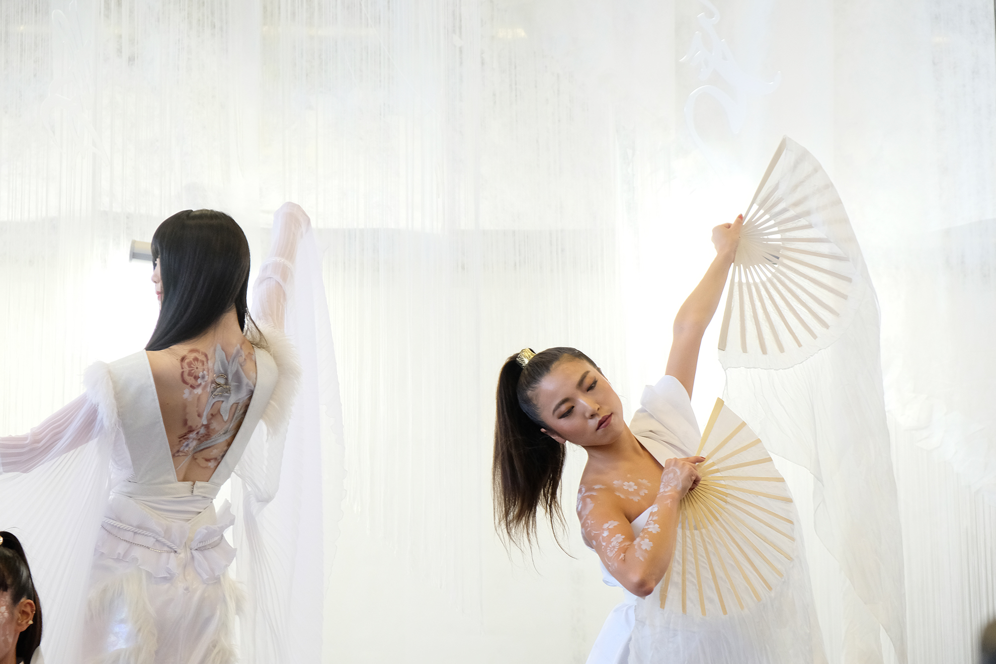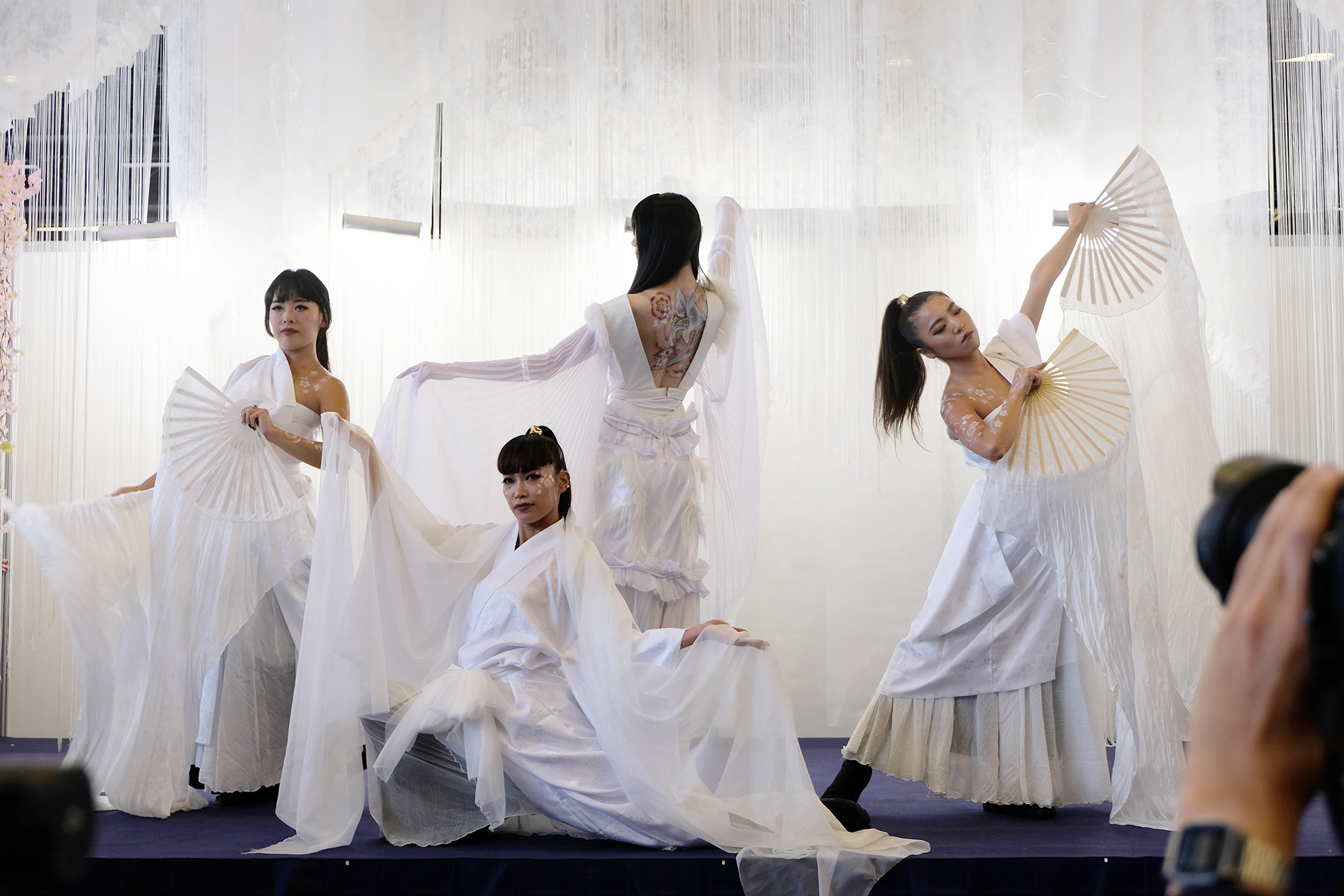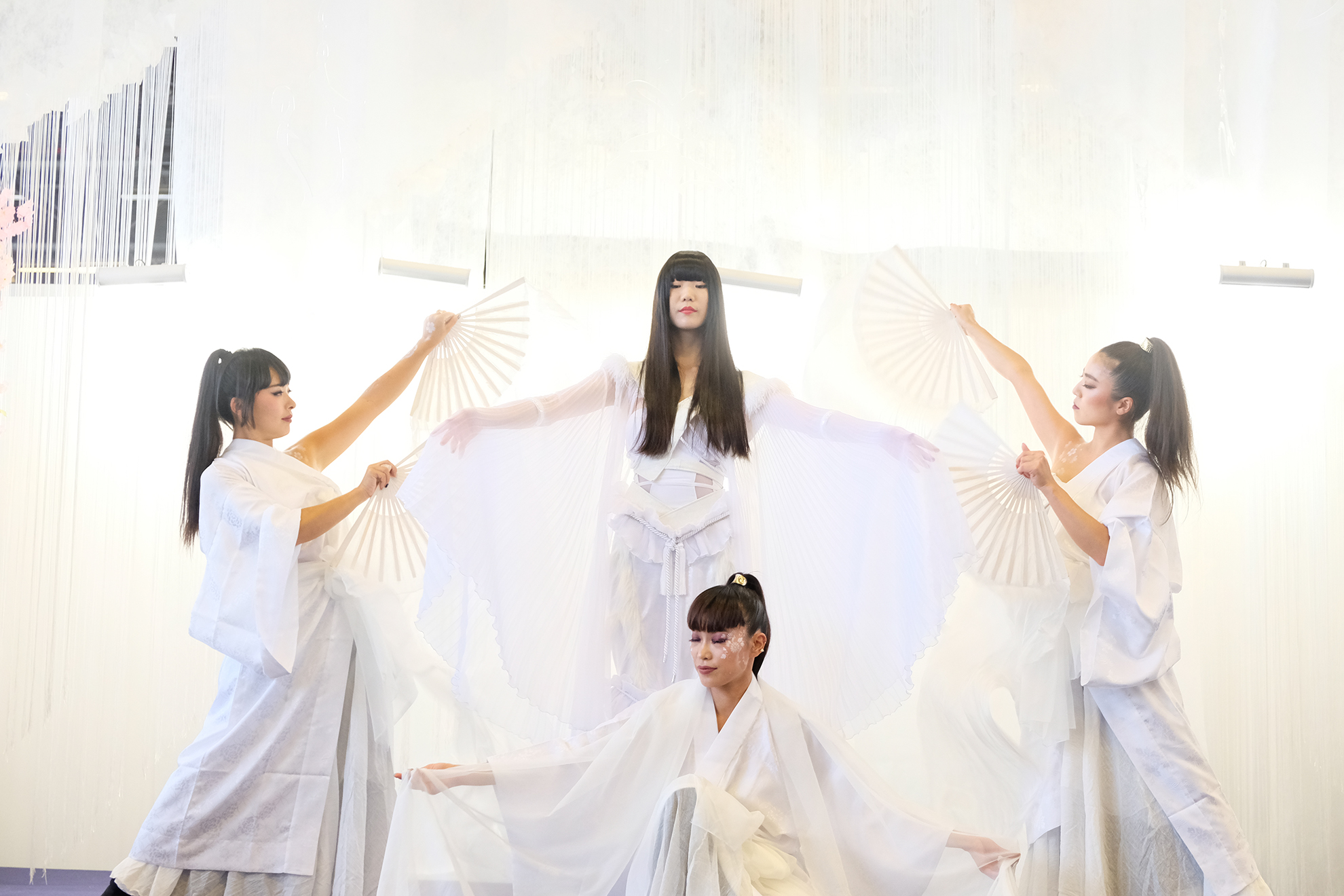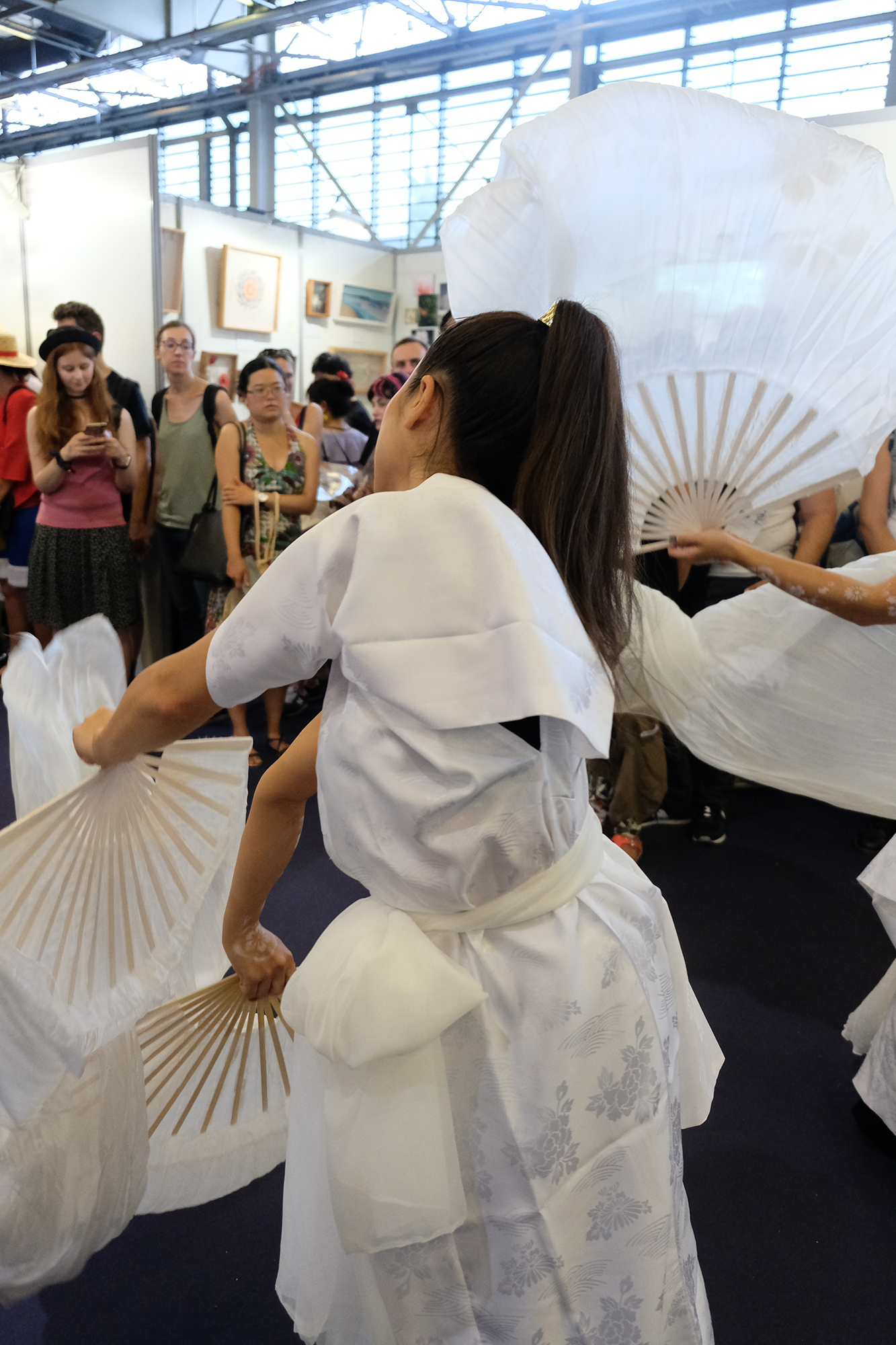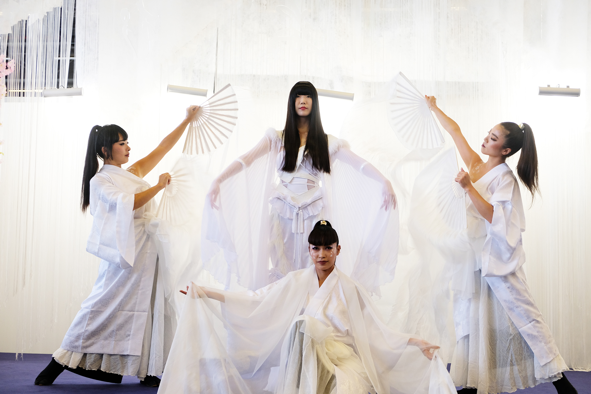 今年は何より白い衣装が眩しい天女をイメージされた”羽衣道中”をWABISABIブースにて披露されていらっしゃいました。毎年4日間とも公演されており、尚且つステージの装飾もされているとやりがいと大変さもお伺いしておりましたので、やっと現地で実際にこの目で、装飾と公演を拝見できた事が大変嬉しく、何より感激致しました!今年の美しい装飾は書家の美帆さんとの共作でらっしゃる様です。