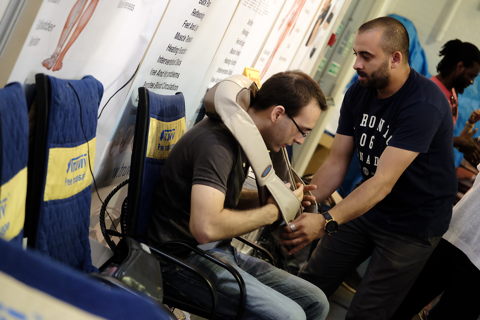 ・きっと日本には関係ないであろう(笑)ドイツのマッサージ器の体験ブース。威勢のいいFriendlyな彼に椅子の方へ引っ張られ、結局みんなで体験(笑)。首の後をマッサージ。なかなか強い揉み具合でこれは効きそう。この体制なので主に首ですが当てる所を変えれば色んな所をマッサージ出来そうです。