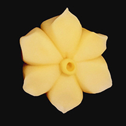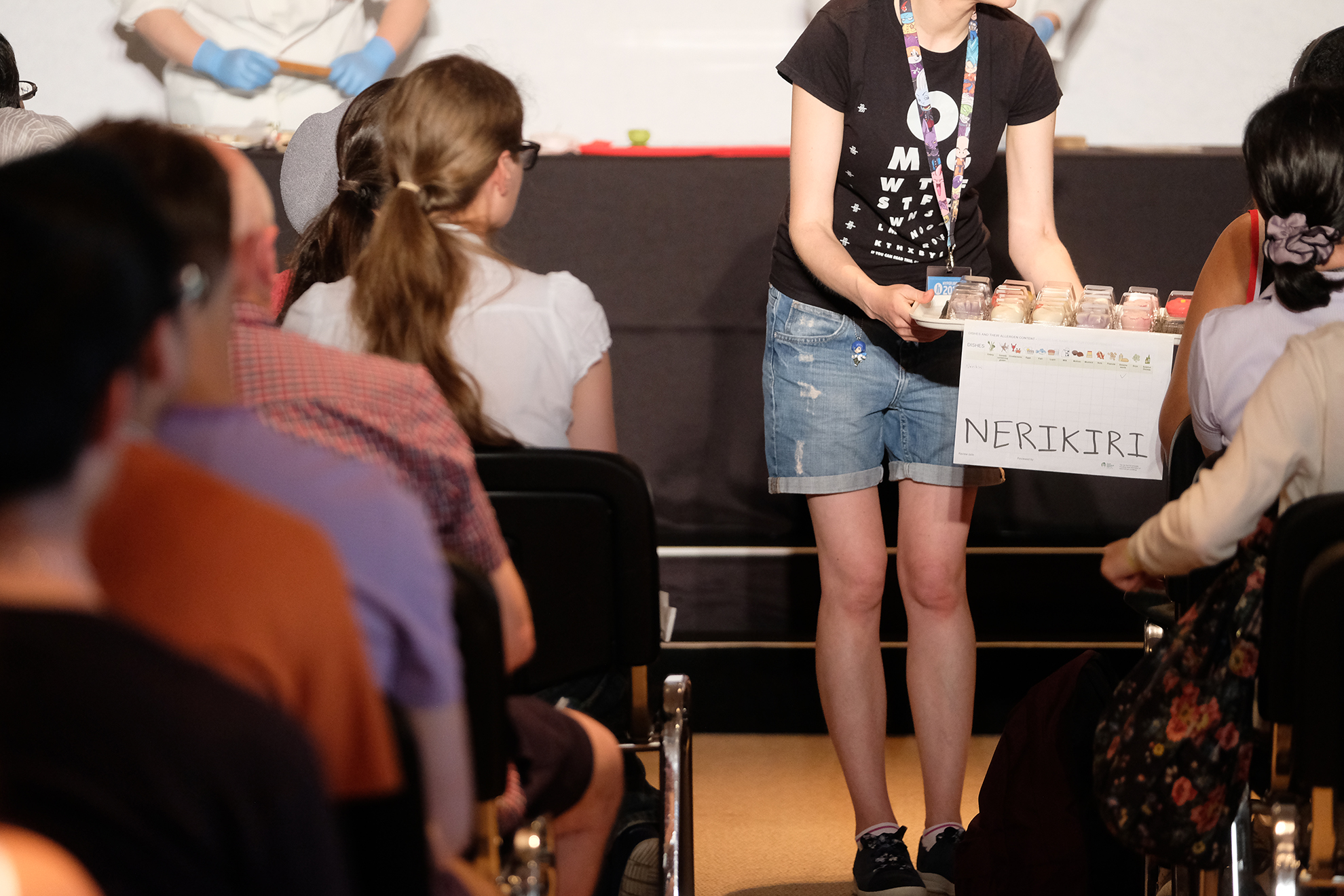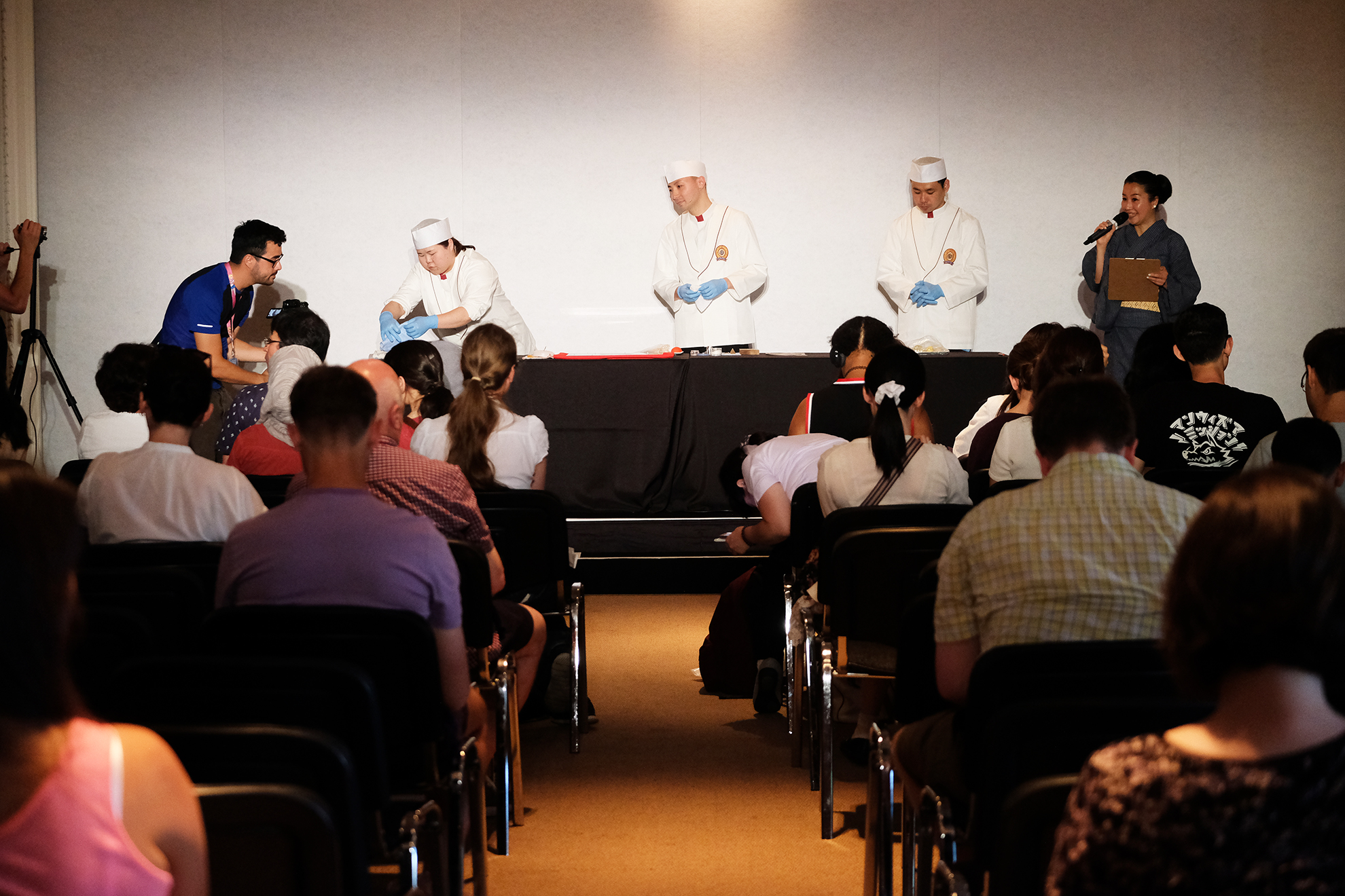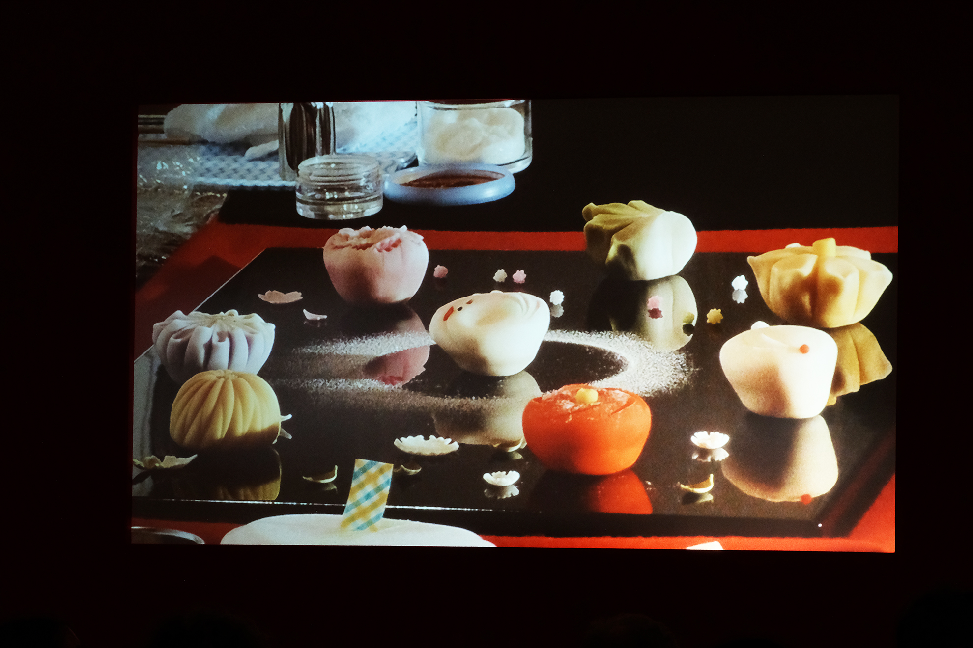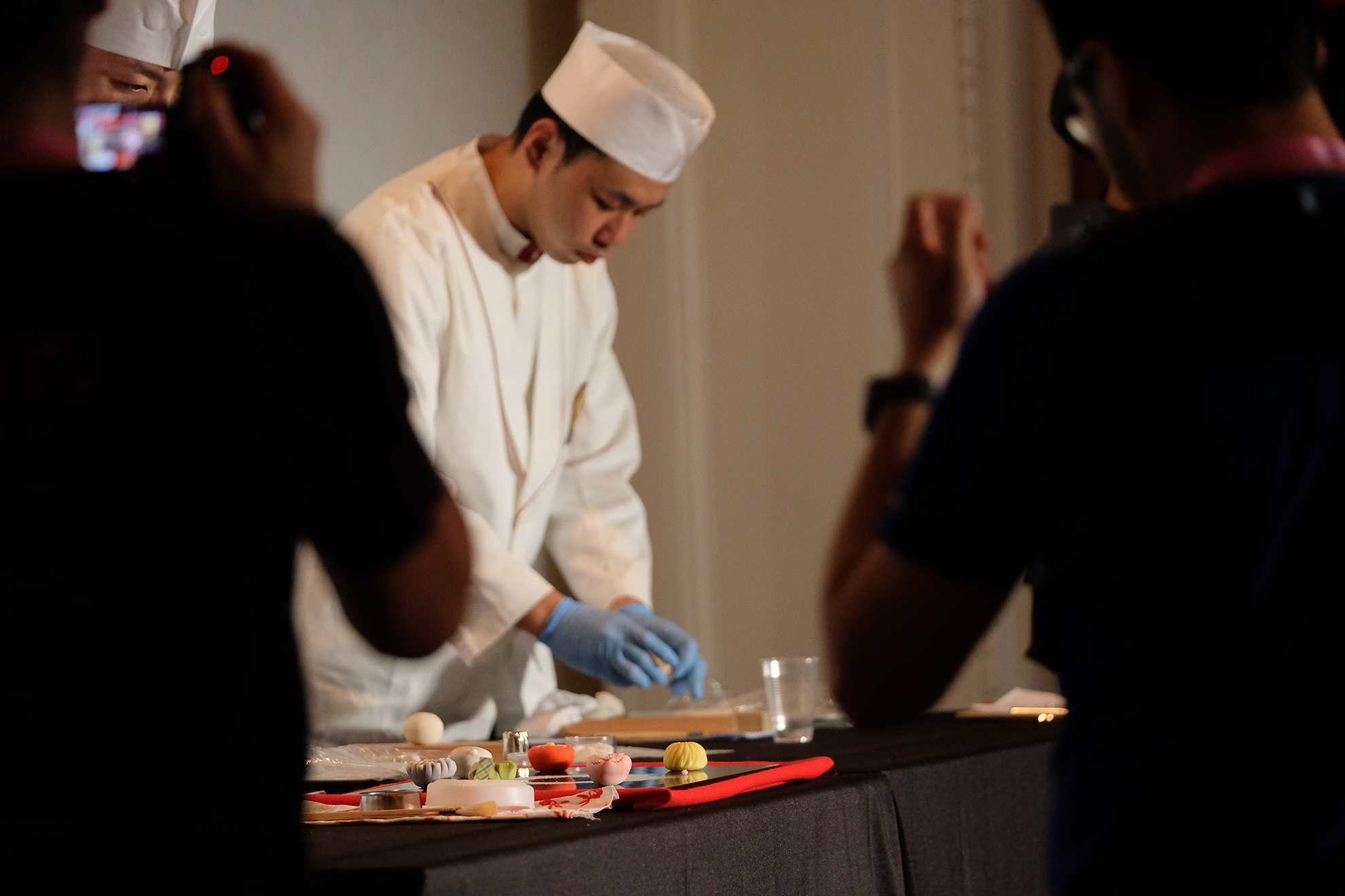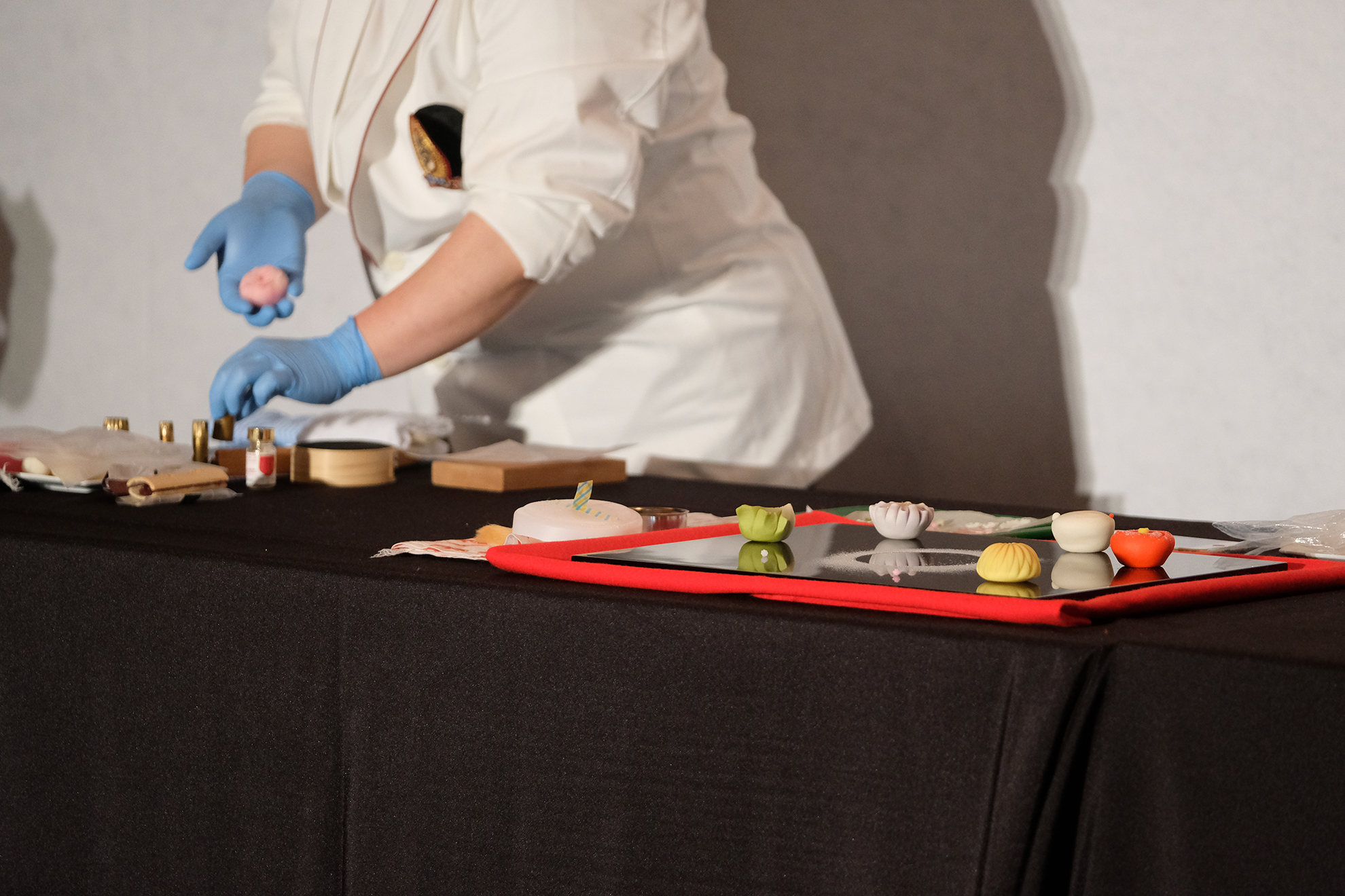 ・この日の最後は講演会場HYPER Theatreで行われた、和菓子作りの実演を拝見致しました。実演・講演をされるのは千住に工場がある有限会社喜田屋の中西さんら3名の職人さん。菓子技能検定(和菓子と洋菓子と別れている)に合格した日本全国でも200数名しかいないうちの3名にお越しいただいたとの事。限られた時間の中で、まずは中西さんは寒椿~雪うさぎと作っていかれます。他の方も青楓と桃の花を作っていかれます。