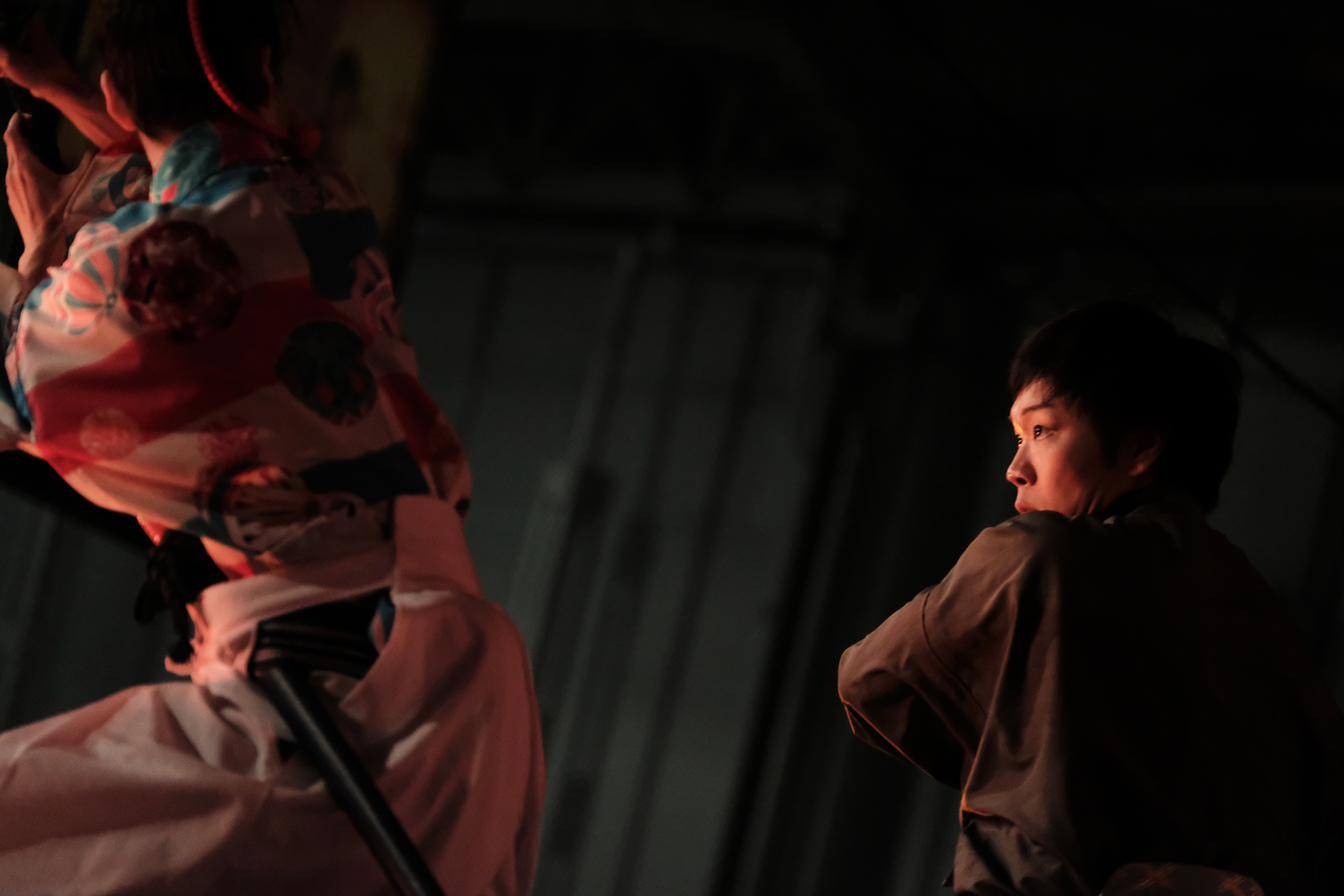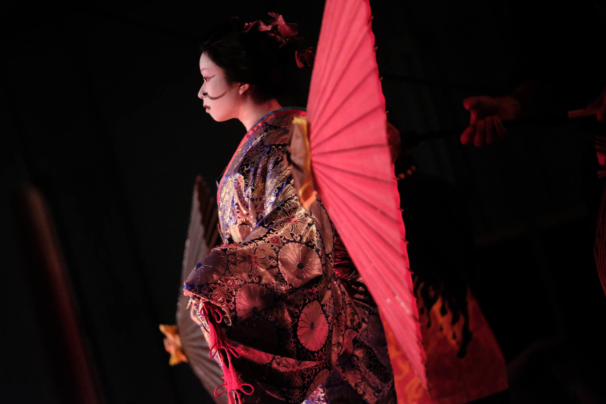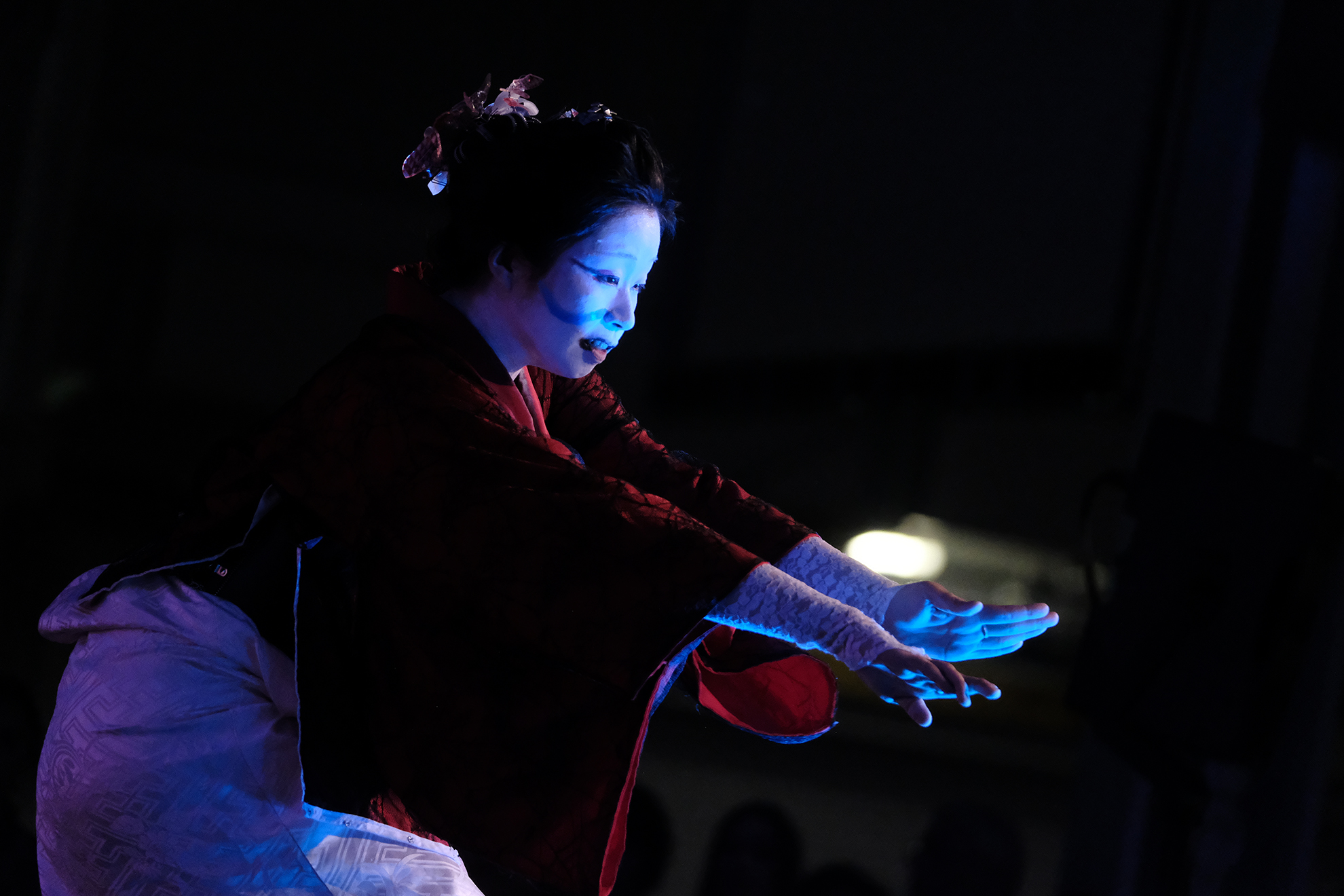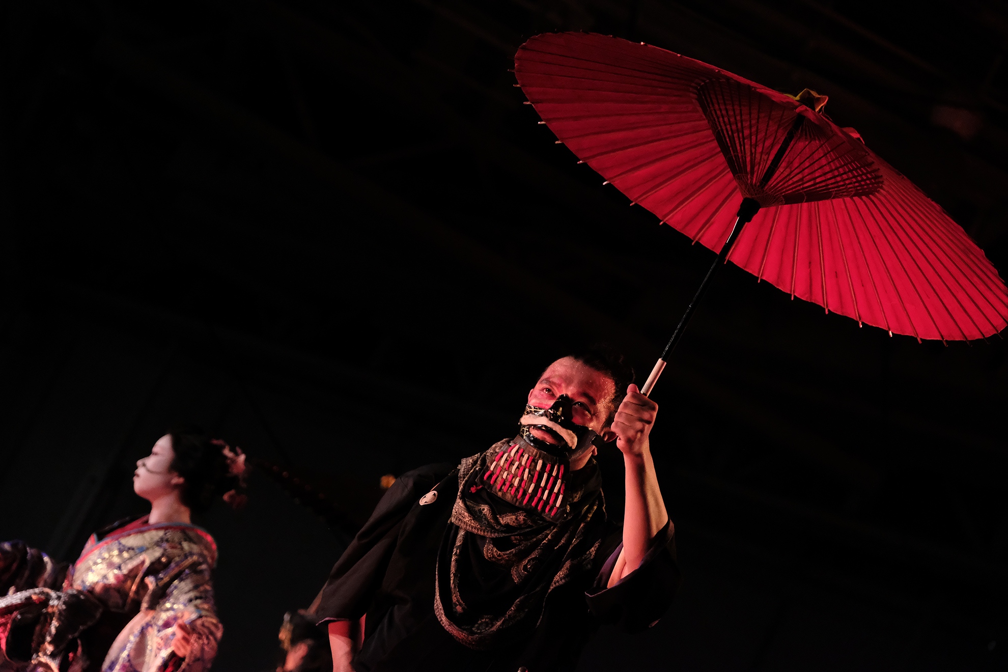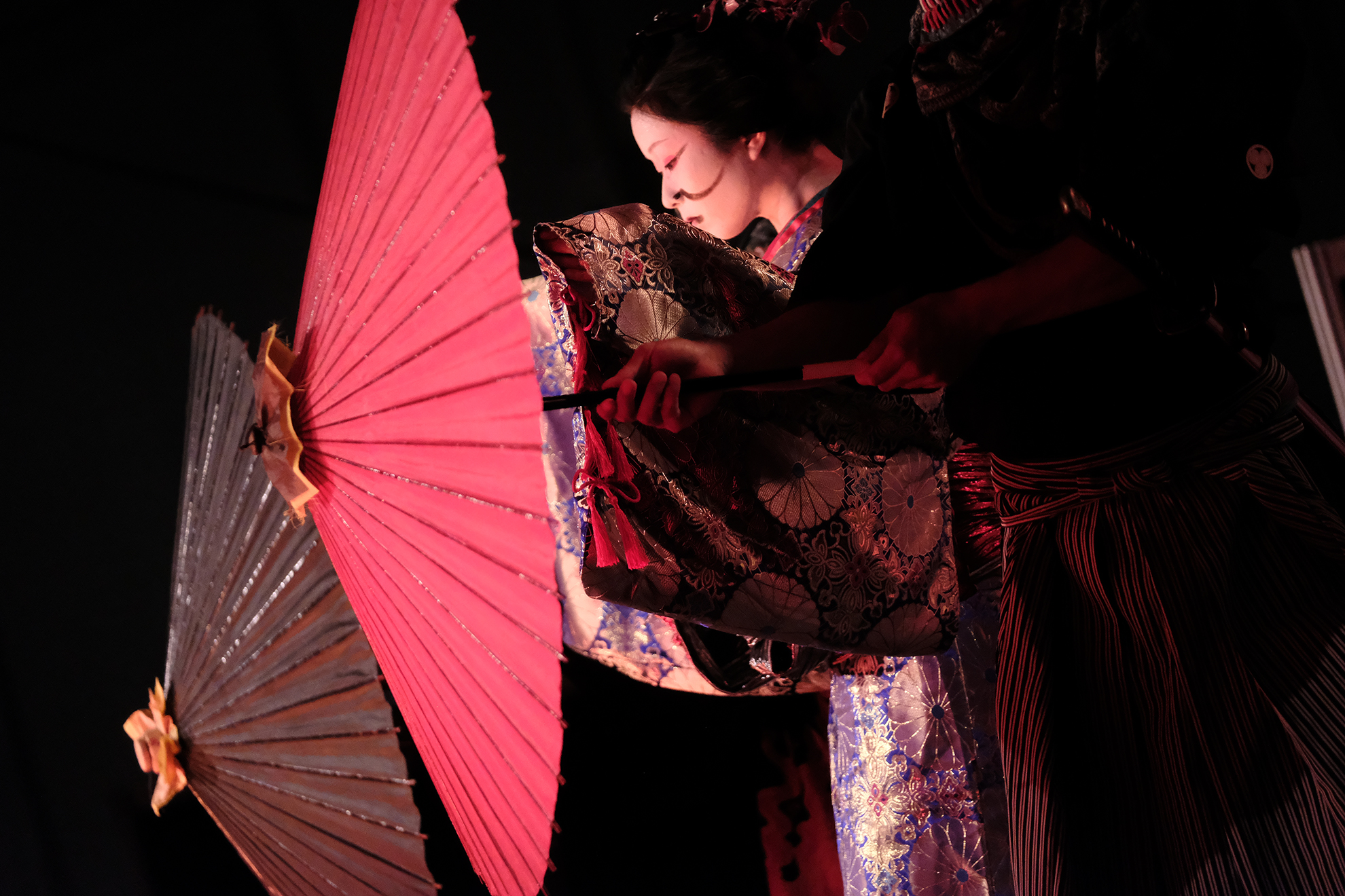 そして、同じ隈取メイクのJIGORO氏と番傘を手に持ちながら舞い始めます。見るからにすらりとした傾奇者・洒落者のJIGORO氏と妖艶なお着物姿の以津輝さん、そして”赤の番傘”を一振りすればつくづく美しく目を奪われます。