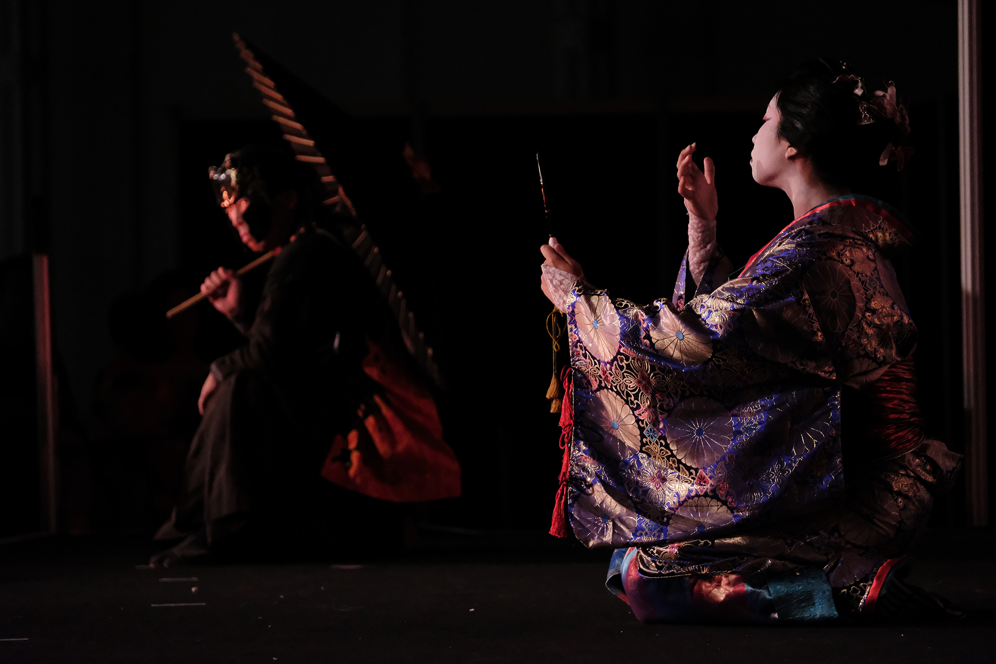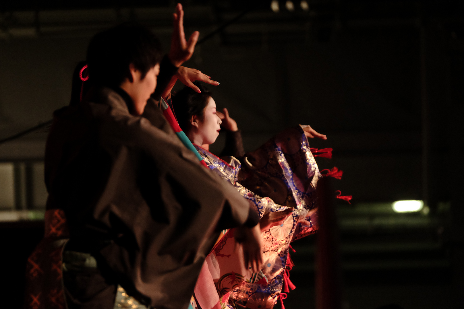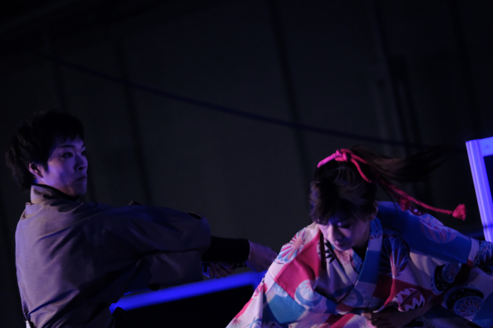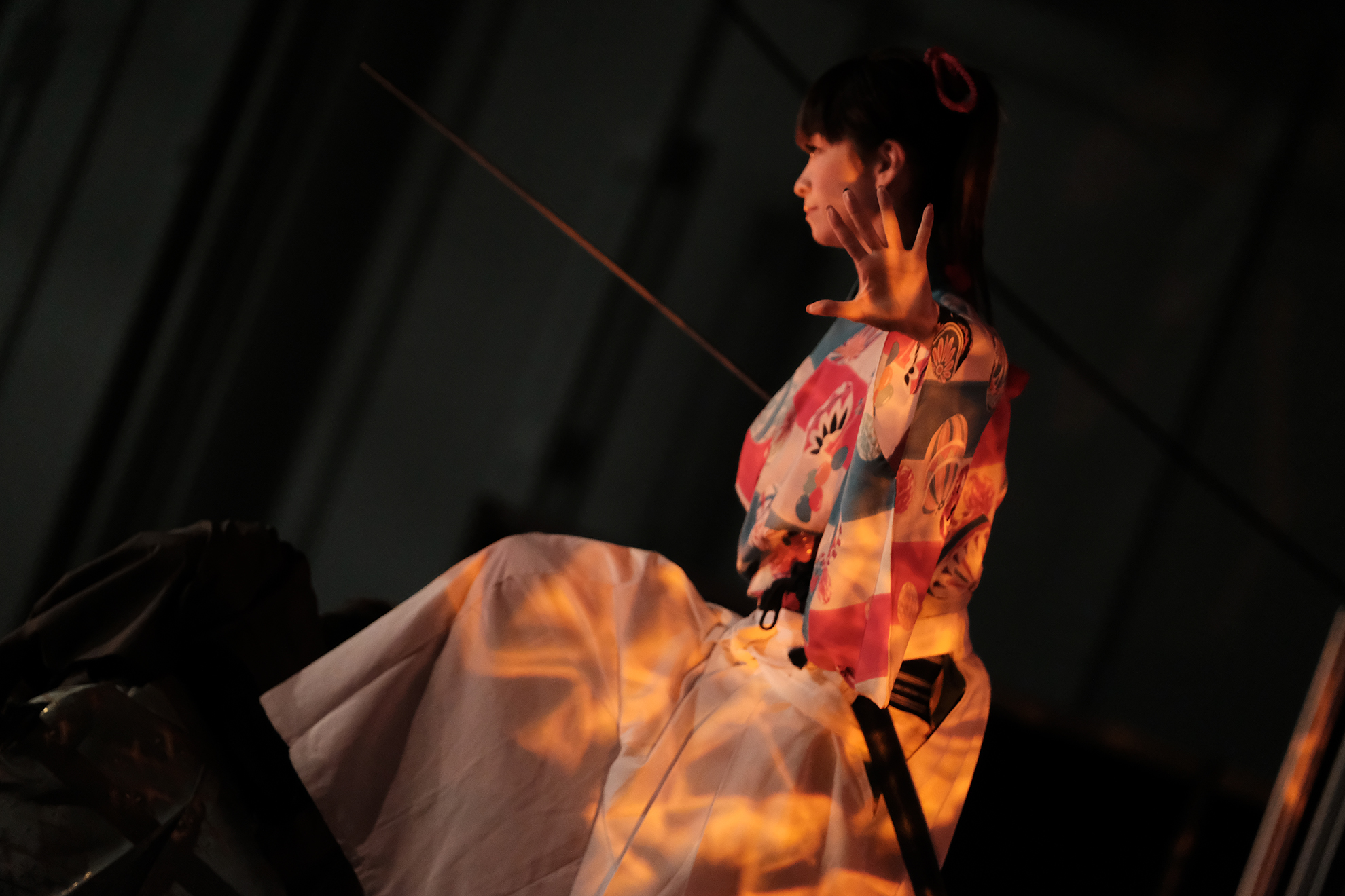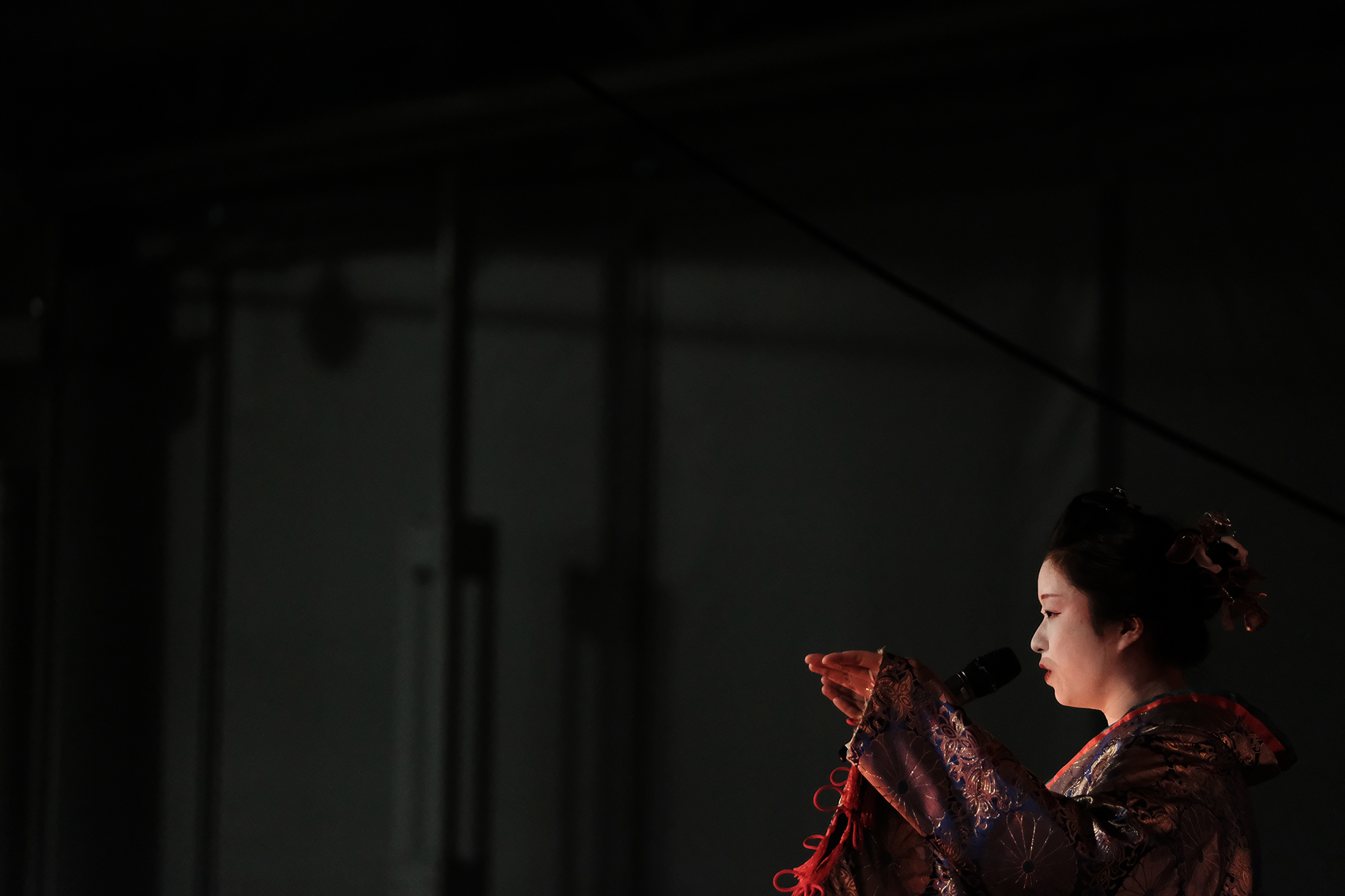 そして、同じ隈取メイクのJIGORO氏と番傘を手に持ちながら舞い始めます。見るからにすらりとした傾奇者・洒落者のJIGORO氏と妖艶なお着物姿の以津輝さん、そして”赤の番傘”を一振りすればつくづく美しく目を奪われます。