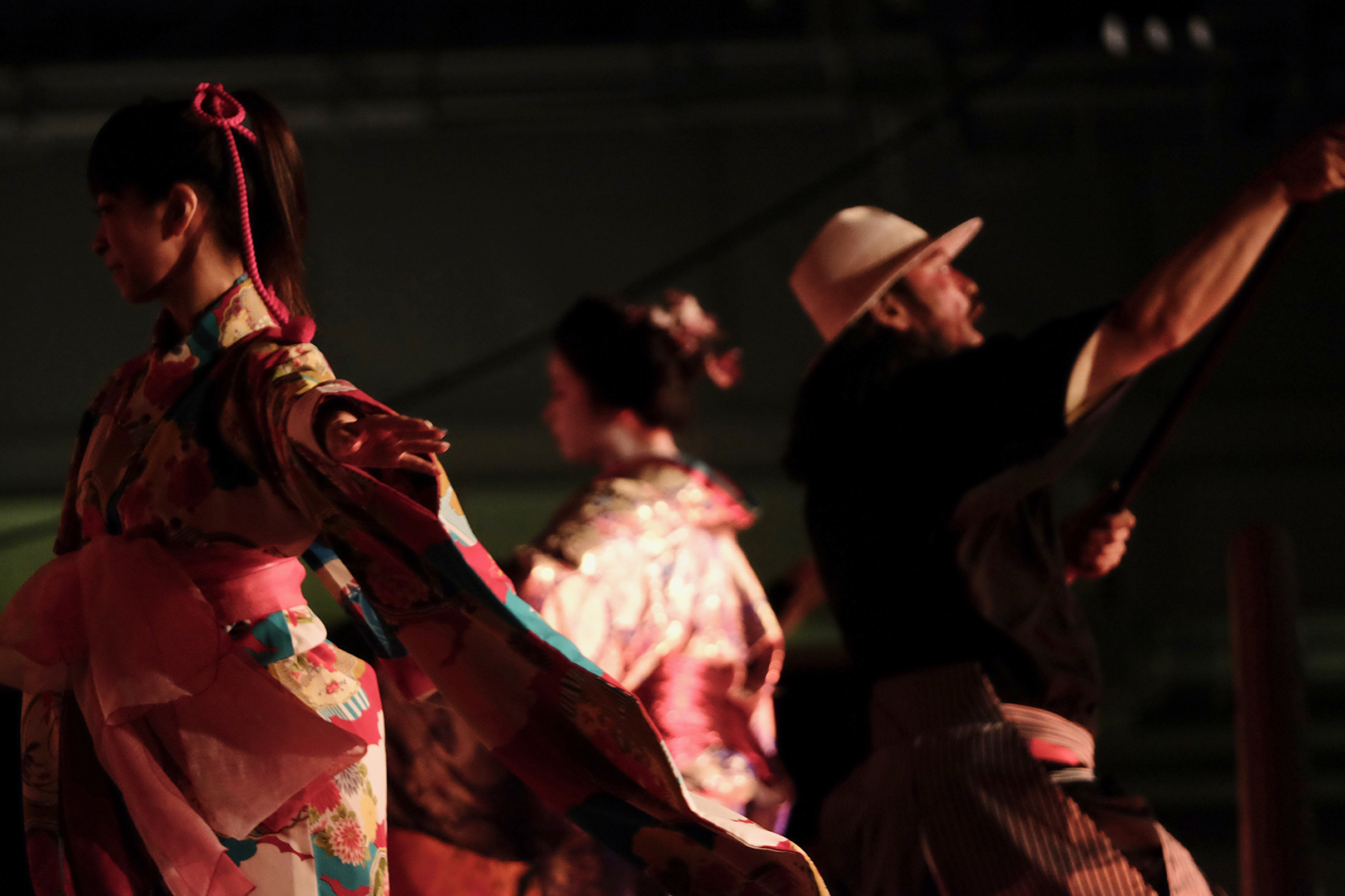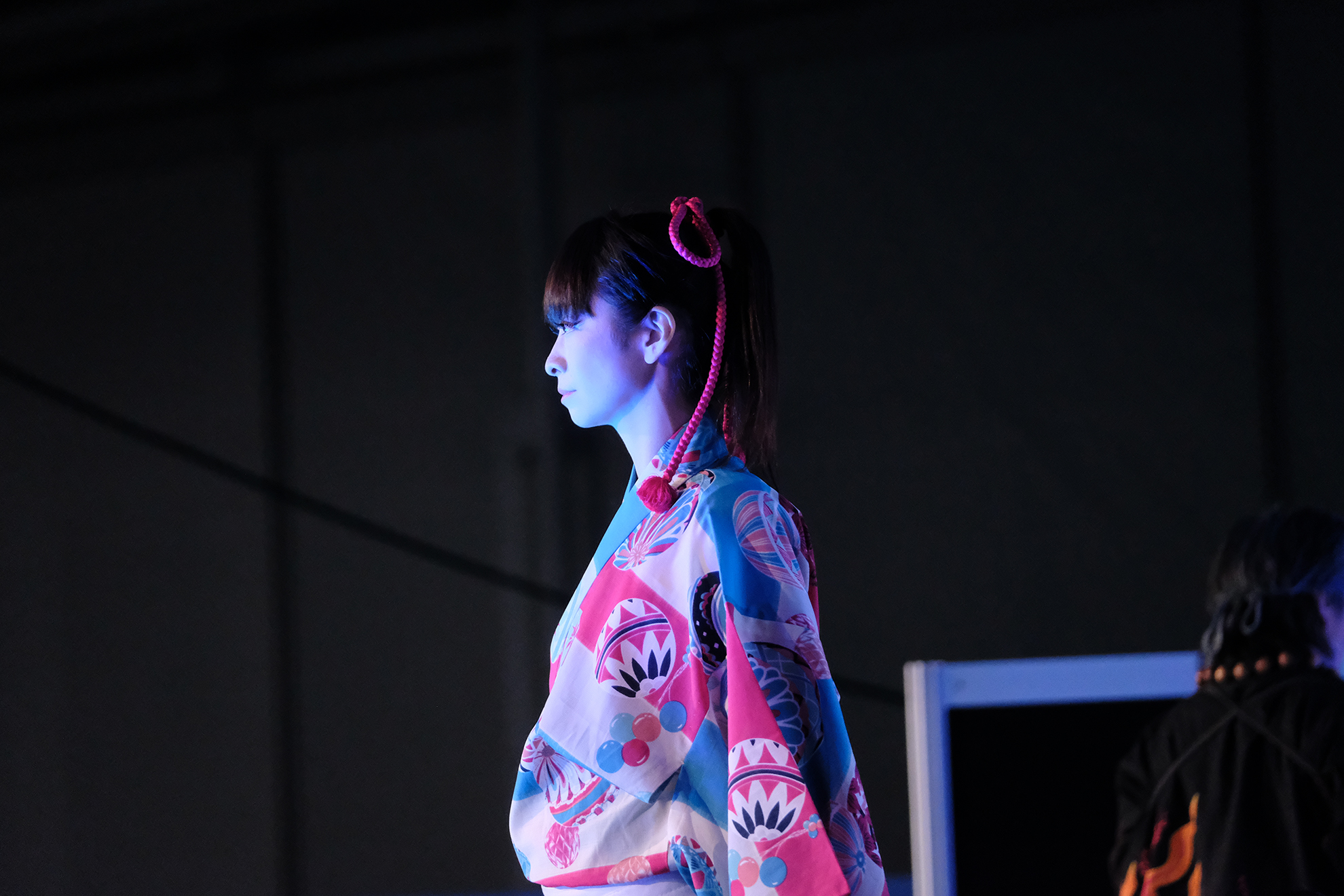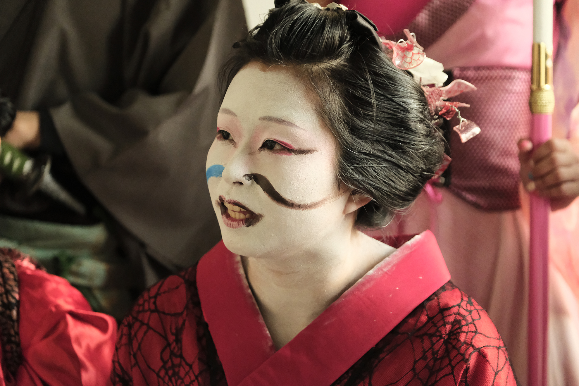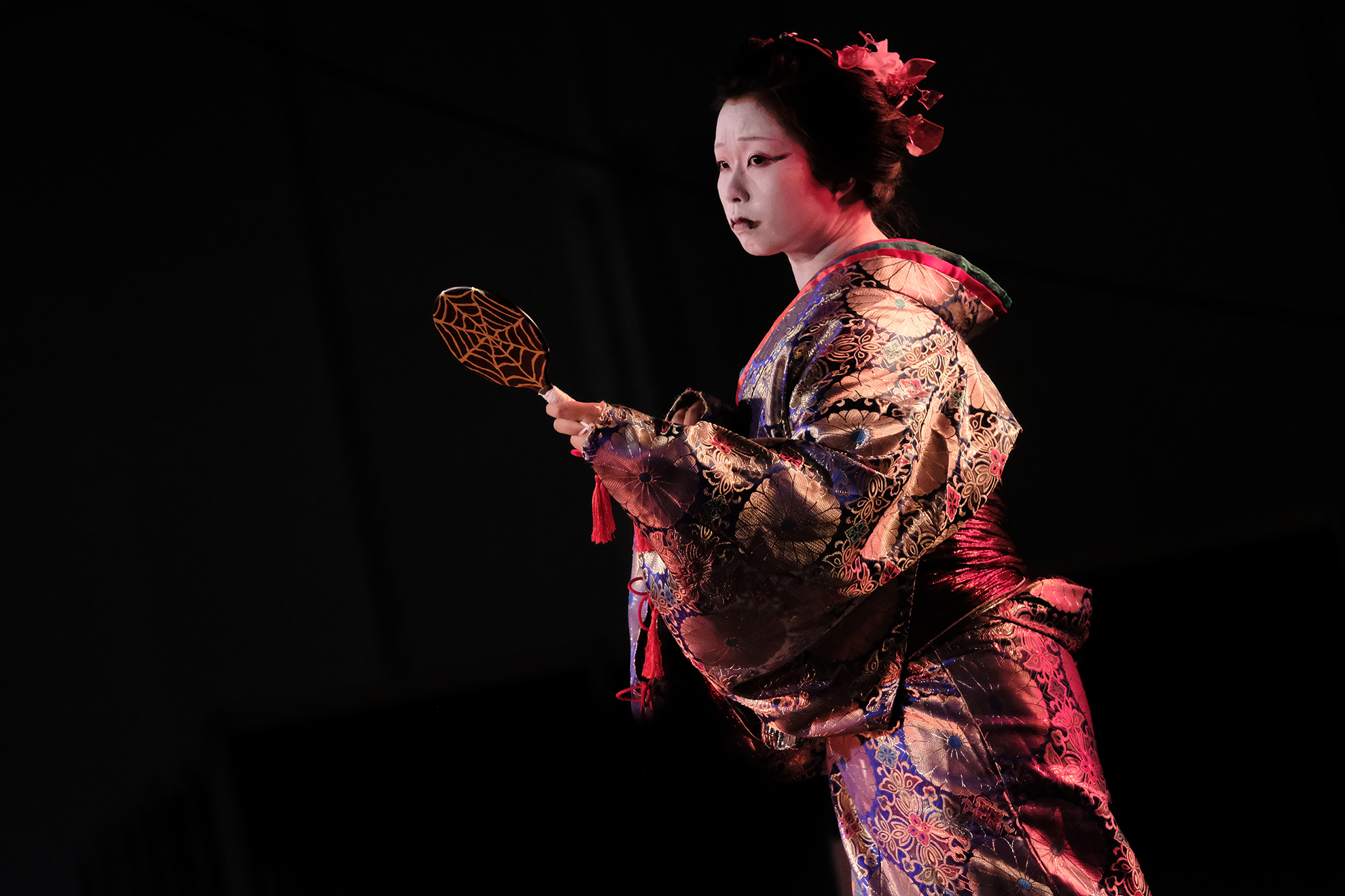 そして、同じ隈取メイクのJIGORO氏と番傘を手に持ちながら舞い始めます。見るからにすらりとした傾奇者・洒落者のJIGORO氏と妖艶なお着物姿の以津輝さん、そして”赤の番傘”を一振りすればつくづく美しく目を奪われます。