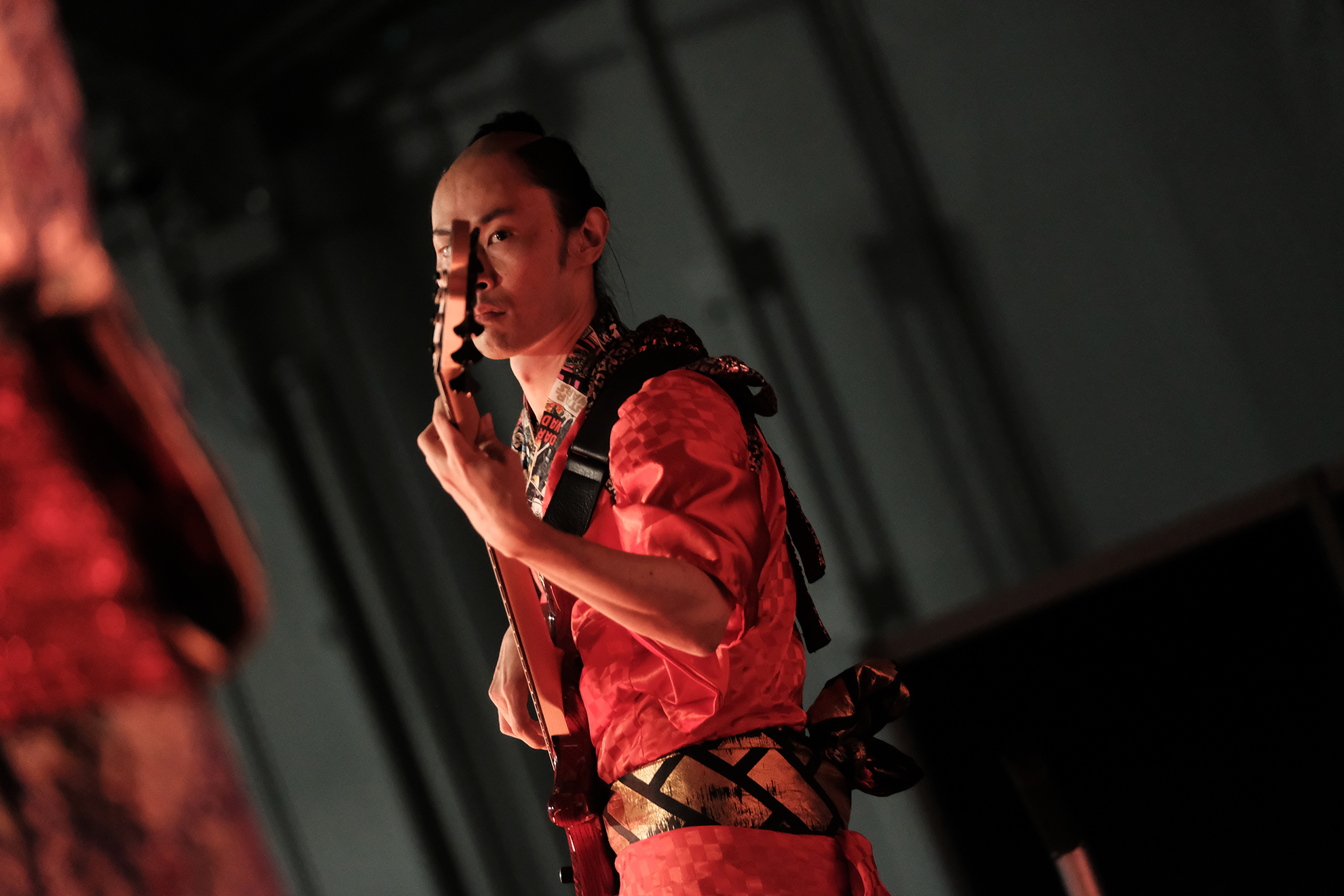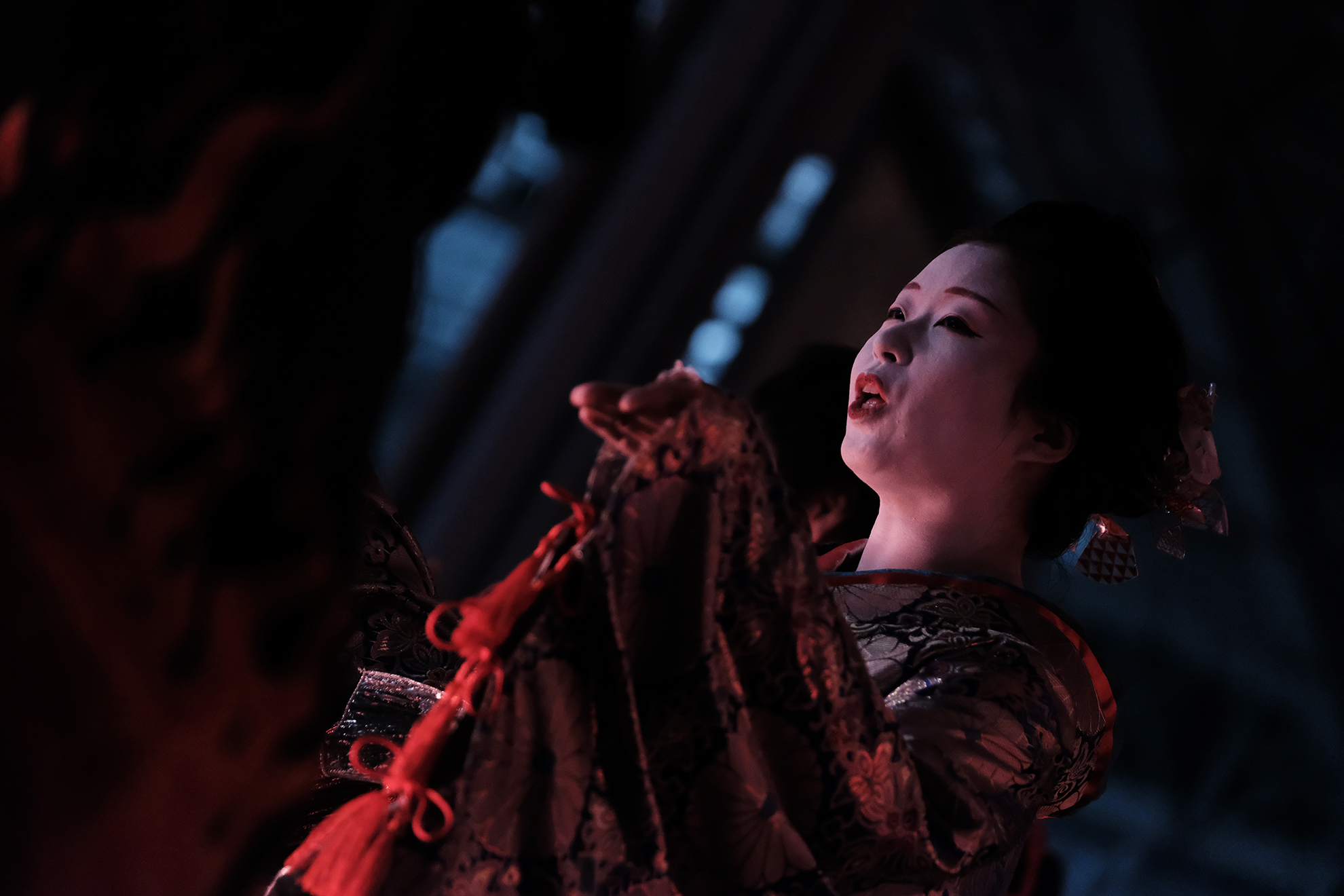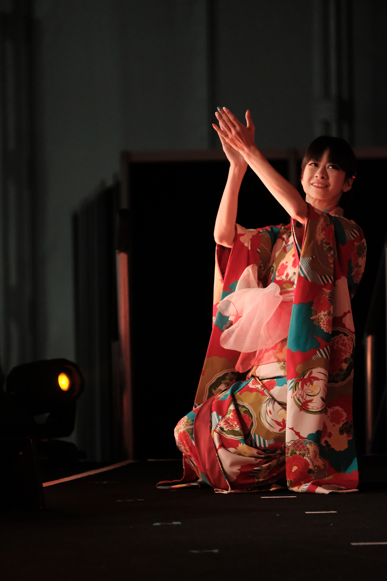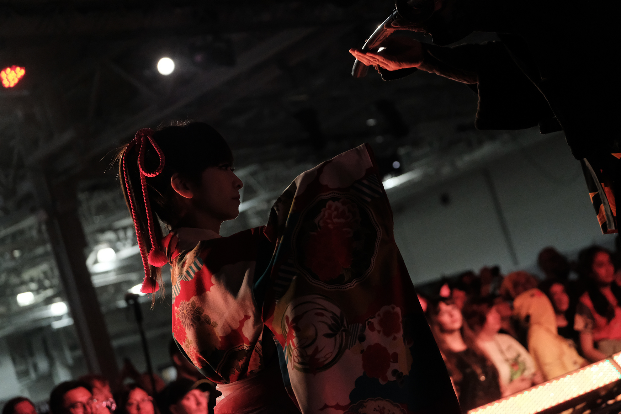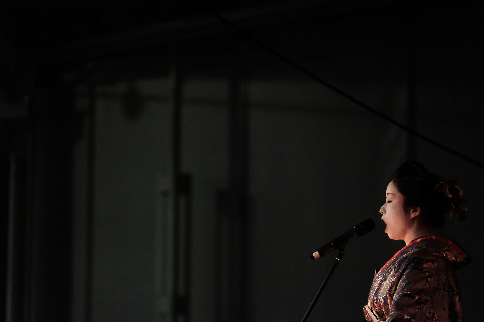 そして、同じ隈取メイクのJIGORO氏と番傘を手に持ちながら舞い始めます。見るからにすらりとした傾奇者・洒落者のJIGORO氏と妖艶なお着物姿の以津輝さん、そして”赤の番傘”を一振りすればつくづく美しく目を奪われます。
