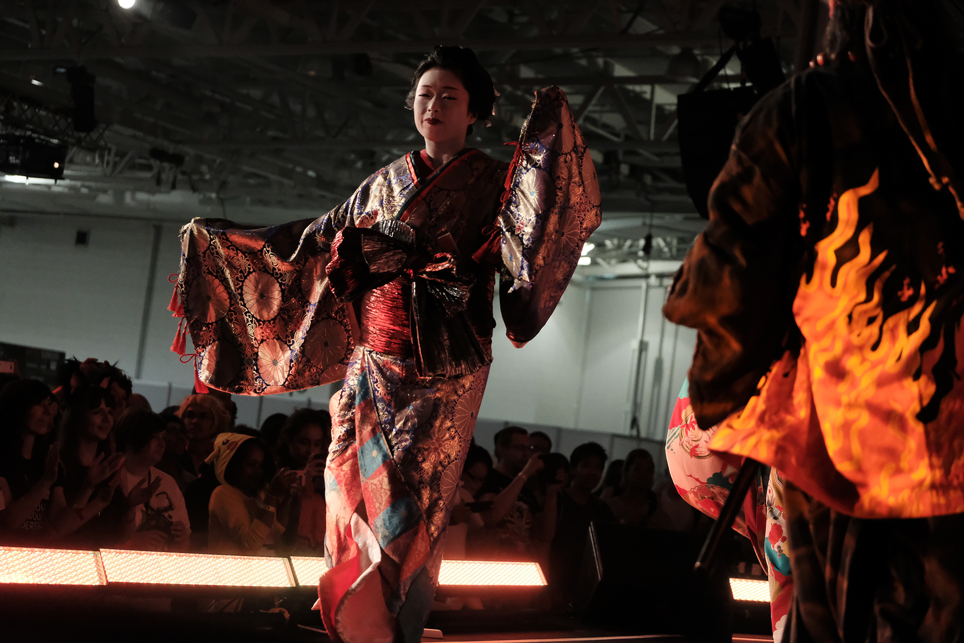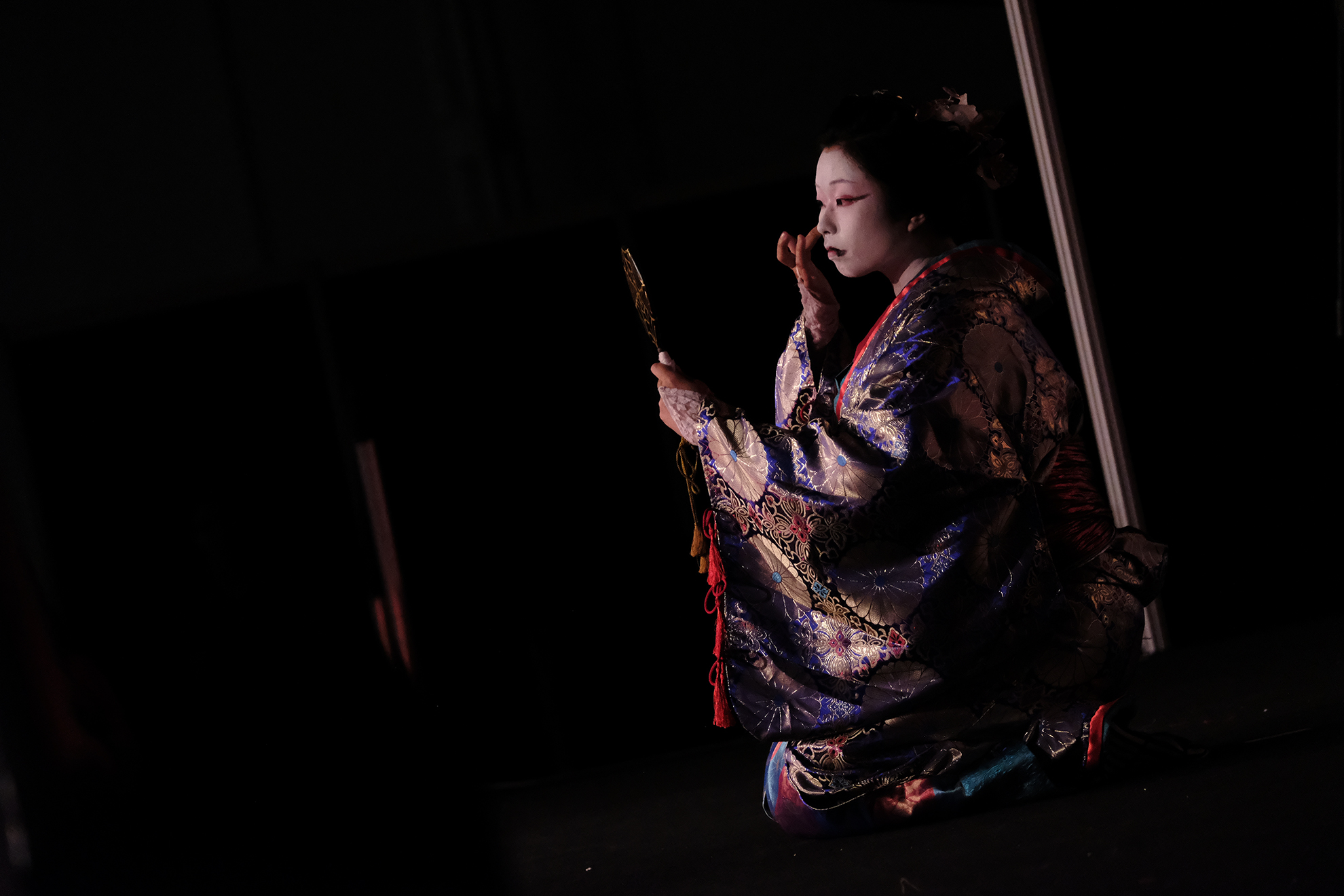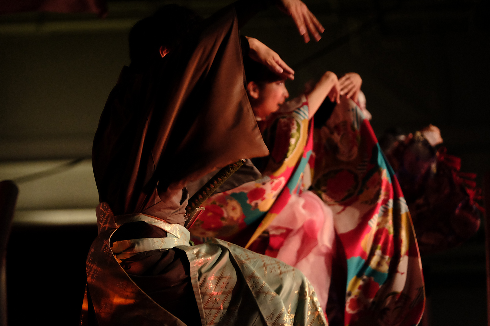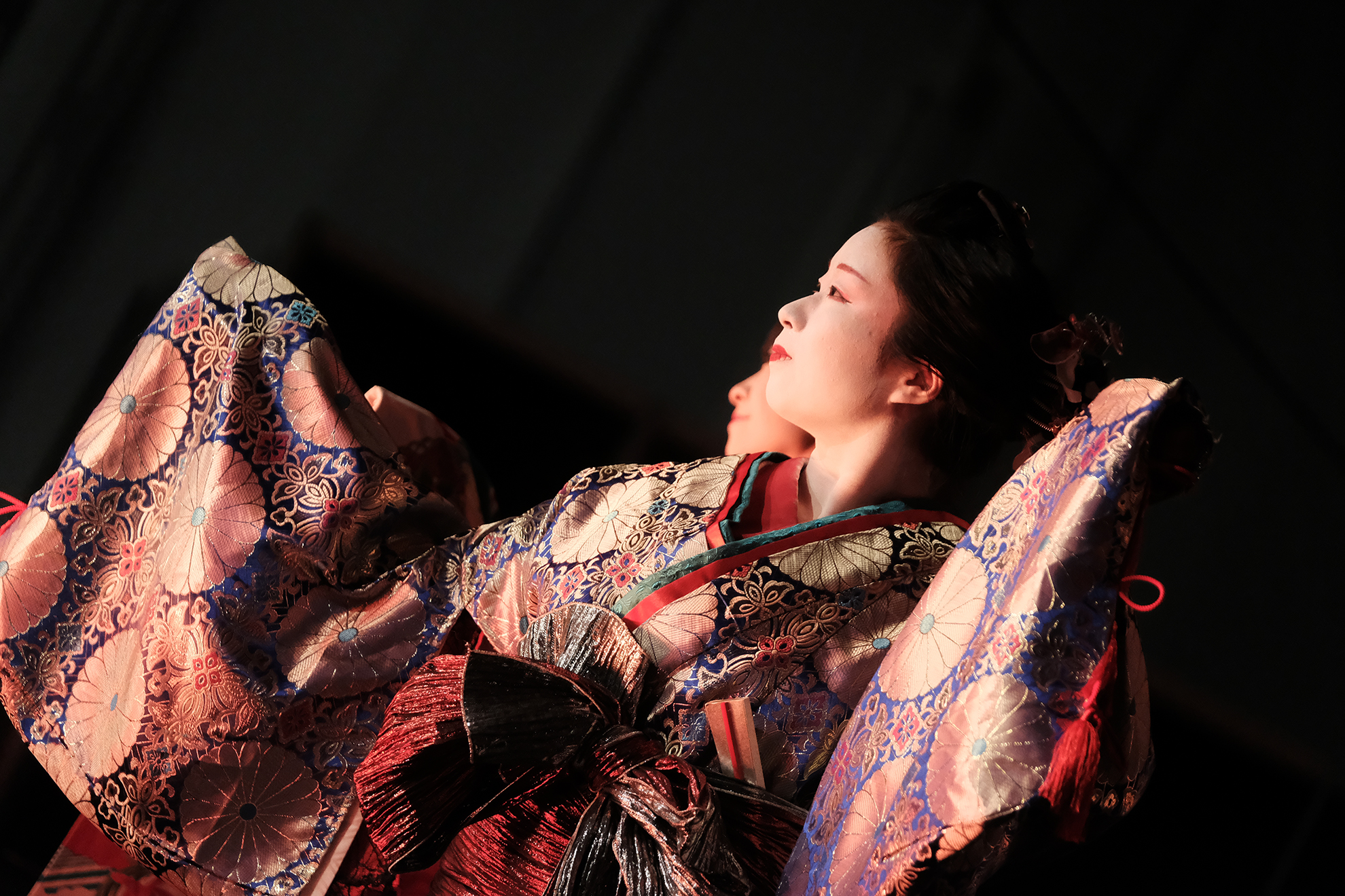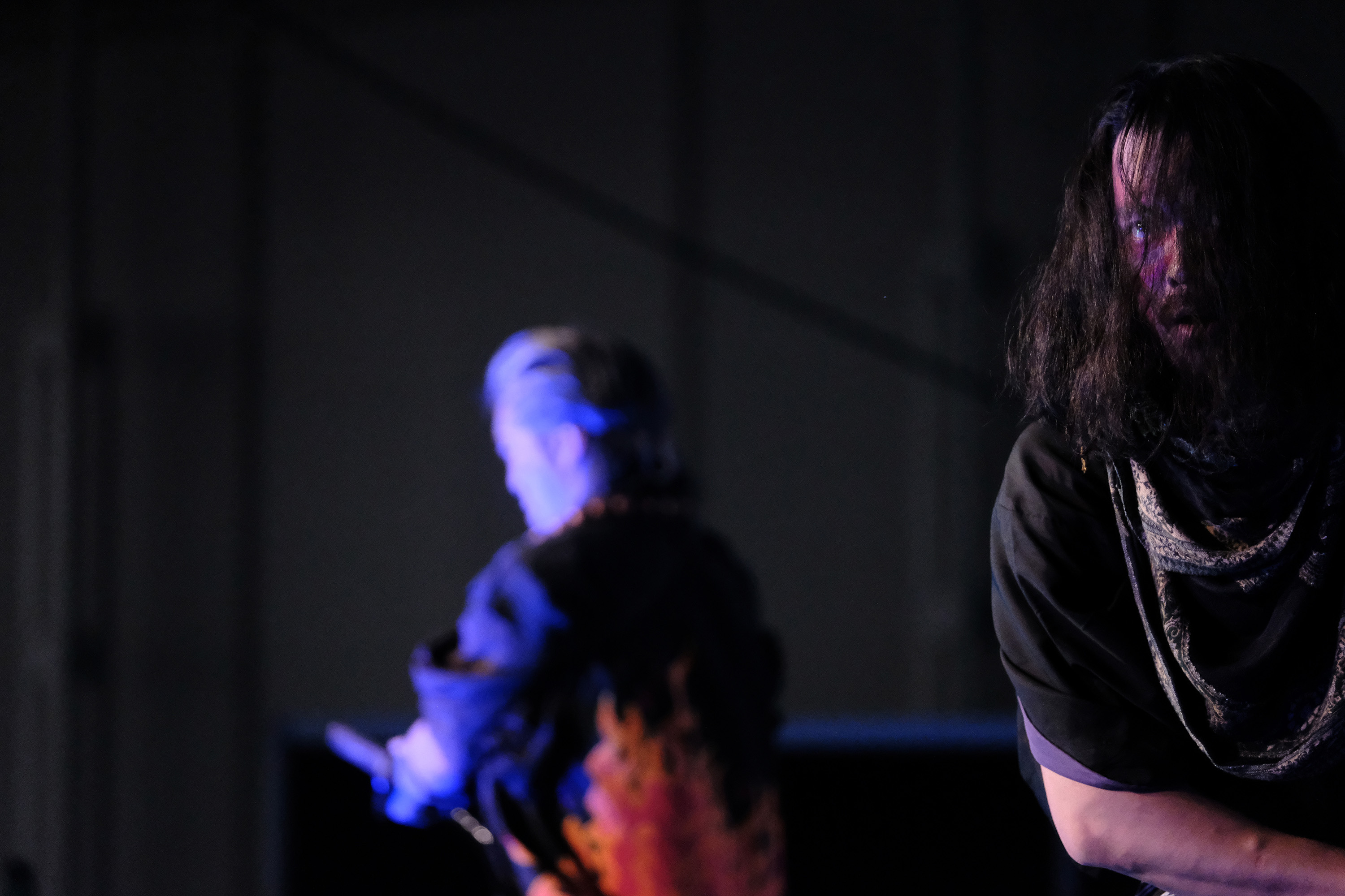 そして、同じ隈取メイクのJIGORO氏と番傘を手に持ちながら舞い始めます。見るからにすらりとした傾奇者・洒落者のJIGORO氏と妖艶なお着物姿の以津輝さん、そして”赤の番傘”を一振りすればつくづく美しく目を奪われます。