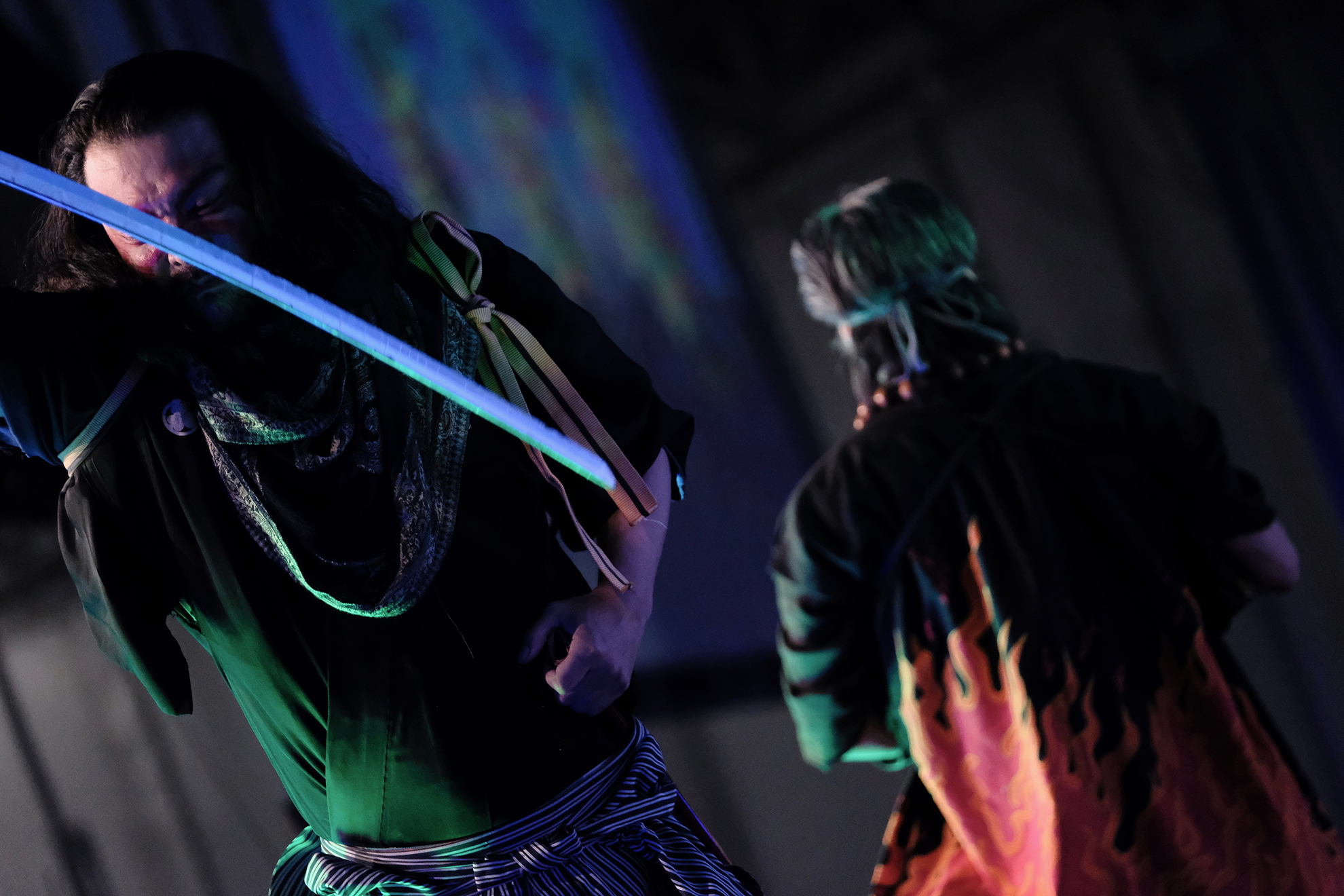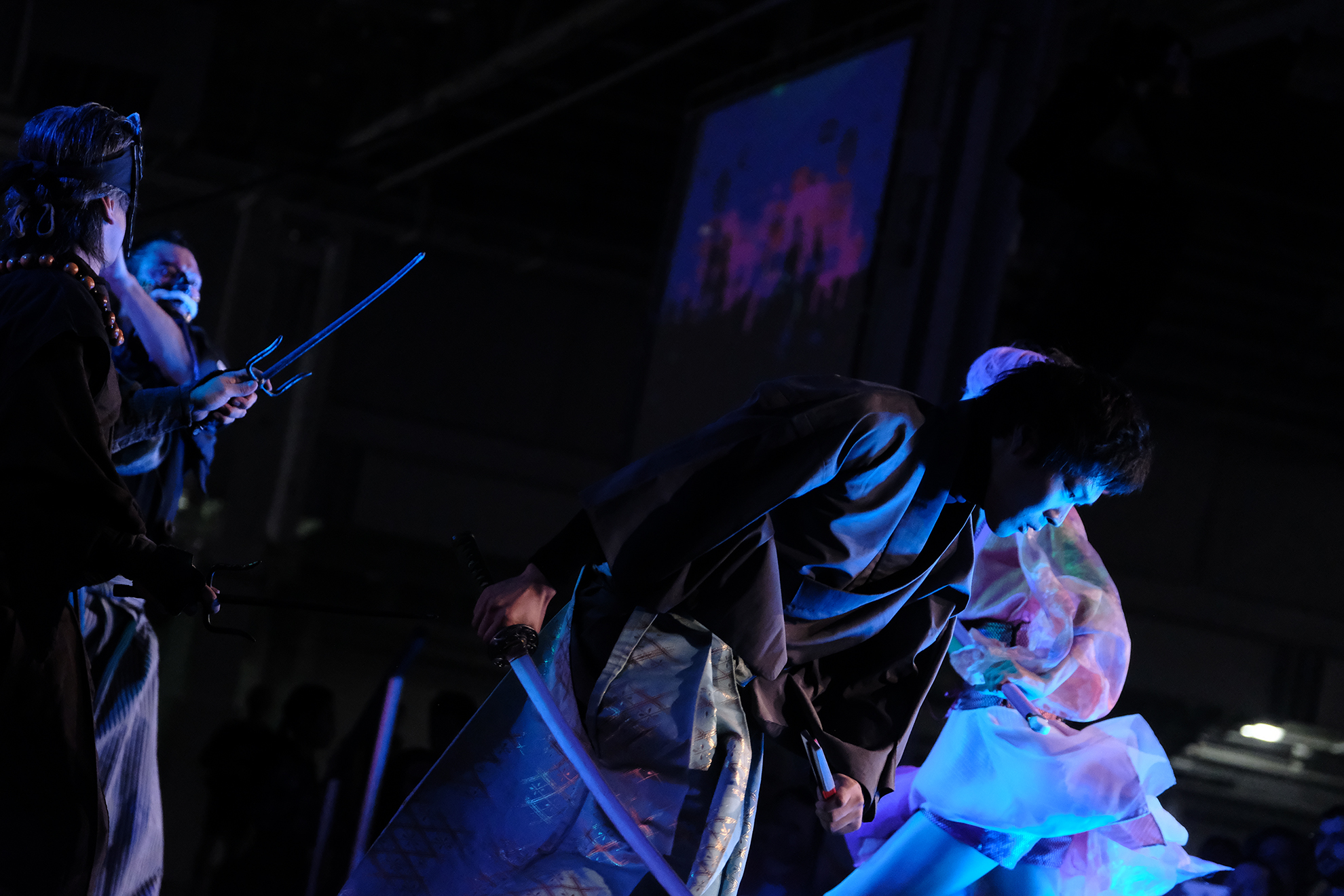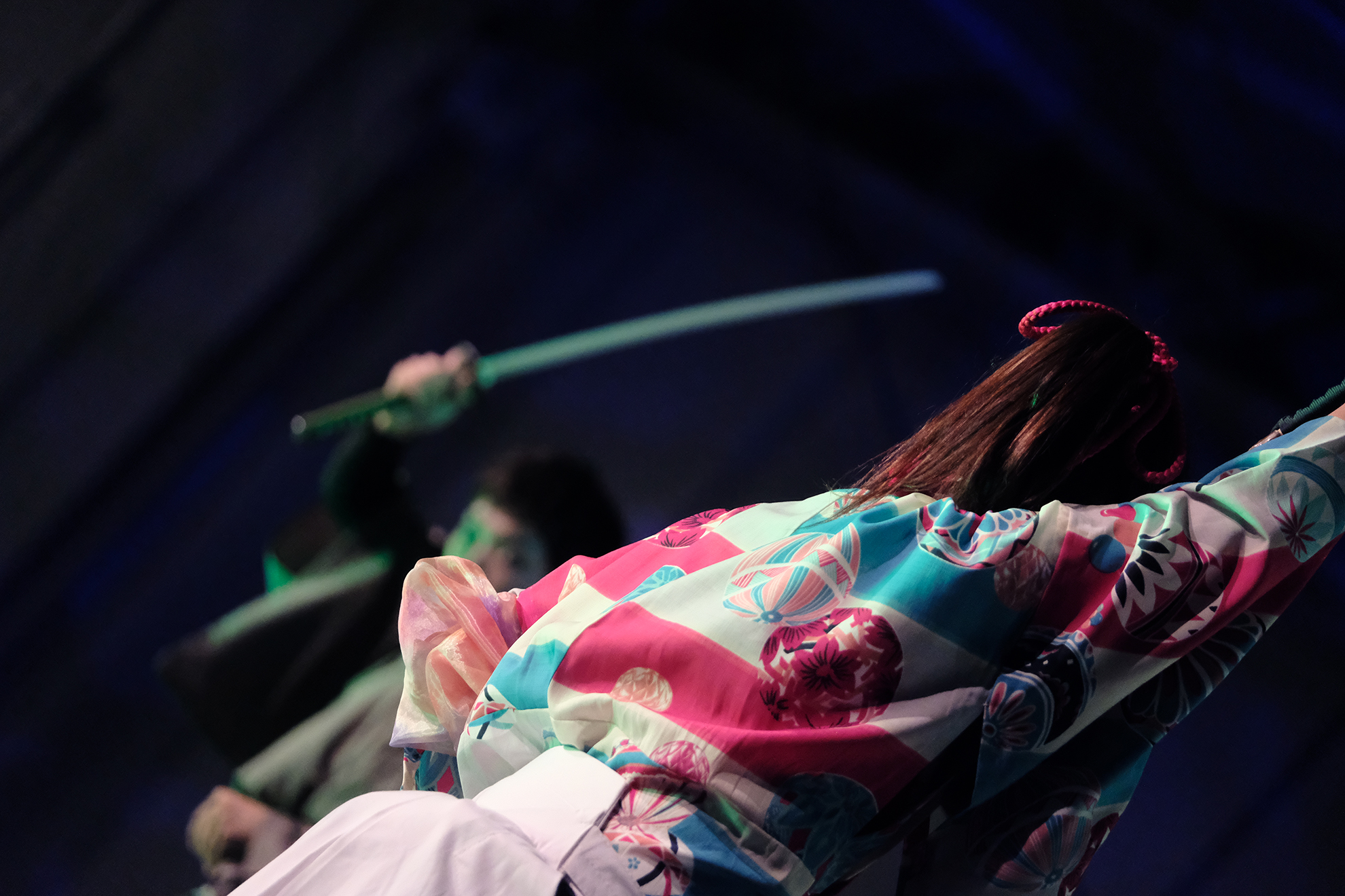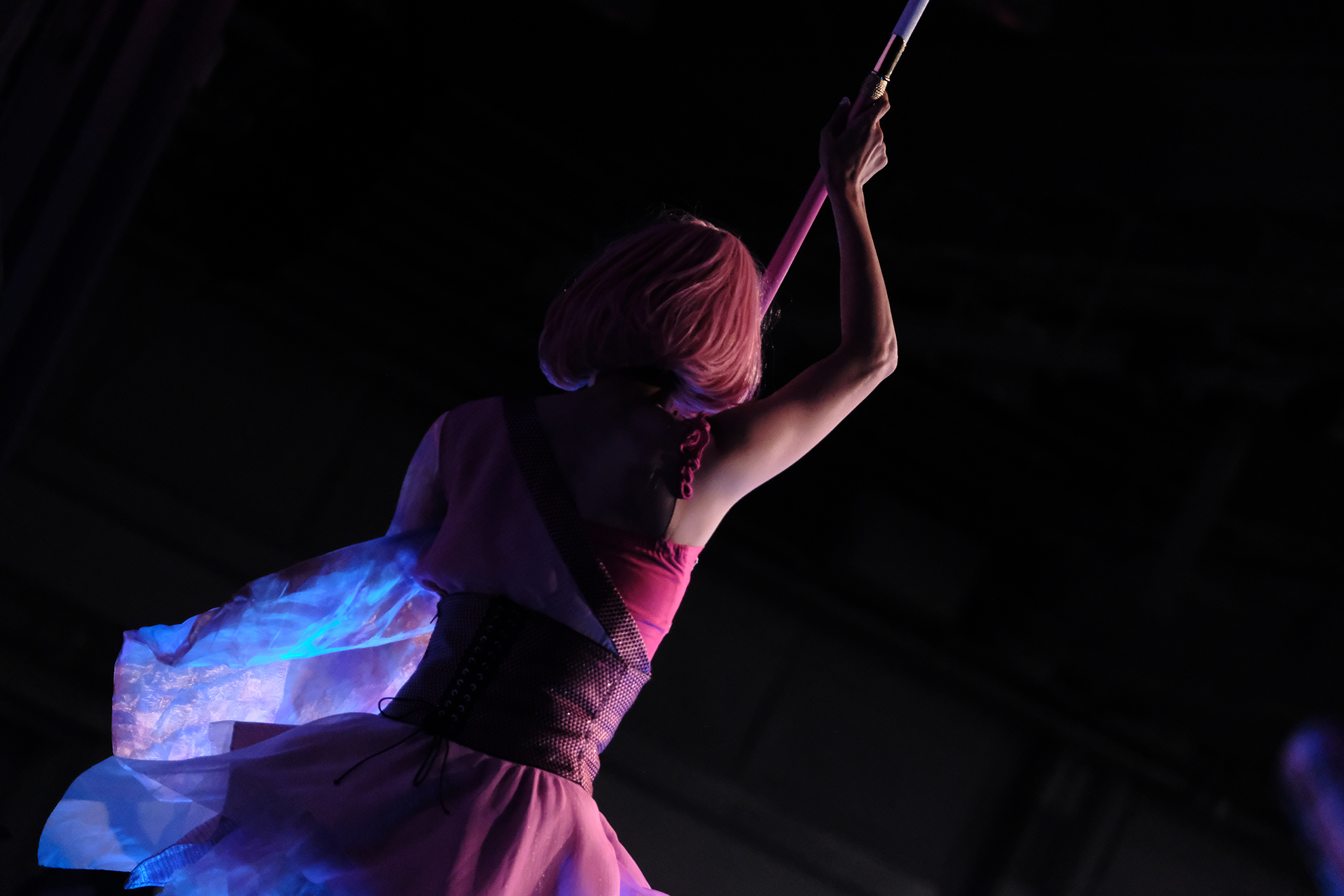 小松雅樹氏、竹本洋平氏、そして一際美しく目立つピンクのかつらと衣装で武器も持ち替えたNatsunAさんら殺陣役者陣とバイオリンの圭恵さんが舞台へ舞い戻り、メンバー全員での渾身のパフォーマンスが繰り広げられて行きました。