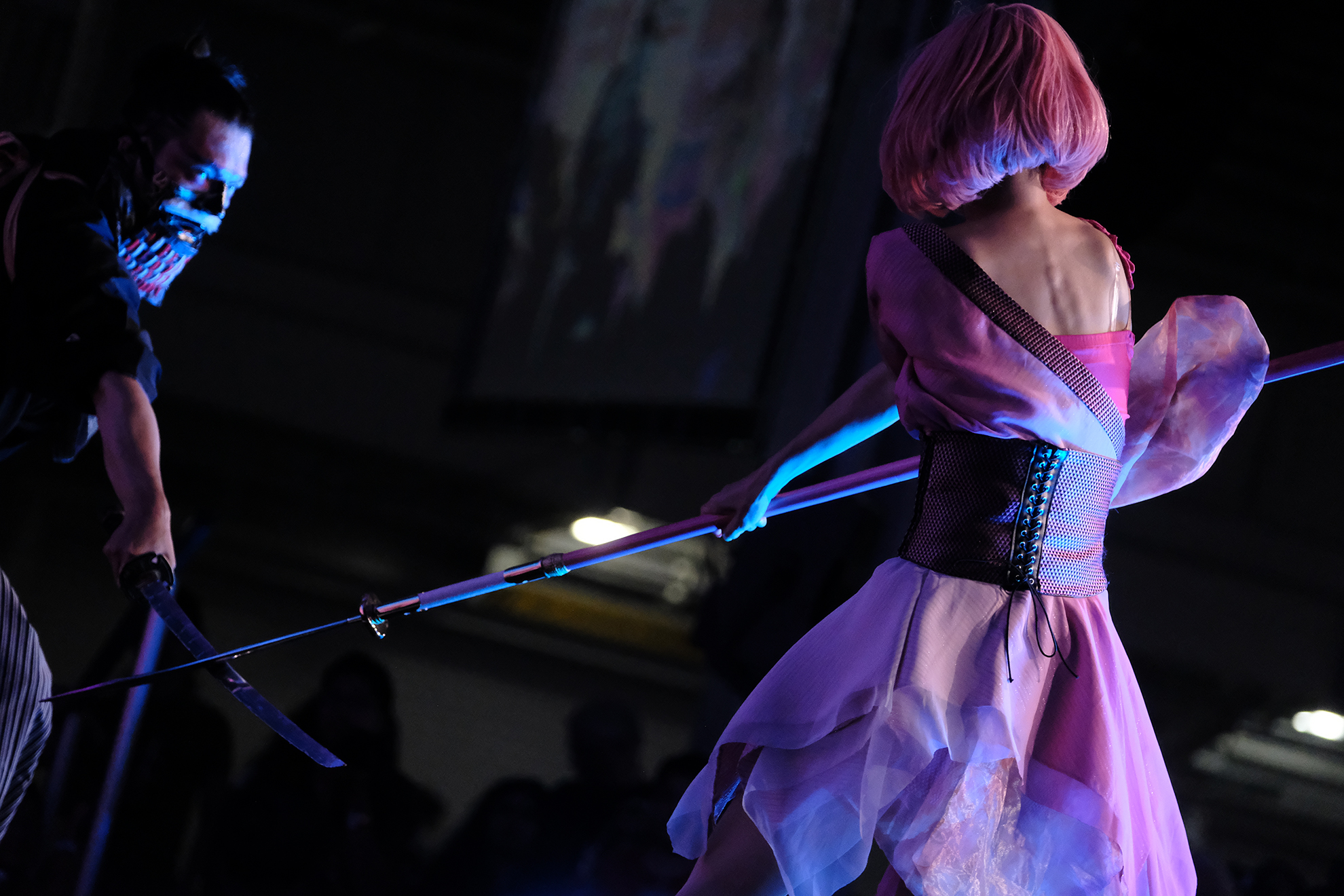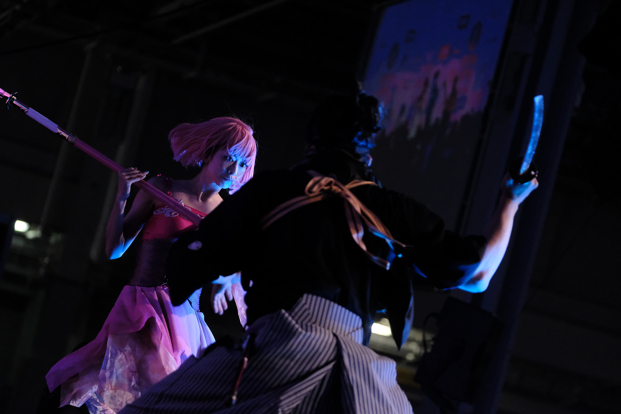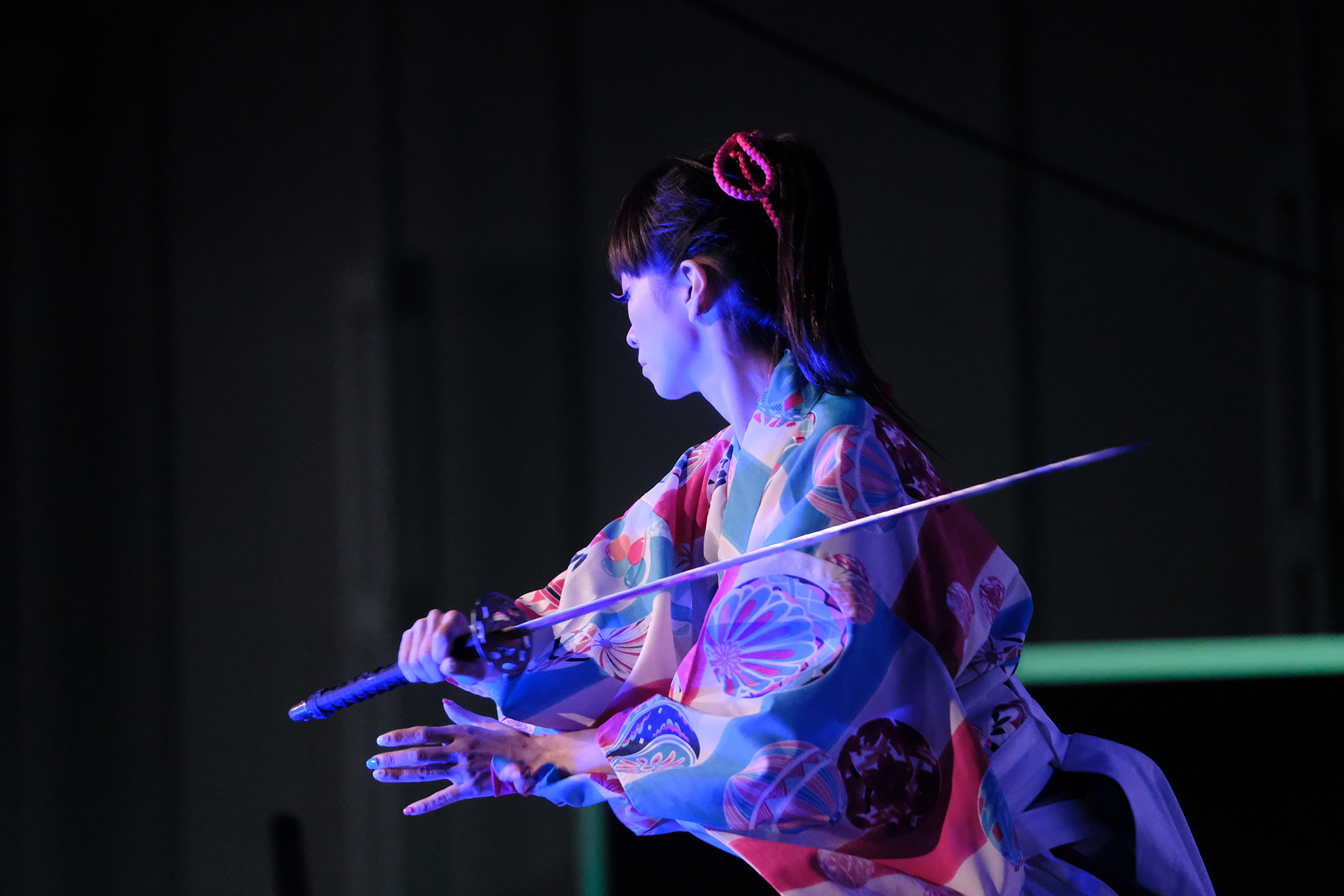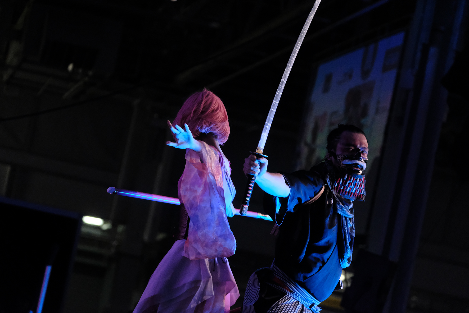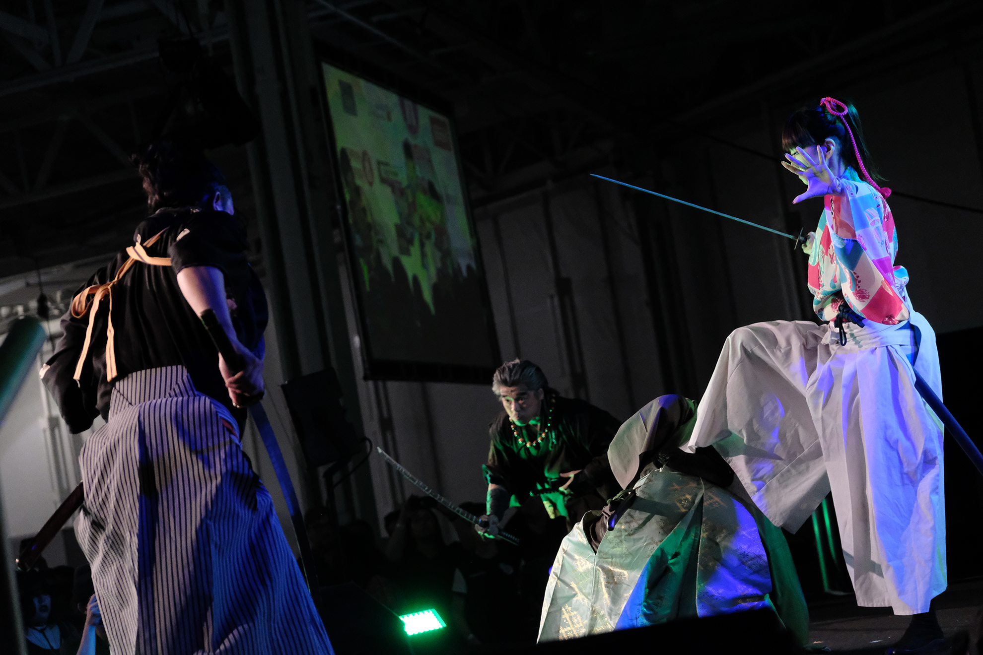 小松雅樹氏、竹本洋平氏、そして一際美しく目立つピンクのかつらと衣装で武器も持ち替えたNatsunAさんら殺陣役者陣とバイオリンの圭恵さんが舞台へ舞い戻り、メンバー全員での渾身のパフォーマンスが繰り広げられて行きました。