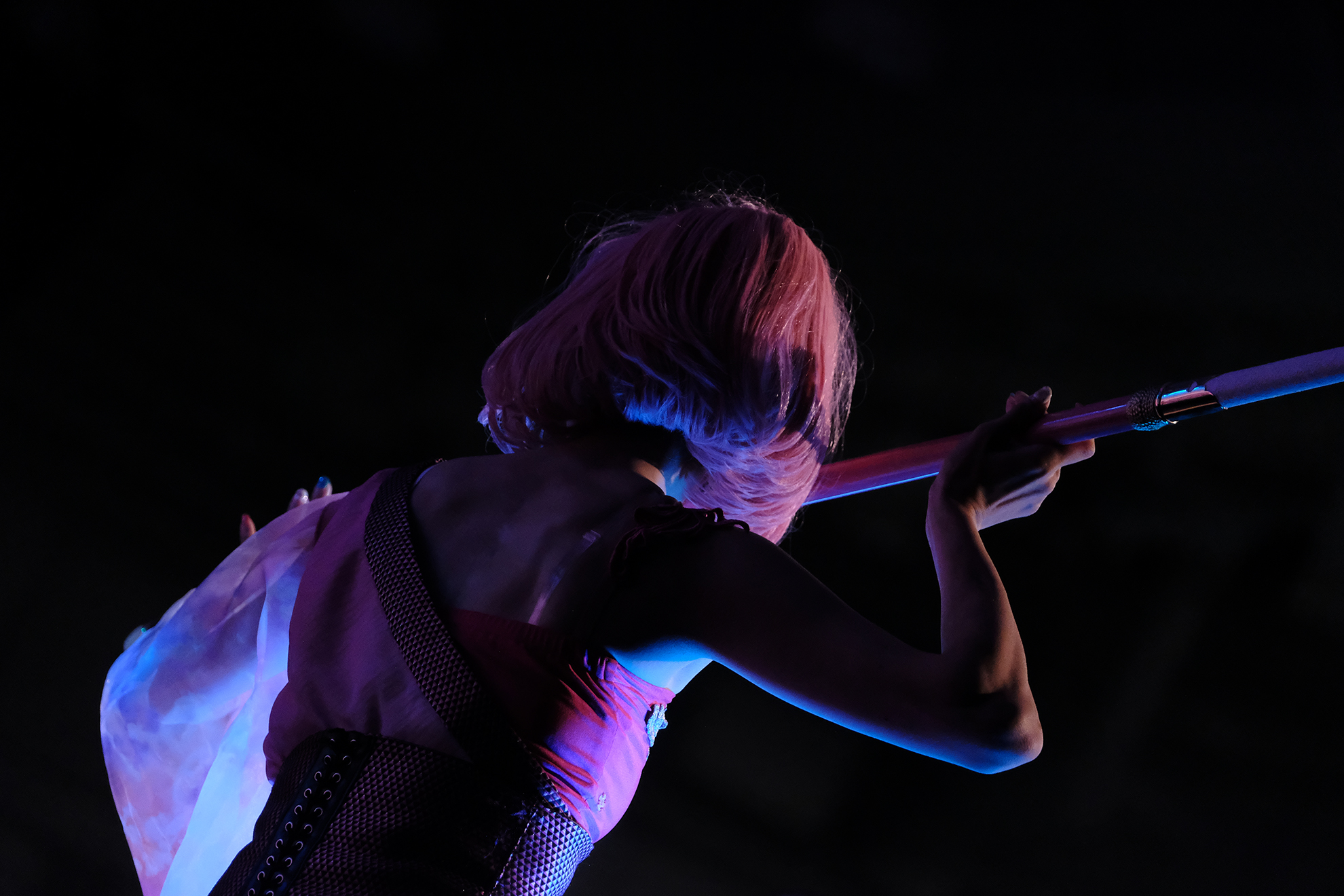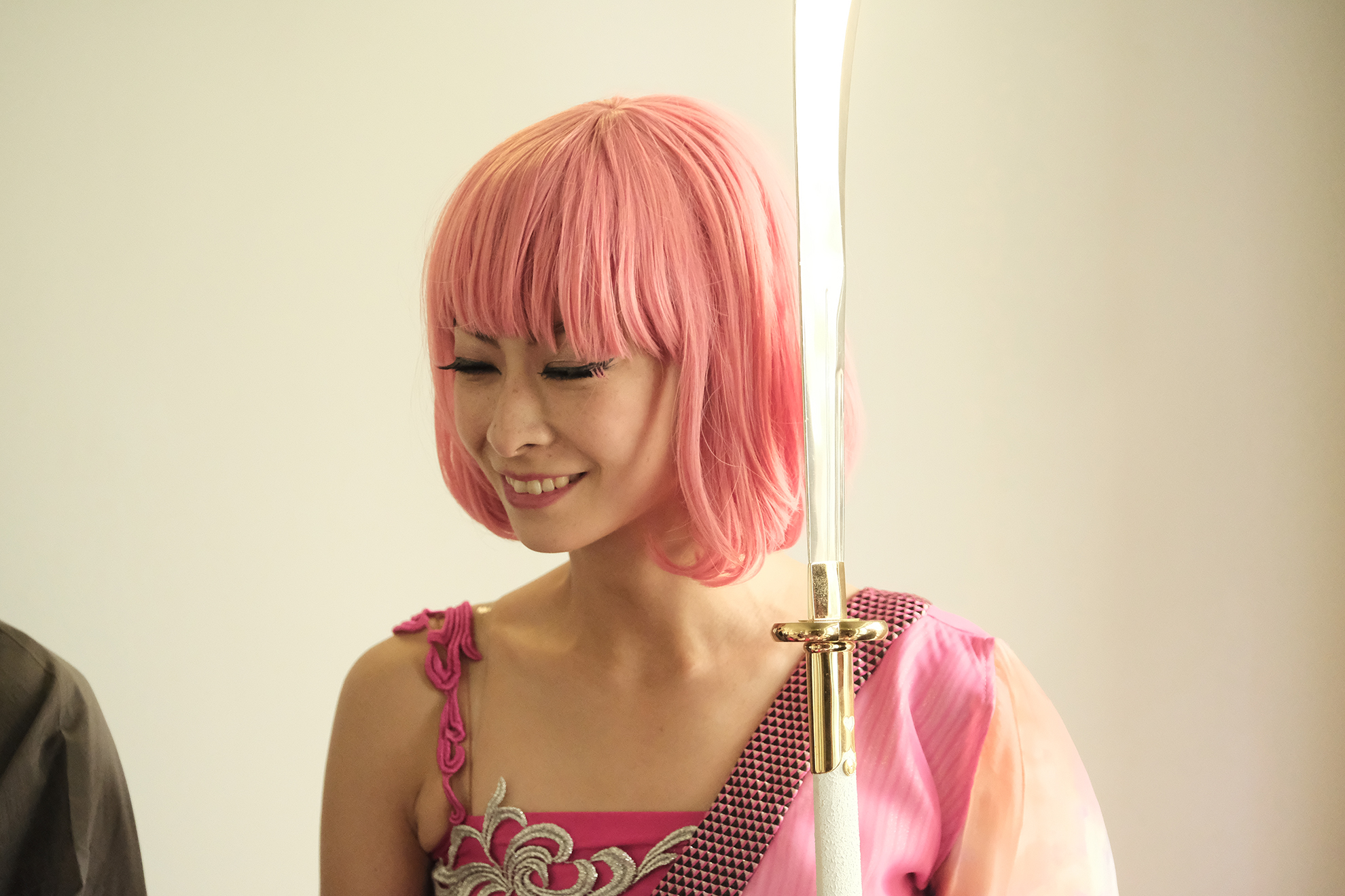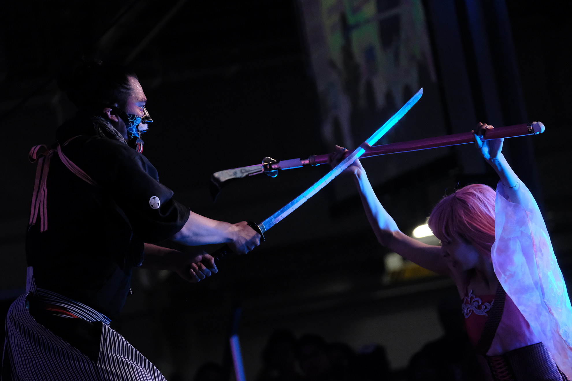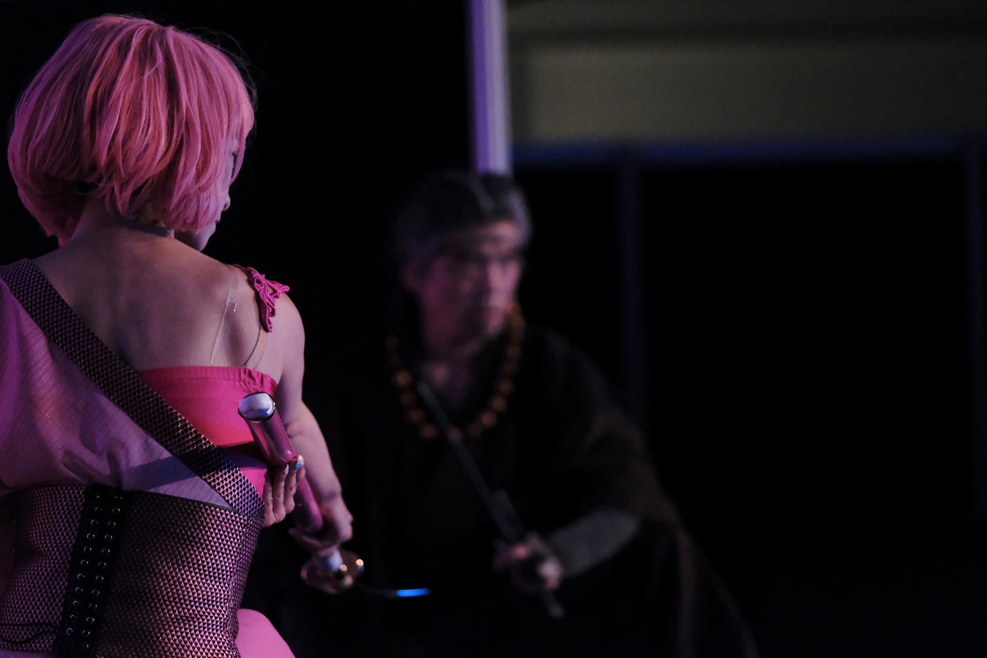小松雅樹氏、竹本洋平氏、そして一際美しく目立つピンクのかつらと衣装で武器も持ち替えたNatsunAさんら殺陣役者陣とバイオリンの圭恵さんが舞台へ舞い戻り、メンバー全員での渾身のパフォーマンスが繰り広げられて行きました。