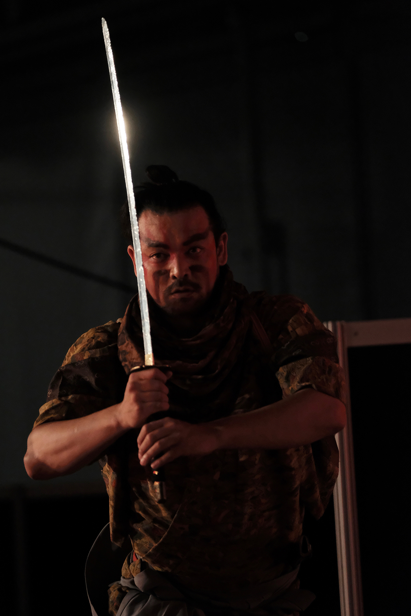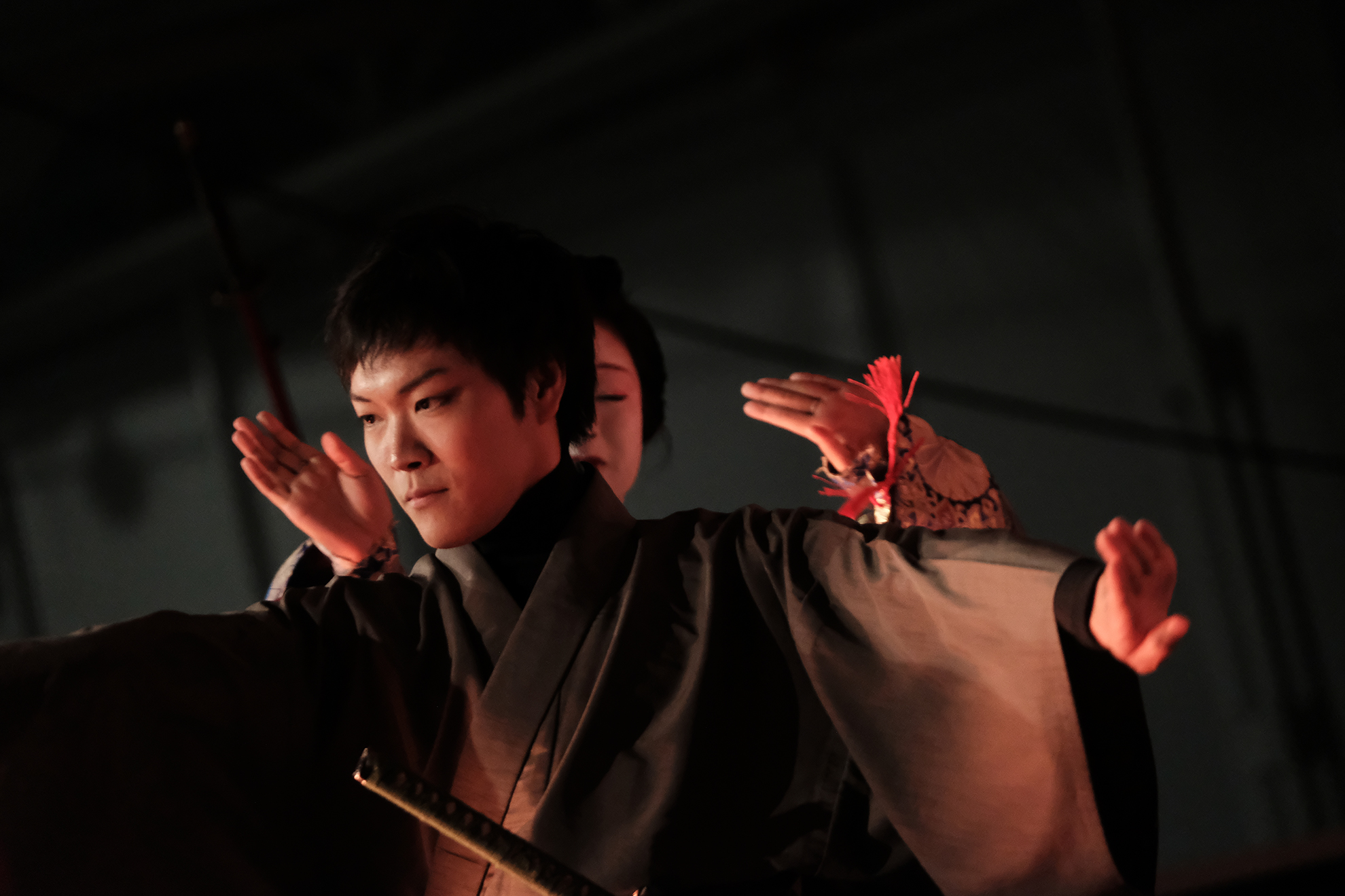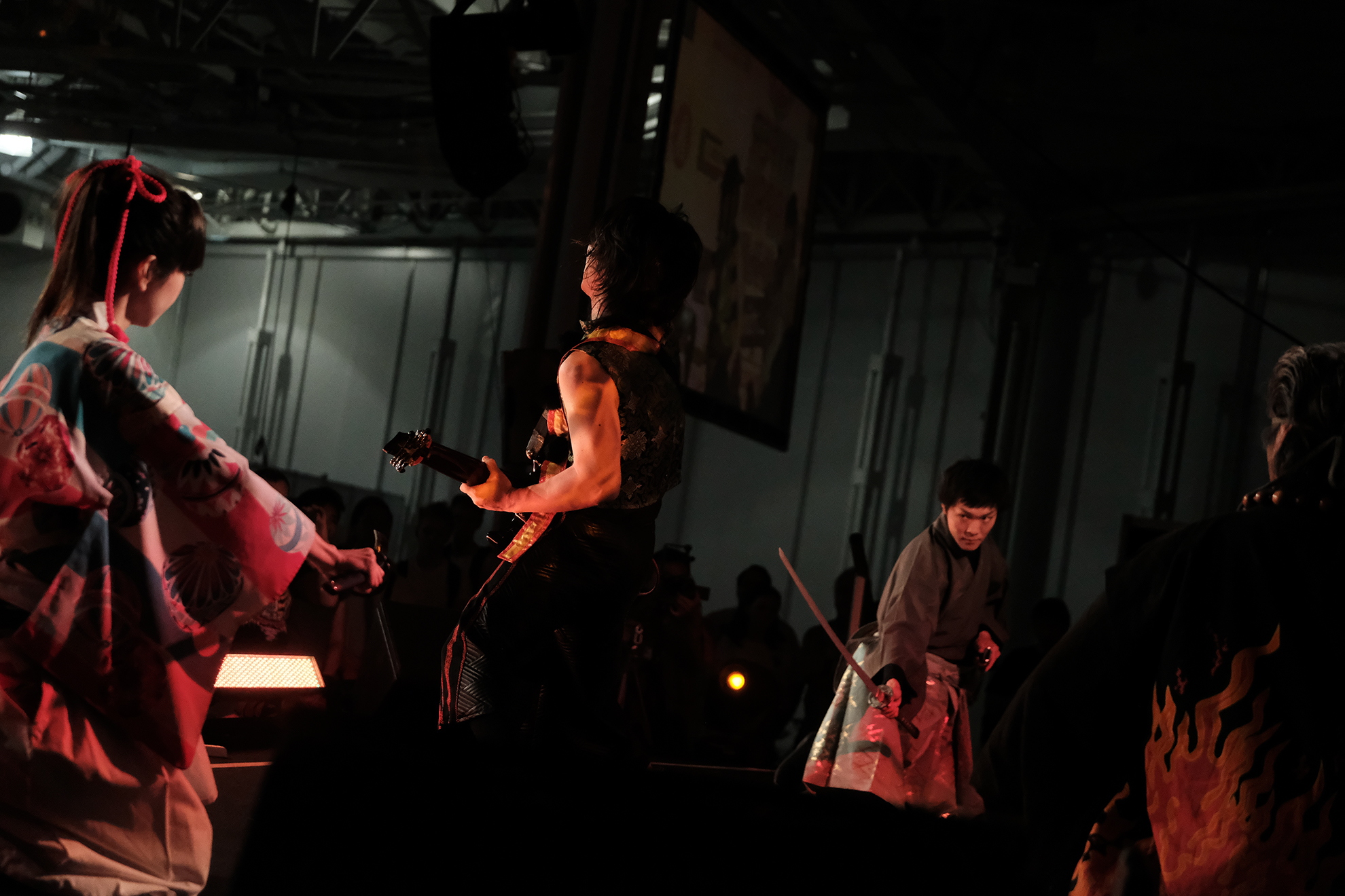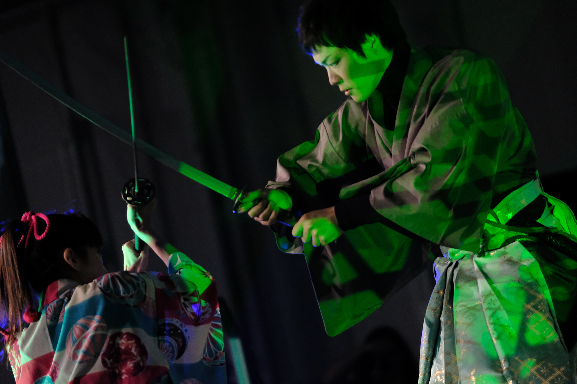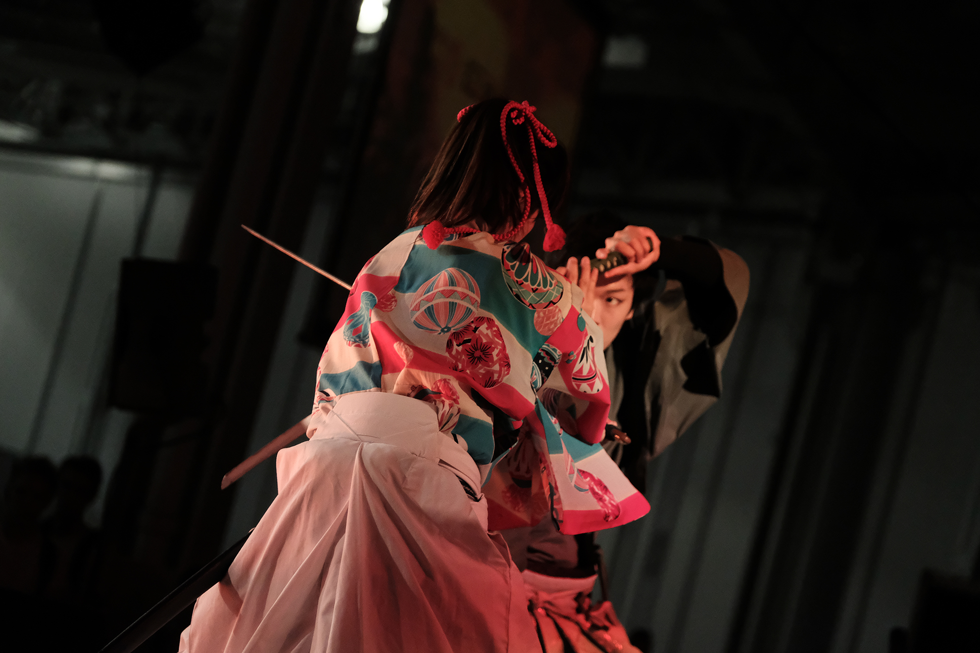 存在感のあるバイオリン主体のBGMと共に、自然と役者の演武に観客は集中して行きます。曲と役者の殺陣が熱くなればなる程、見ている側もどんどん熱くなって行きました。