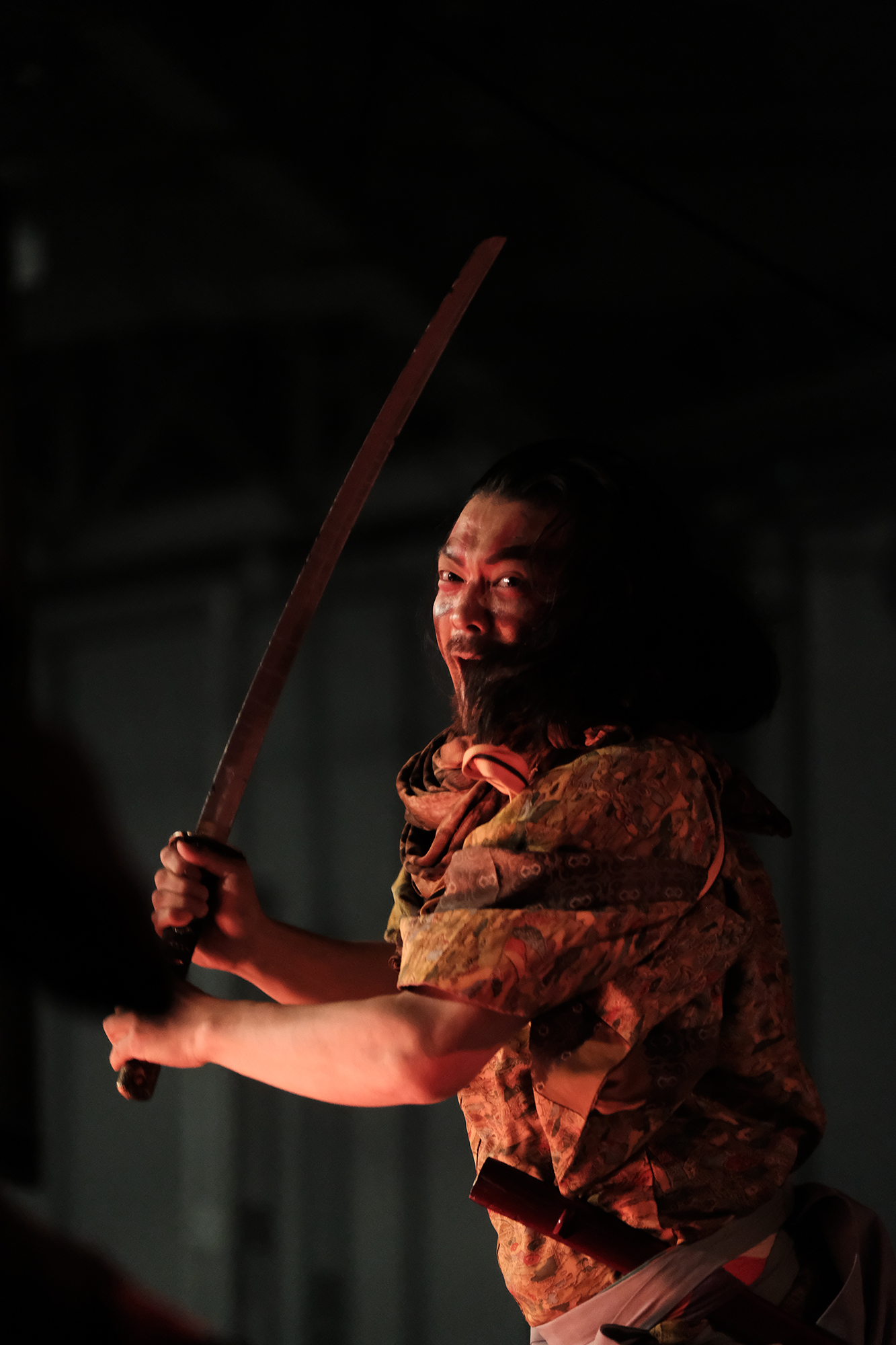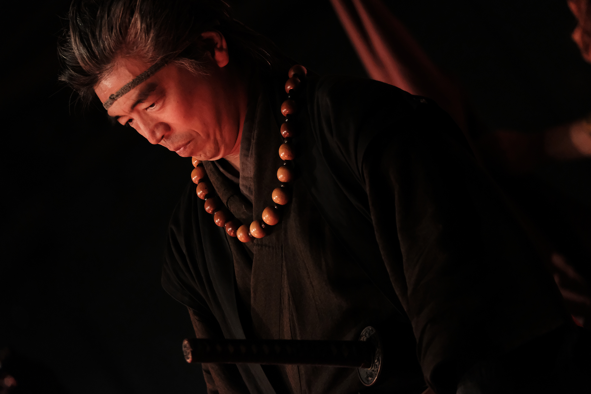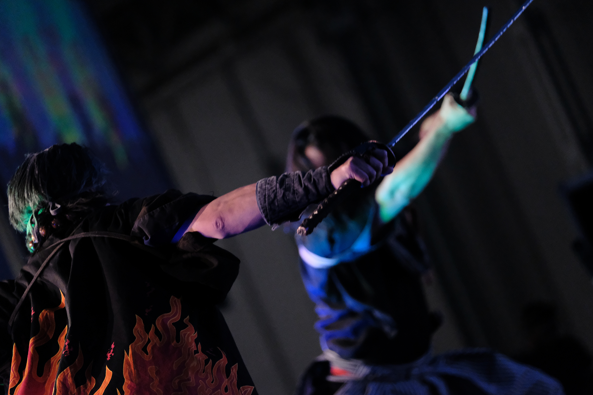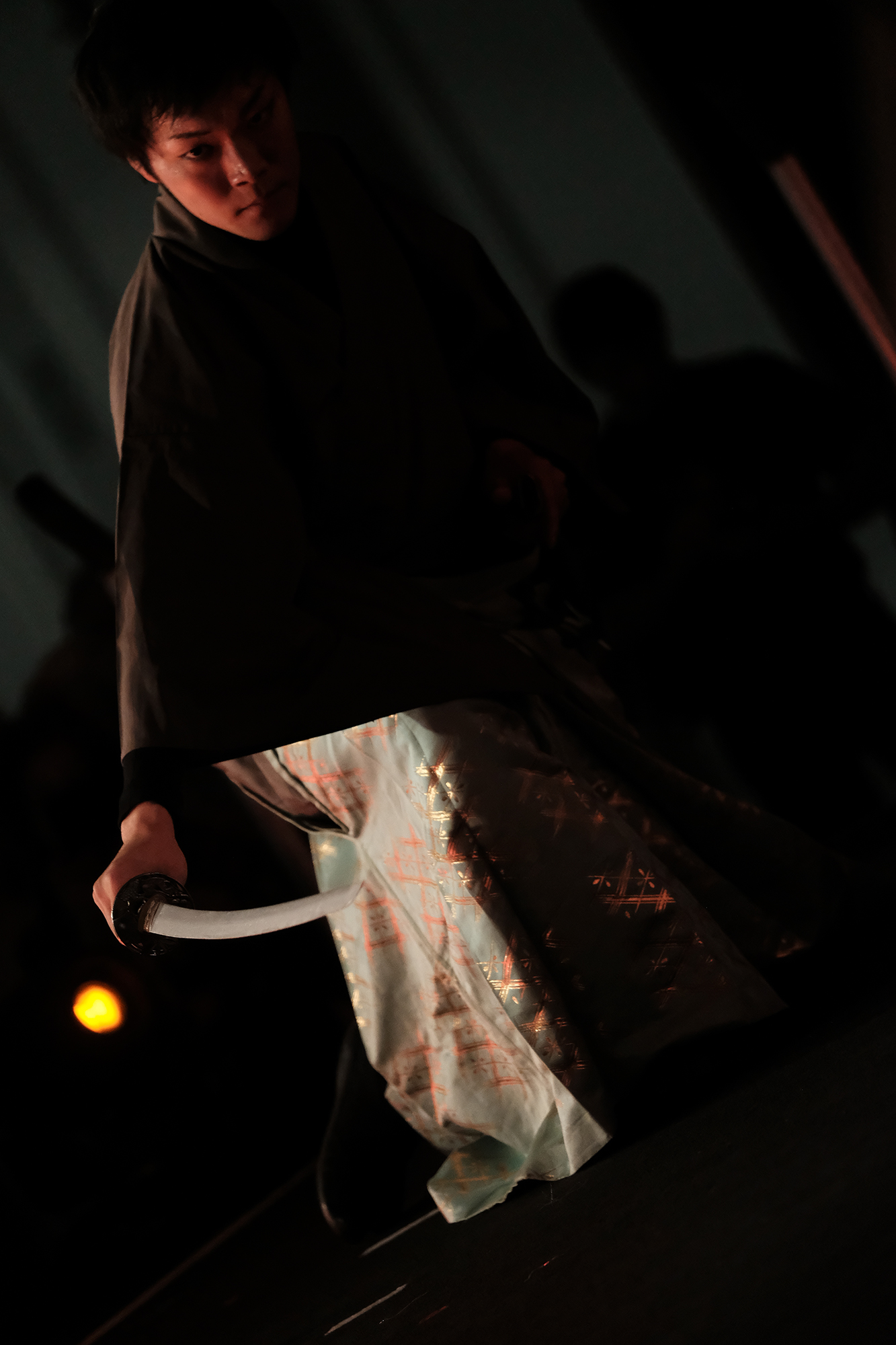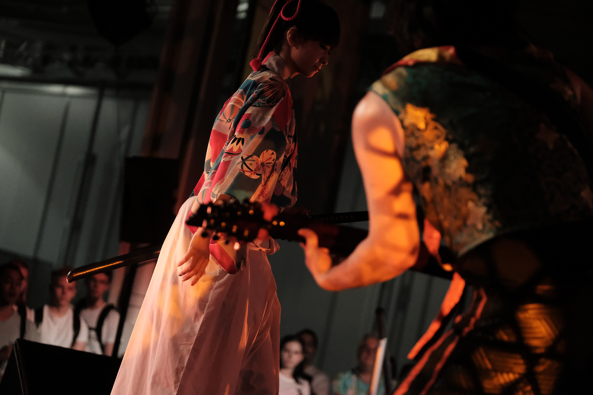 存在感のあるバイオリン主体のBGMと共に、自然と役者の演武に観客は集中して行きます。曲と役者の殺陣が熱くなればなる程、見ている側もどんどん熱くなって行きました。