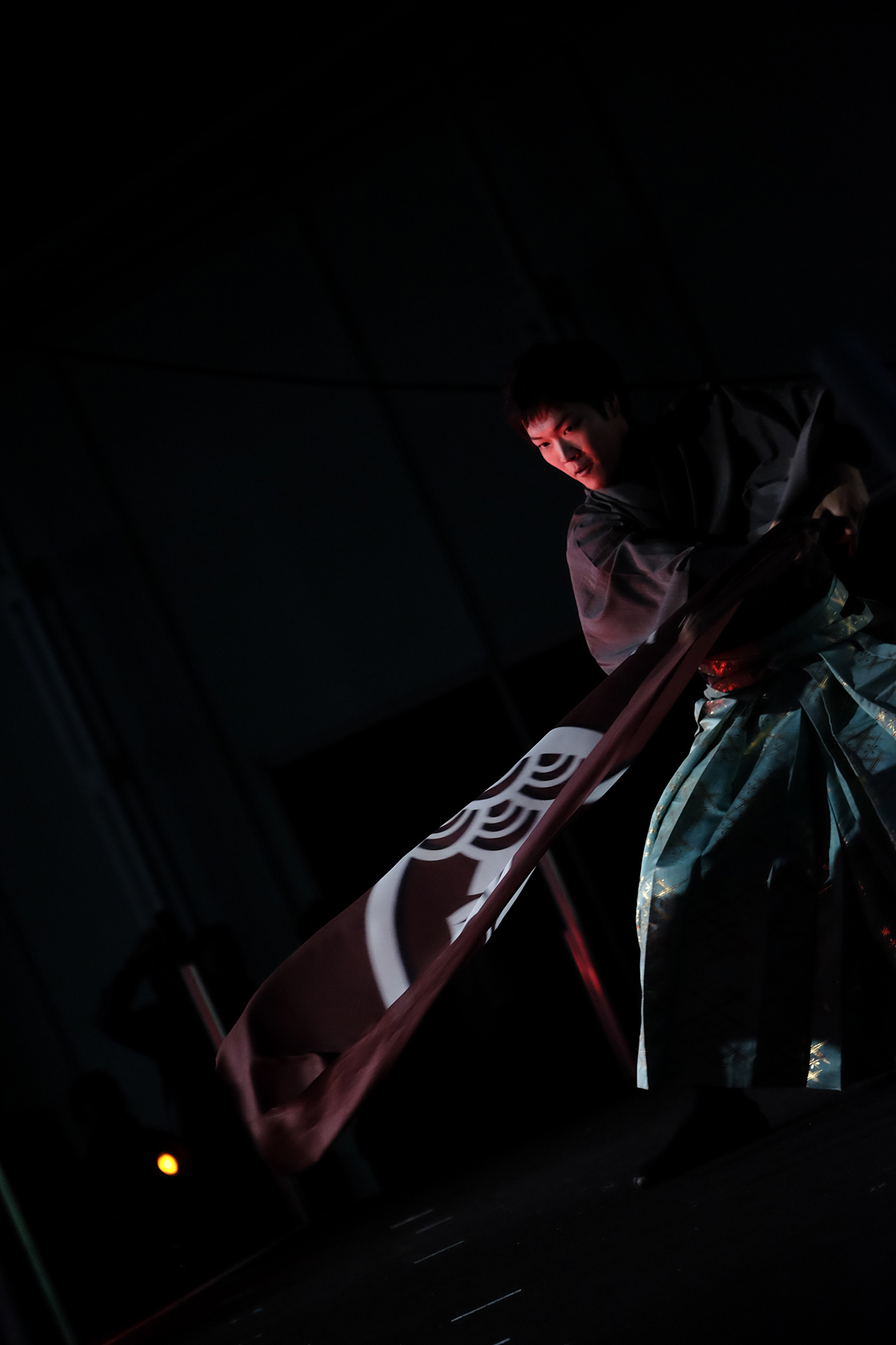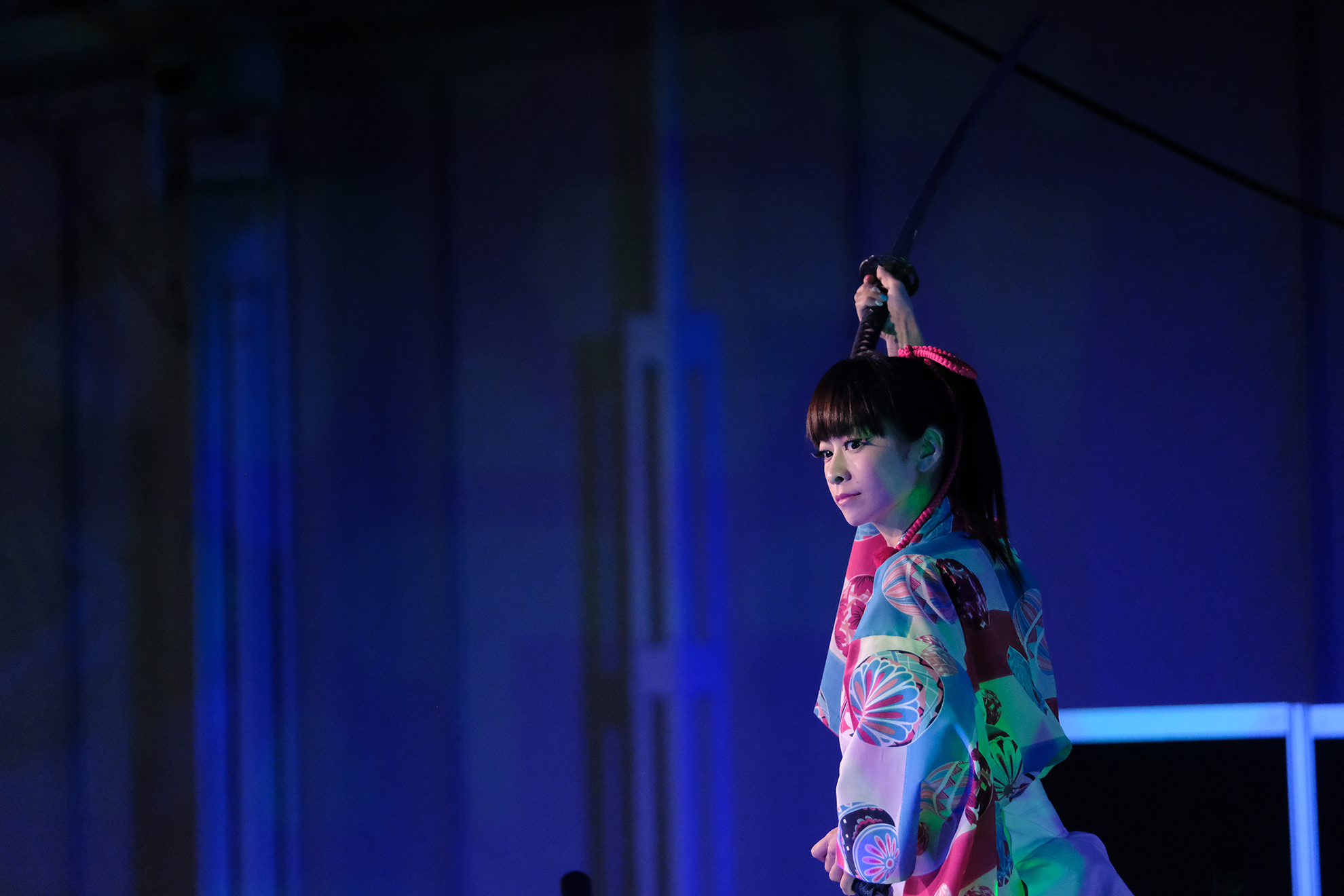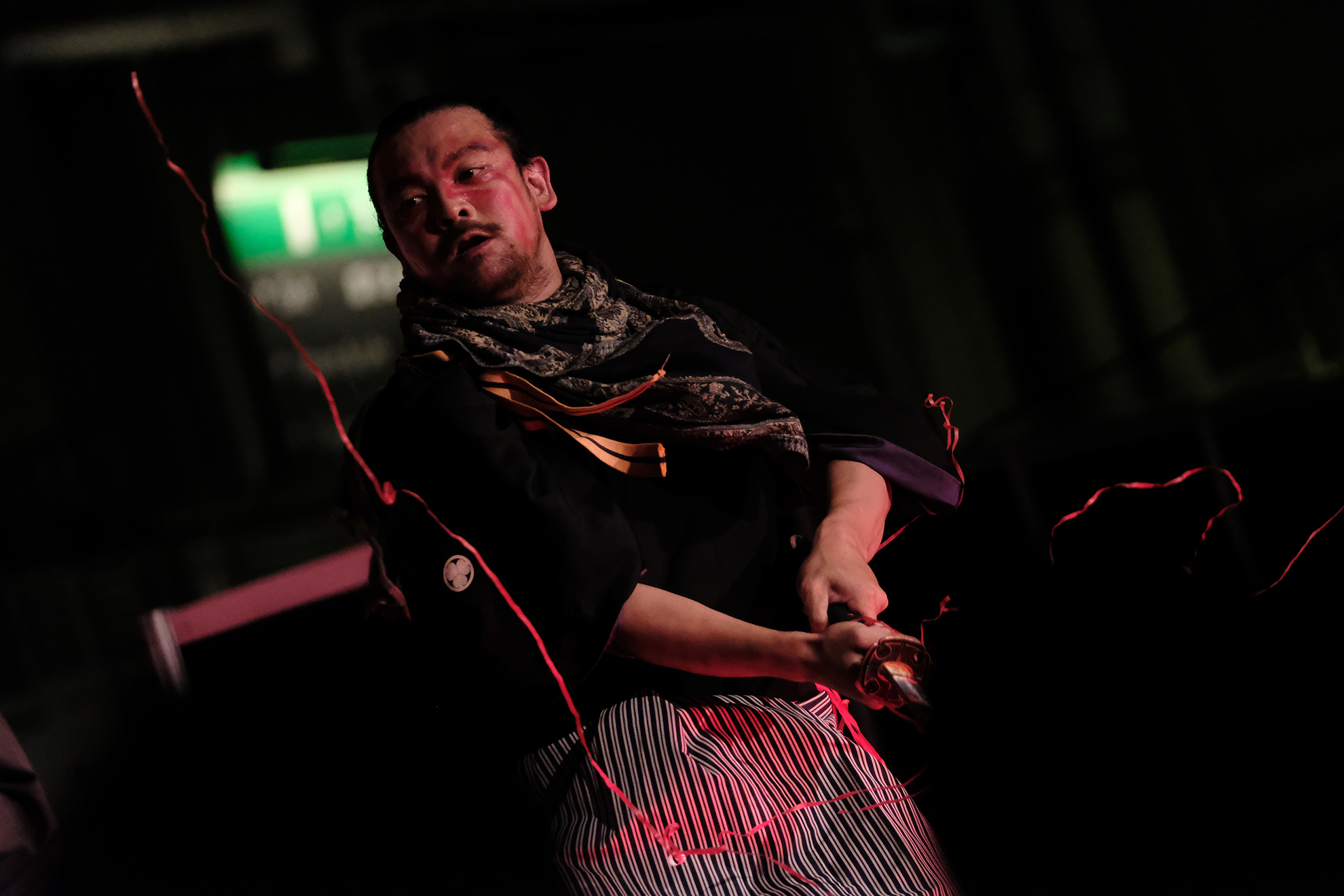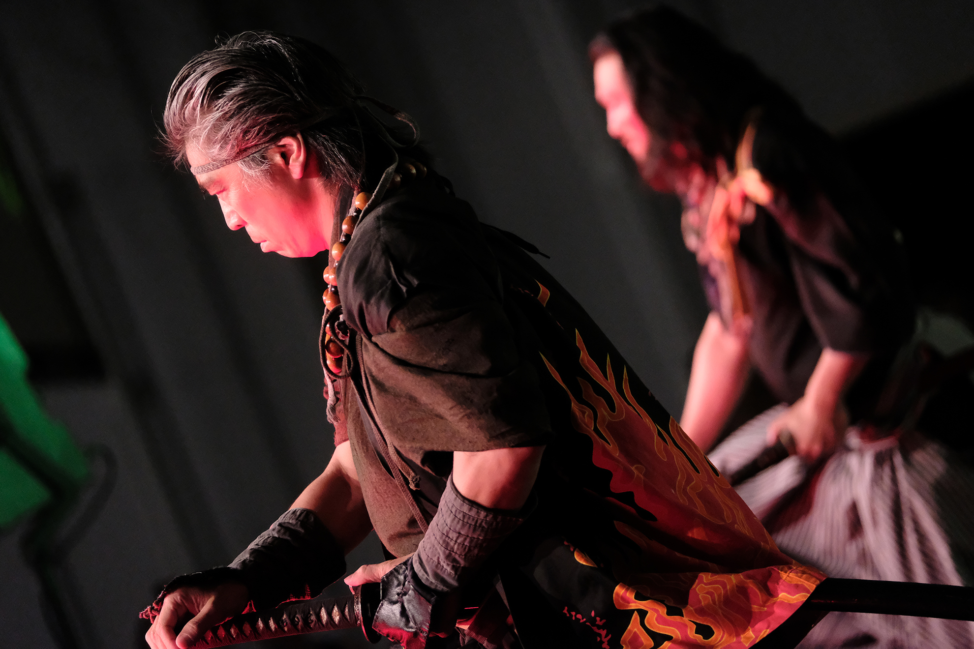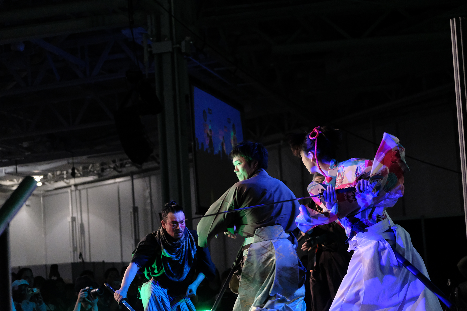 存在感のあるバイオリン主体のBGMと共に、自然と役者の演武に観客は集中して行きます。曲と役者の殺陣が熱くなればなる程、見ている側もどんどん熱くなって行きました。