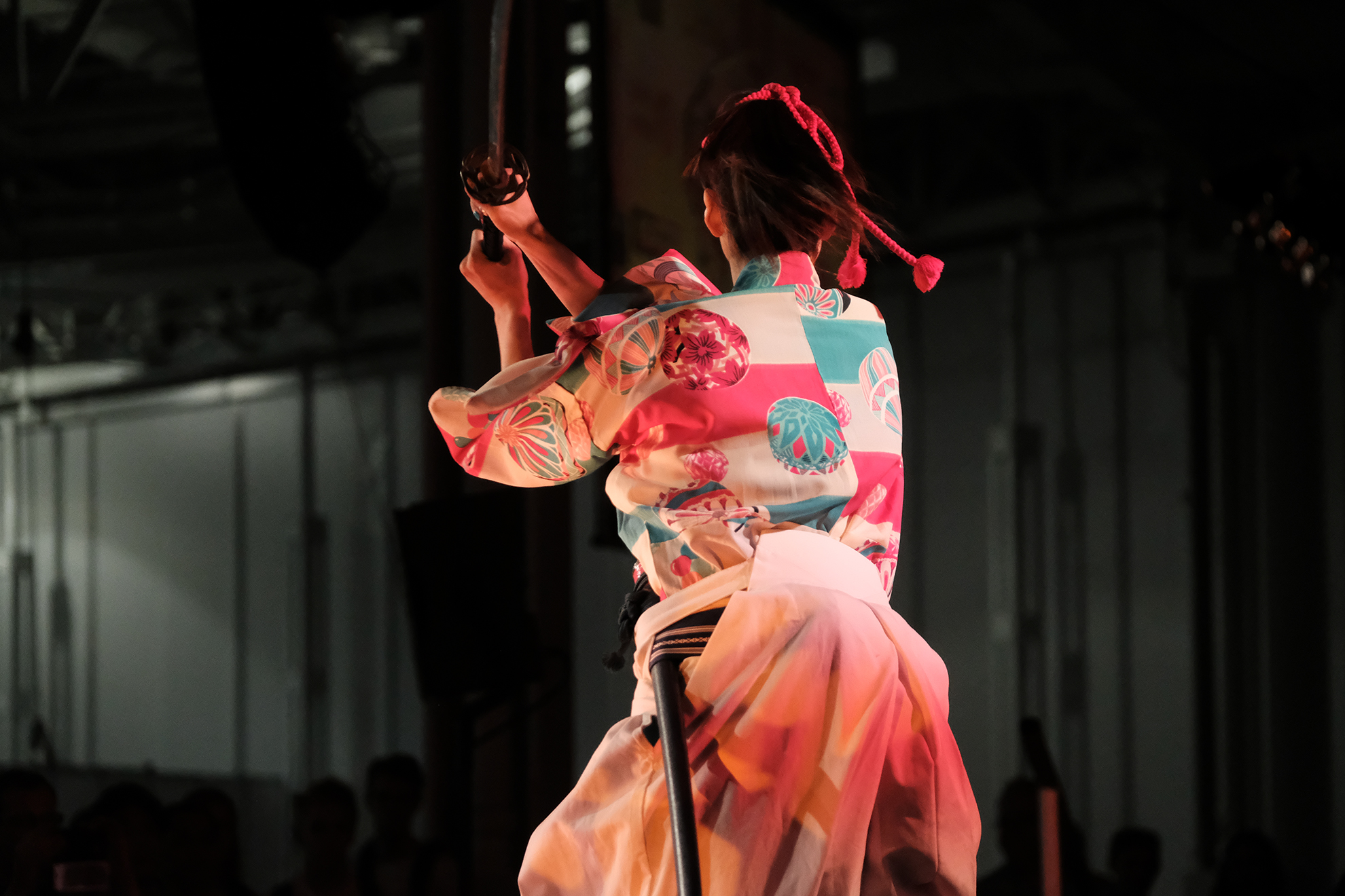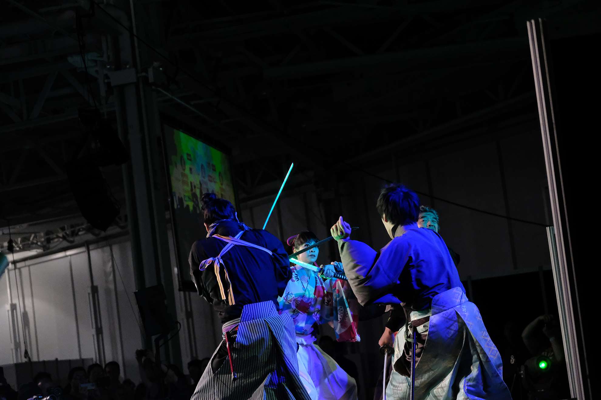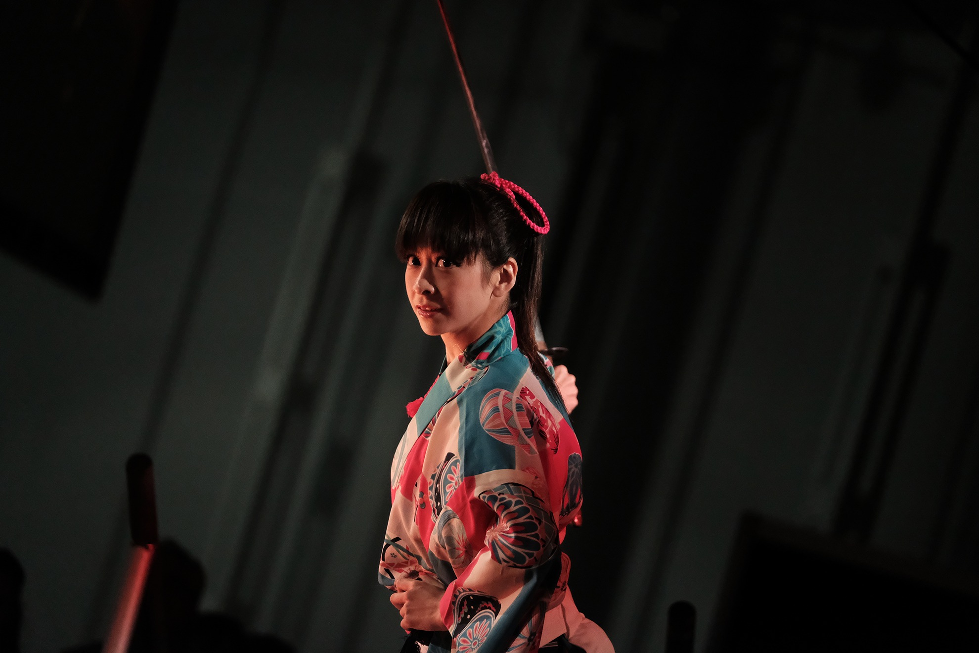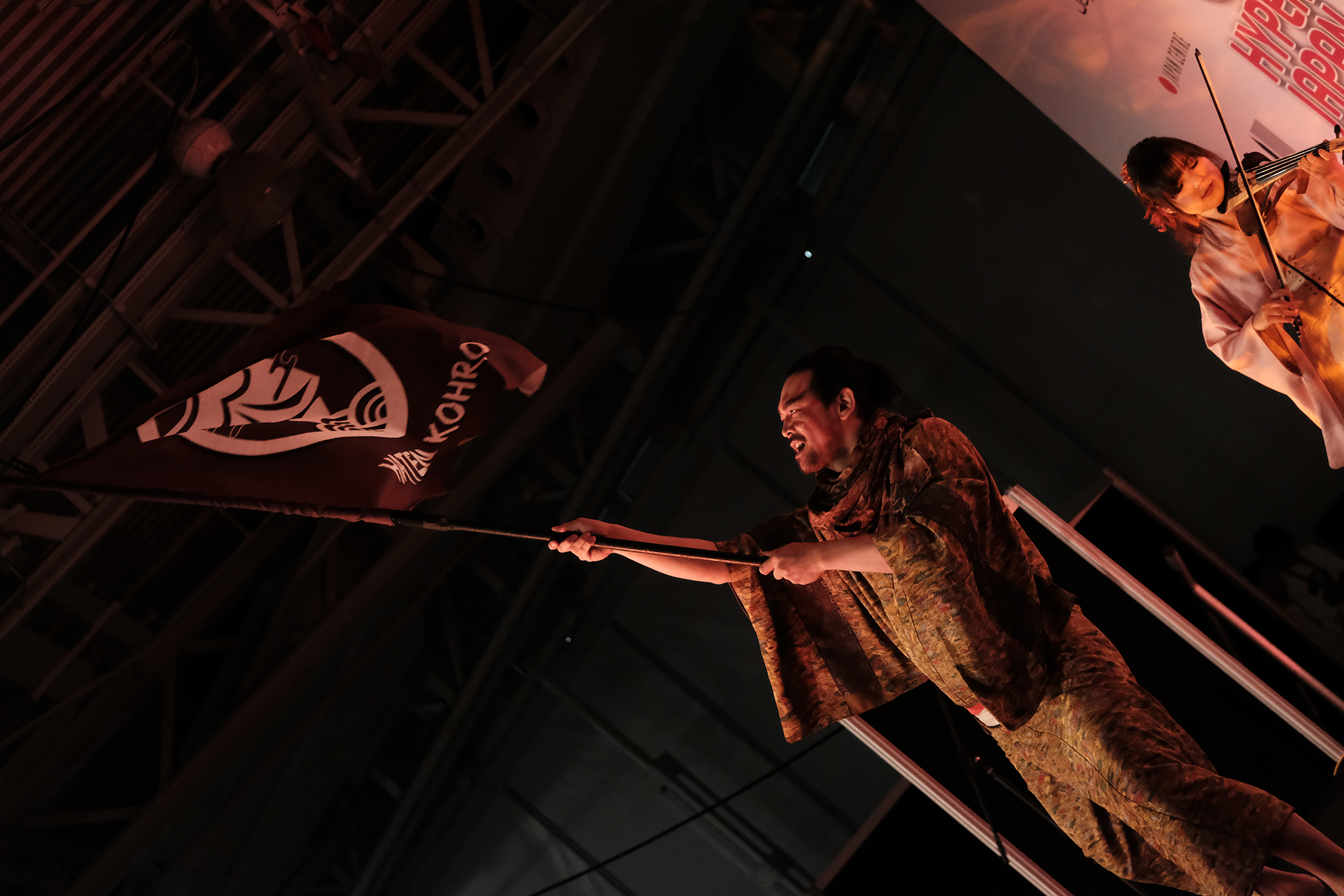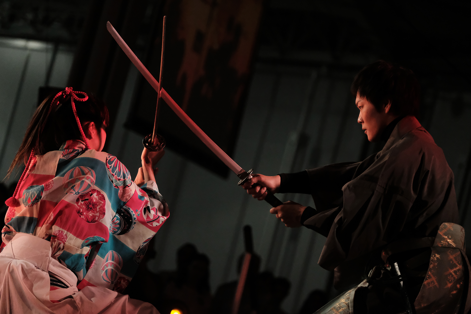 存在感のあるバイオリン主体のBGMと共に、自然と役者の演武に観客は集中して行きます。曲と役者の殺陣が熱くなればなる程、見ている側もどんどん熱くなって行きました。