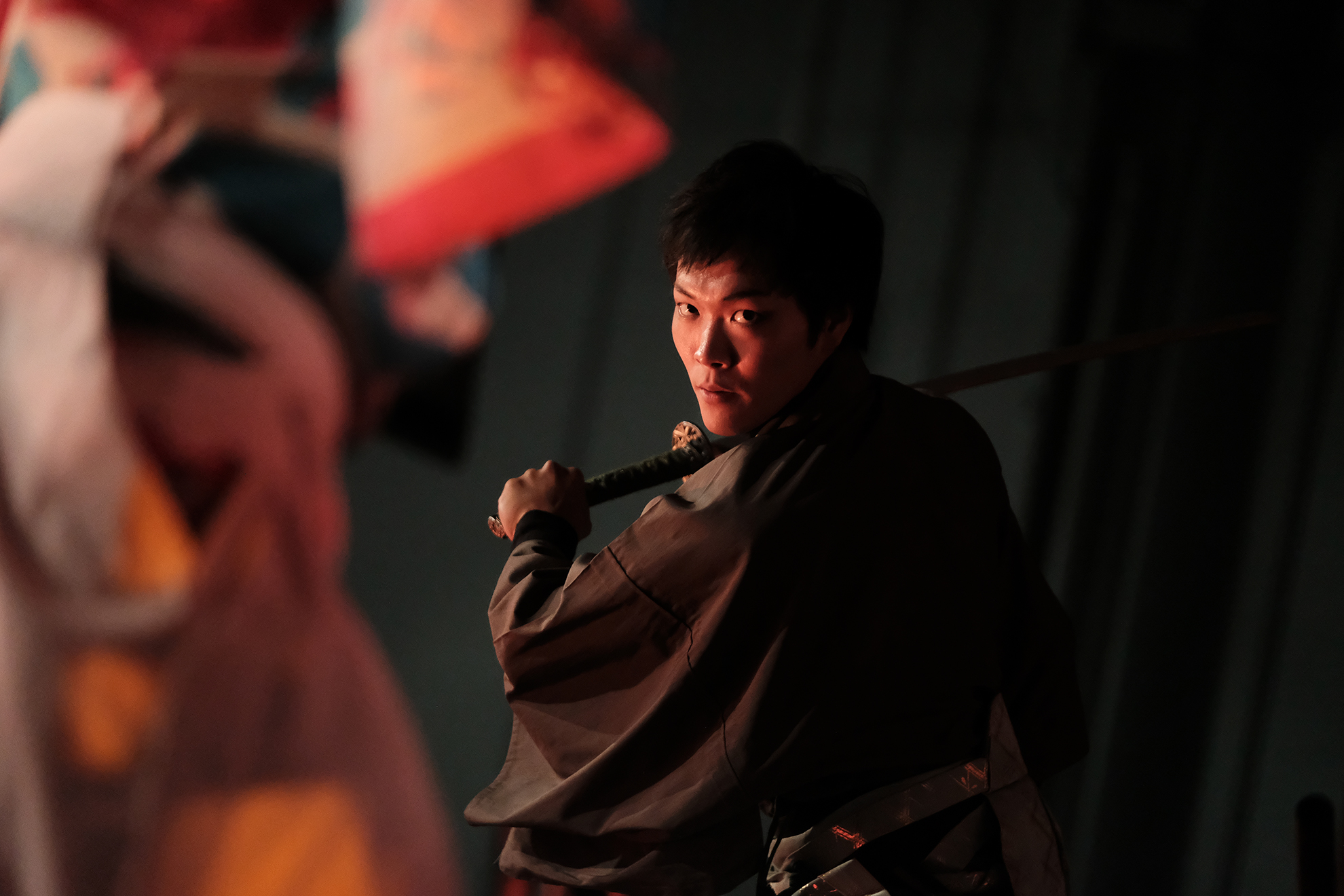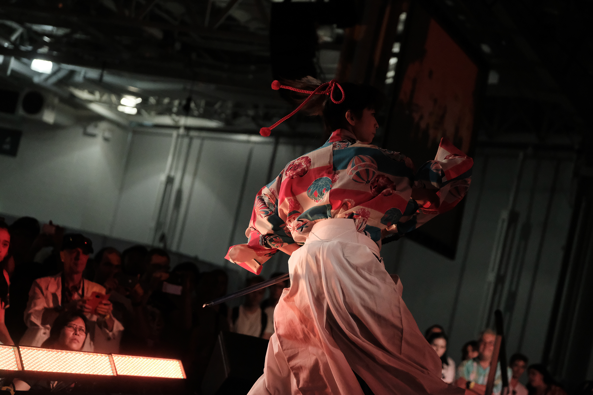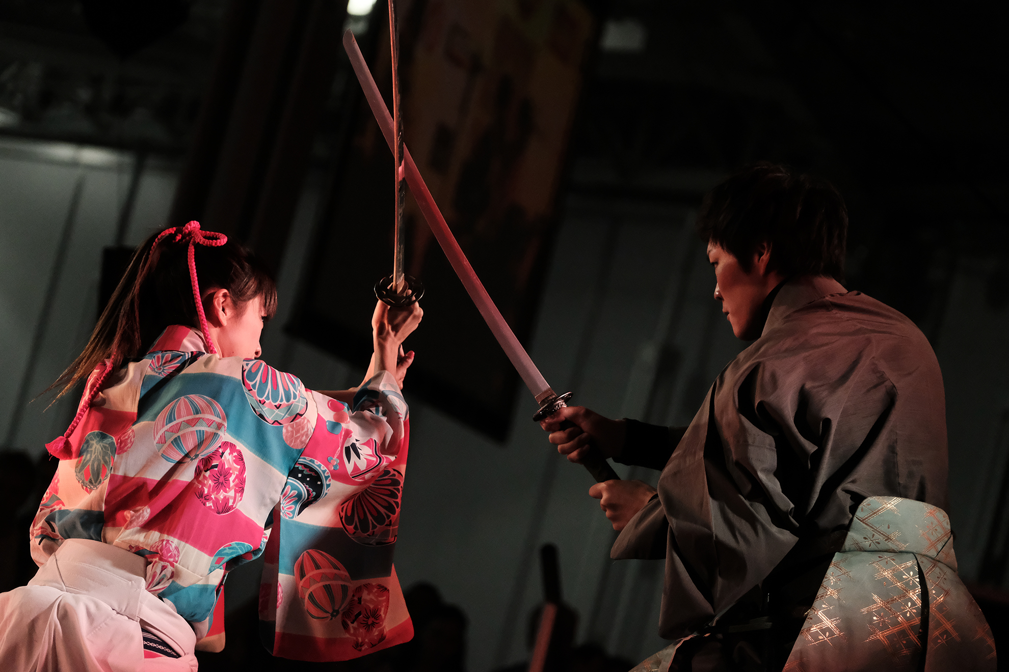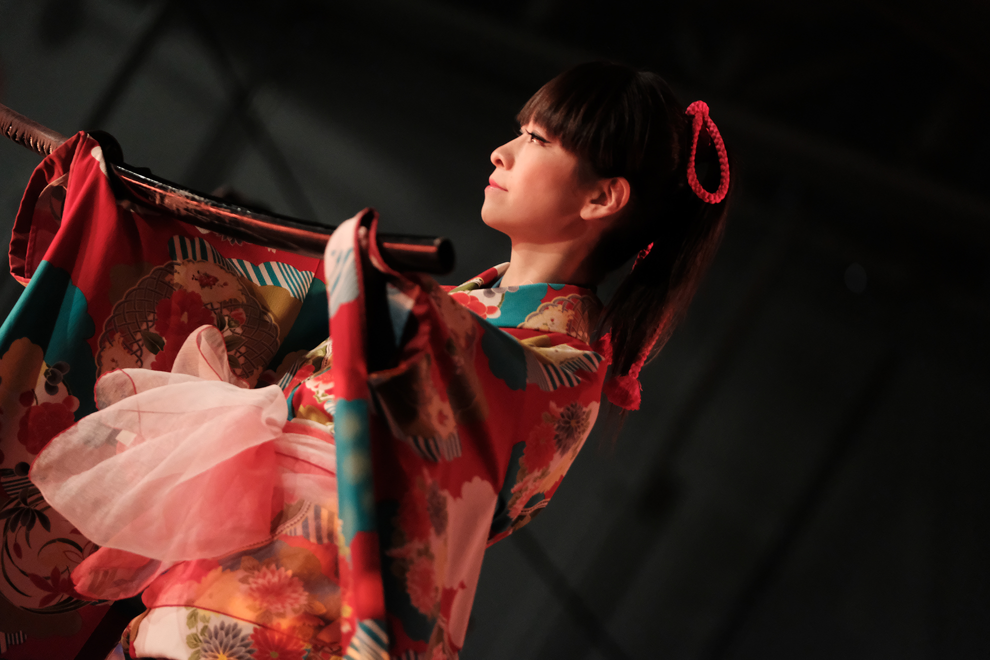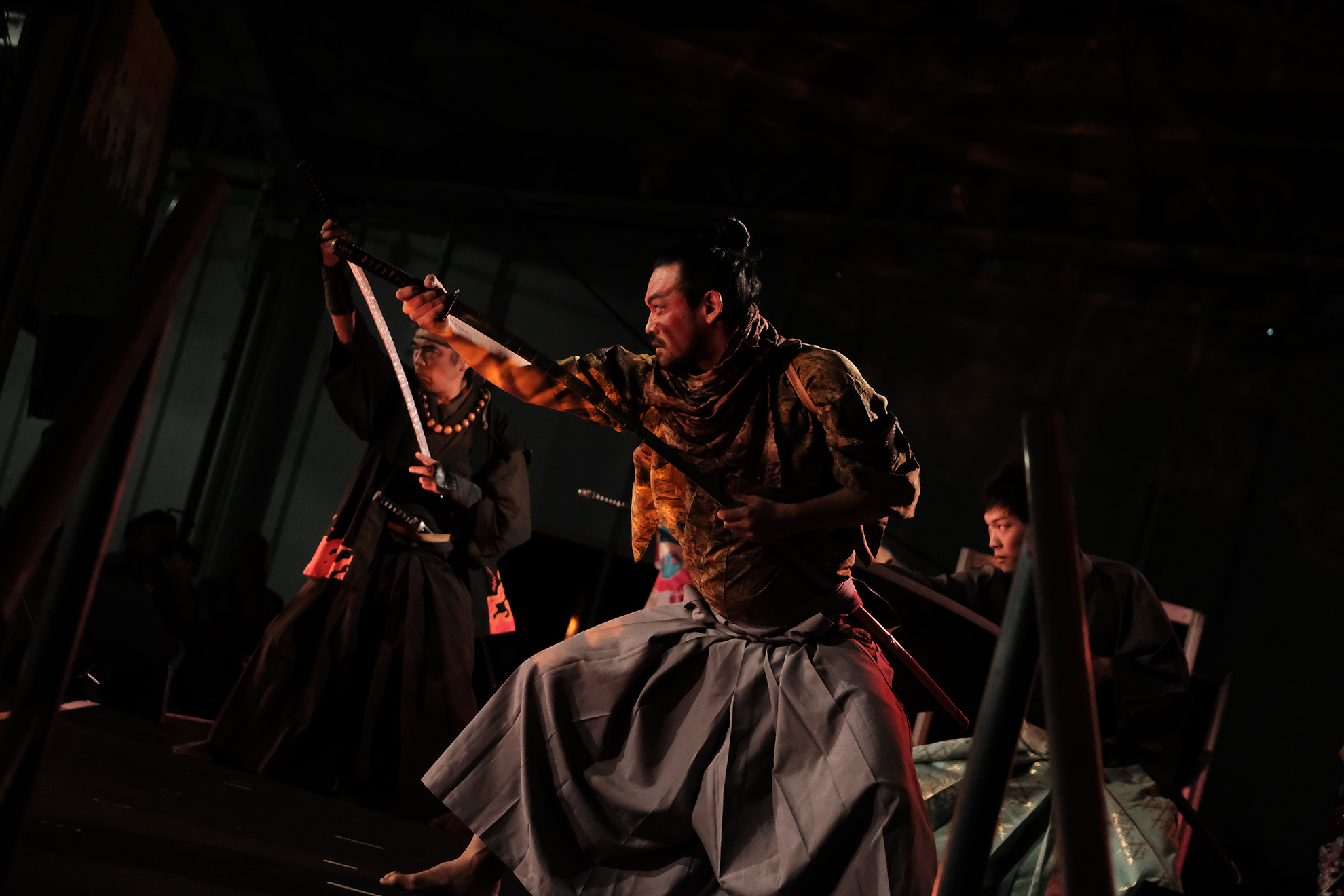 存在感のあるバイオリン主体のBGMと共に、自然と役者の演武に観客は集中して行きます。曲と役者の殺陣が熱くなればなる程、見ている側もどんどん熱くなって行きました。