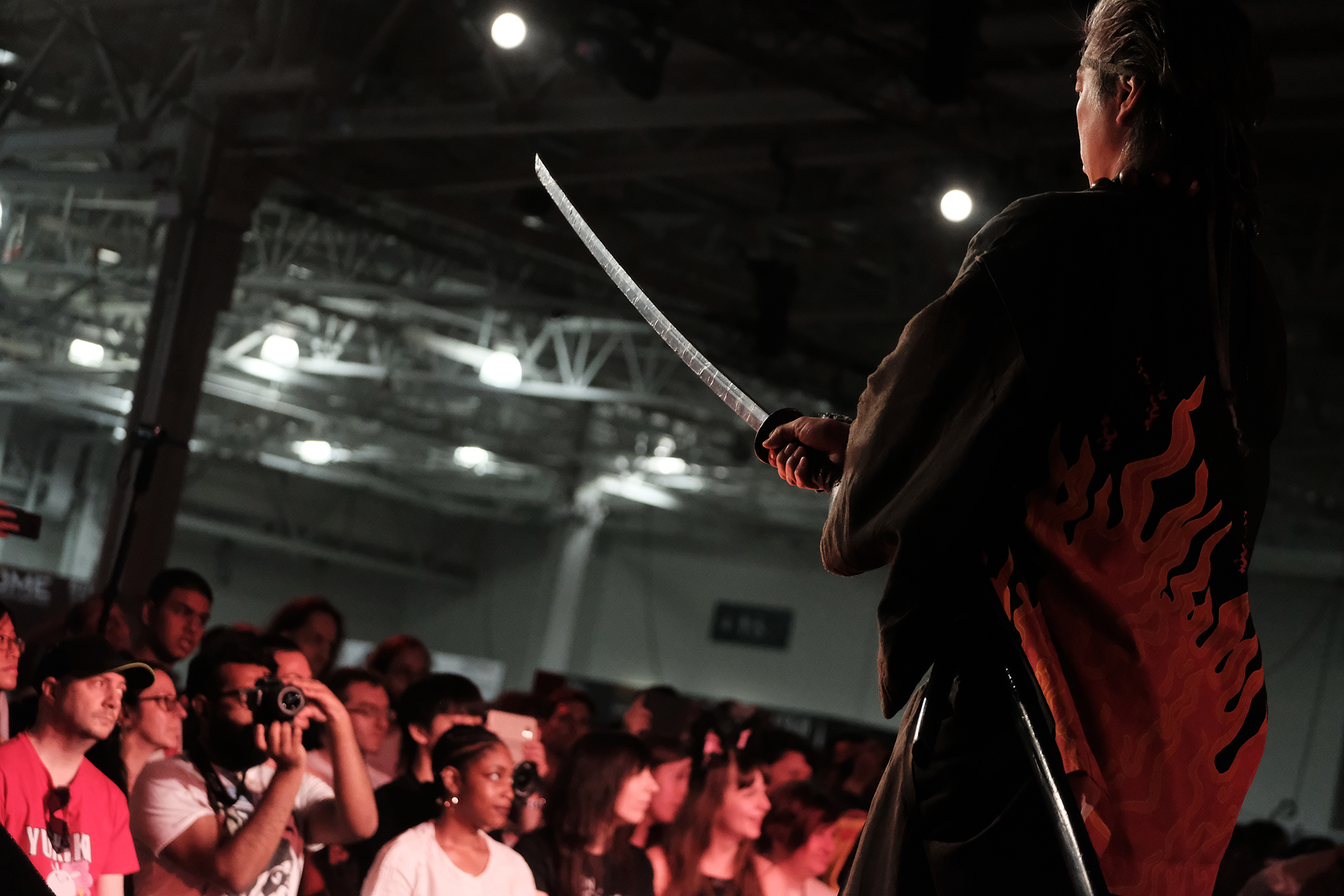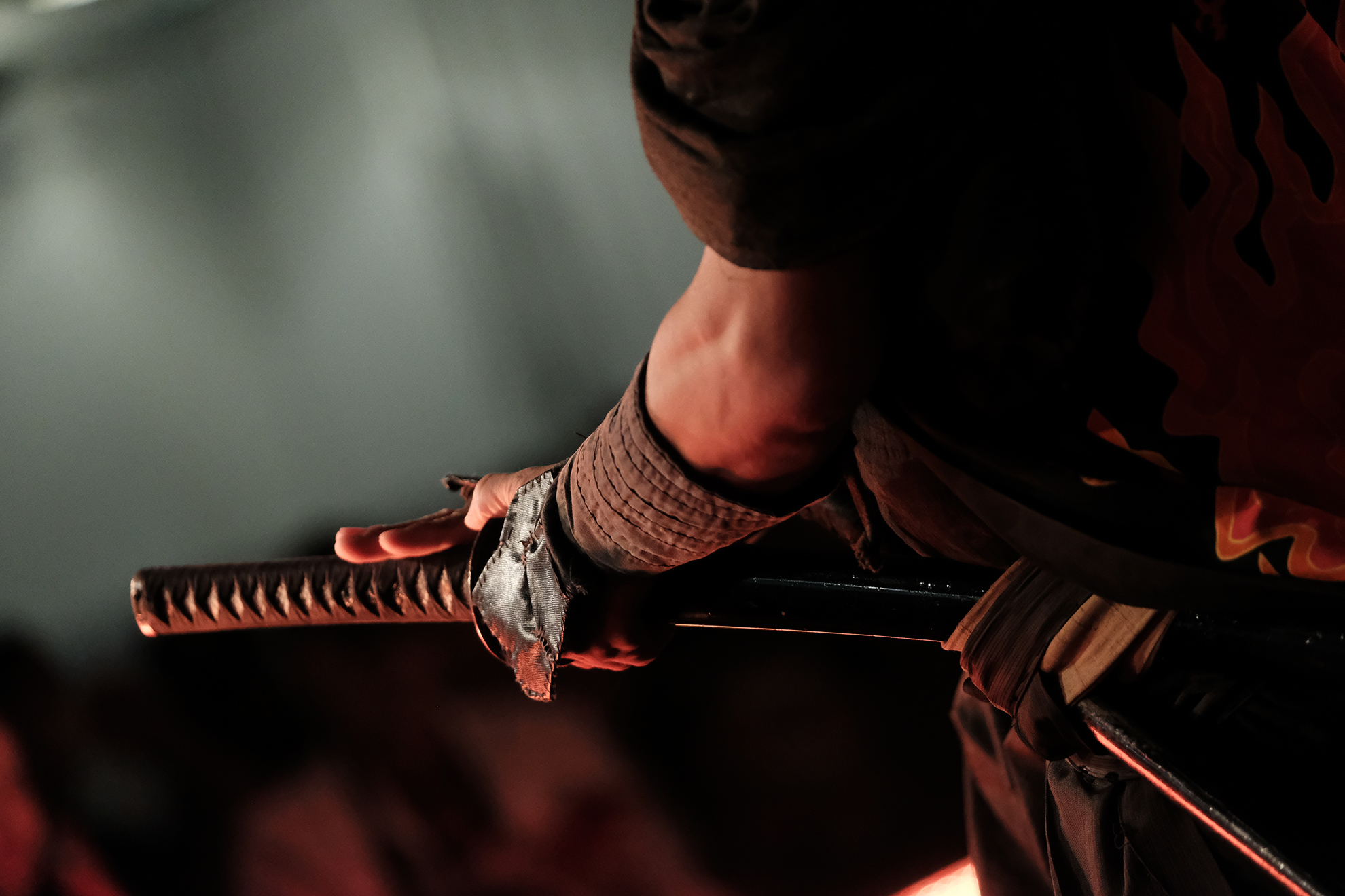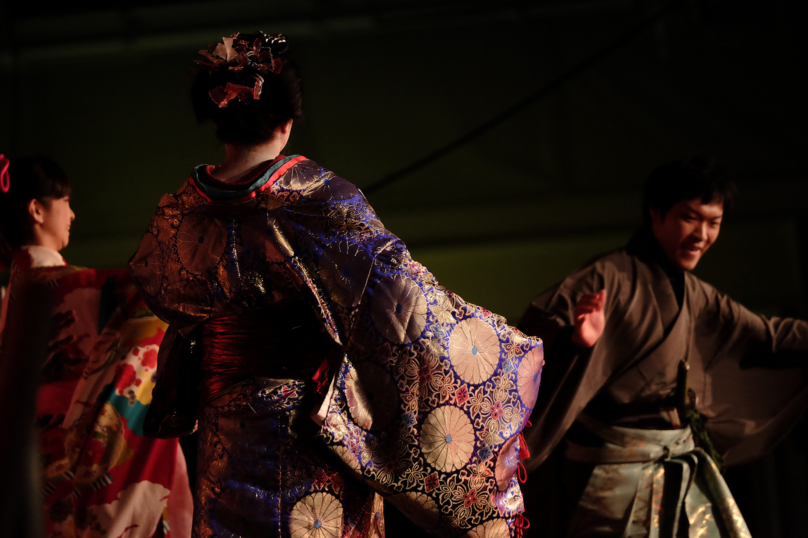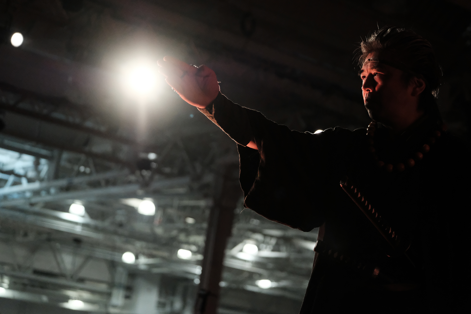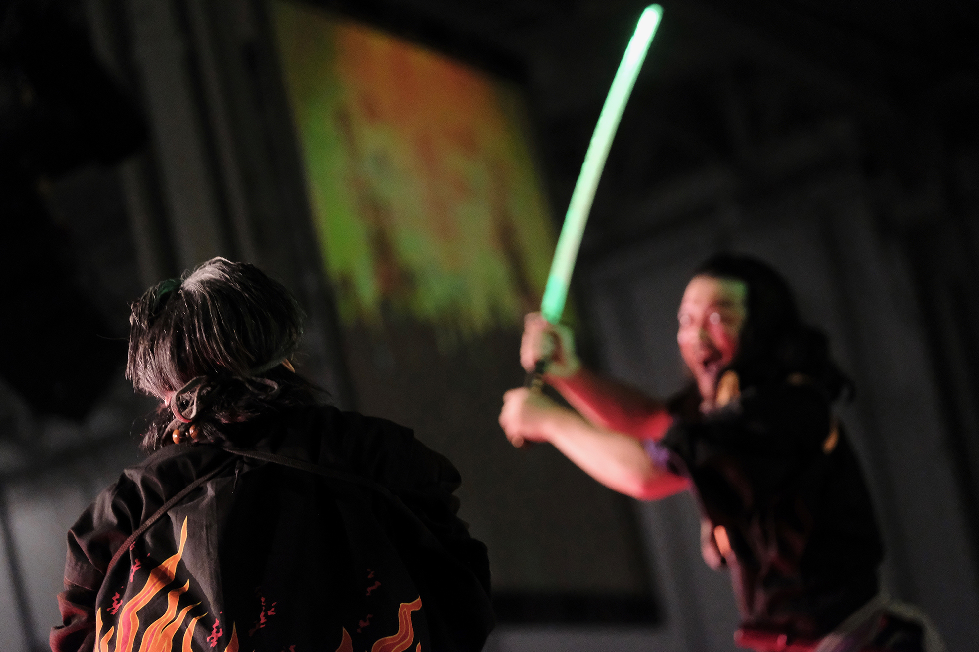 存在感のあるバイオリン主体のBGMと共に、自然と役者の演武に観客は集中して行きます。曲と役者の殺陣が熱くなればなる程、見ている側もどんどん熱くなって行きました。