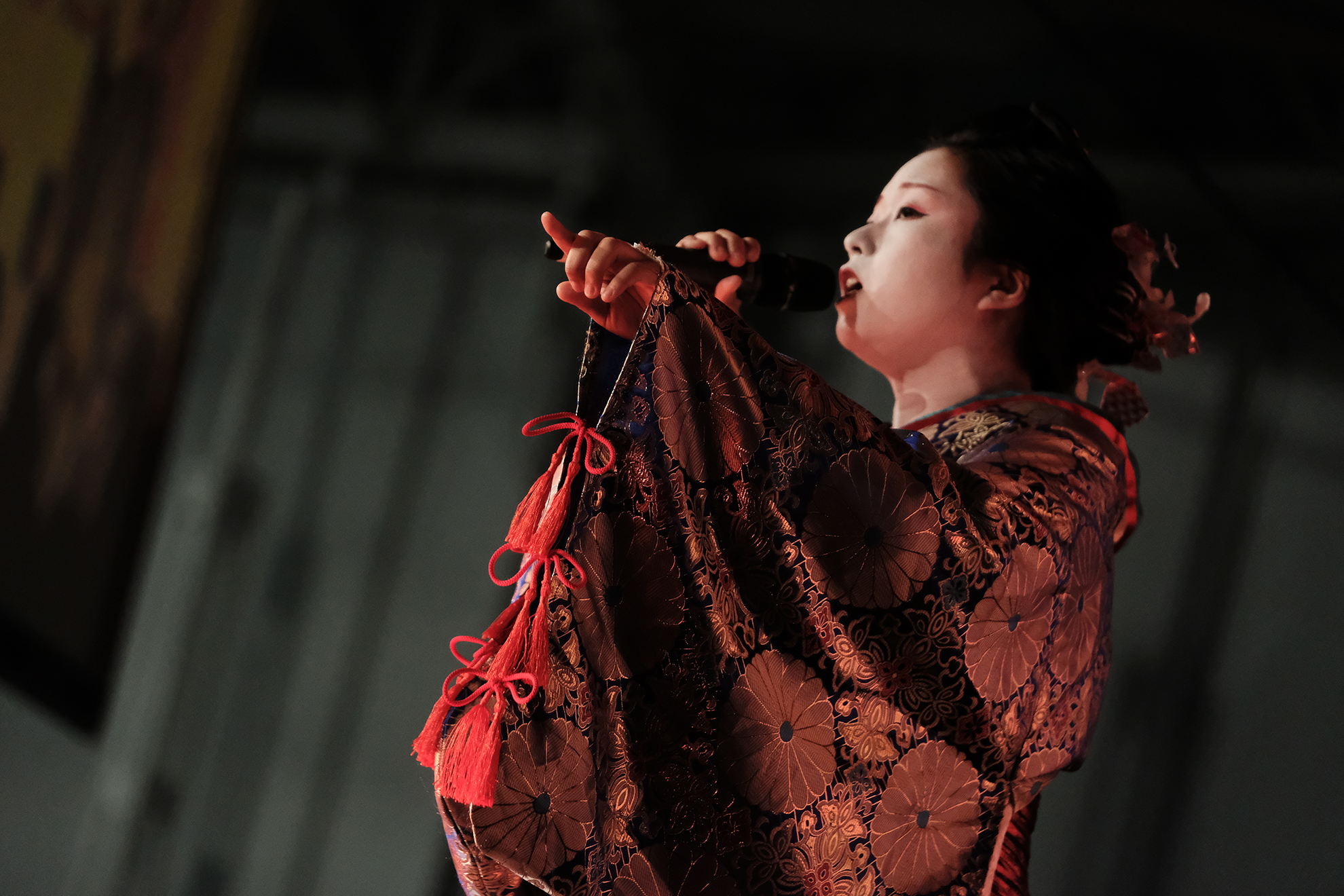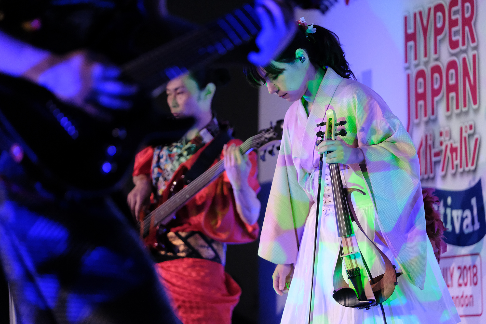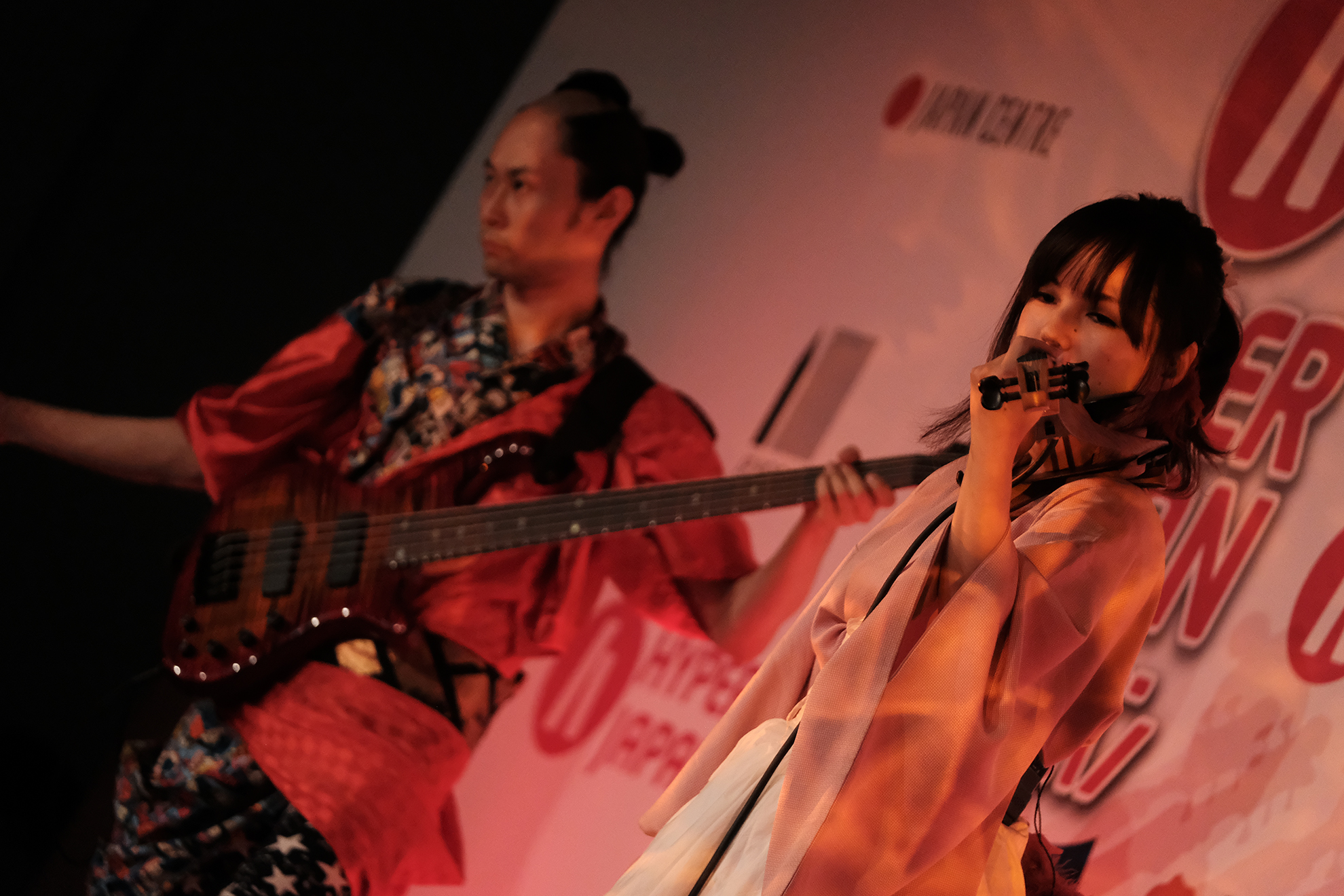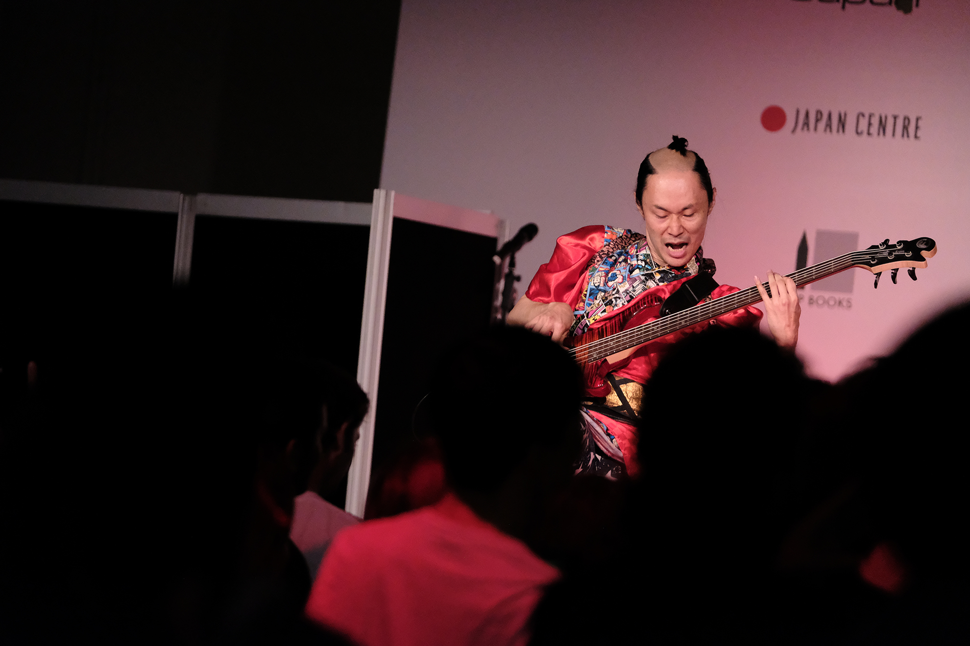 和装のメンバーが登場し、その見た目とは裏腹に鳴り響いてきたのは、ZENYA氏の8弦ギター・SADA氏のベース・遠藤氏のドラム(この日は欠席)の織り成すかなりの重低音ロック。ここロックの国”UK”に相応な音楽でした。そして、次に聞こえて来たのはまた良い意味で意表を突かれた、以津輝さんの日本舞踊の歌唱と歌詞。その正体は江戸時代の端唄をアレンジした曲達でした。(※インタビュー参照)