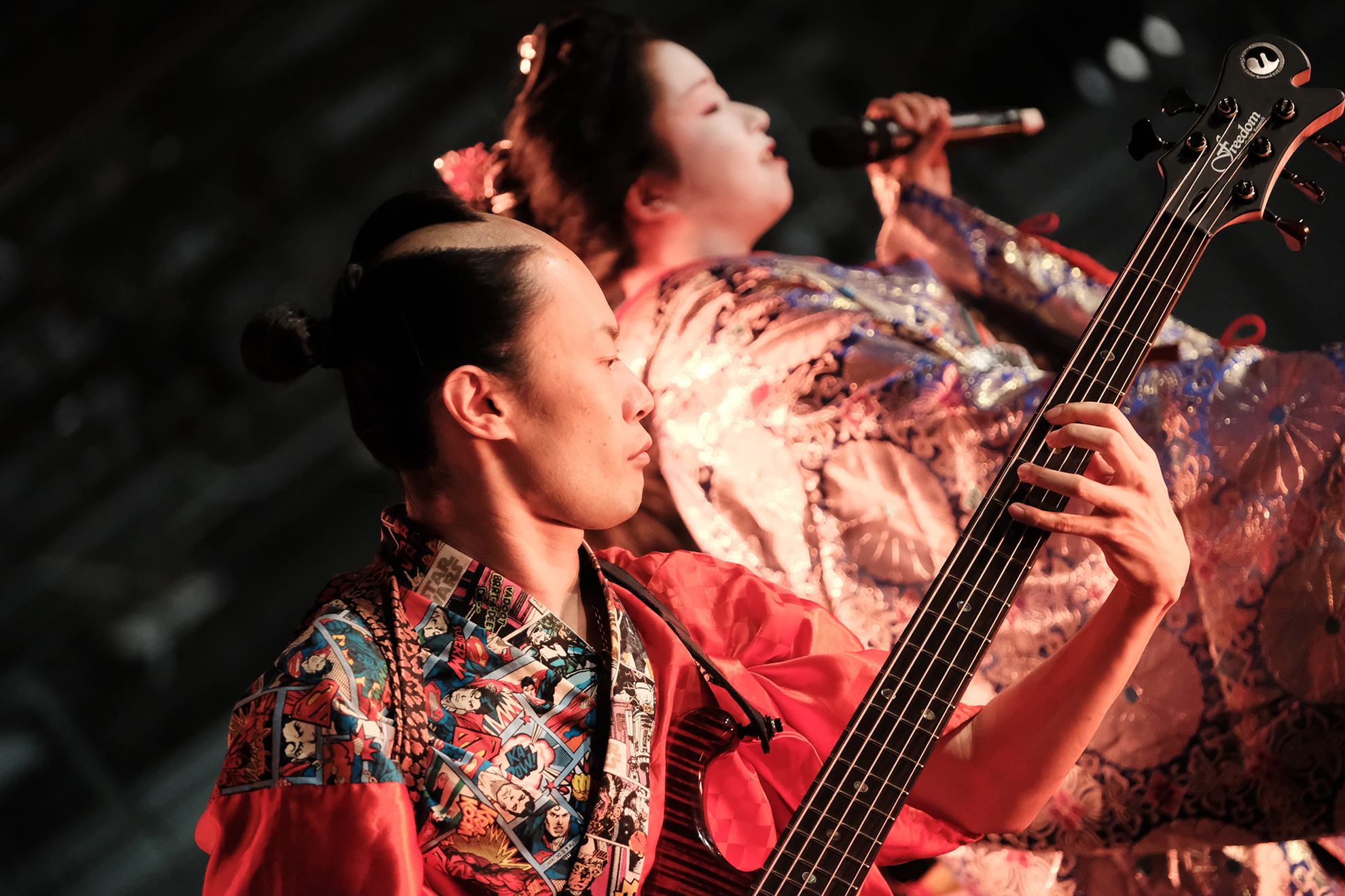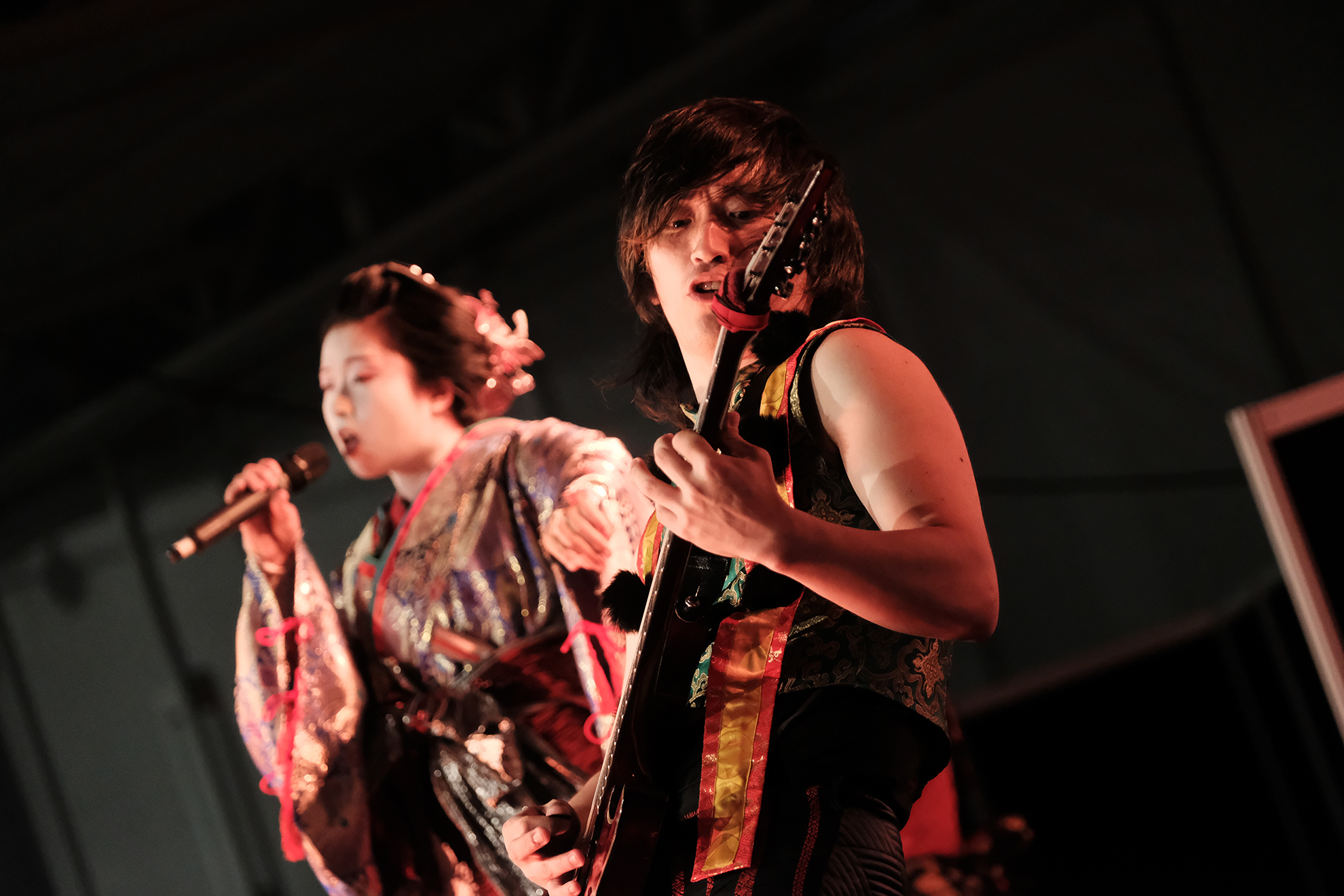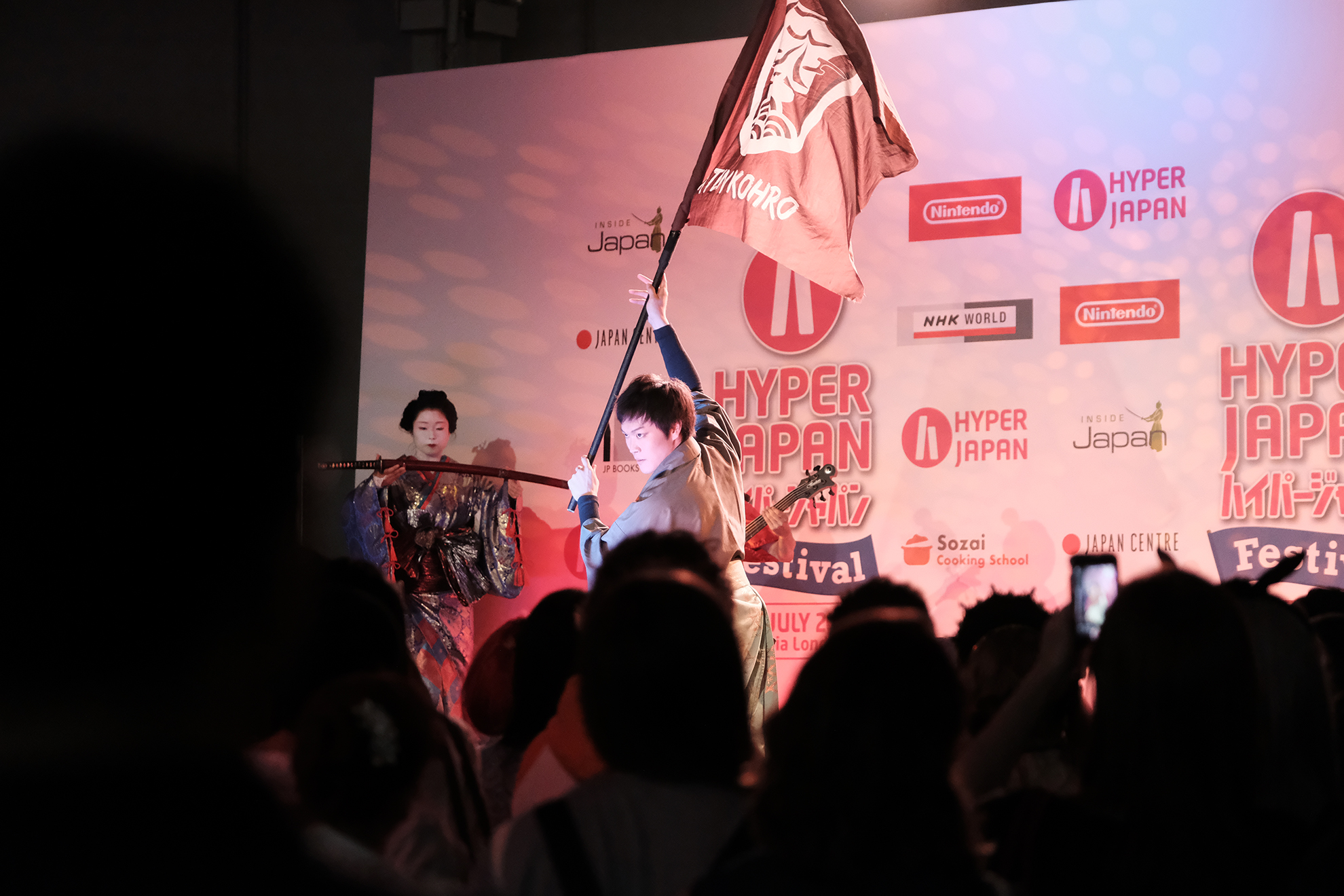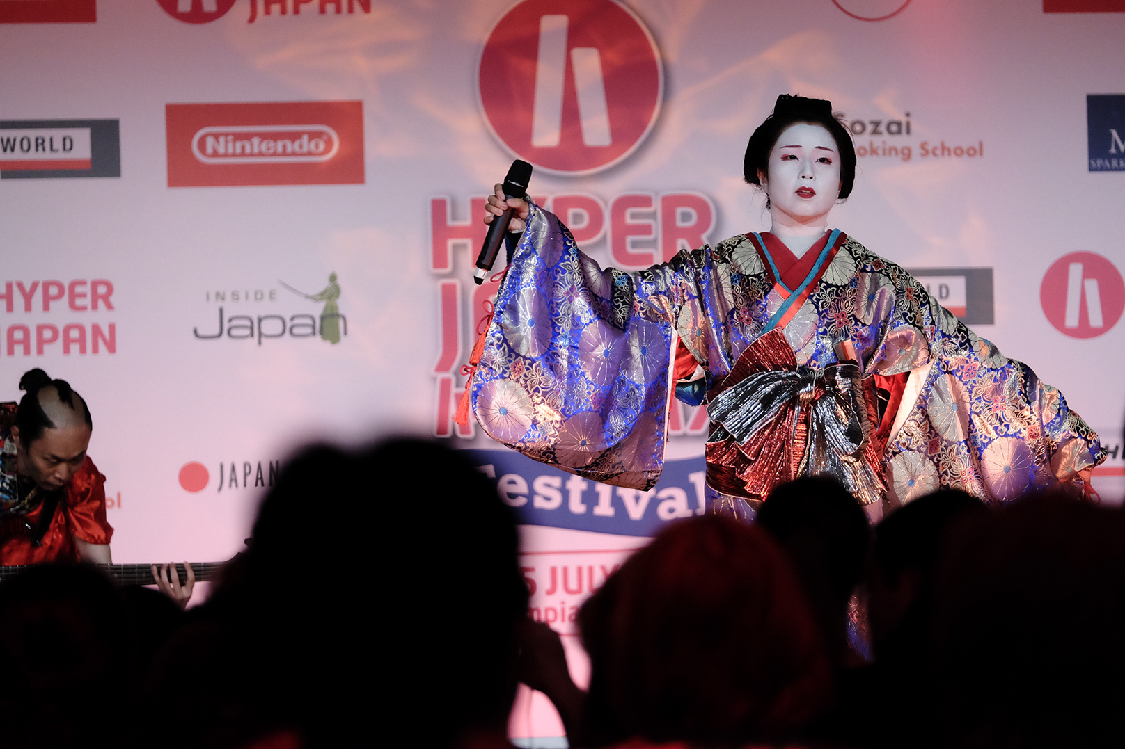 和装のメンバーが登場し、その見た目とは裏腹に鳴り響いてきたのは、ZENYA氏の8弦ギター・SADA氏のベース・遠藤氏のドラム(この日は欠席)の織り成すかなりの重低音ロック。ここロックの国”UK”に相応な音楽でした。そして、次に聞こえて来たのはまた良い意味で意表を突かれた、以津輝さんの日本舞踊の歌唱と歌詞。その正体は江戸時代の端唄をアレンジした曲達でした。(※インタビュー参照)