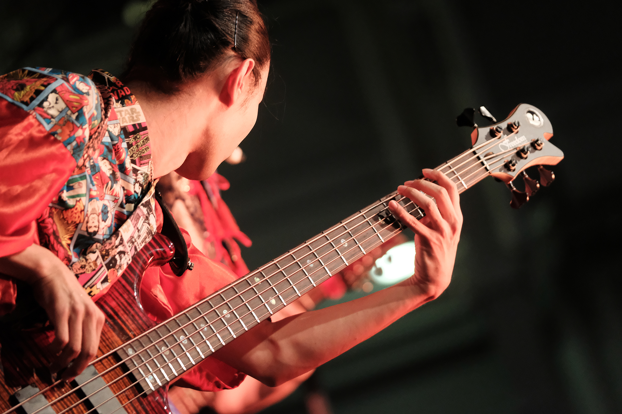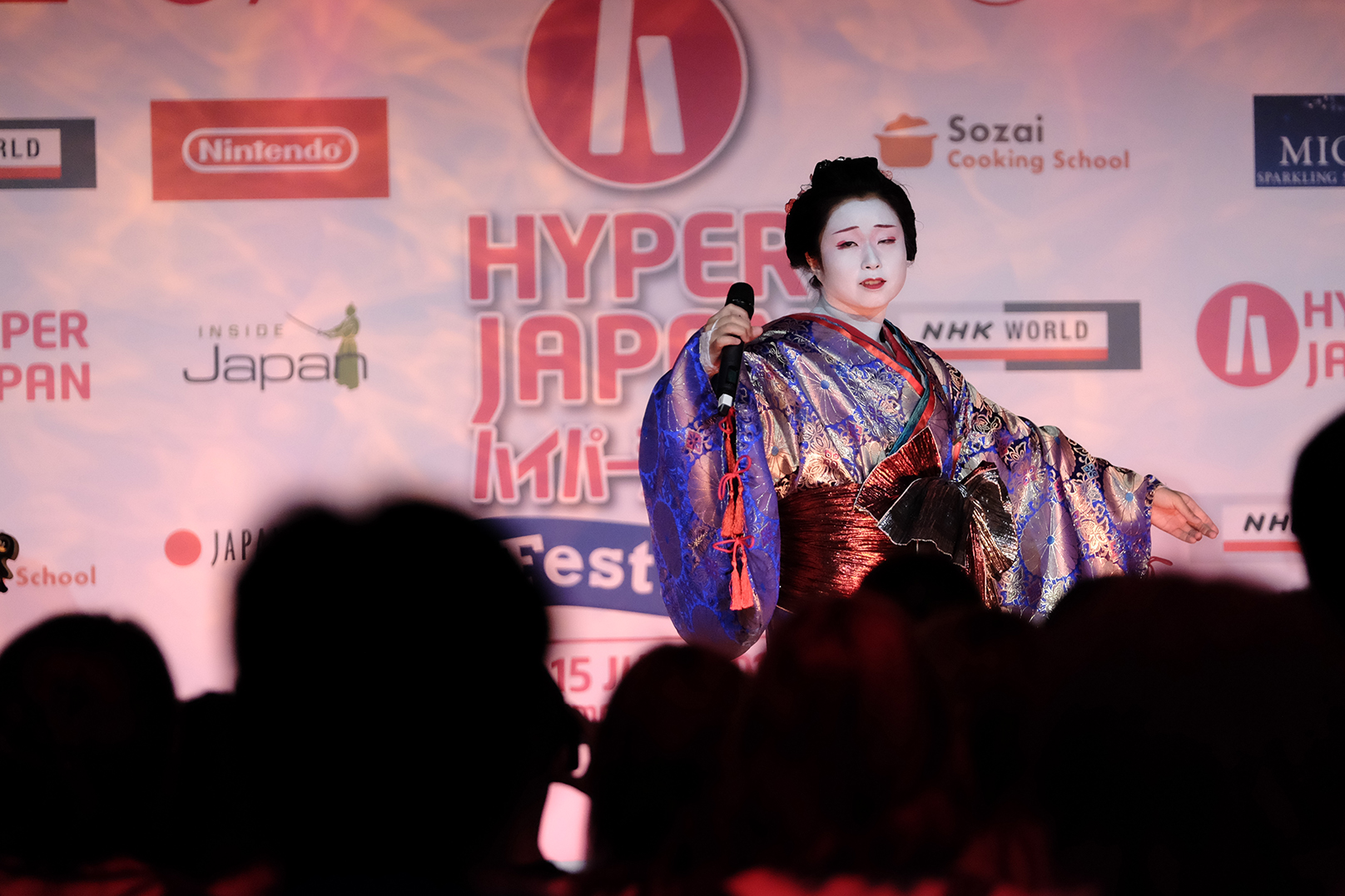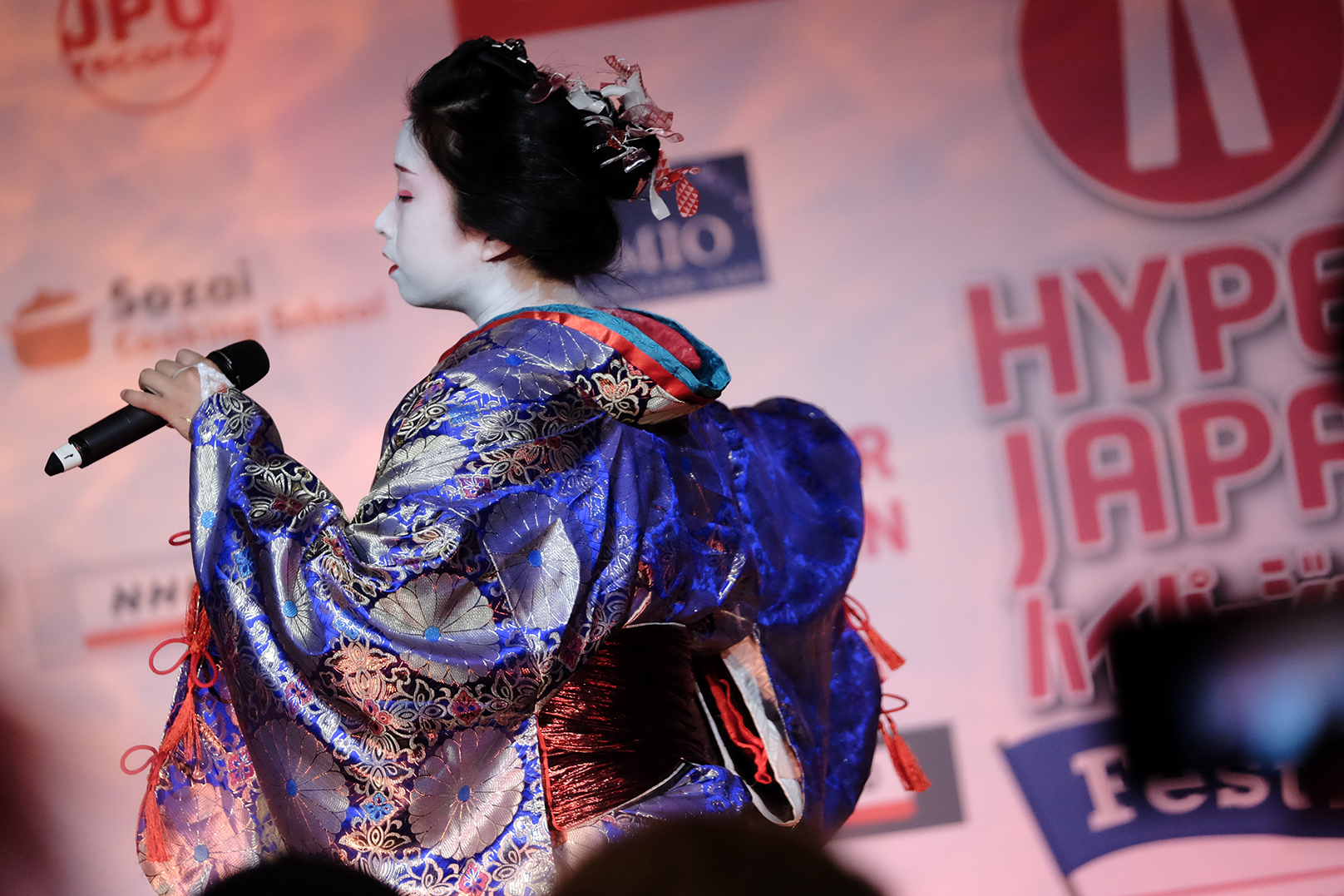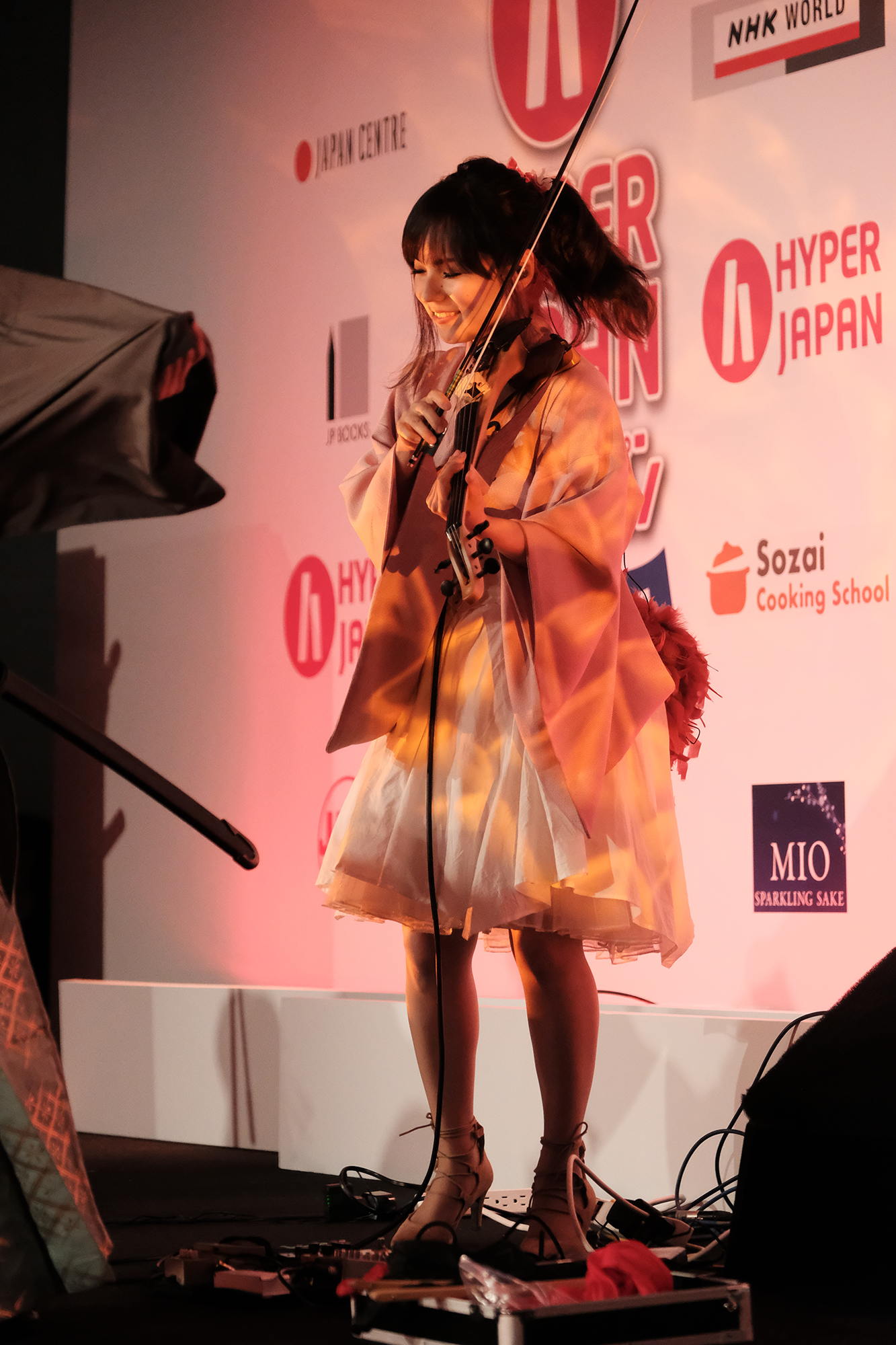 和装のメンバーが登場し、その見た目とは裏腹に鳴り響いてきたのは、ZENYA氏の8弦ギター・SADA氏のベース・遠藤氏のドラム(この日は欠席)の織り成すかなりの重低音ロック。ここロックの国”UK”に相応な音楽でした。そして、次に聞こえて来たのはまた良い意味で意表を突かれた、以津輝さんの日本舞踊の歌唱と歌詞。その正体は江戸時代の端唄をアレンジした曲達でした。(※インタビュー参照)
