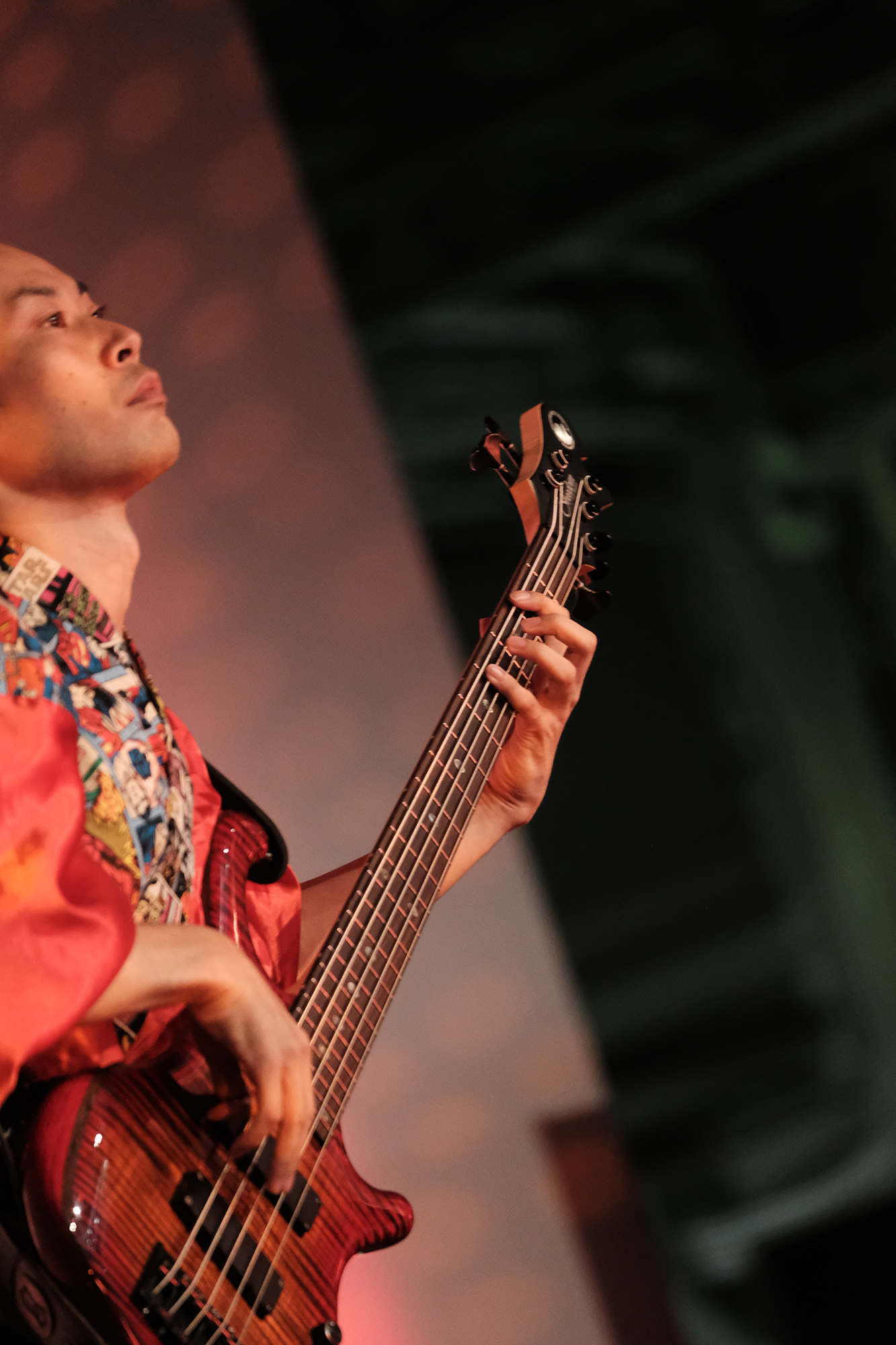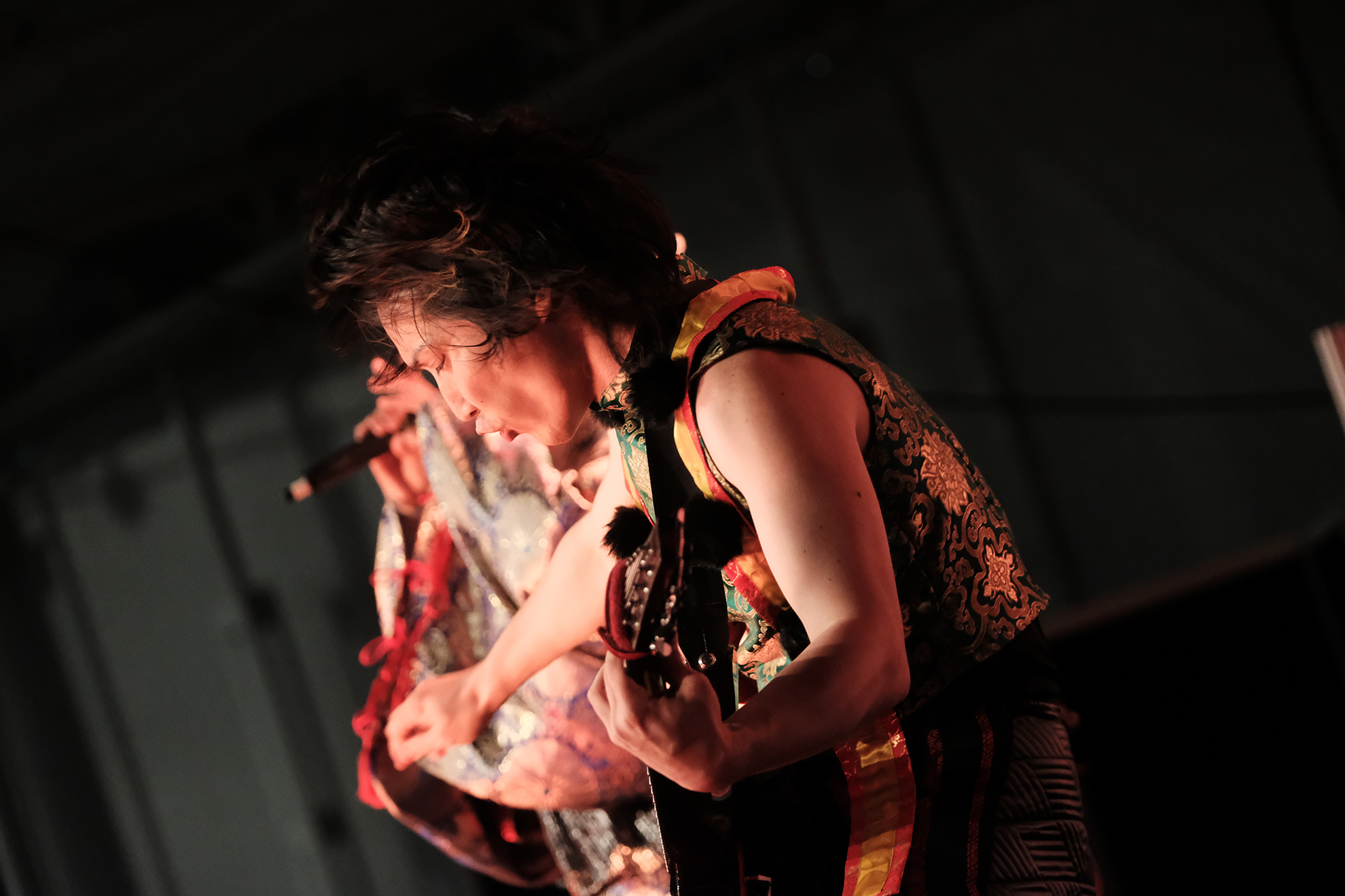 この異文化の音楽が混ざり合い、うねりとなって観客をそのリズムに乗せて行きます。同時にZENYA氏、SADA氏は楽器を弾きながら観客を煽り、以津輝さんはしなりしなりと唄い舞い踊り、更に見る者を舞台へ引き込んでいきます。