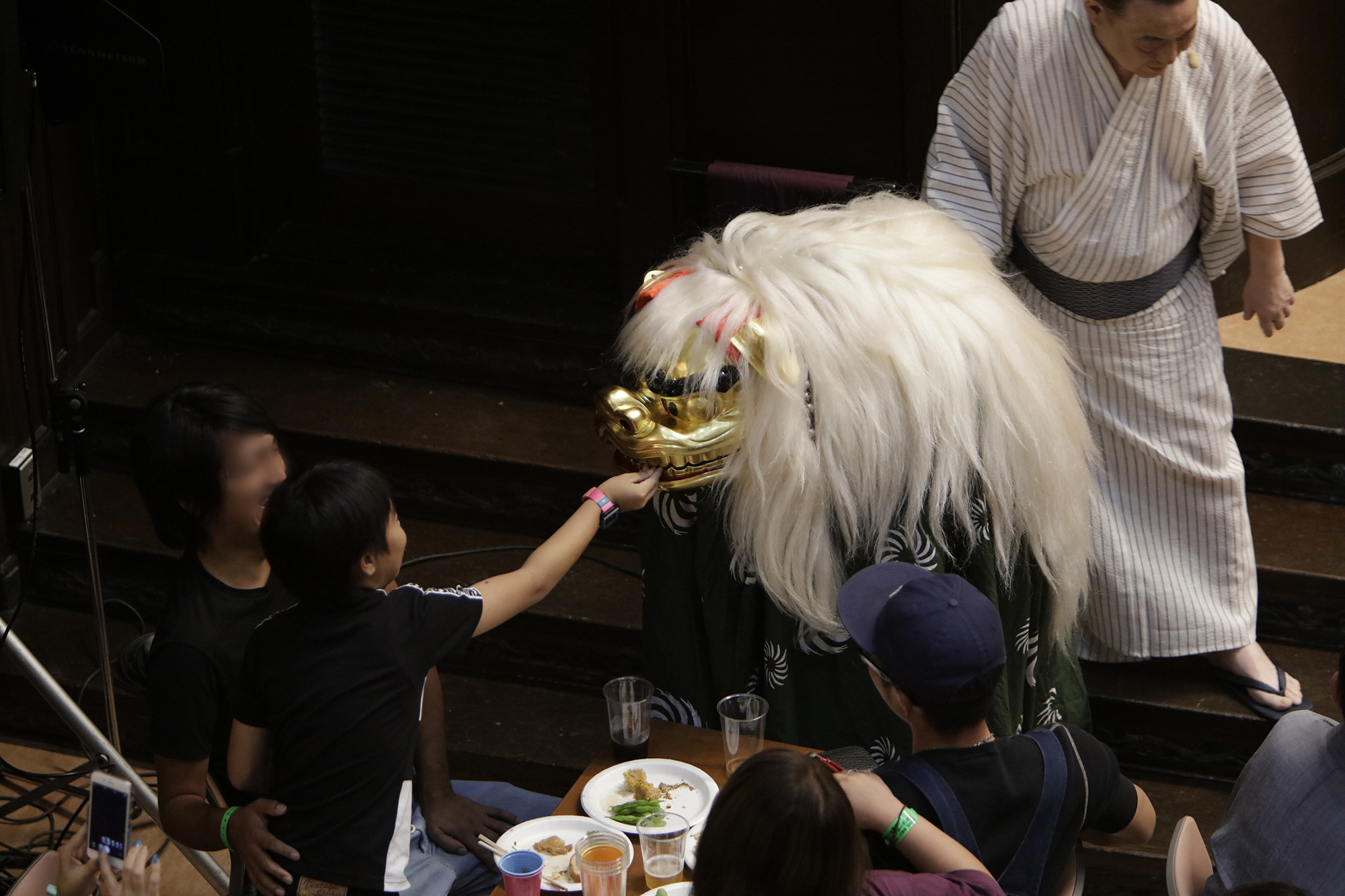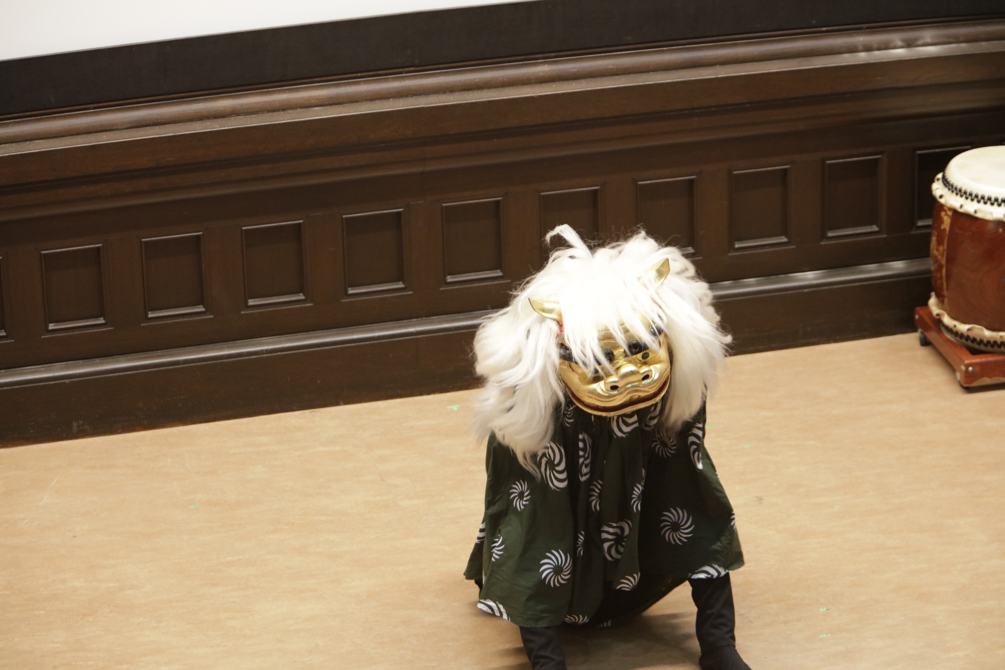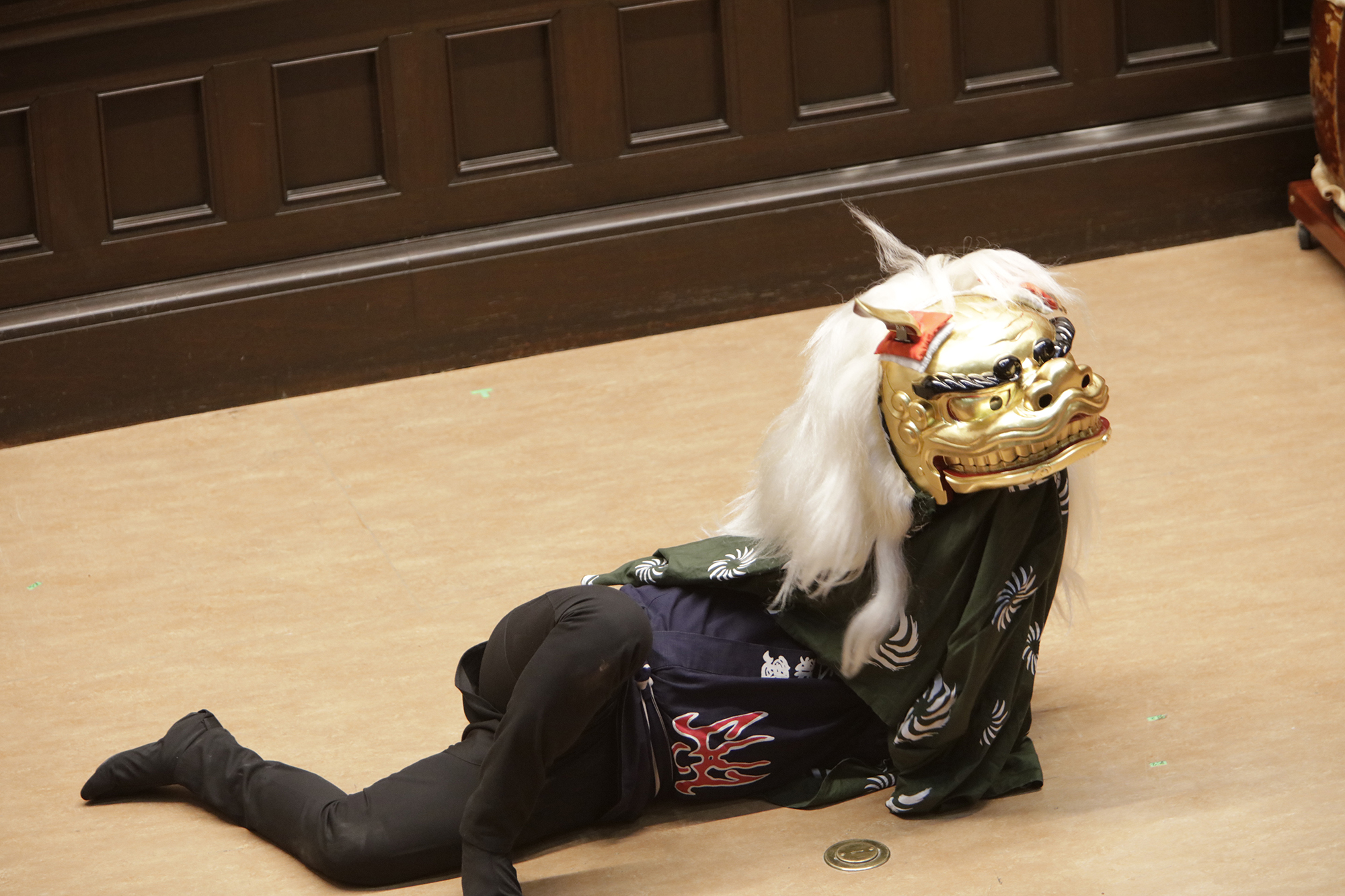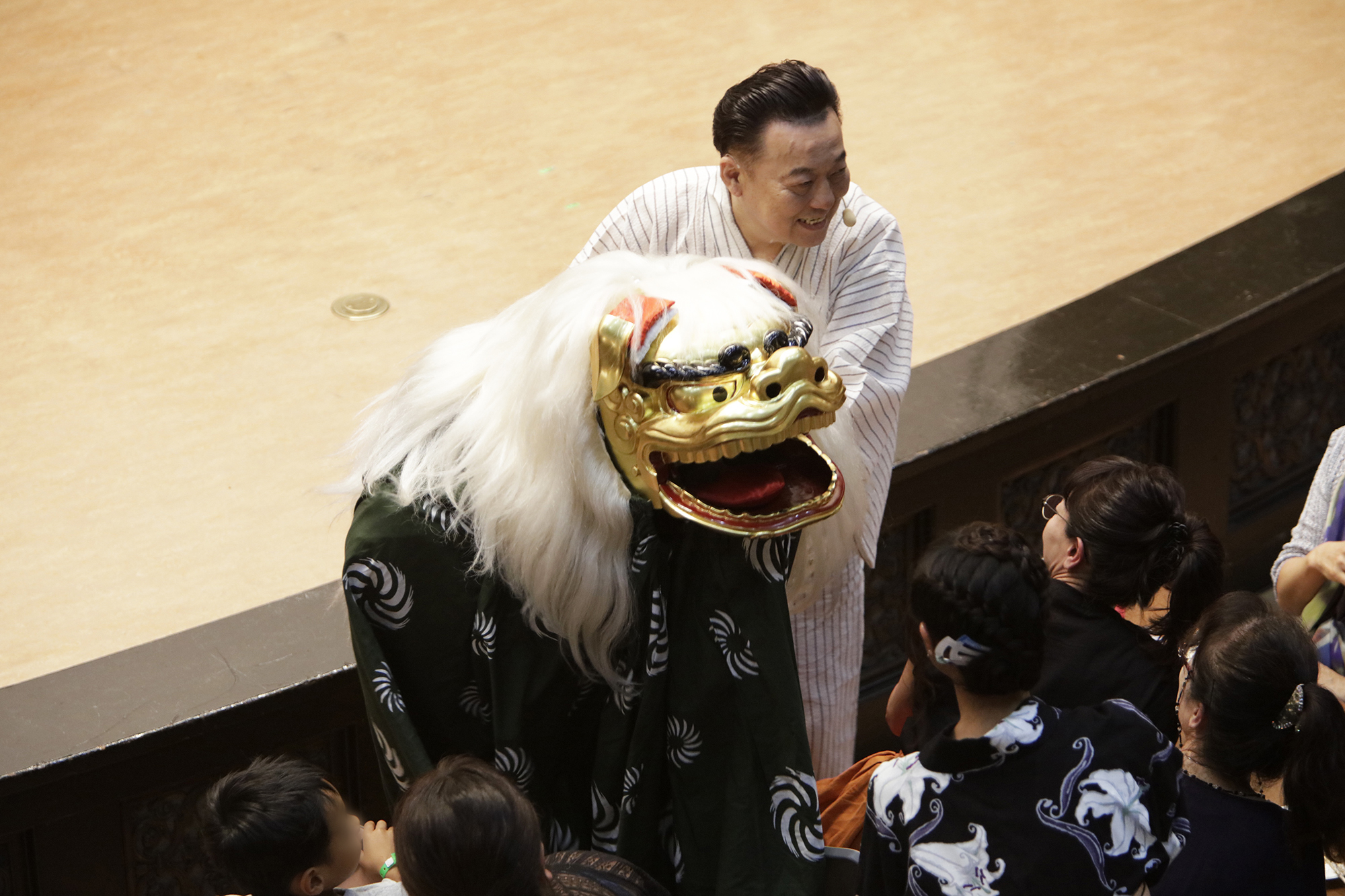 渡辺洋一氏が、話家さんの様に会場に来られていた方へ話しかけ、場を盛り上げます。中には可愛い小学生のお弟子さんも来られていて、大変嬉しそうにされておいででした。それから、江戸での獅子舞、寿獅子の由来が紹介され、その獅子舞を天邪鬼で演じられているのが真鍋徹也さん。渡辺氏は「さて、うまく舞えますでしょうか」とお客様の注意を舞台へ引き付けておりました。
