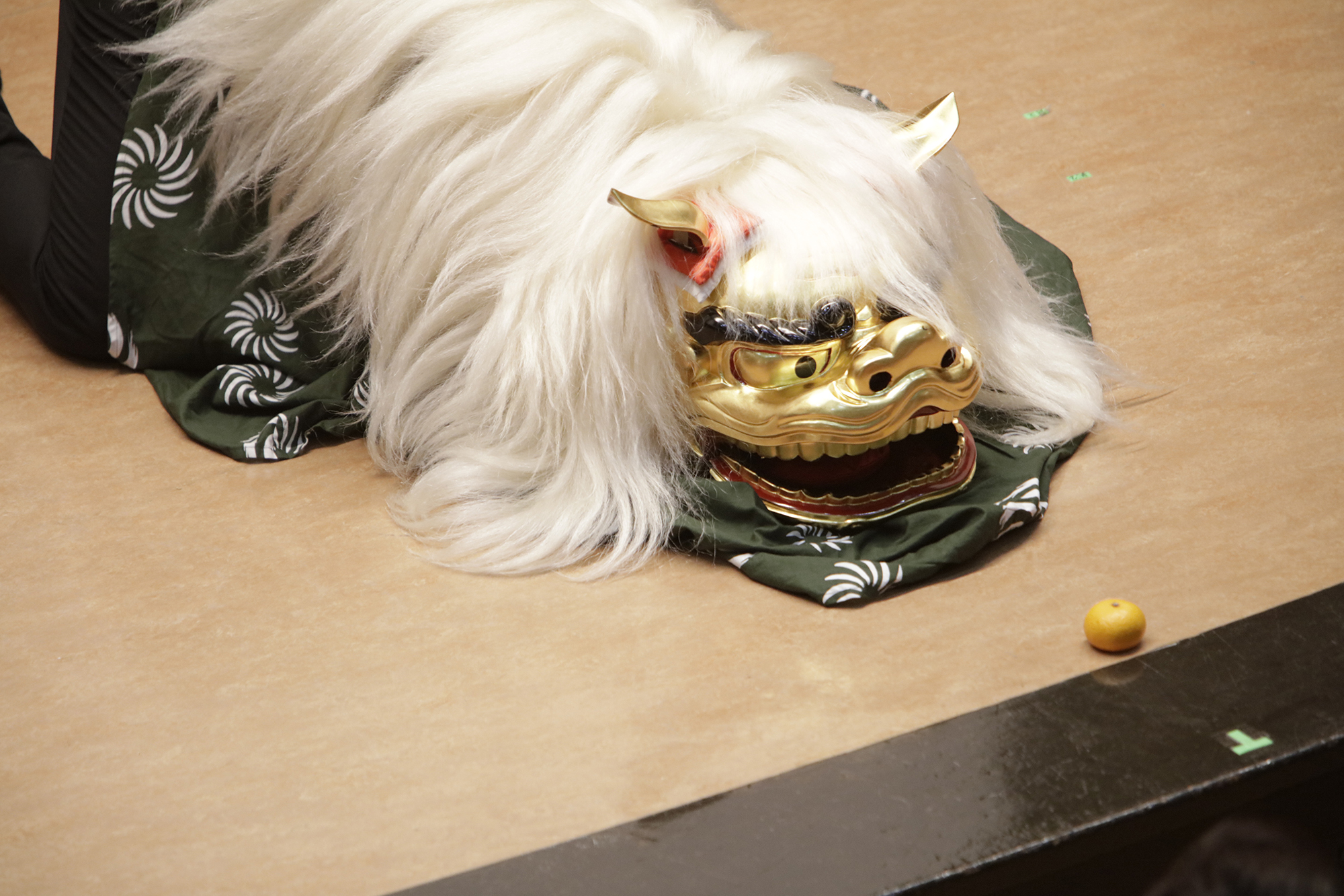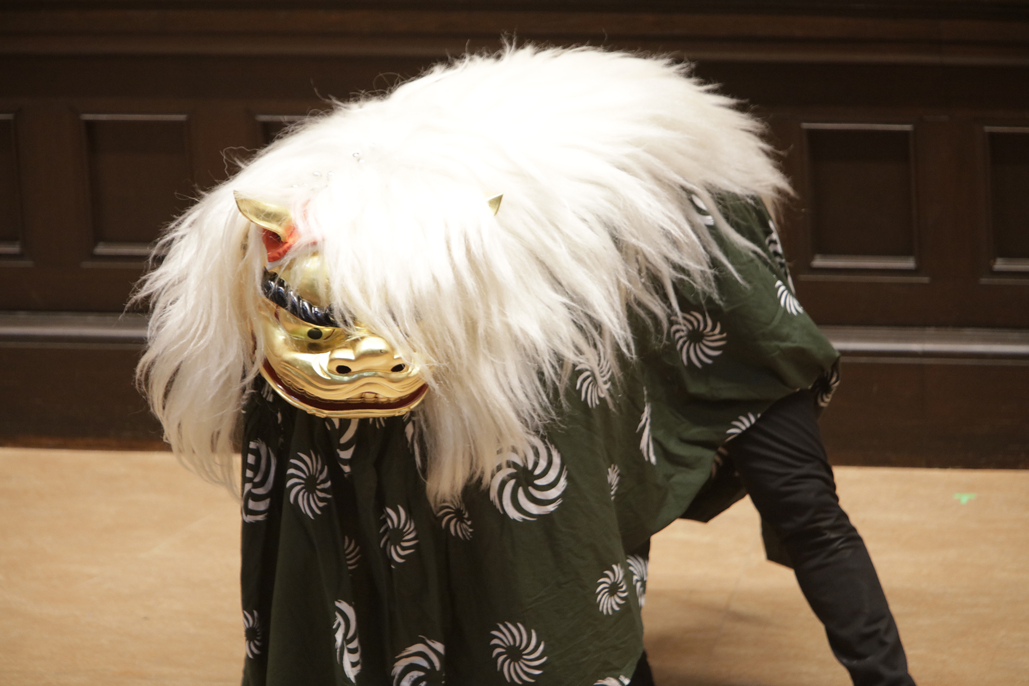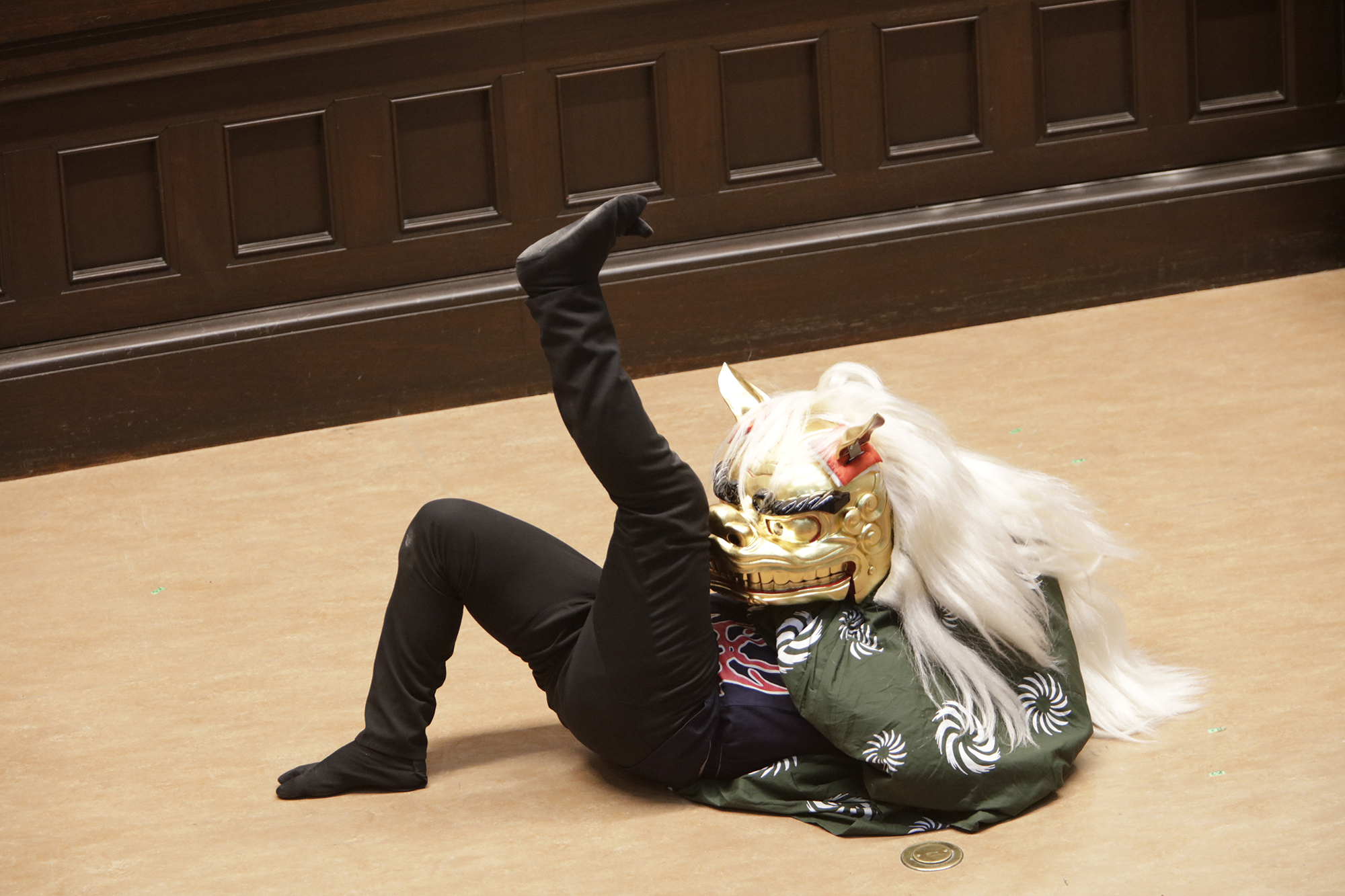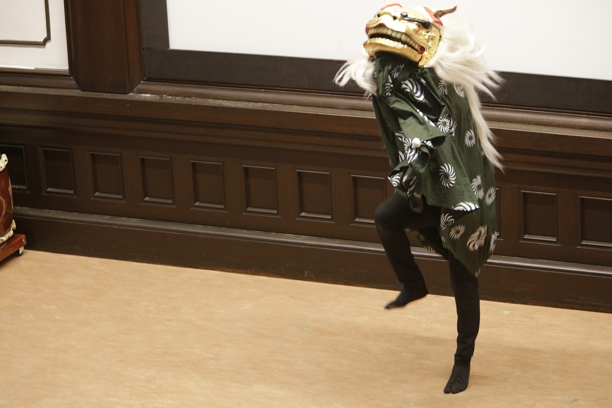 渡辺洋一氏が、話家さんの様に会場に来られていた方へ話しかけ、場を盛り上げます。中には可愛い小学生のお弟子さんも来られていて、大変嬉しそうにされておいででした。それから、江戸での獅子舞、寿獅子の由来が紹介され、その獅子舞を天邪鬼で演じられているのが真鍋徹也さん。渡辺氏は「さて、うまく舞えますでしょうか」とお客様の注意を舞台へ引き付けておりました。