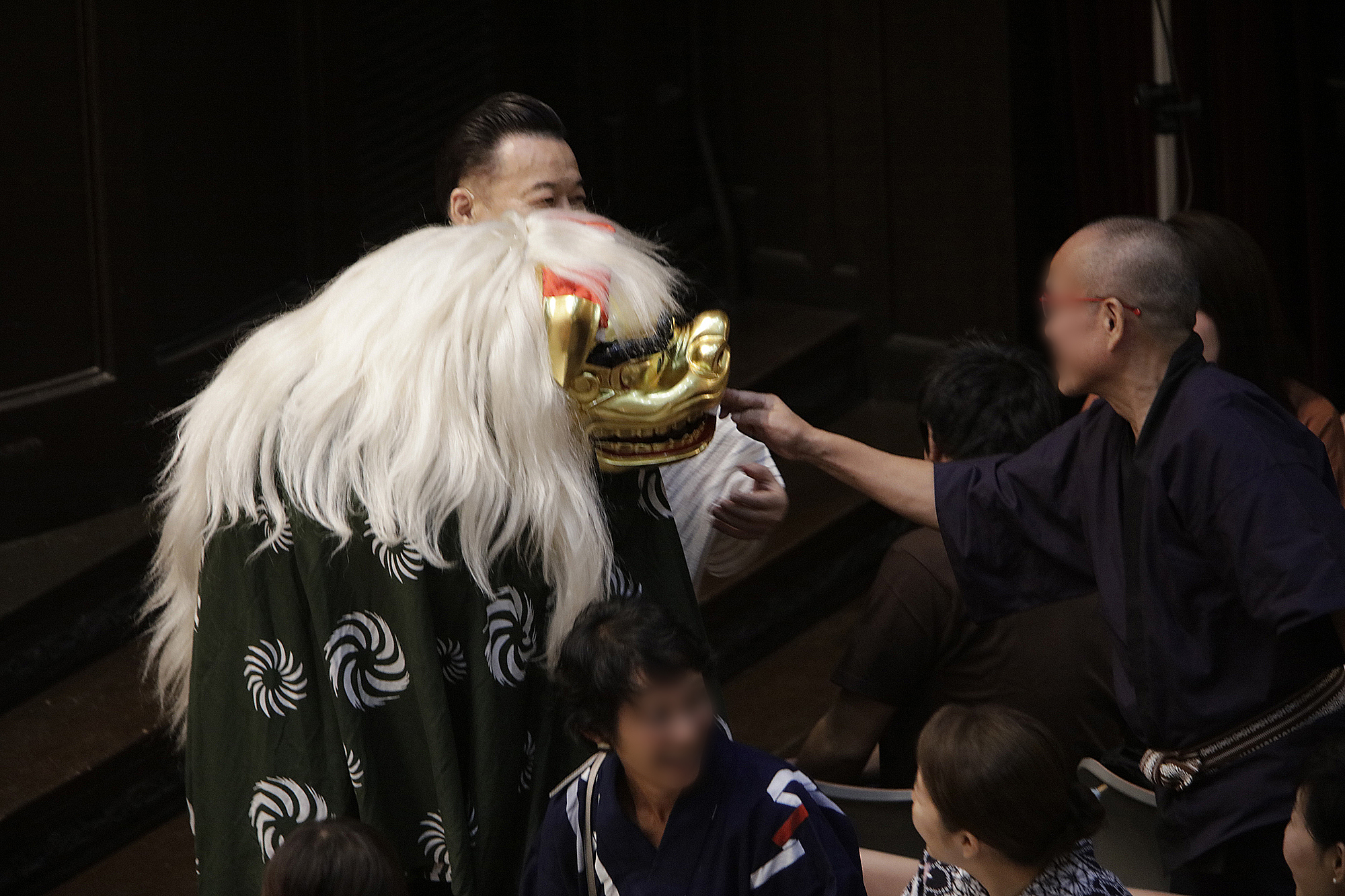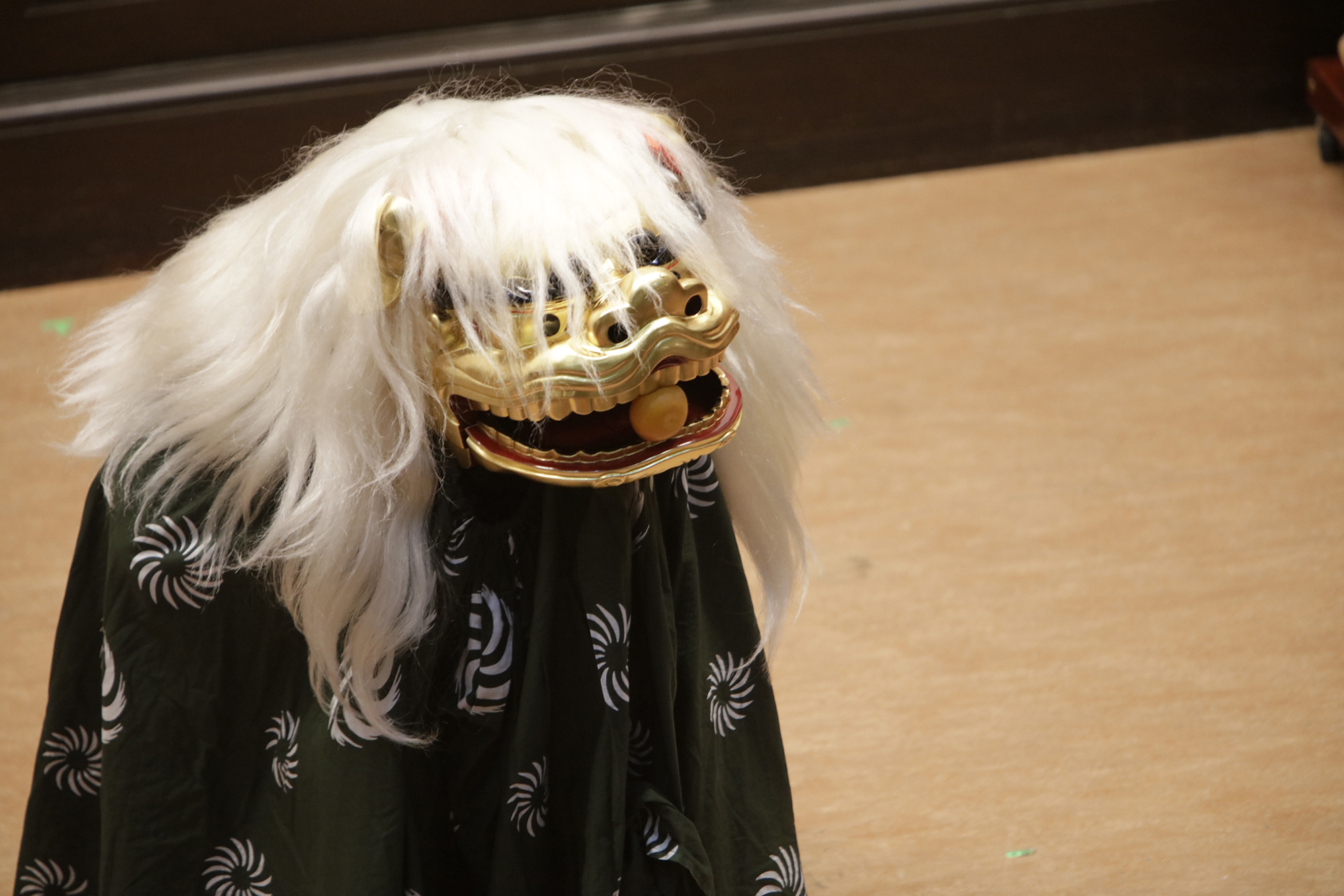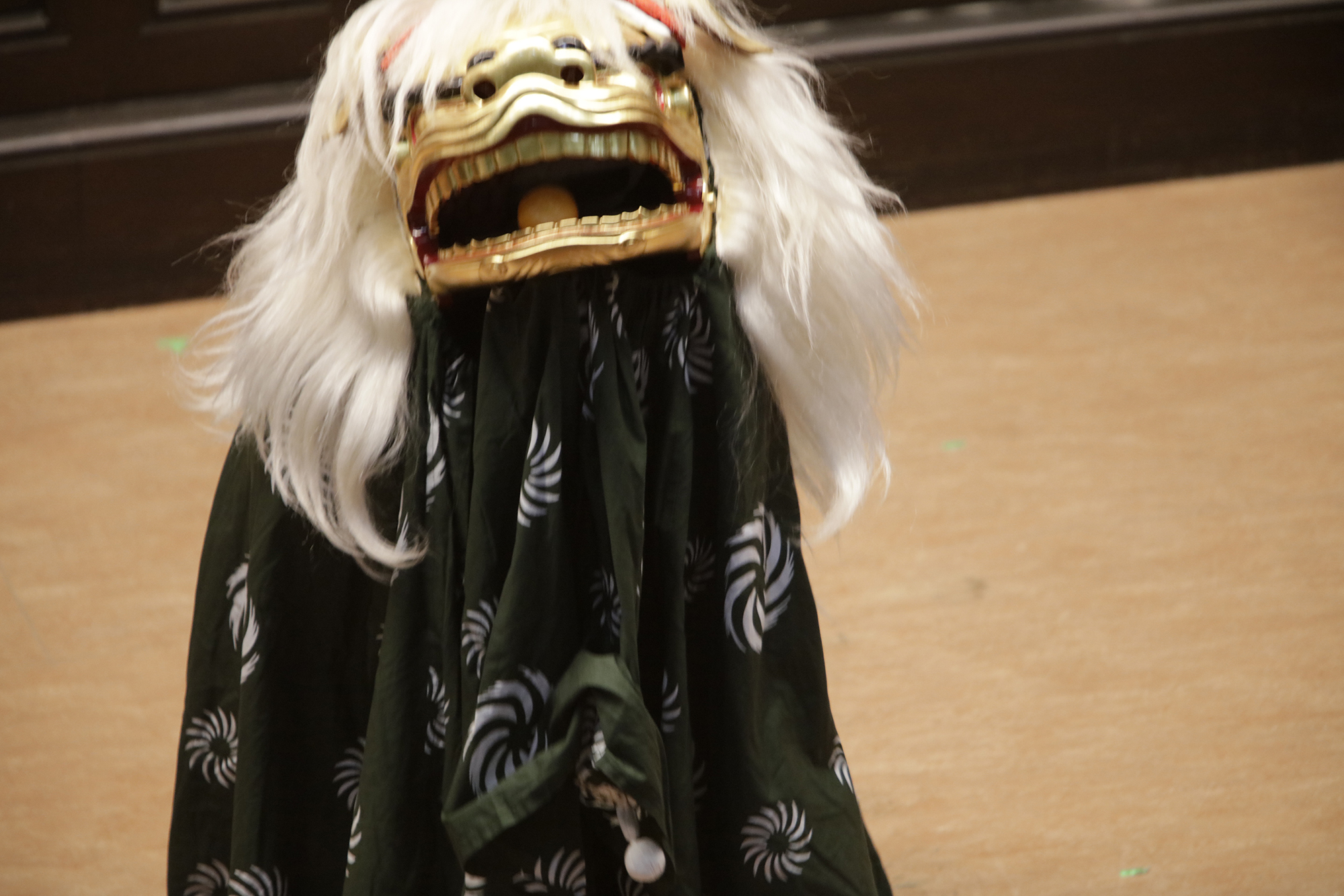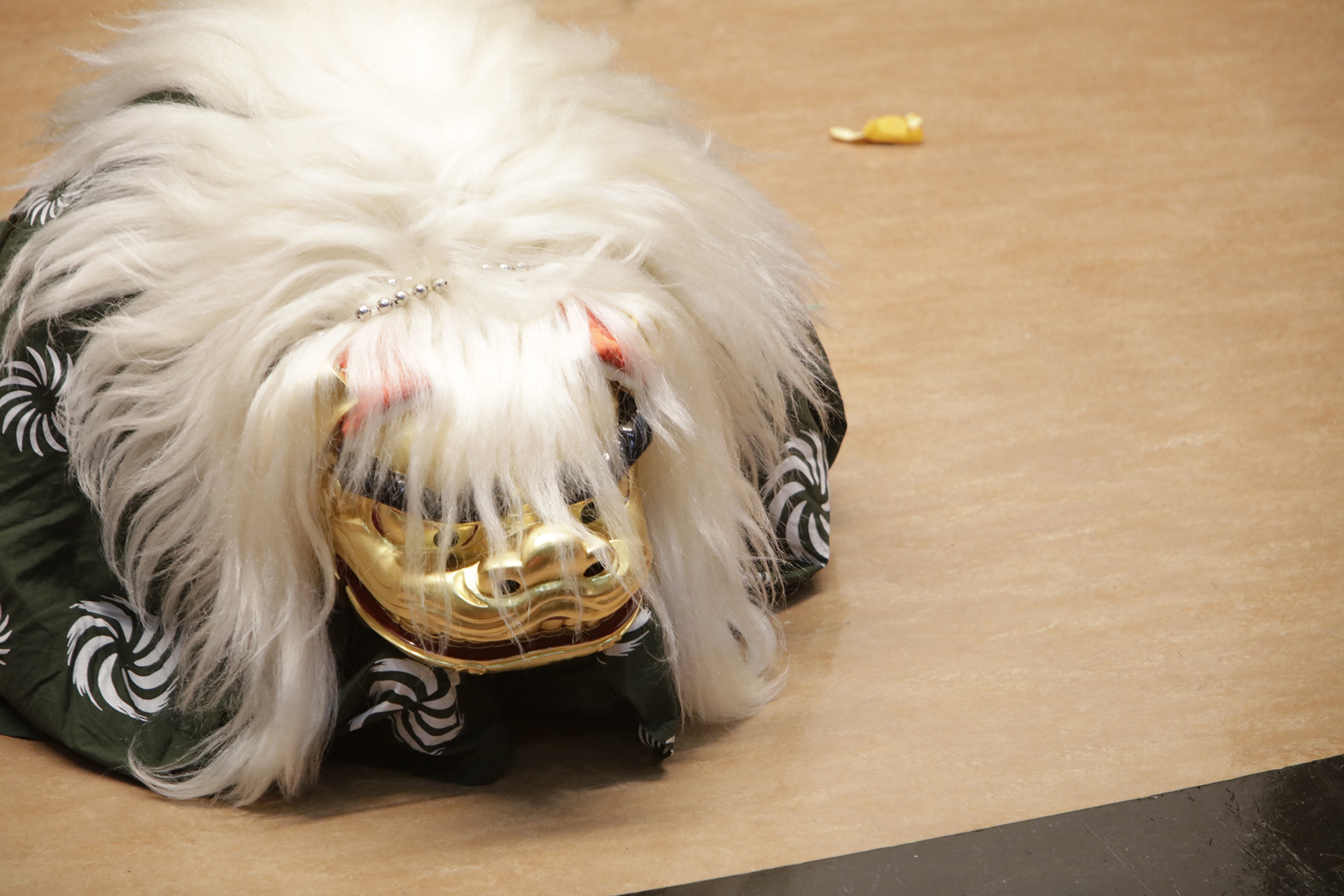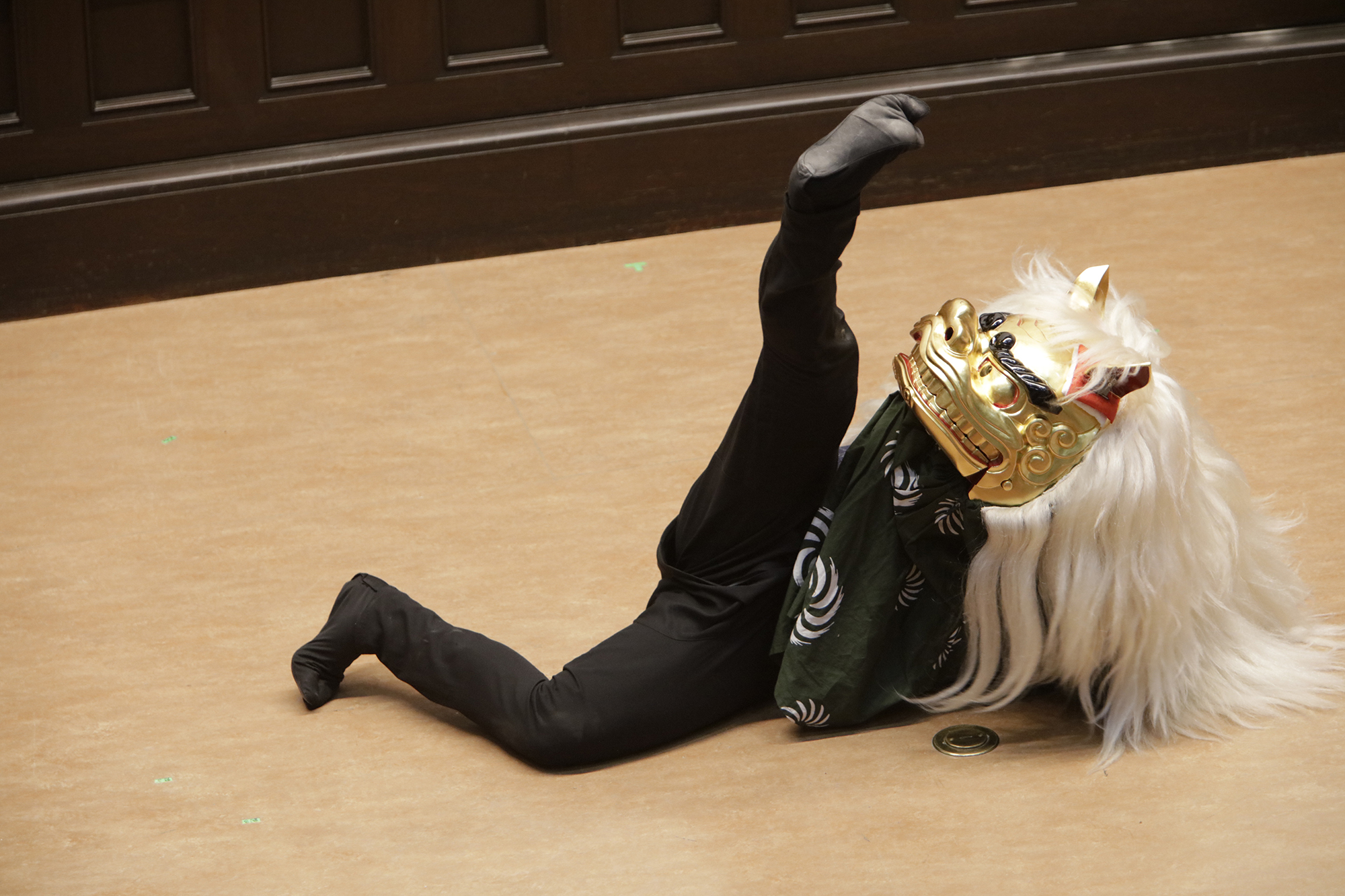 渡辺洋一氏が、話家さんの様に会場に来られていた方へ話しかけ、場を盛り上げます。中には可愛い小学生のお弟子さんも来られていて、大変嬉しそうにされておいででした。それから、江戸での獅子舞、寿獅子の由来が紹介され、その獅子舞を天邪鬼で演じられているのが真鍋徹也さん。渡辺氏は「さて、うまく舞えますでしょうか」とお客様の注意を舞台へ引き付けておりました。