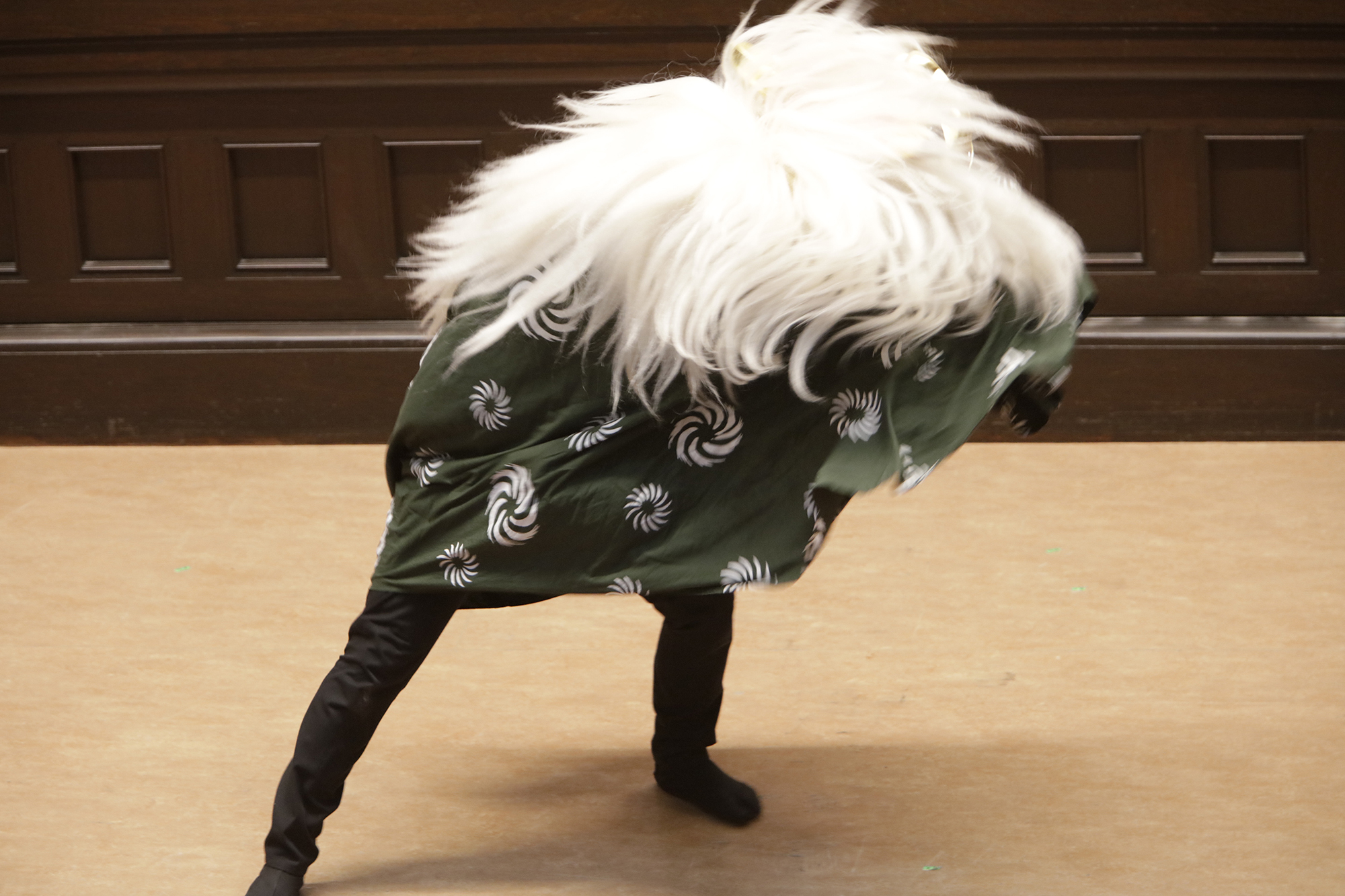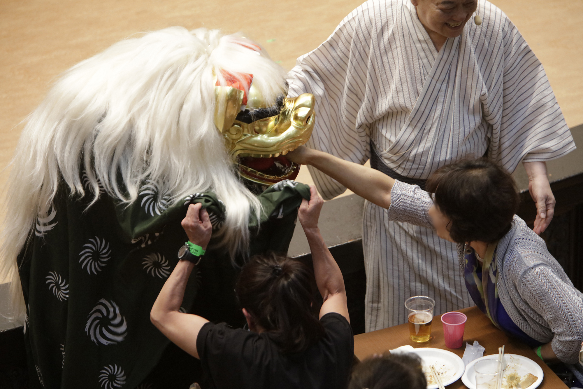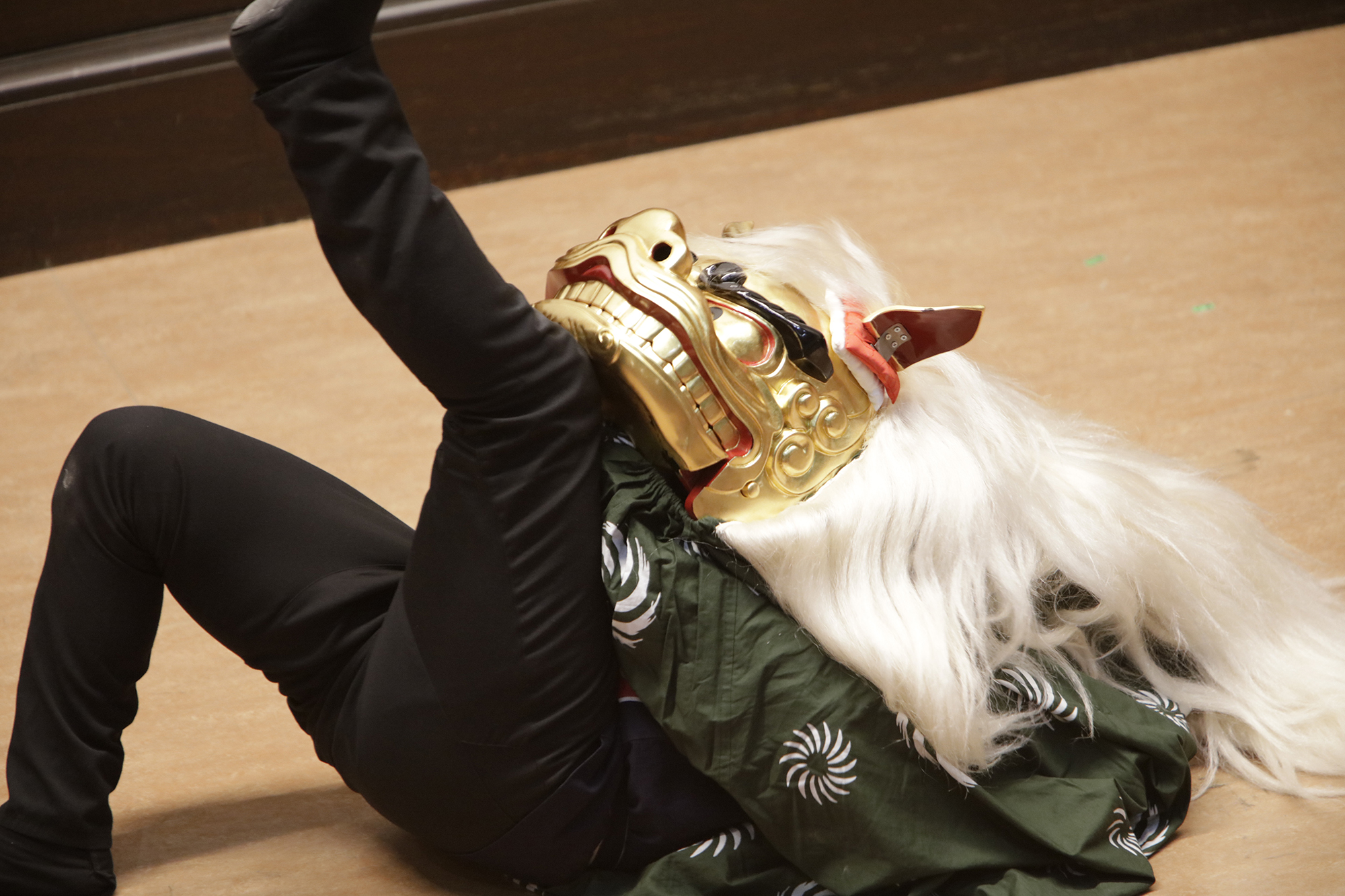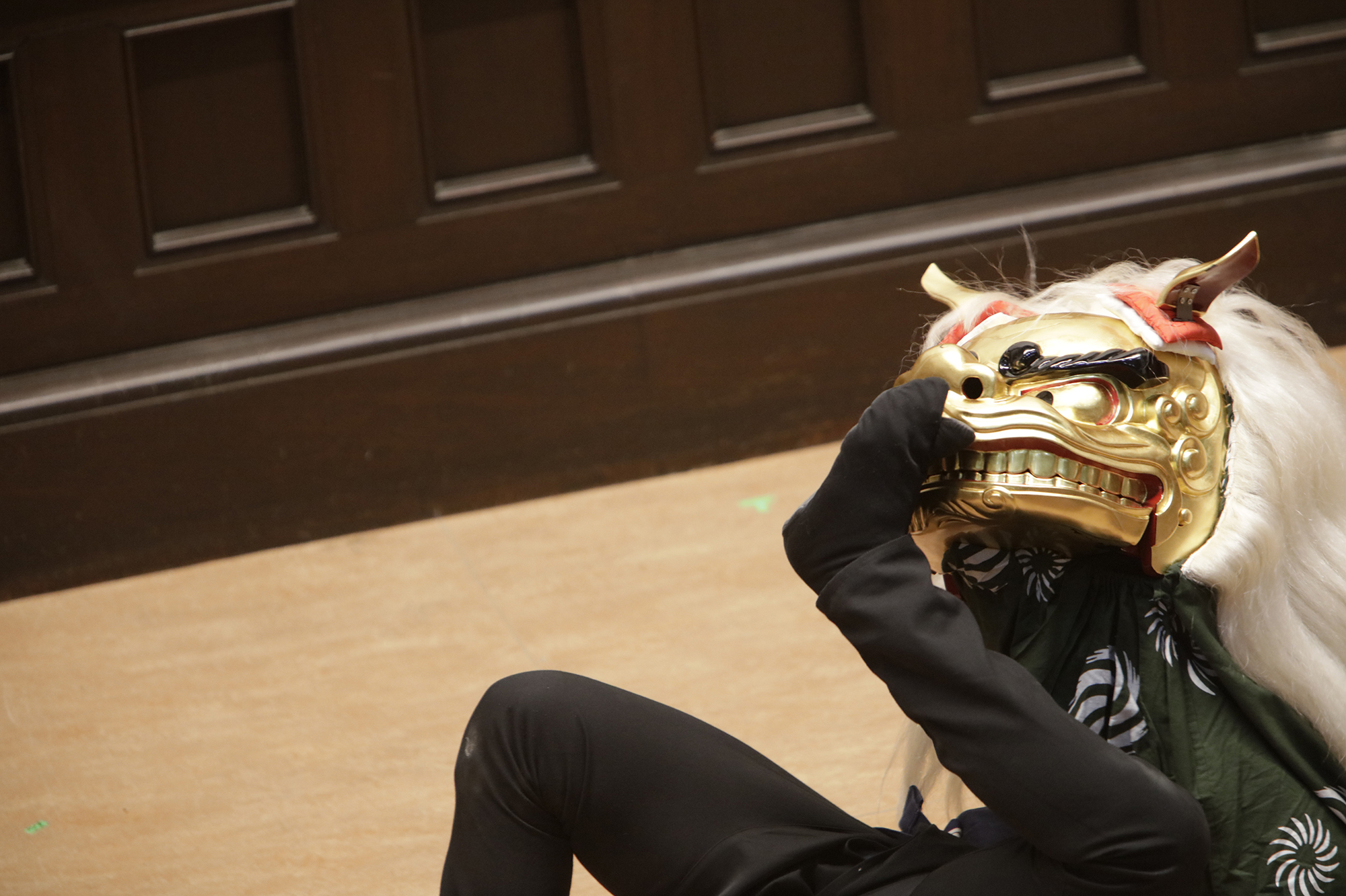 渡辺洋一氏が、話家さんの様に会場に来られていた方へ話しかけ、場を盛り上げます。中には可愛い小学生のお弟子さんも来られていて、大変嬉しそうにされておいででした。それから、江戸での獅子舞、寿獅子の由来が紹介され、その獅子舞を天邪鬼で演じられているのが真鍋徹也さん。渡辺氏は「さて、うまく舞えますでしょうか」とお客様の注意を舞台へ引き付けておりました。