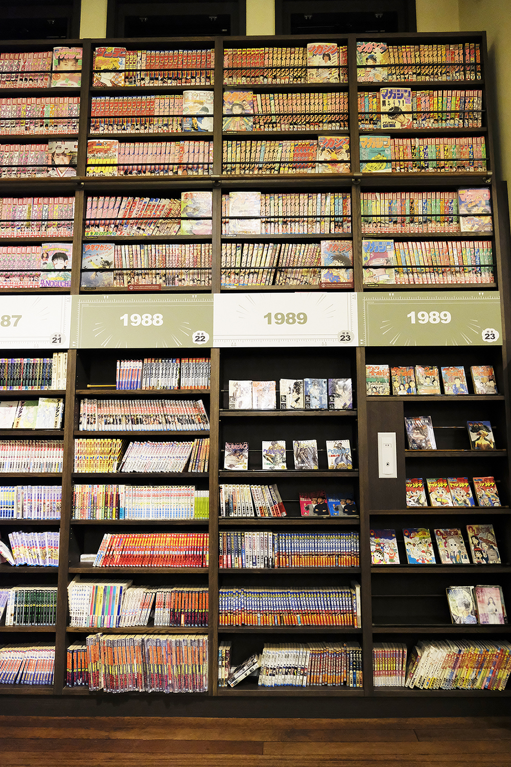 所蔵するマンガ資料は、歴史的なものから海外のものまで約30万点もあり、そのうちの約5万冊(1970年代~2005年位までの単行本)は館内1~3階にある、「マンガの壁」に配架されています。