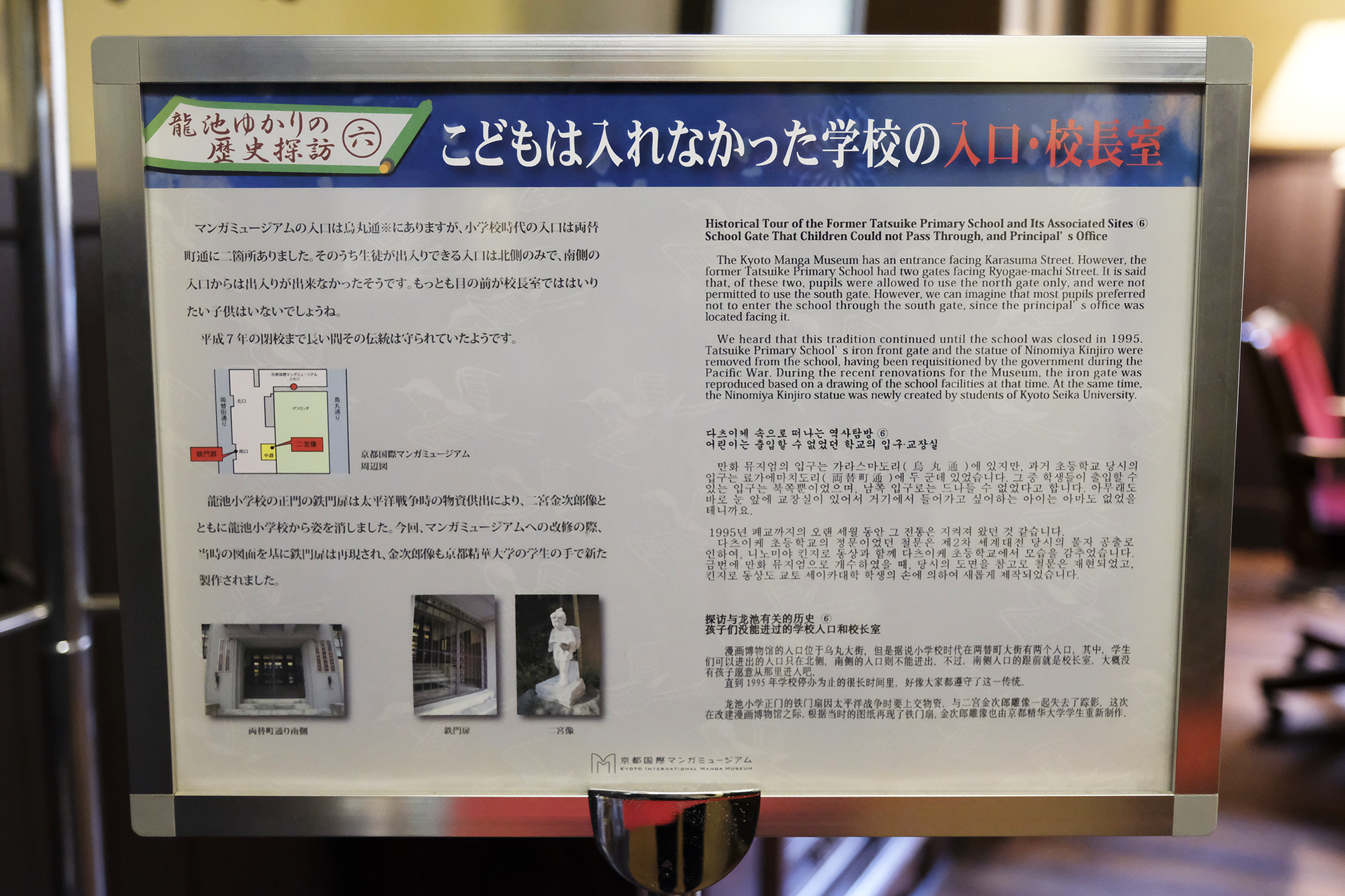 建物は昭和初期建造の元龍池小学校をリノベーションしており、長年地域のシンボルであった小学校の役割を”京都国際マンガミュージアム”が引き継ぐという意味もあった様です。