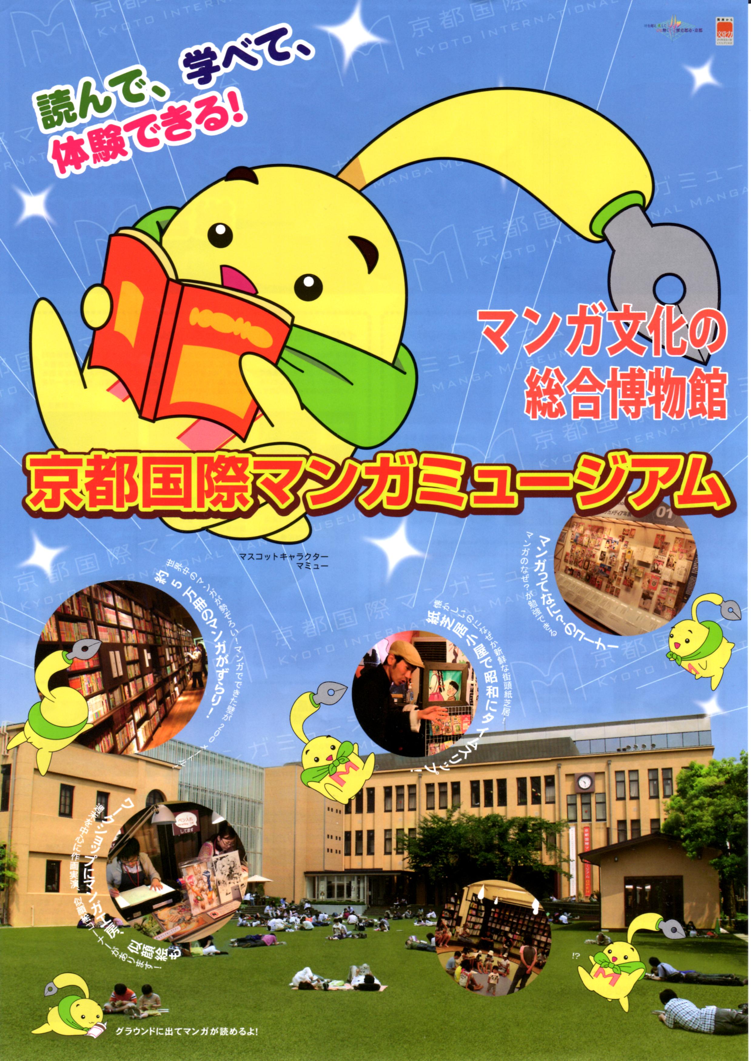 ●マミュー…日本発のマンガ総合博物館である”京都国際マンガミュージアム”(愛称:えむえむ)の可愛らしいオリジナルマスコット。頭部後方から伸びるマンガ作画用ペンと、背中に背負った風呂敷(この中には世界中のマンガが満載!)がトレードマーク。名前の由来は、「マンガ」「ミュージアム」のそれぞれの頭文字を取って名付けられ、話す時には語尾に「マン!」って付けることが多いそう。館内2階にはマミューの部屋もあり、記念写真も一緒に撮れます♪