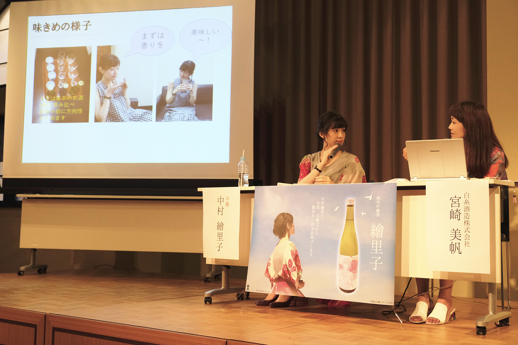 この日は「繪里子酒」のポスターと同じ衣装の中村繪里子さん!まずは簡単なプロフィールのご紹介から始まります。