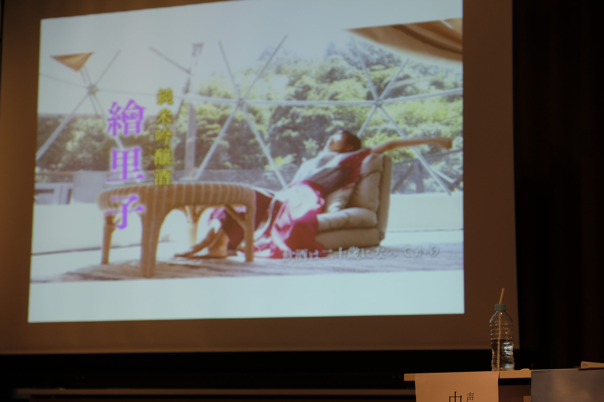 ~純米吟醸酒「繪里子」は、清廉で透明な繪里子さんのイメージに合わせて作ってあります。この「繪里子酒」がなぜ誕生することになったのか、スライドと共にご紹介していきます。