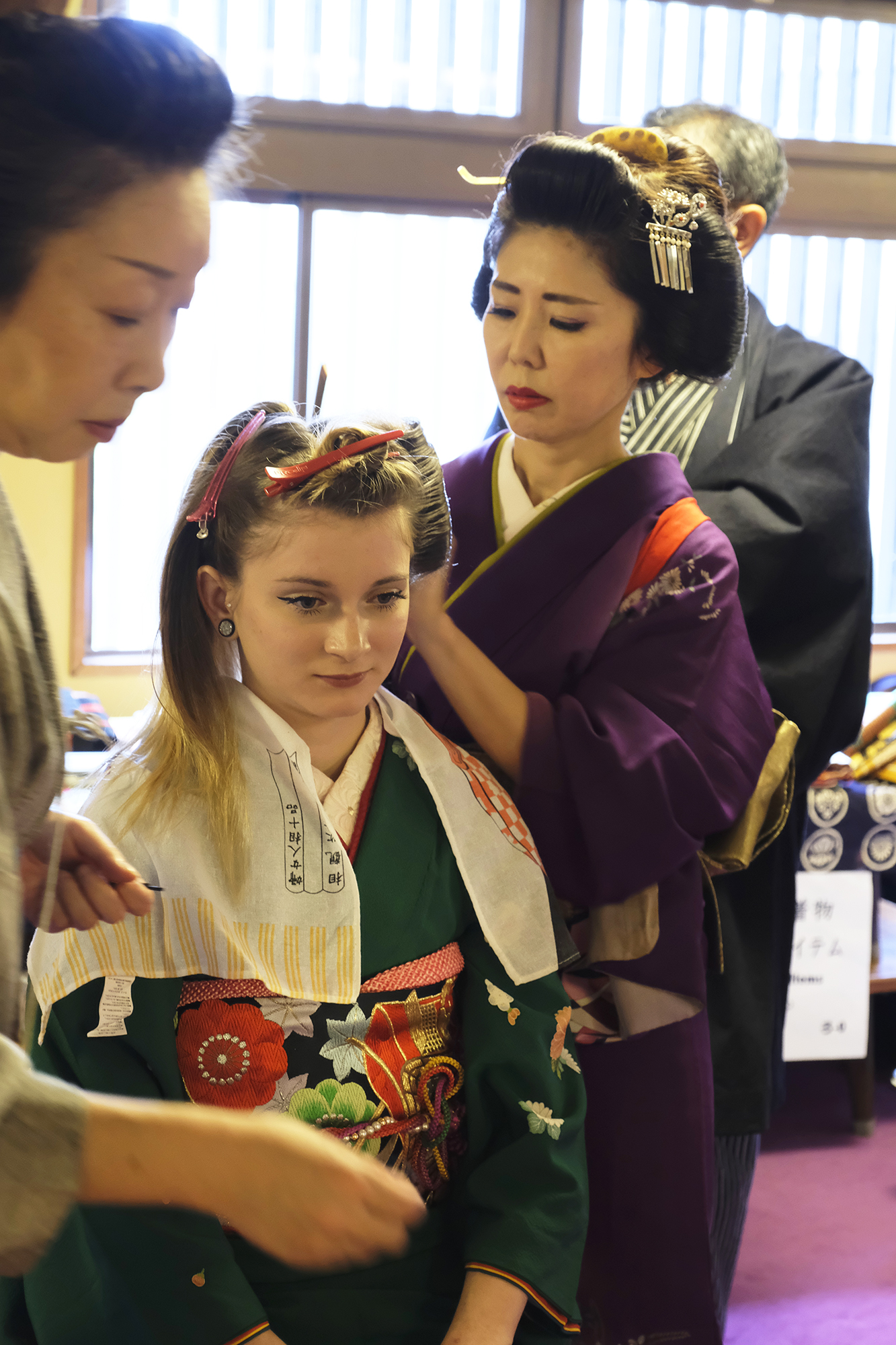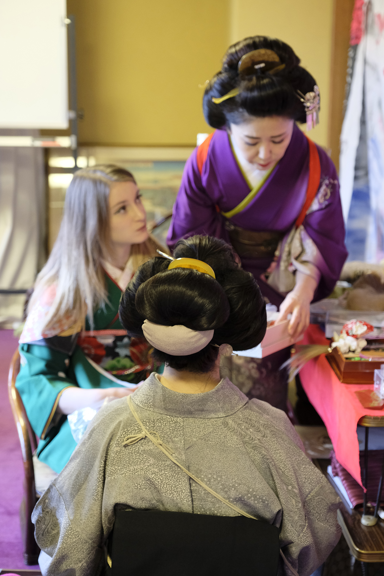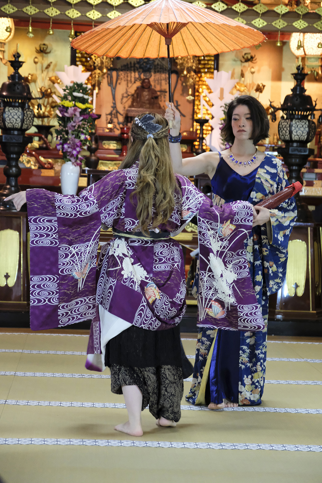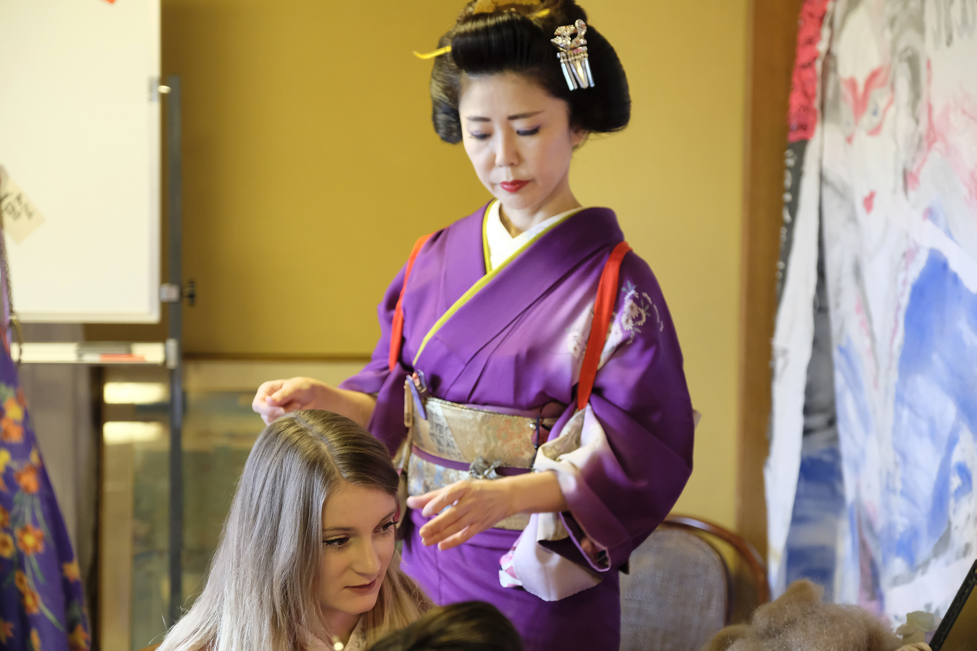 何回か体験してくれている可愛らしいドイツ人女性の方が、今日もモデルさんとの事でした。洋服姿も見てしまうと、お着物を着た時の美しさのギャップがまた素敵ですね!お着物を着てパフォーマンスの準備を整えています。