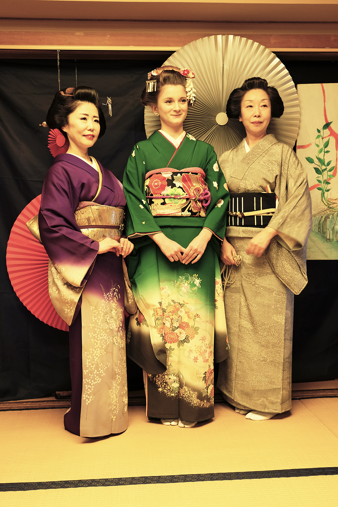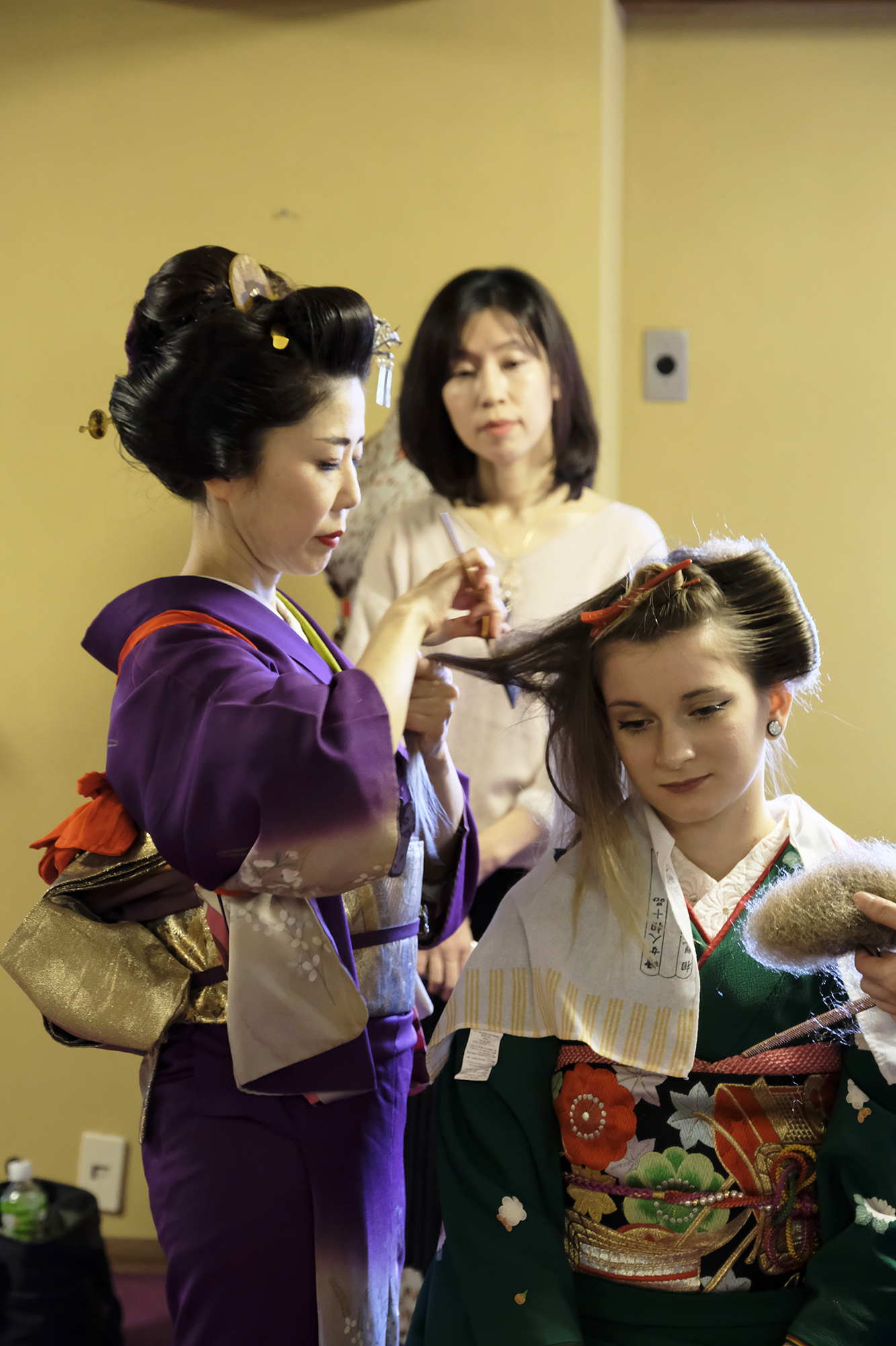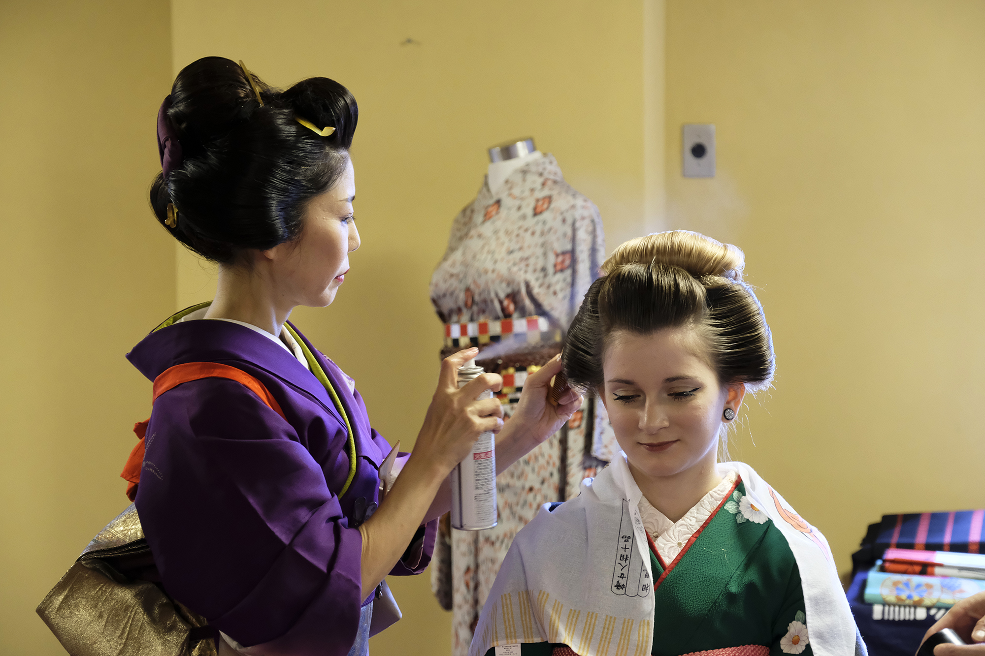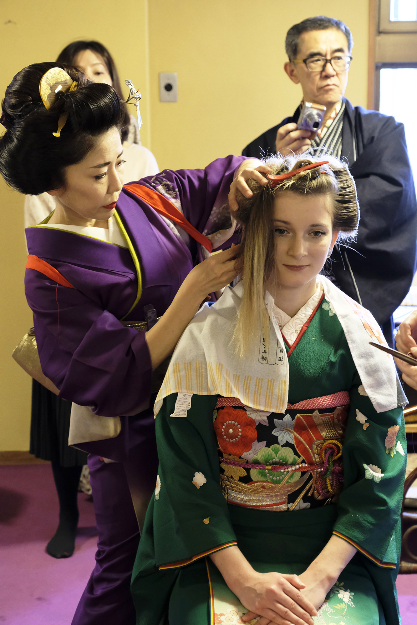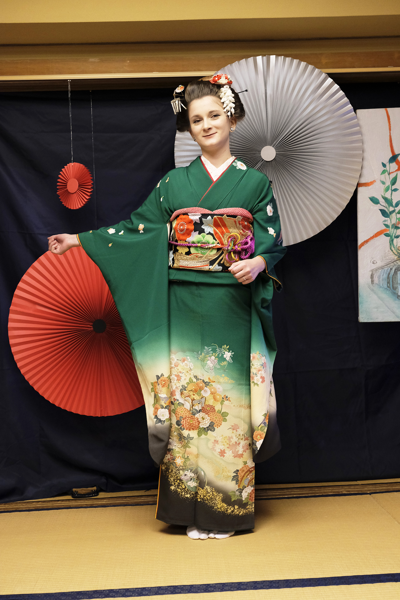 何回か体験してくれている可愛らしいドイツ人女性の方が、今日もモデルさんとの事でした。洋服姿も見てしまうと、お着物を着た時の美しさのギャップがまた素敵ですね!お着物を着てパフォーマンスの準備を整えています。