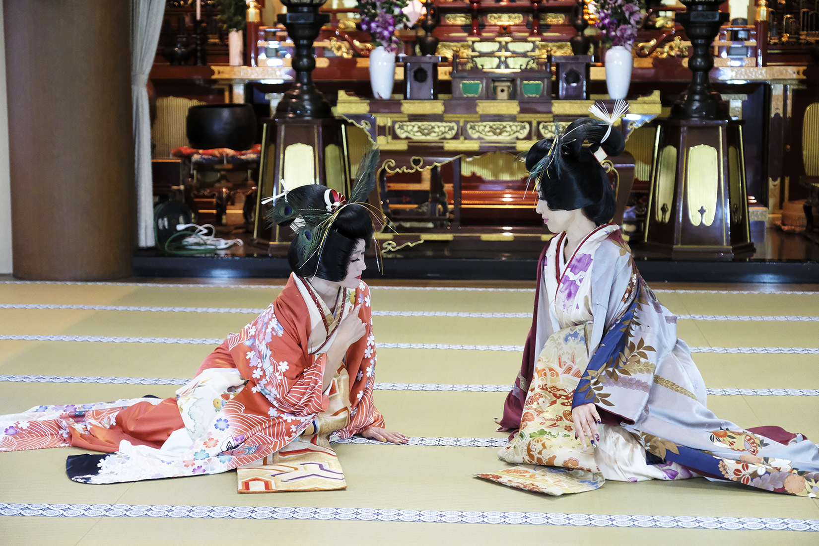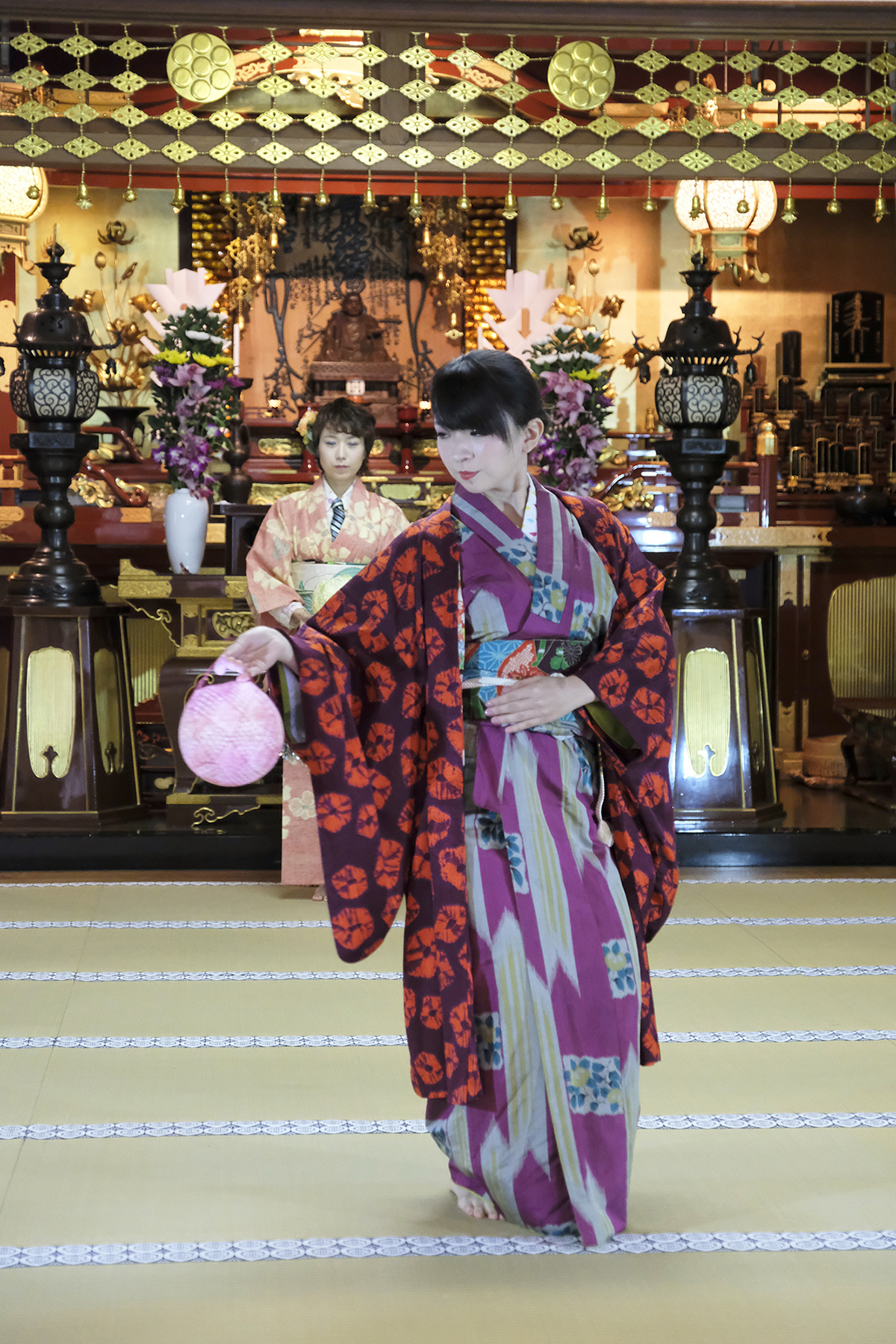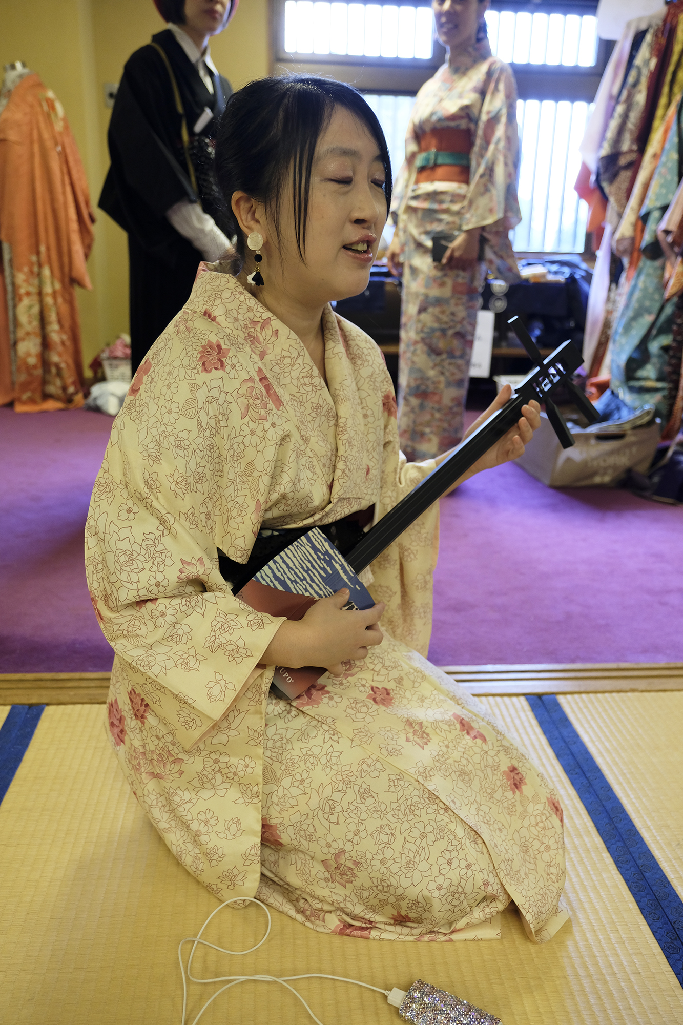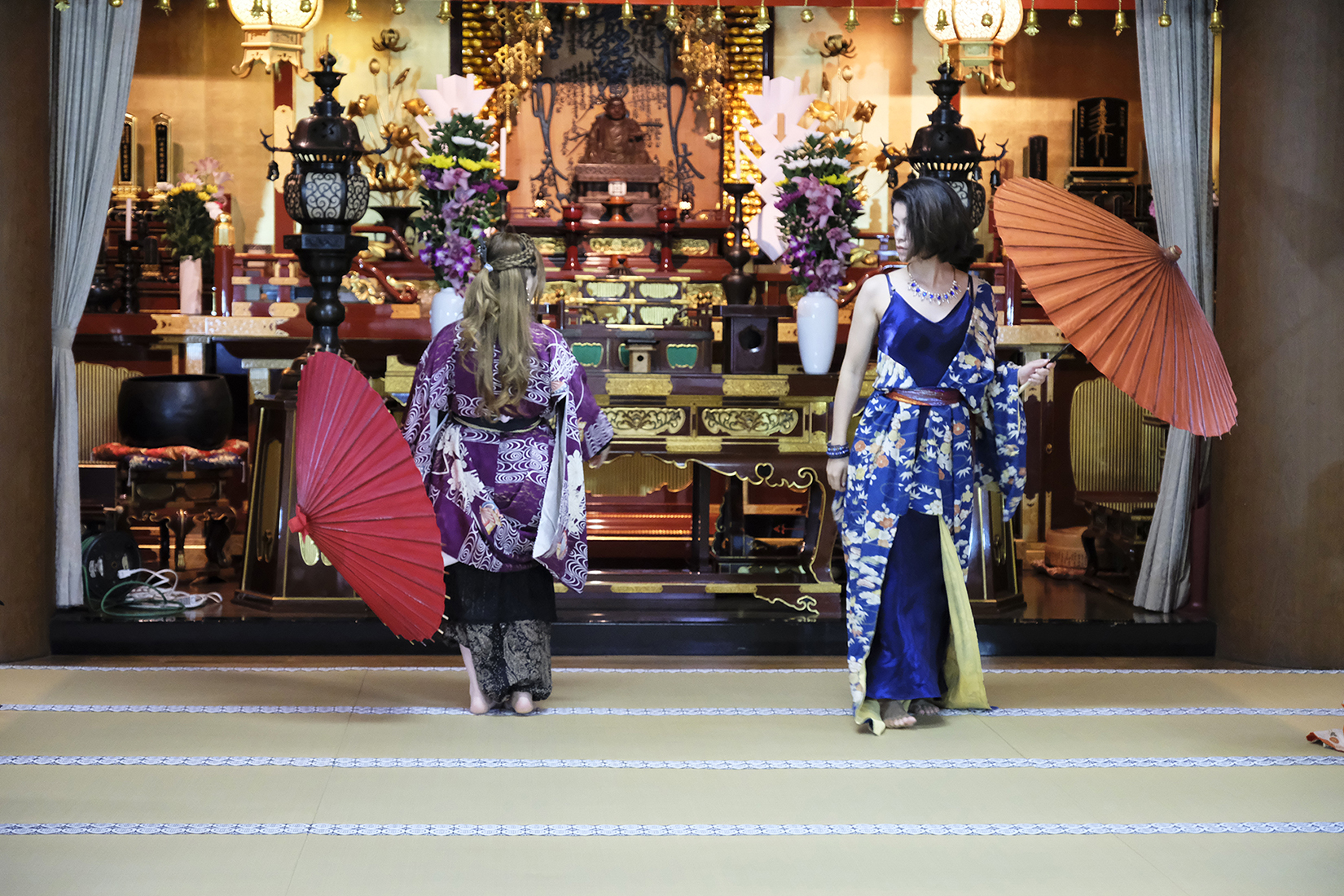 何回か体験してくれている可愛らしいドイツ人女性の方が、今日もモデルさんとの事でした。洋服姿も見てしまうと、お着物を着た時の美しさのギャップがまた素敵ですね!お着物を着てパフォーマンスの準備を整えています。