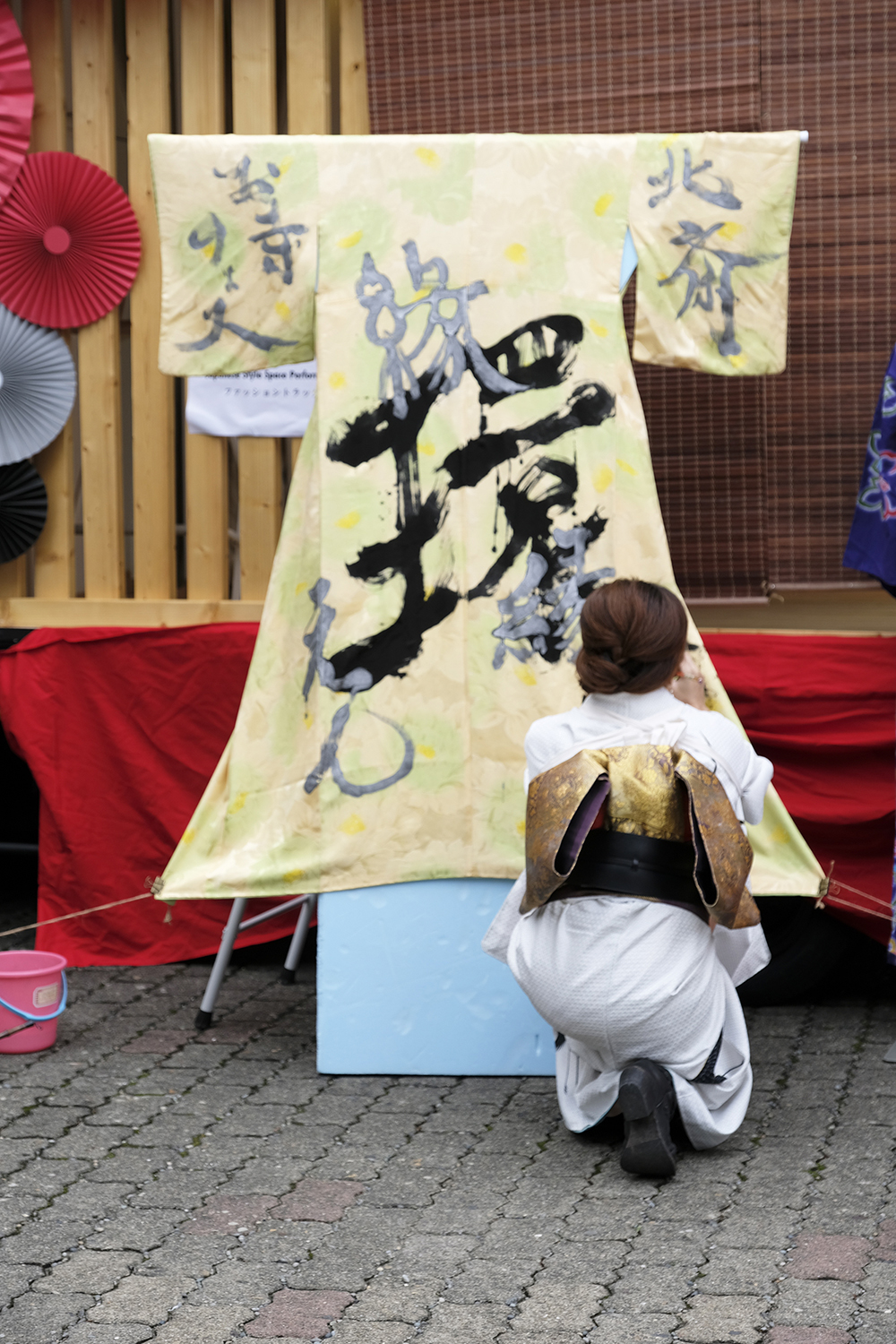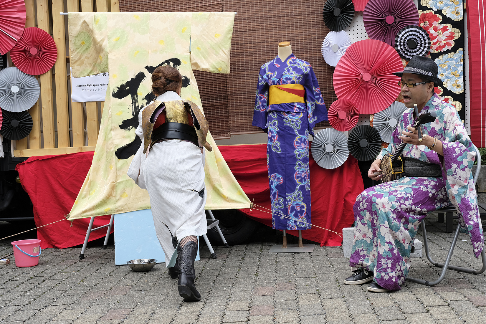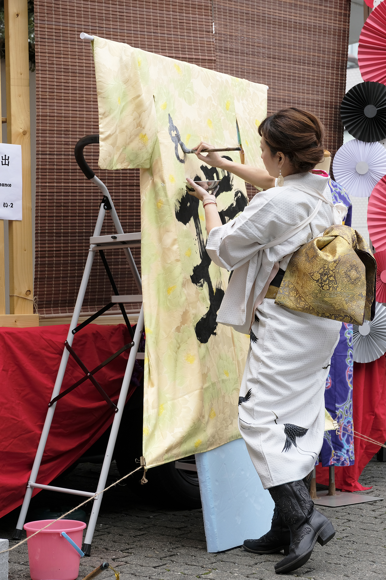 書道家 永島 美織さんと唄/三線 タケシィさんによる、着物をキャンバスにしたライブ書道が、髪結いの後屋外にて行われました。