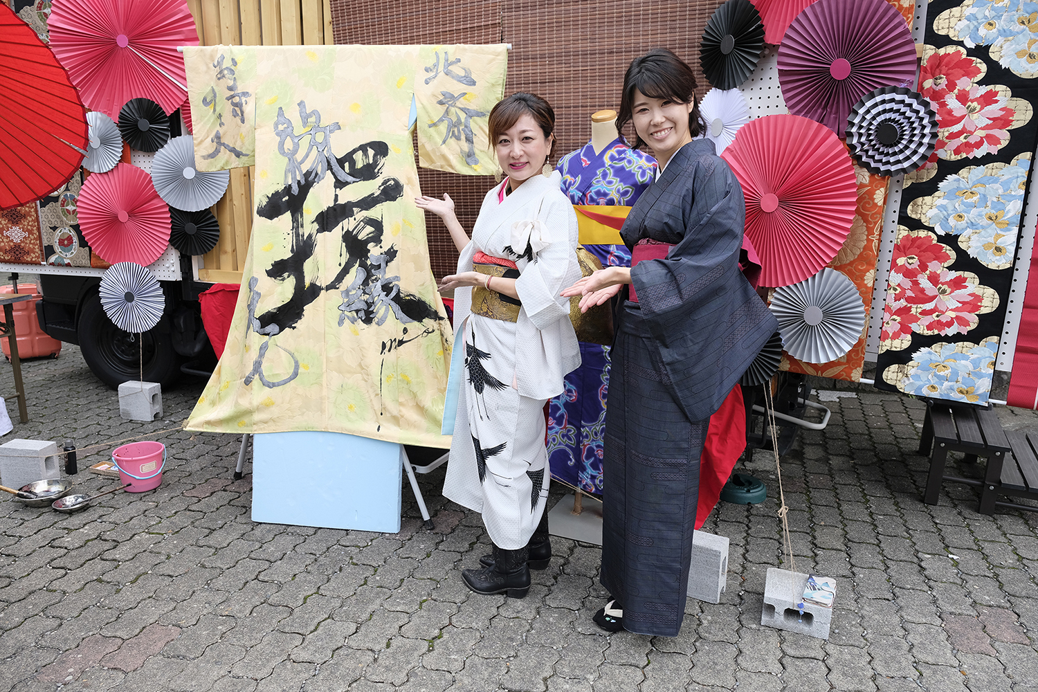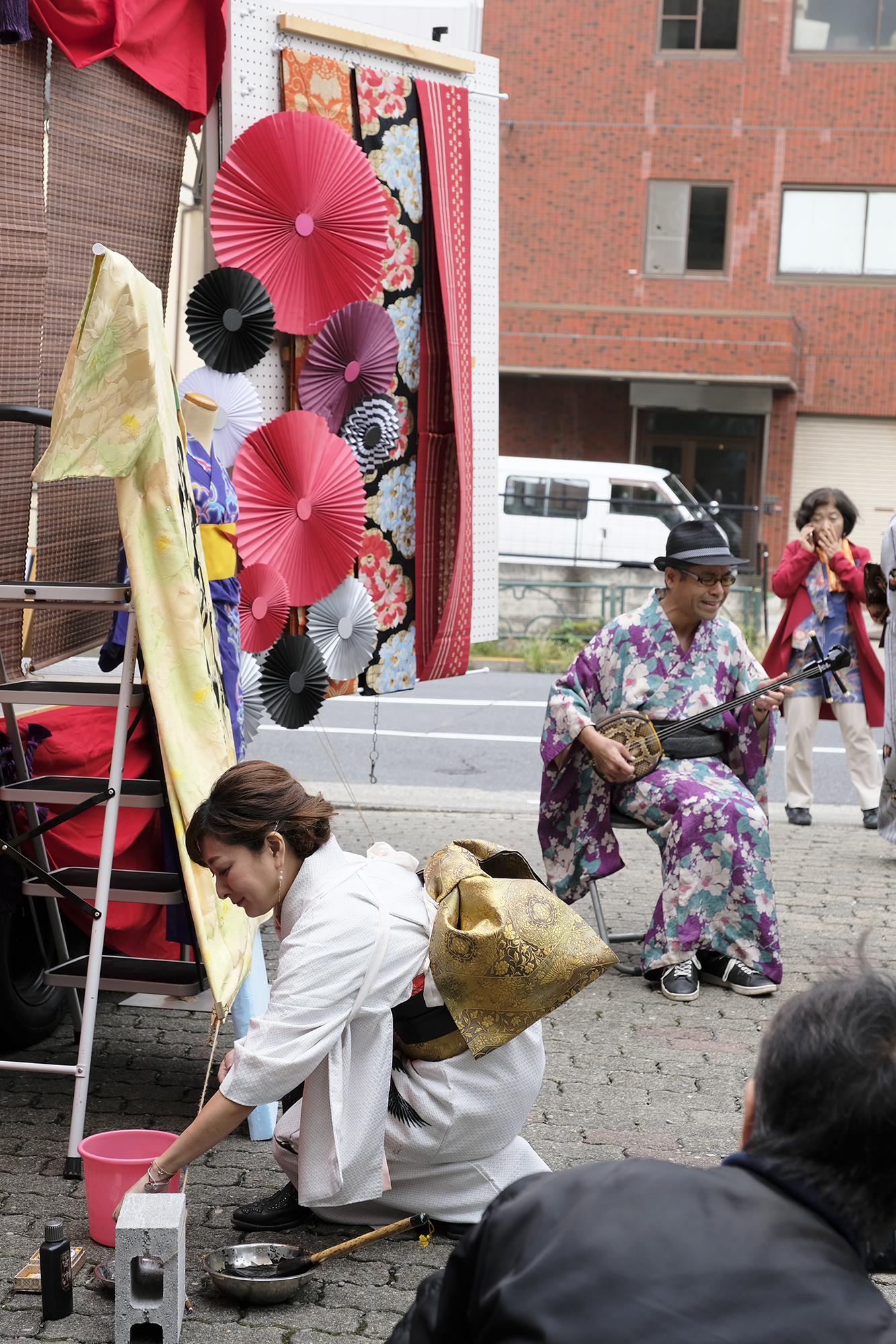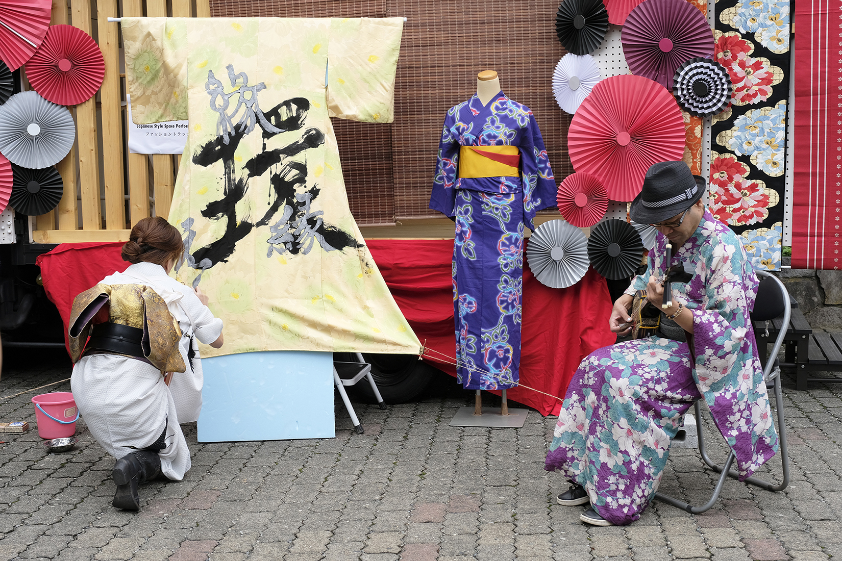 書道家 永島 美織さんと唄/三線 タケシィさんによる、着物をキャンバスにしたライブ書道が、髪結いの後屋外にて行われました。