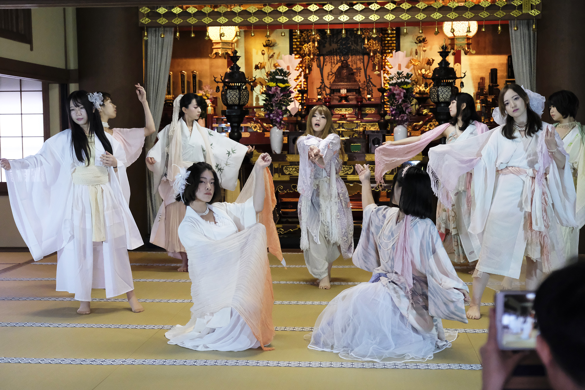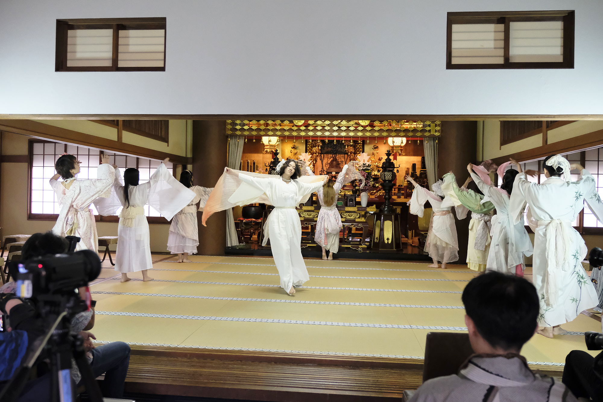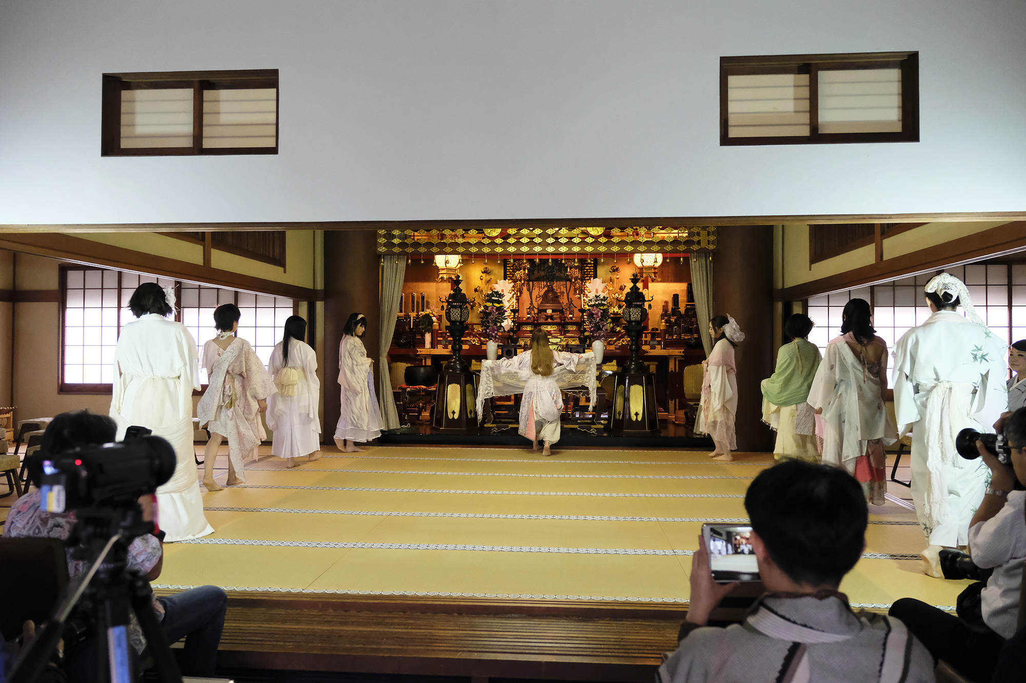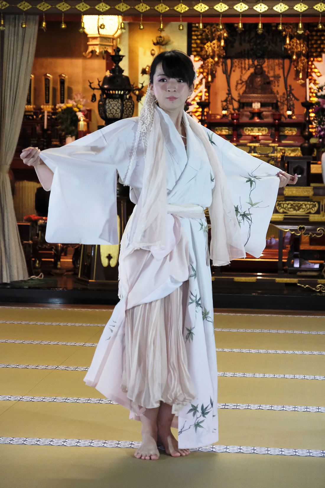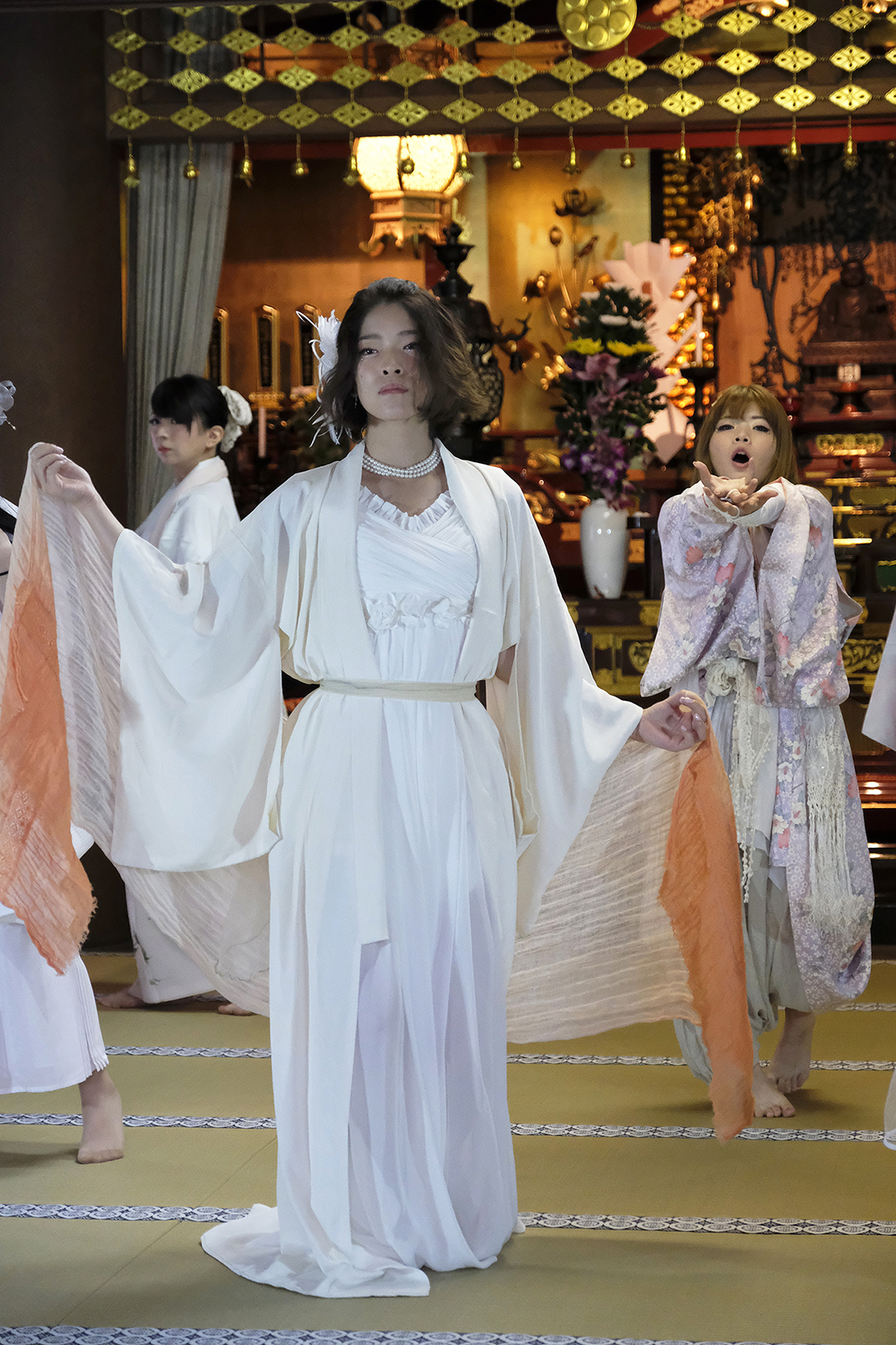 ヨーロッパツアーも廻られているという、兼田玲菜さんの演出の着物パフォーマンス。こちらは全員が真っ白や淡いピンクのとても女の子らしい衣装に身を包み、その衣装も斬新な着物をアレンジしたデザインで、ひらりとひらりとまるで天女の様に舞い踊るパフォーマンス。可愛らしい天女、総勢9名で踊るパフォーマンスは、とても美しく目を奪われます。その美しい舞を次からの写真でお楽しみください。
