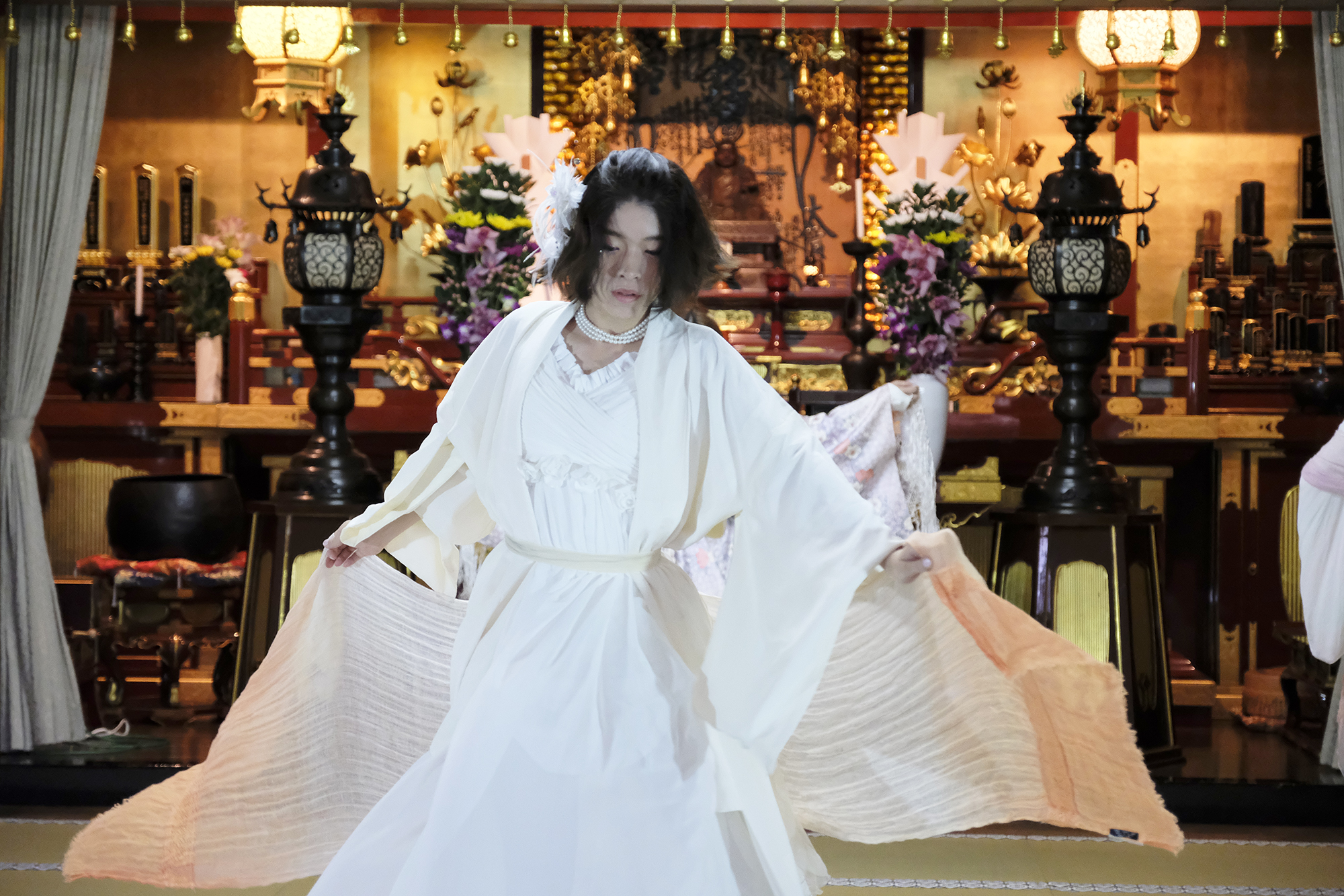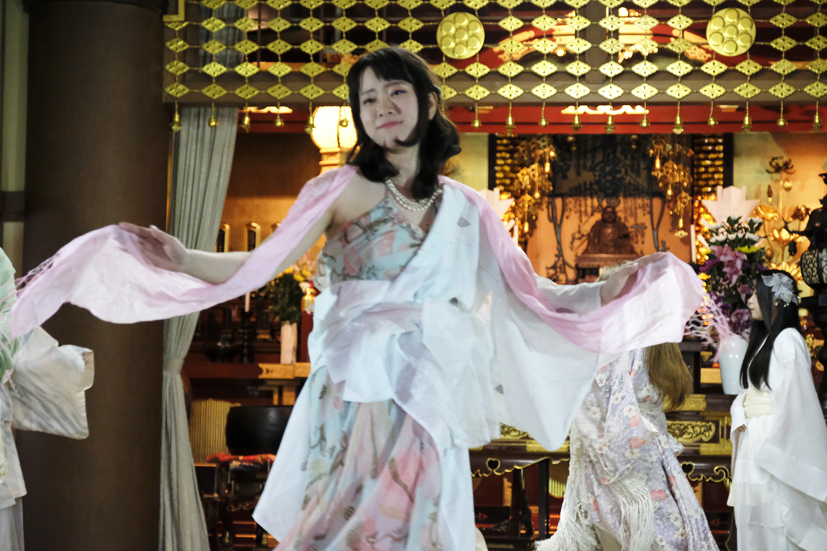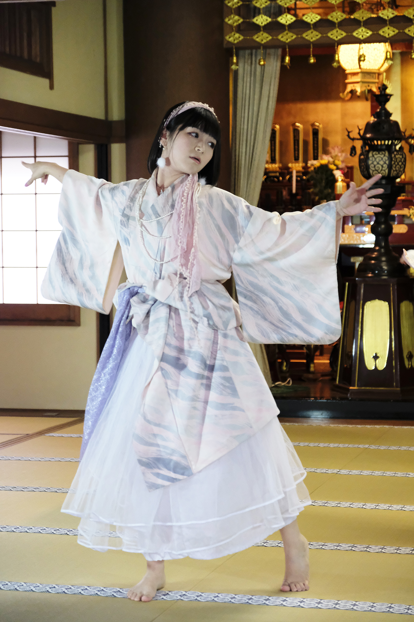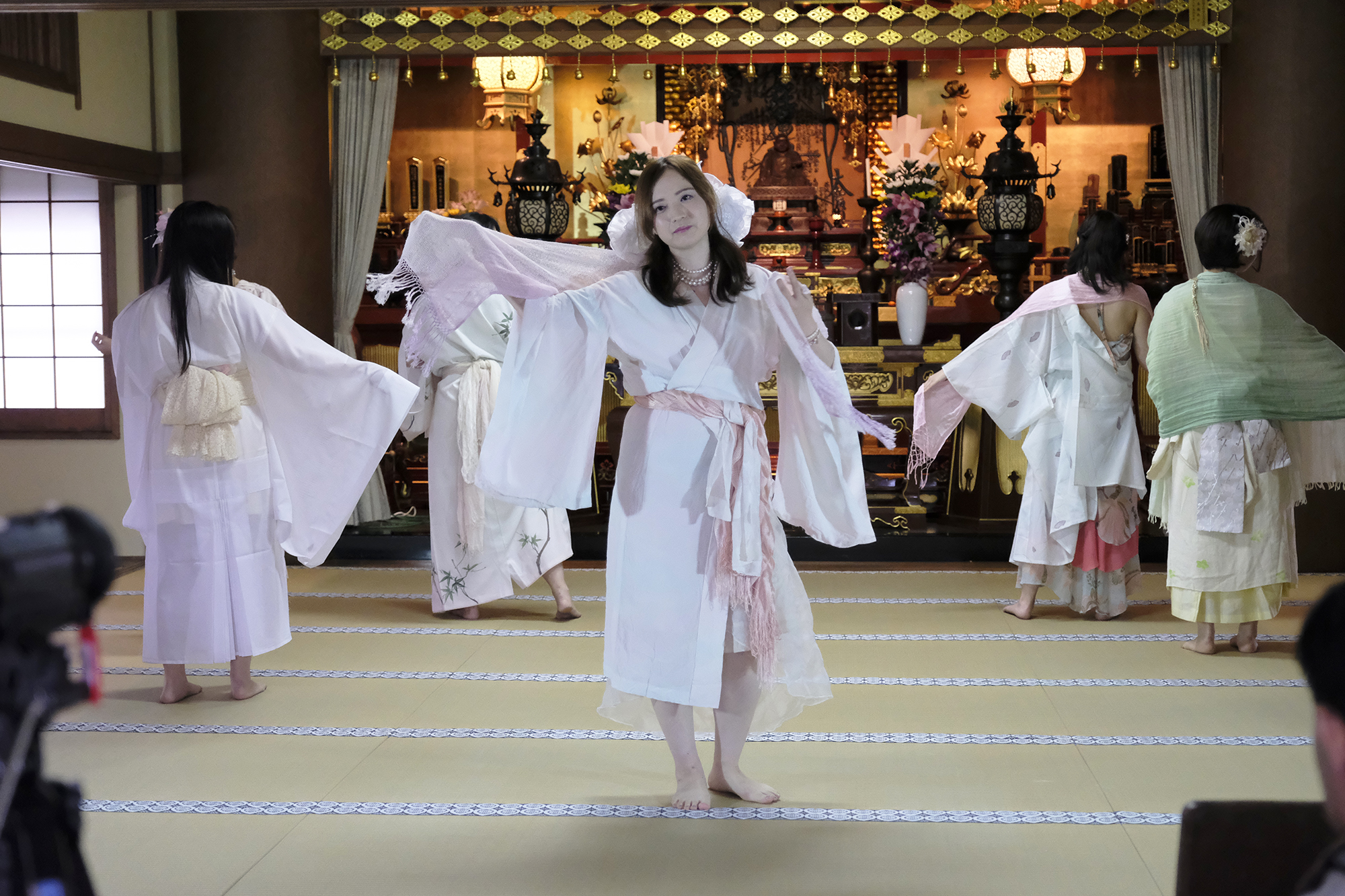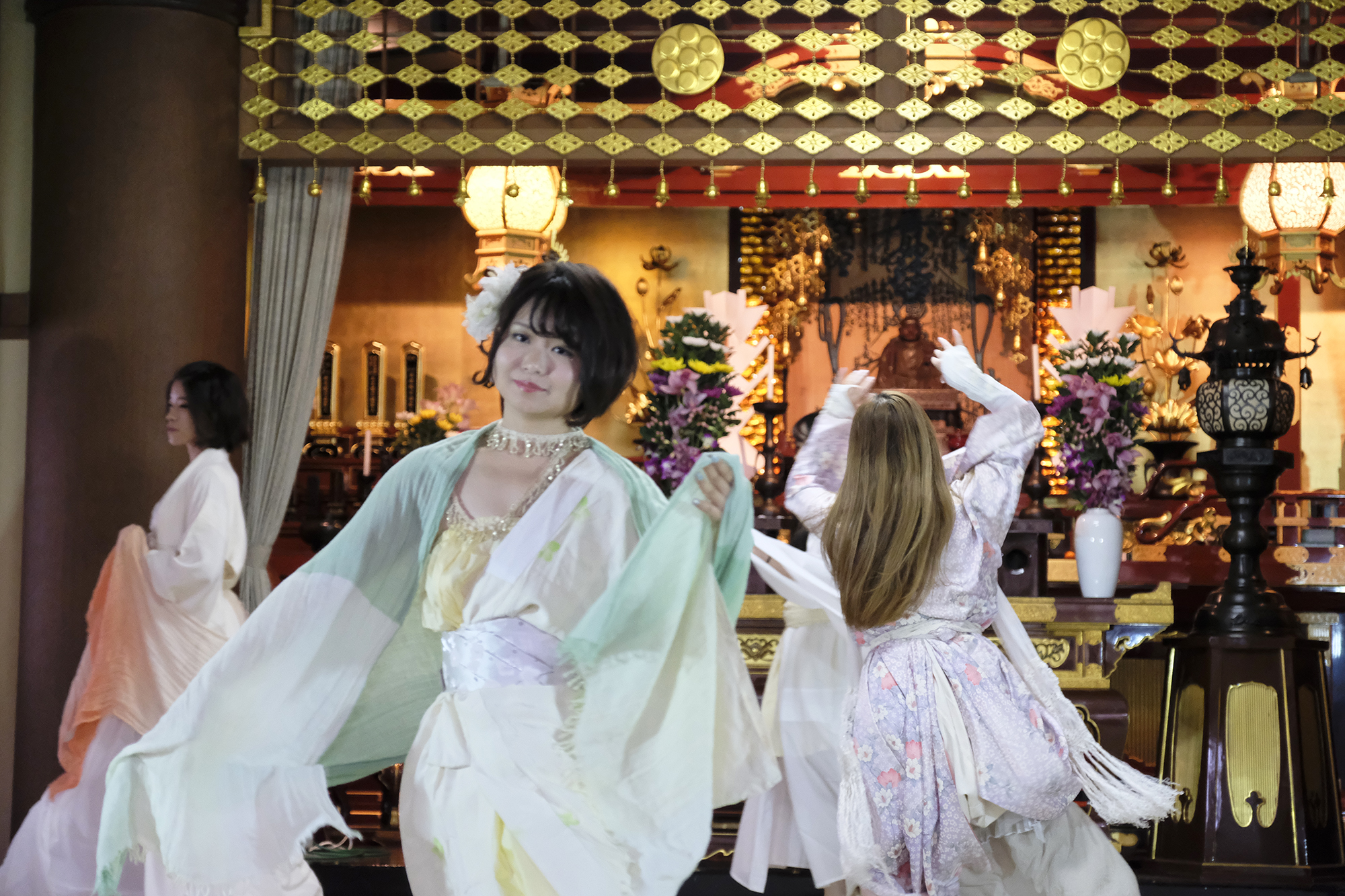 ヨーロッパツアーも廻られているという、兼田玲菜さんの演出の着物パフォーマンス。こちらは全員が真っ白や淡いピンクのとても女の子らしい衣装に身を包み、その衣装も斬新な着物をアレンジしたデザインで、ひらりとひらりとまるで天女の様に舞い踊るパフォーマンス。可愛らしい天女、総勢9名で踊るパフォーマンスは、とても美しく目を奪われます。その美しい舞を次からの写真でお楽しみください。