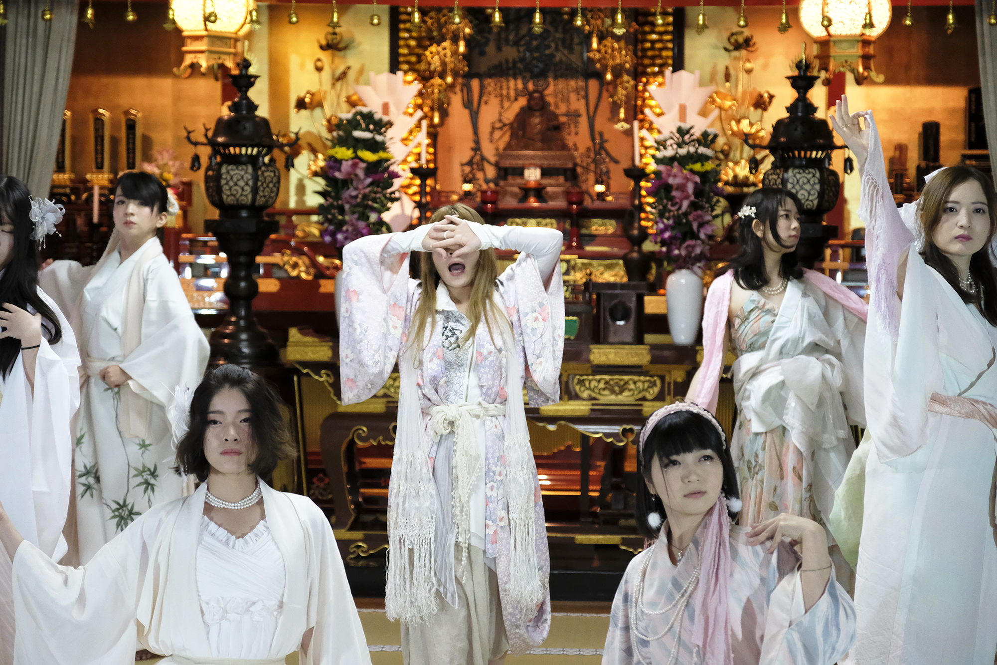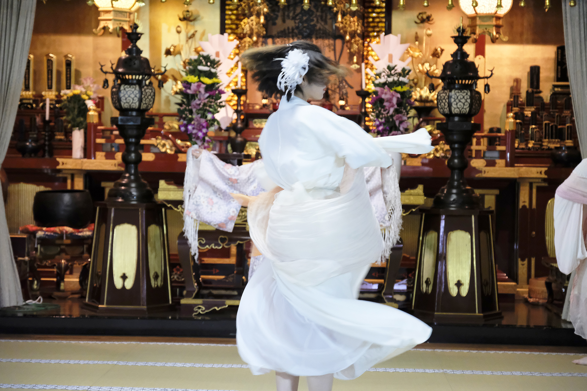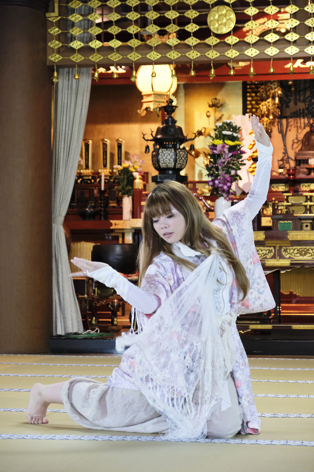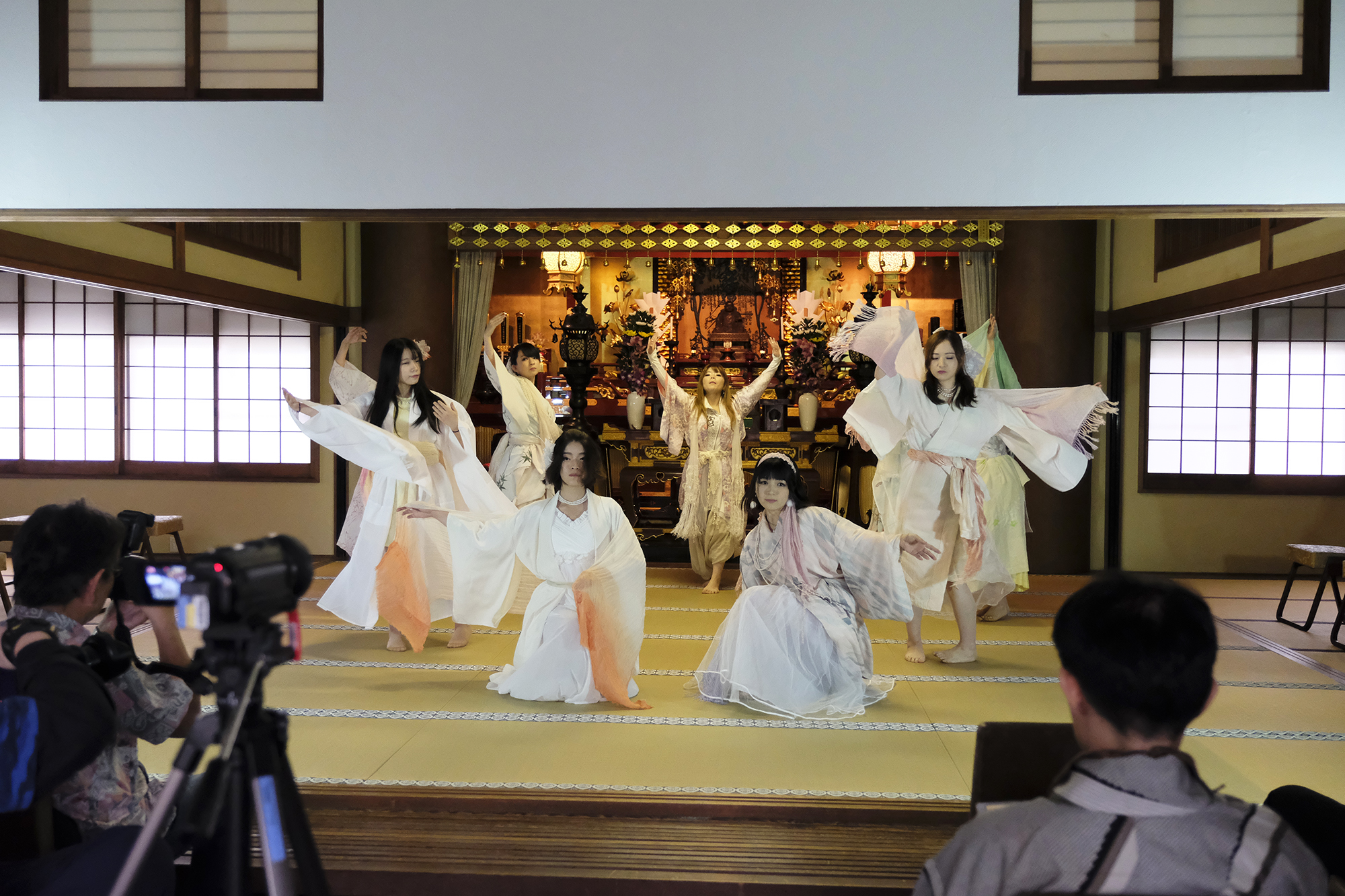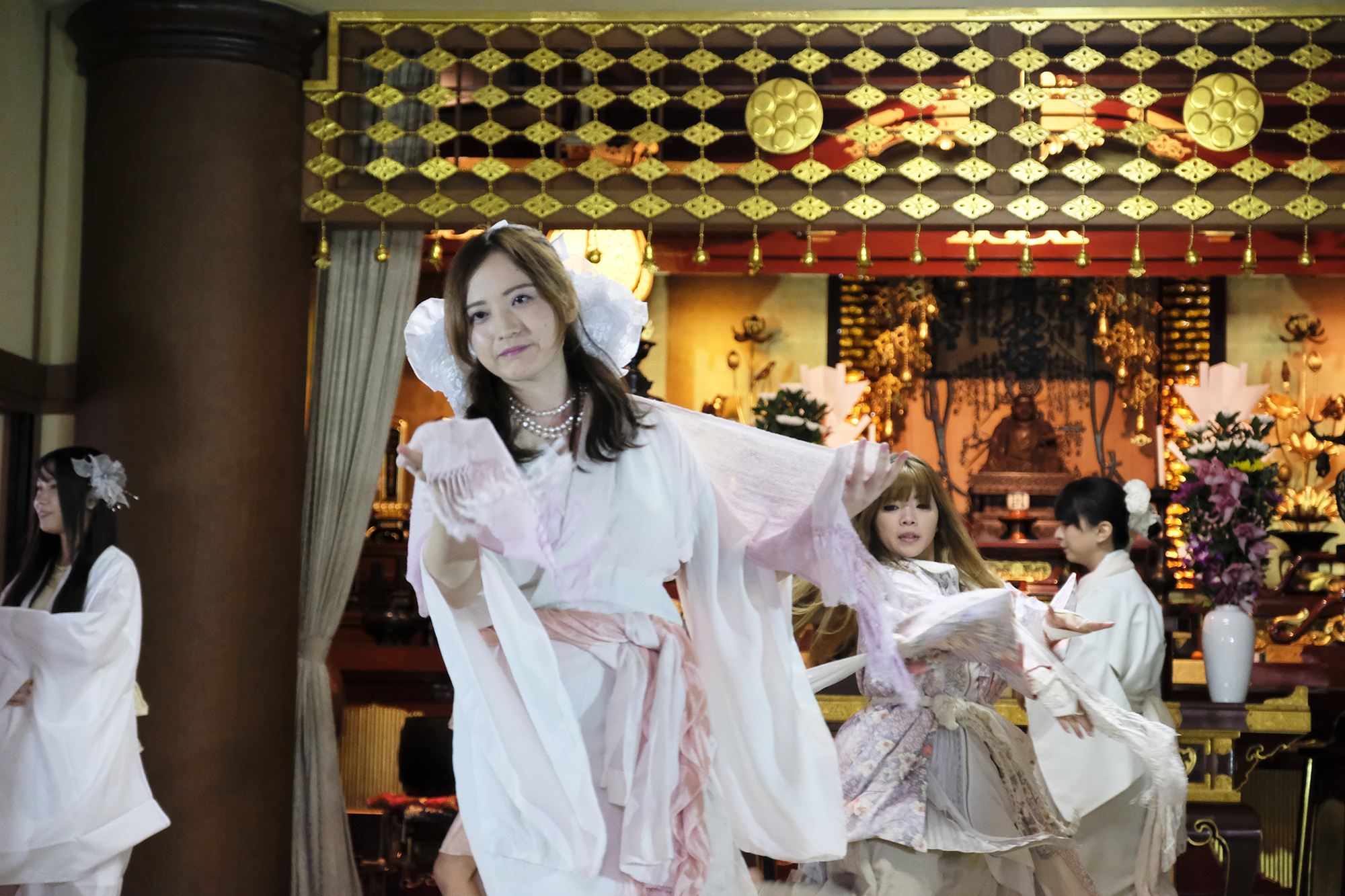 ヨーロッパツアーも廻られているという、兼田玲菜さんの演出の着物パフォーマンス。こちらは全員が真っ白や淡いピンクのとても女の子らしい衣装に身を包み、その衣装も斬新な着物をアレンジしたデザインで、ひらりとひらりとまるで天女の様に舞い踊るパフォーマンス。可愛らしい天女、総勢9名で踊るパフォーマンスは、とても美しく目を奪われます。その美しい舞を次からの写真でお楽しみください。
