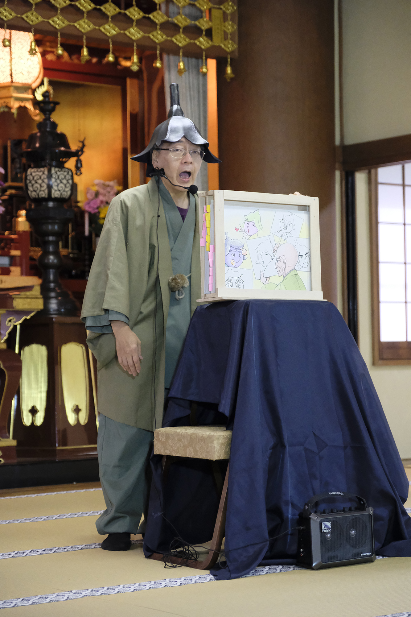 そして次はこの辺り葛飾では有名な、茄子爺こと田村風來門さんによる”北じぃ&茄子之介すみだまちある記”の紙芝居。その名の通り、茄子の帽子を被り、茄子のへたの様な色の御着物姿の田村風來門さん!