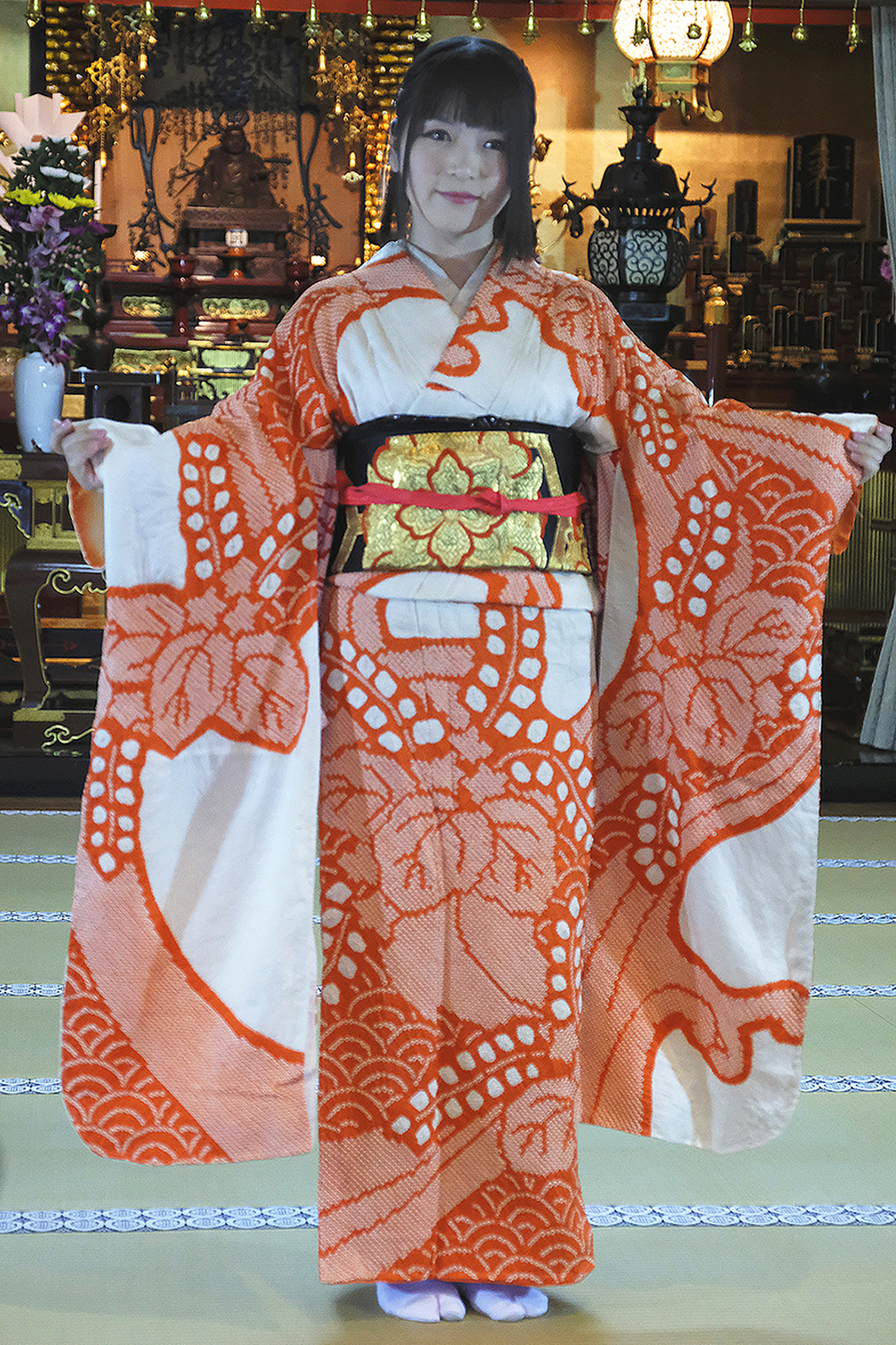 先に永島さんにお写真をお願いしました所、鶴のシルエットがあしらわれているお着物も素敵ですが、特に帯が素敵なので撮ってくださいとおっしゃっていました!