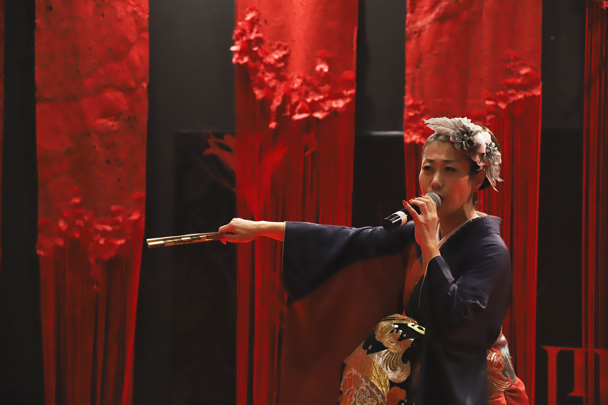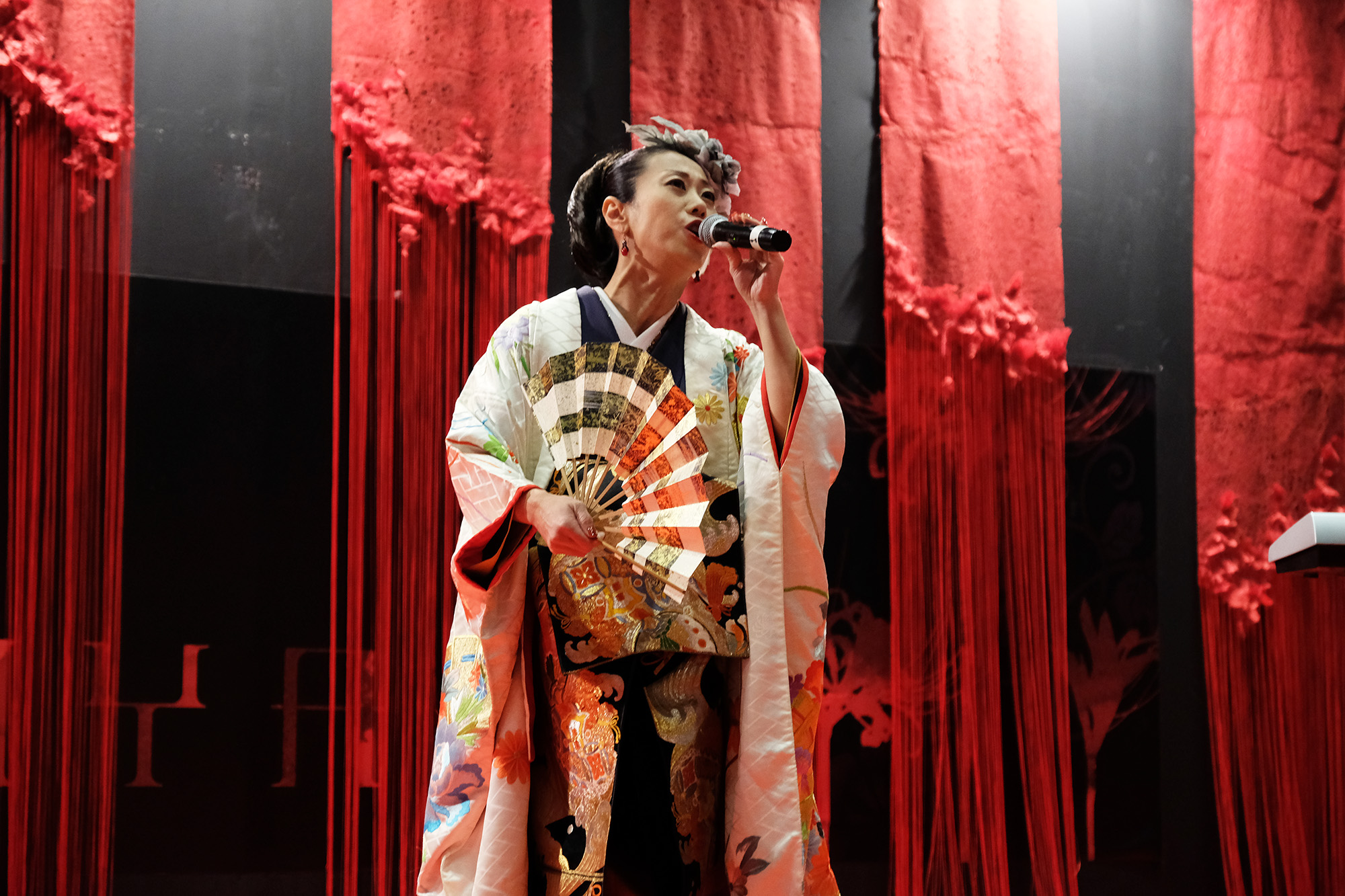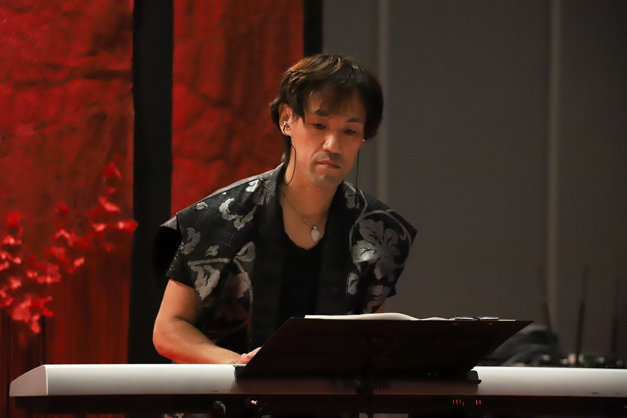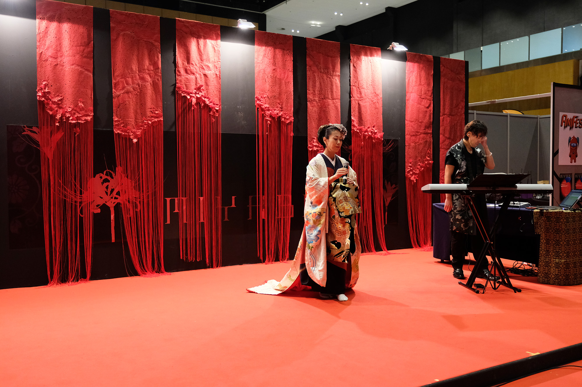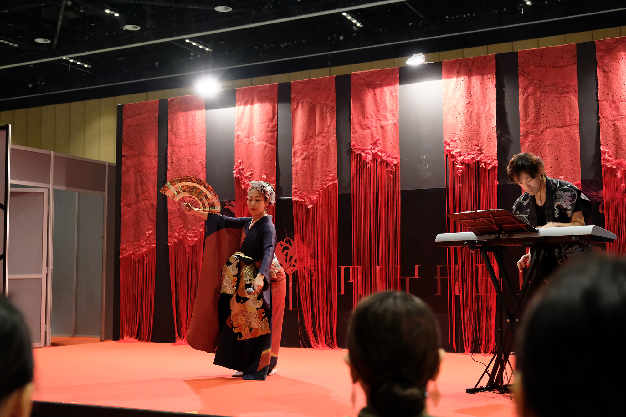 日本国内の公演では、尺八奏者の方や剣舞の方と一緒に競演される事もあるのだそう。とても気さくで優しいお人柄の恵聖さんとHagiさん!”xiè”さんの作曲・音楽は全てHagiさんが担当され、作詞はされるのでしょうか?と恵聖さんにお聞きしますと、詩吟とは昔の様々な武将や著名人達が詠んだ”和歌”や”漢詩”を曲に乗せて歌うものなので、歌にしても作詞にしても”漢詩”が分からないといけないのだそうです。詩吟の家元に生まれ、幼少の頃より詩吟を学ばれた恵聖さんのとても伸びやかな声とHagiさんのキーボードから発せられるテクノミュージックサウンドが会場に響いておりました。