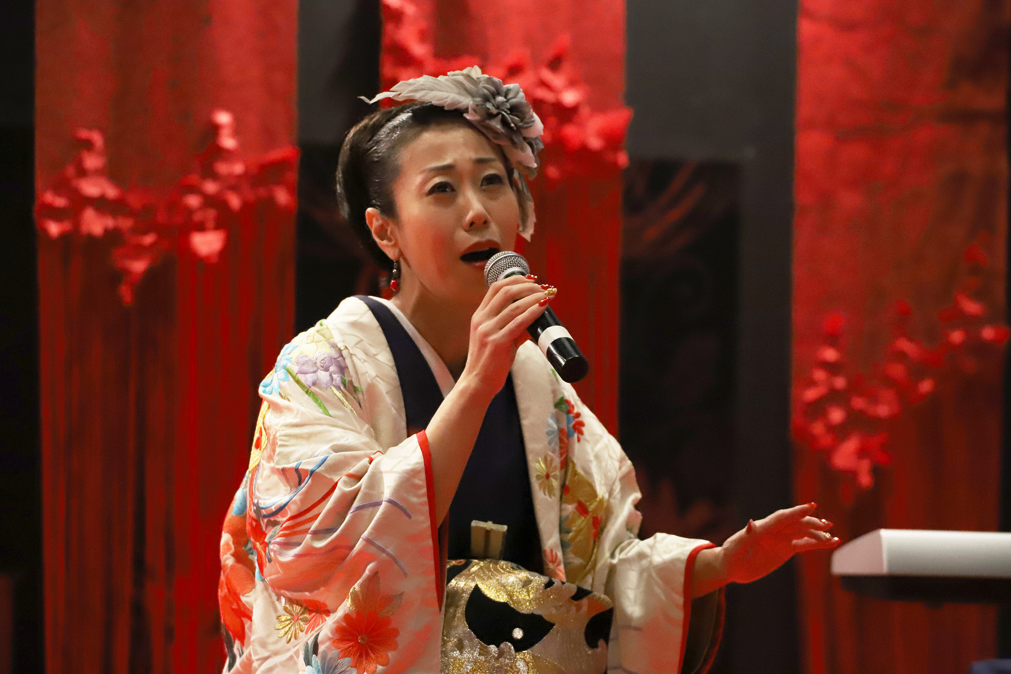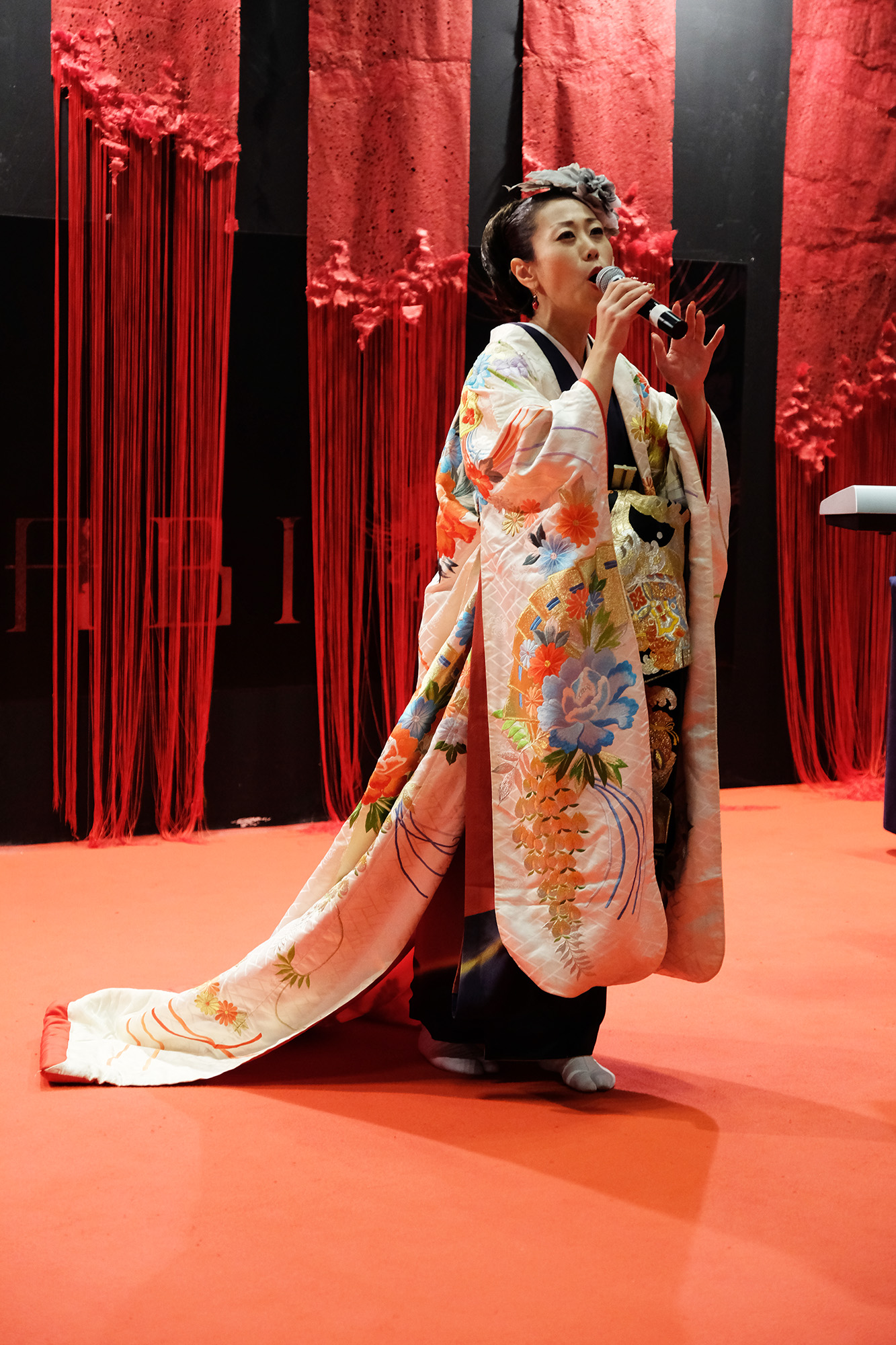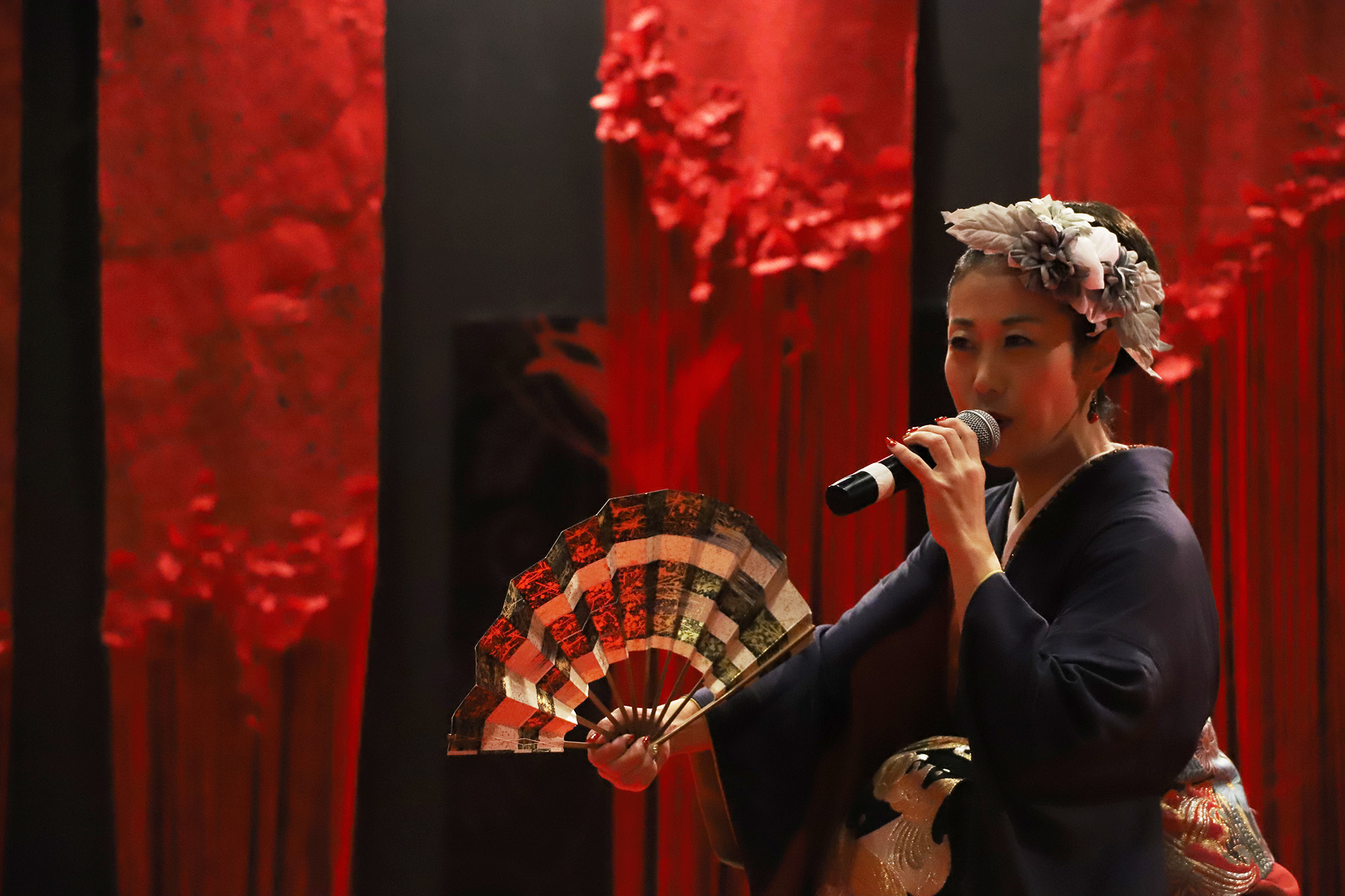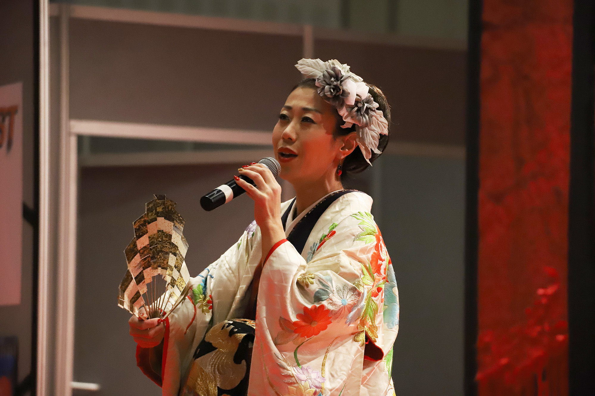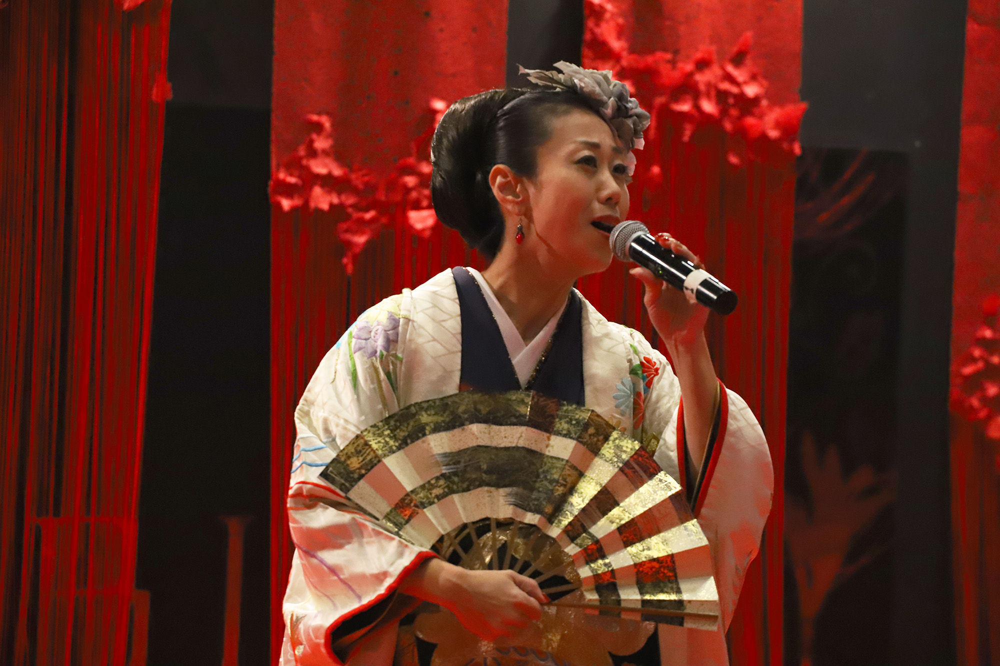 日本国内の公演では、尺八奏者の方や剣舞の方と一緒に競演される事もあるのだそう。とても気さくで優しいお人柄の恵聖さんとHagiさん!”xiè”さんの作曲・音楽は全てHagiさんが担当され、作詞はされるのでしょうか?と恵聖さんにお聞きしますと、詩吟とは昔の様々な武将や著名人達が詠んだ”和歌”や”漢詩”を曲に乗せて歌うものなので、歌にしても作詞にしても”漢詩”が分からないといけないのだそうです。詩吟の家元に生まれ、幼少の頃より詩吟を学ばれた恵聖さんのとても伸びやかな声とHagiさんのキーボードから発せられるテクノミュージックサウンドが会場に響いておりました。